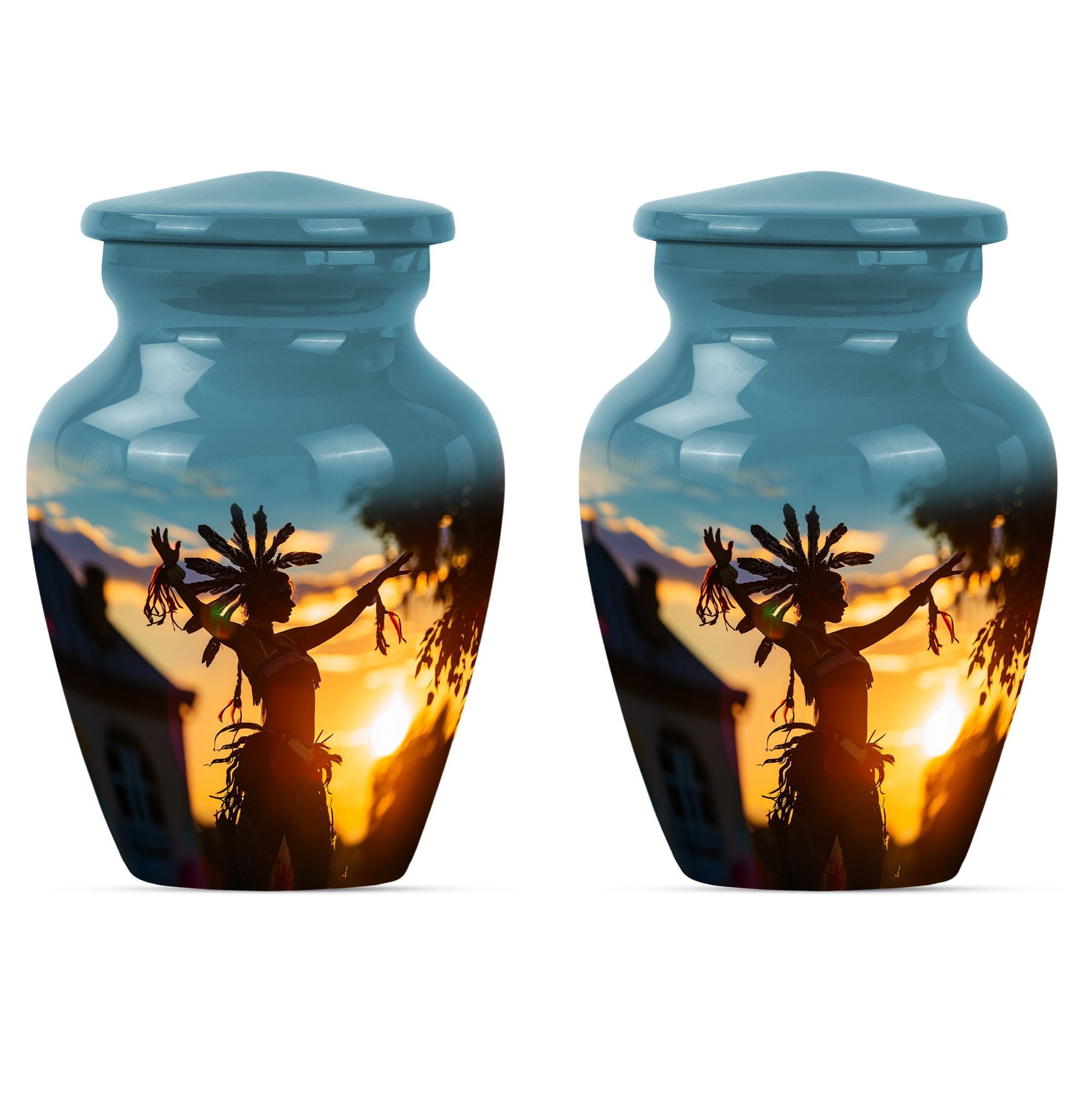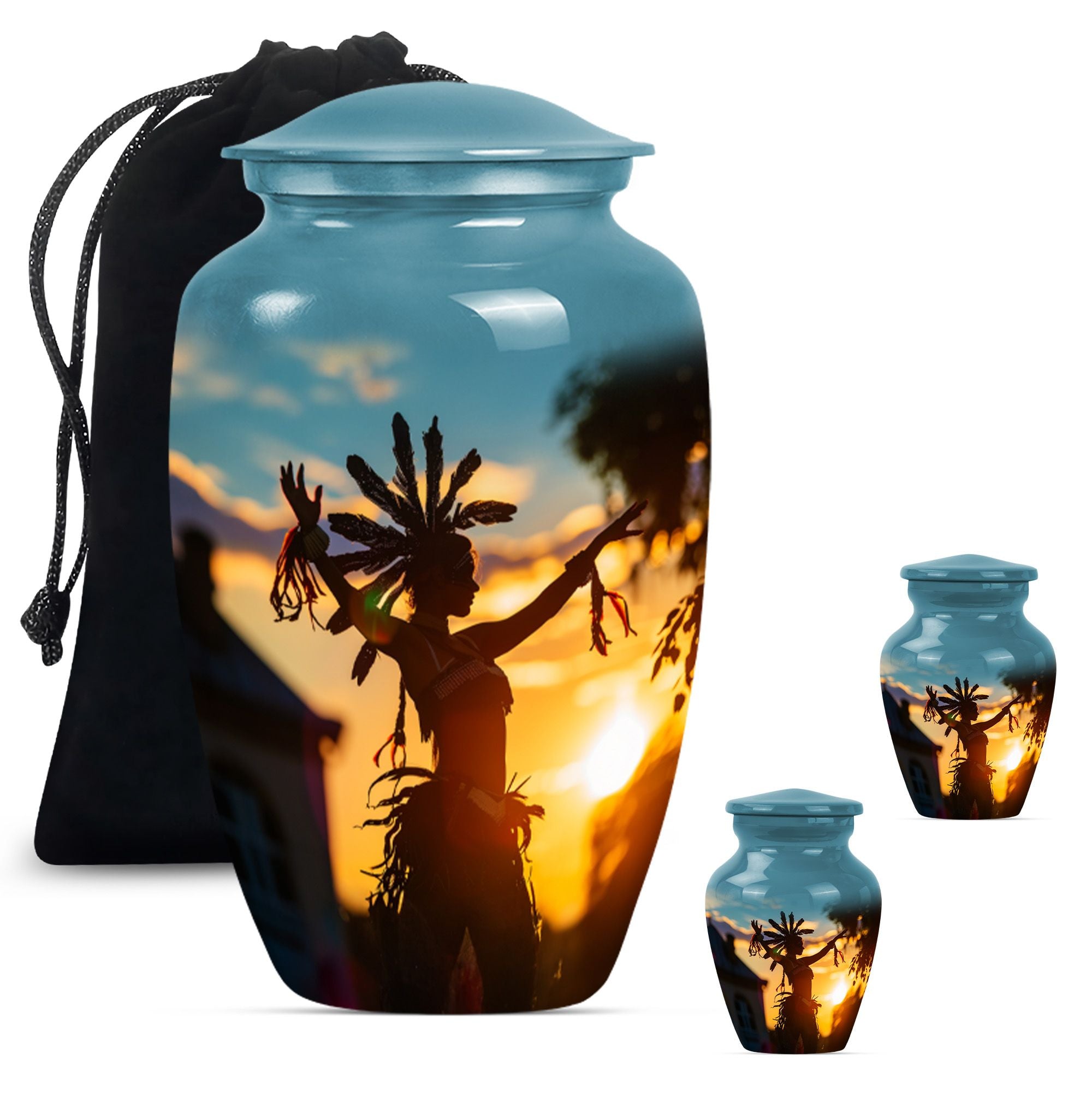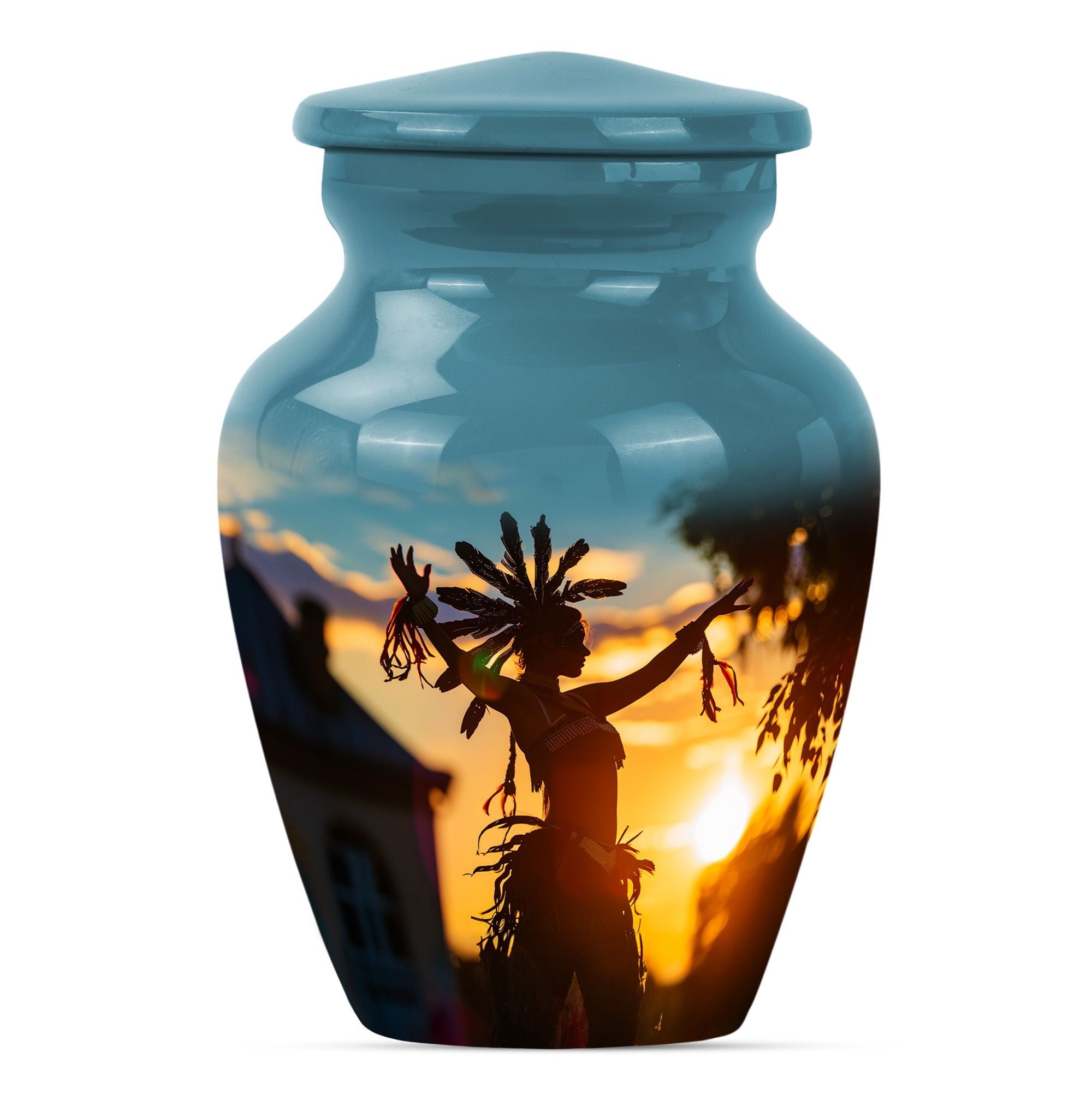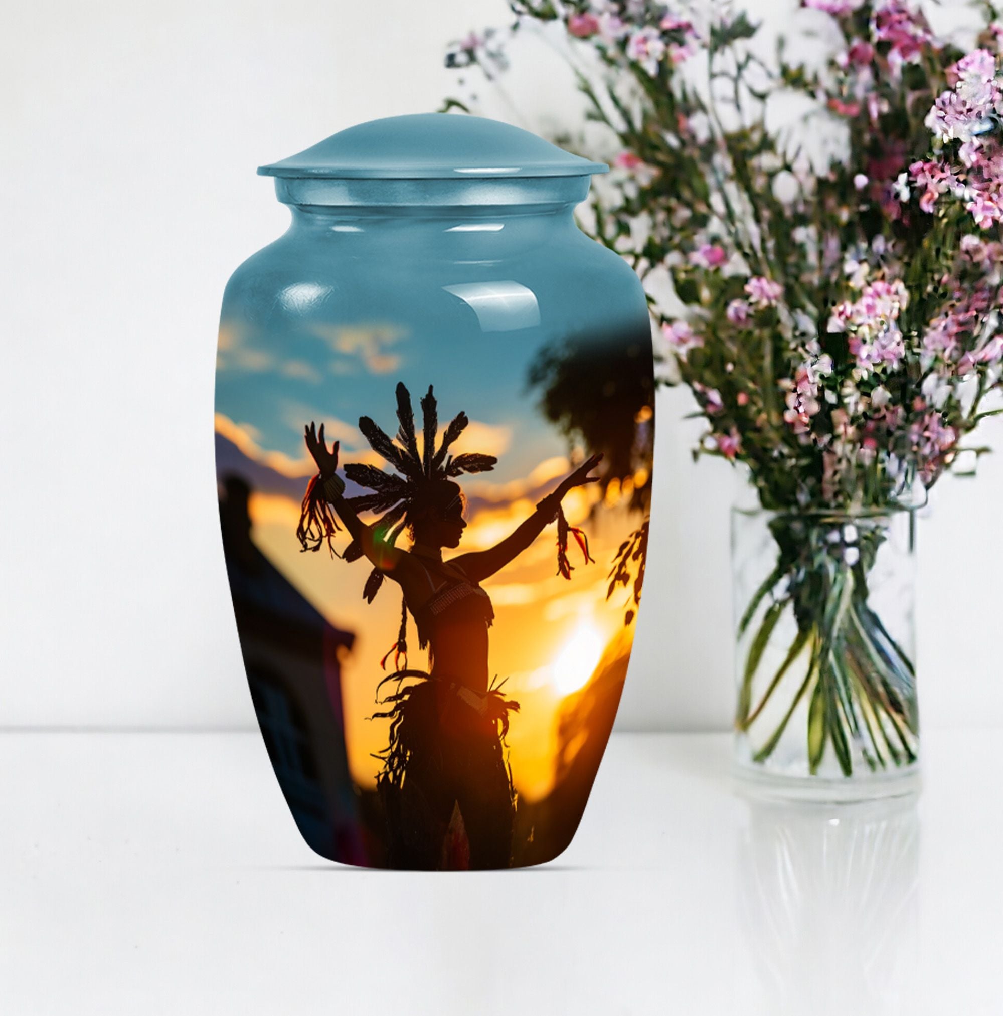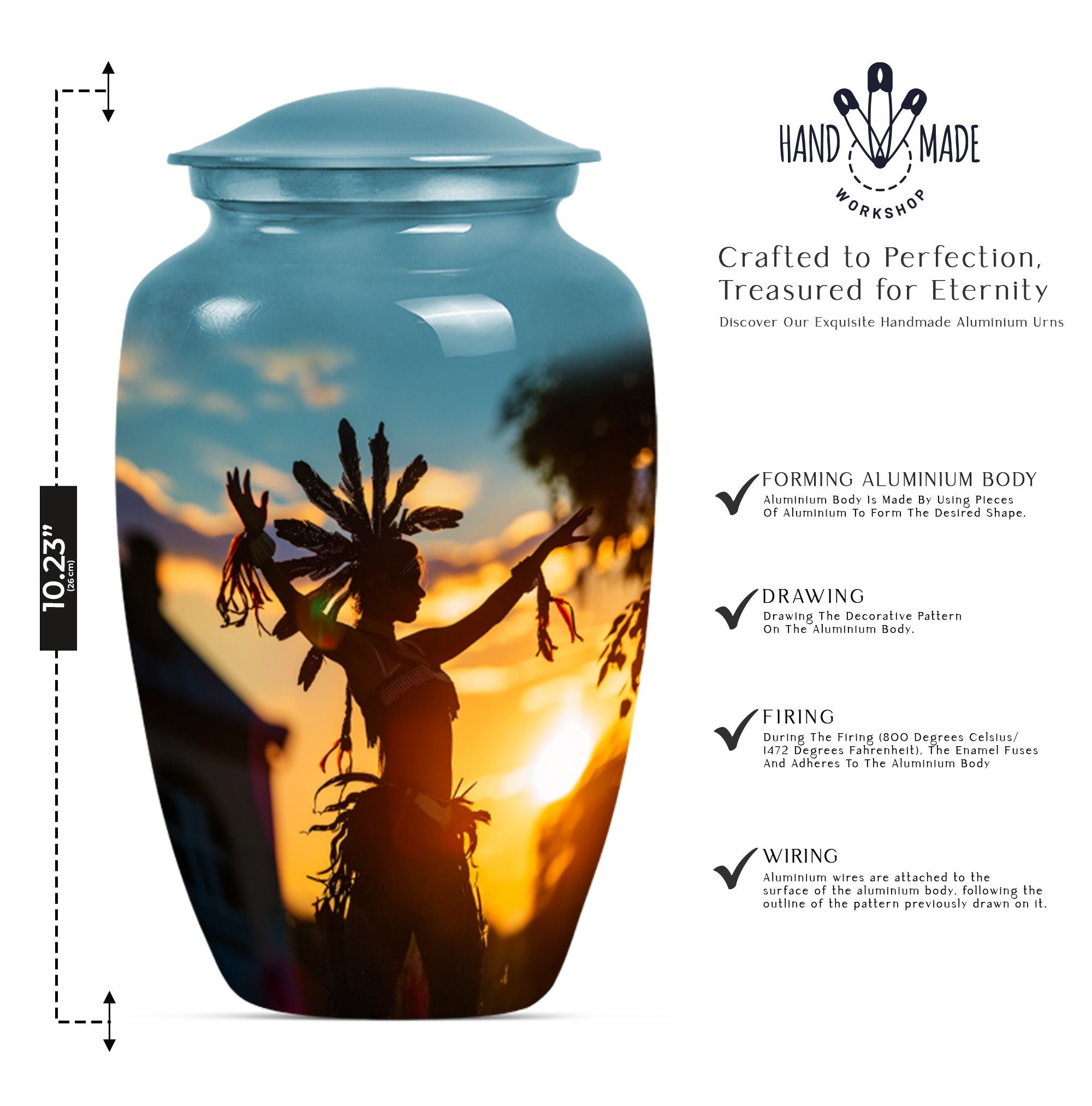 Immerse yourself in an eternal homage with our exquisite 'Tribe Man Urn,' an emblem of solemn respect and a reassuring symbol of everlasting love. A superior large funeral urn for men ashes, meticulously designed to evoke a spiritual connection, this impressive piece stands at a commanding 10 inches tall. Crafted with utmost precision from resilient and lustrous aluminium, it demonstrates a serious attention to detail and longevity unlike any other. The endearing 'Wolf Howling' theme transcends the physical and resonates with the spirit, making it a cherished piece for seniors and adults alike. This cherishable cremation urn comes with a velvet pouch meant to securely contain the ashes. Elegant in its simplicity, the classic urn design pairs well with varying decors and fixtures. It boasts a substantial capacity of 200 cubic inches, accommodating substantial or minute ash quantities with ease. Infuse a touch of personality into the urn by personalizing it with engraved names speaking volumes of your affection. This tribe man urn is more than an urn - it's an enduring testament of love and respect, creating an emotional and physical sanctuary for your loved ones. Supplement your collection of adult urns for ashes with this extraordinary piece and anchor yourself in the peaceful and soothing memories it inspires.