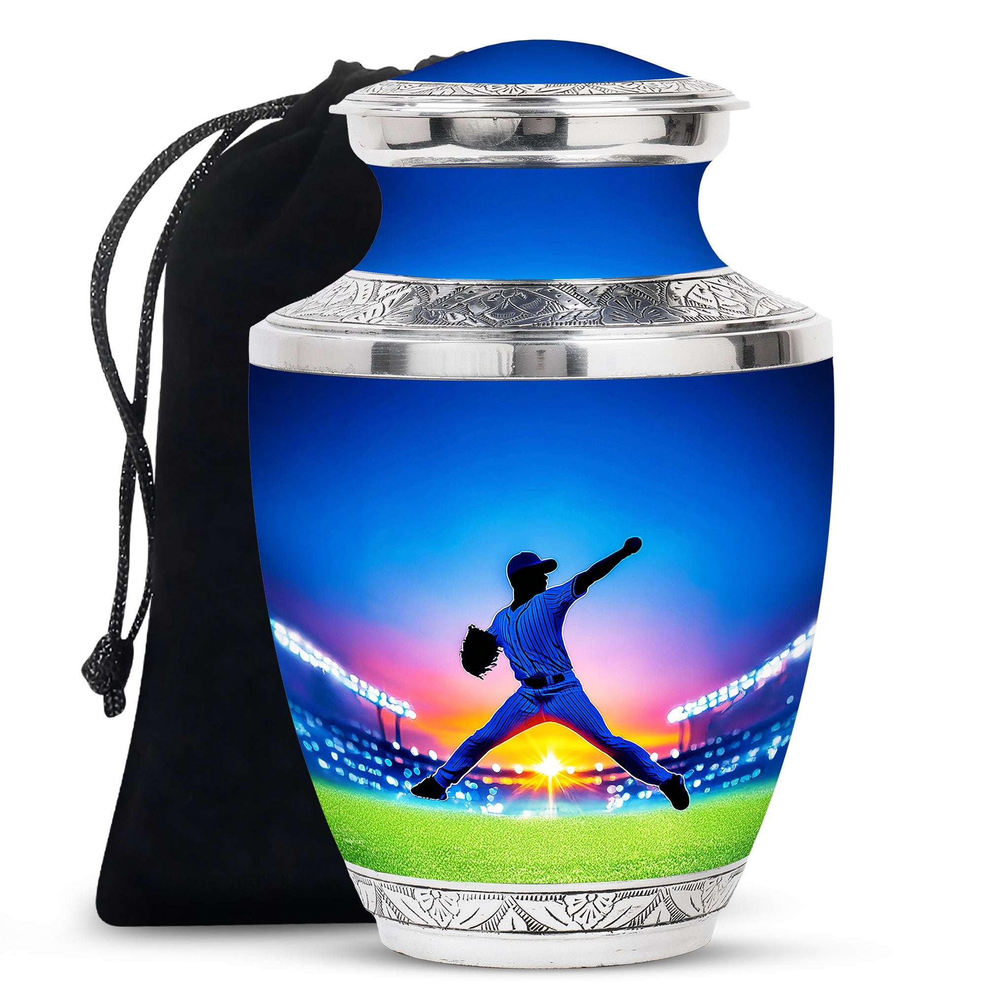 Expertly crafted with durable aluminium, this sports memorial tribute urn combines a detailed baseball design with a secure screw-top lid for safe storage. Its 10-inch height and 200 cubic inch capacity make it suitable for large urns for human ashes adult male or urn for adult male dad, while also serving as small urns for cremation ashes or mini keepsake funeral urns.
