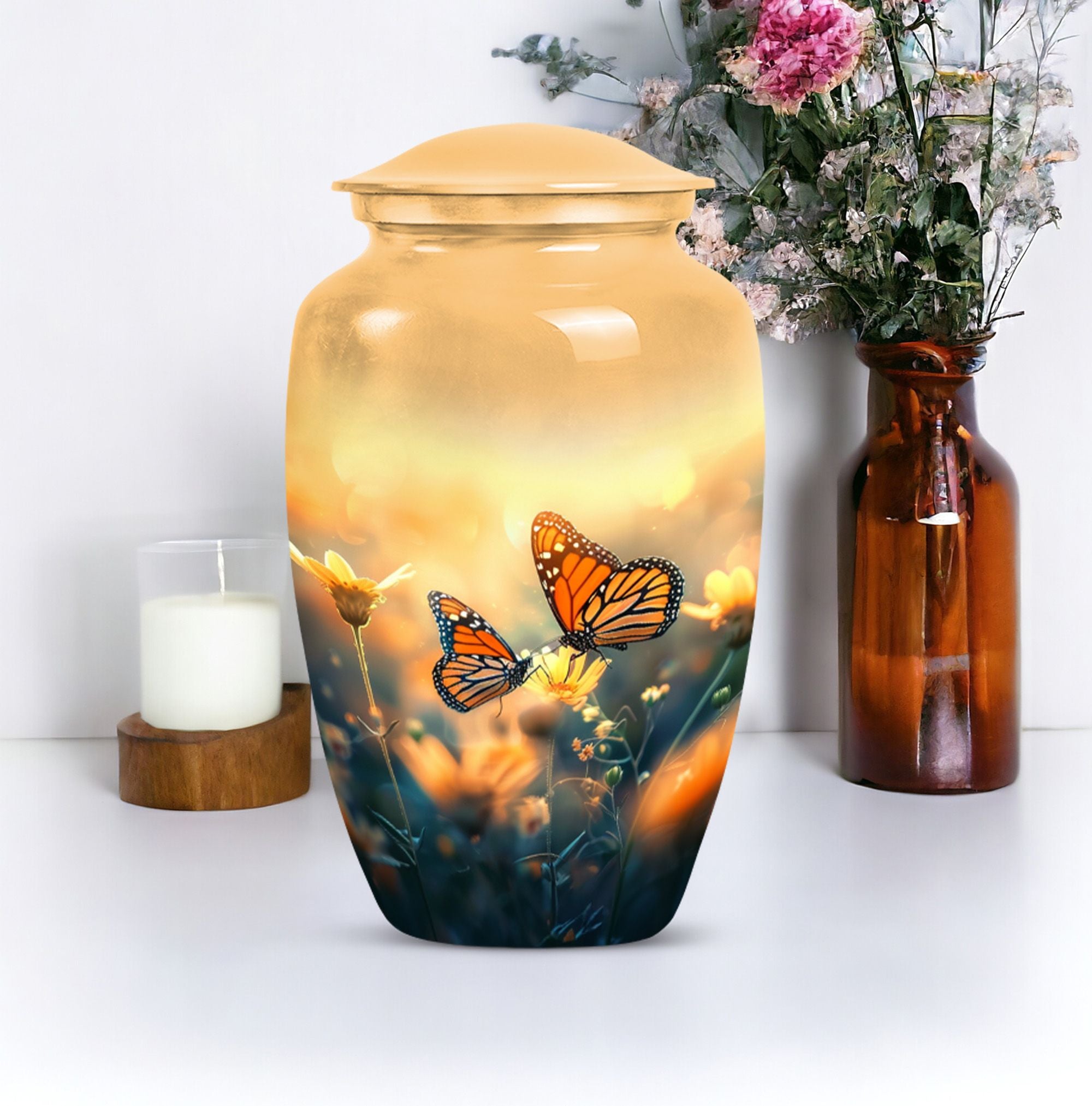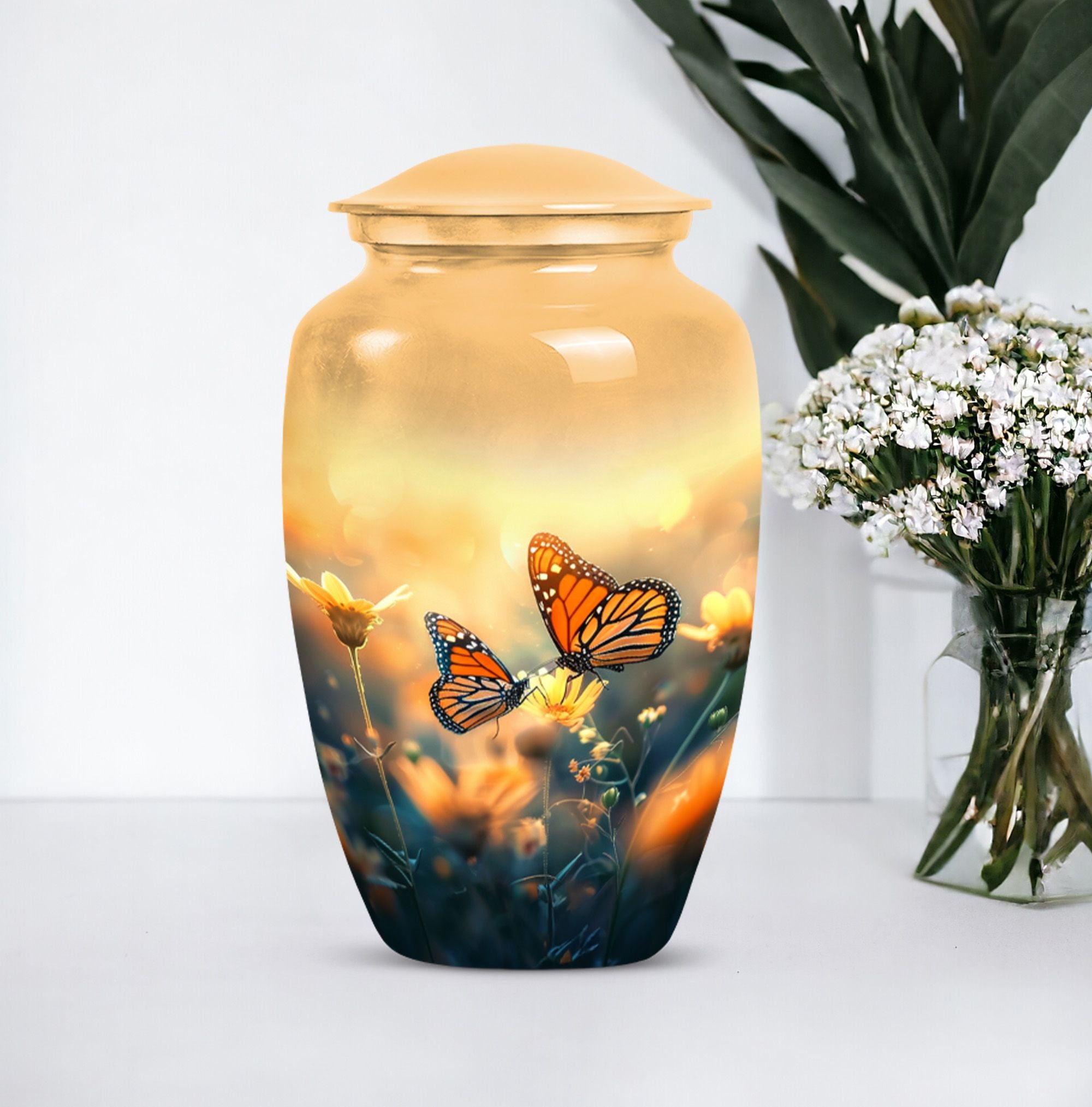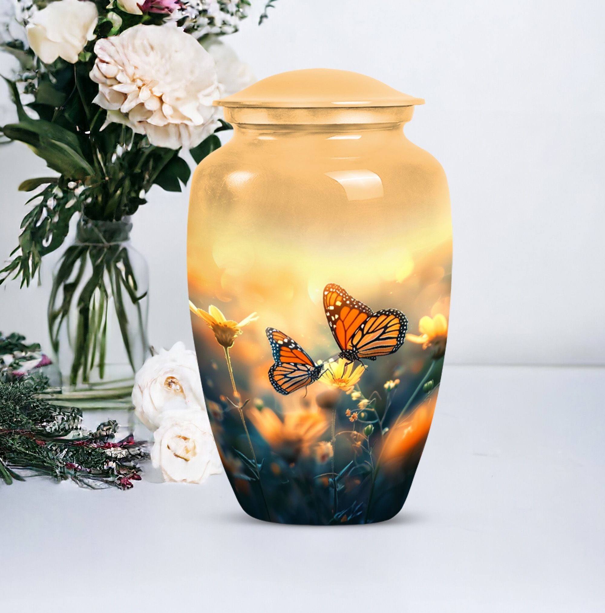 The Orange Monarch Butterfly Memorial Urn is a radiant tribute, blending vibrant orange and yellow hues with the timeless symbolism of butterflies. Crafted with care, this urn embodies renewal, peace, and remembrance, making it a cherished choice for families seeking a meaningful monarch butterfly urn or elegant butterfly urn.