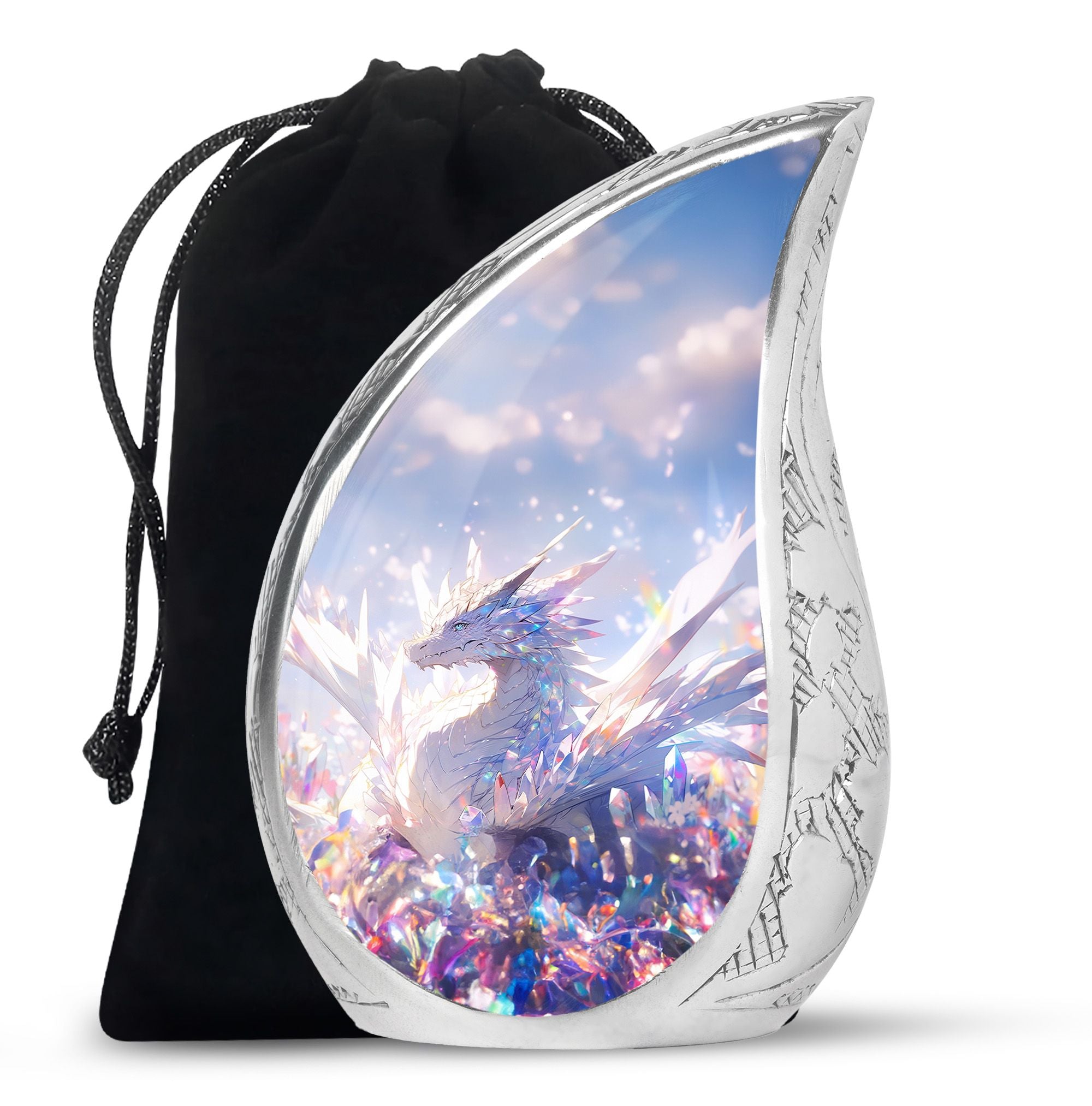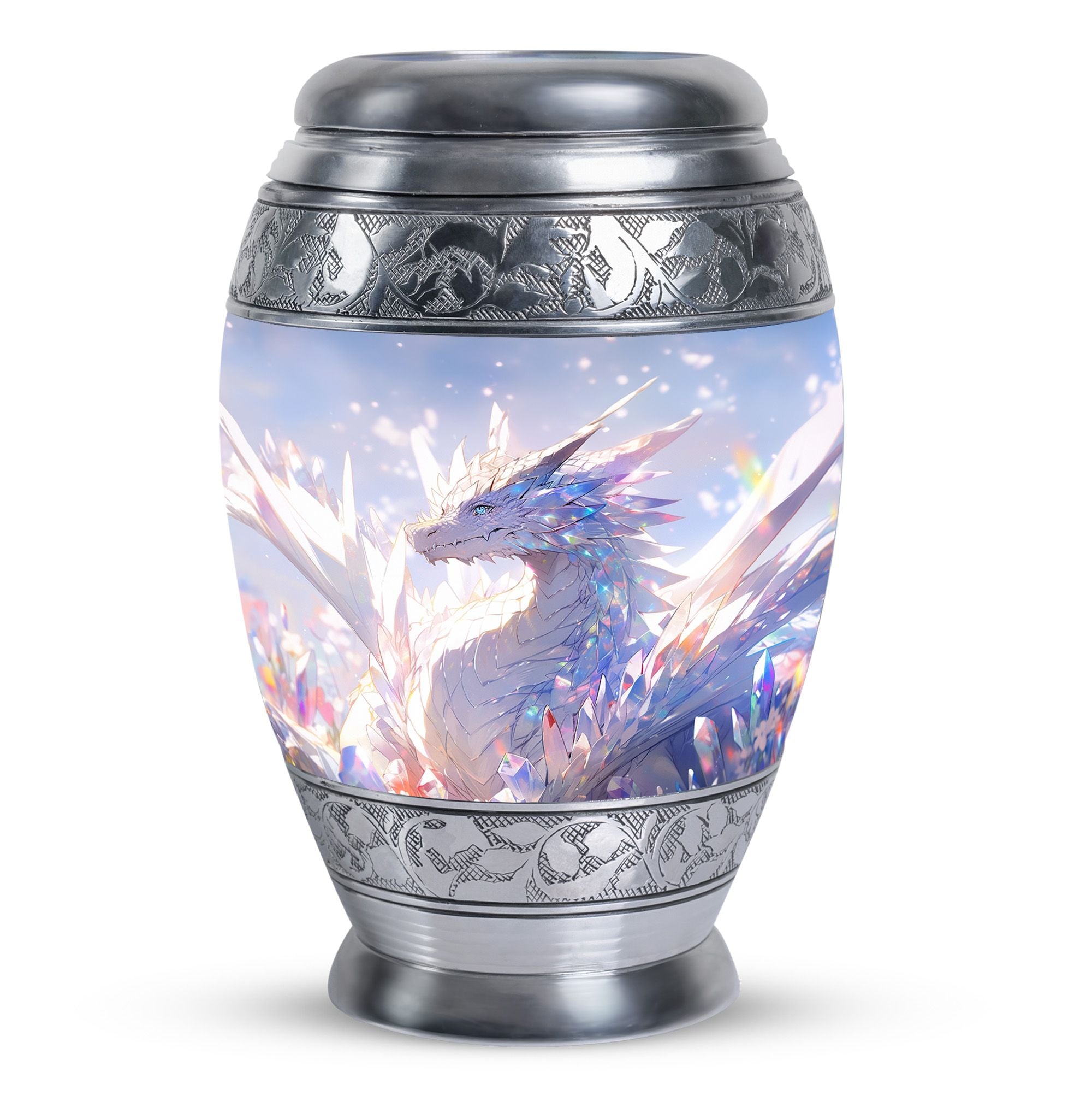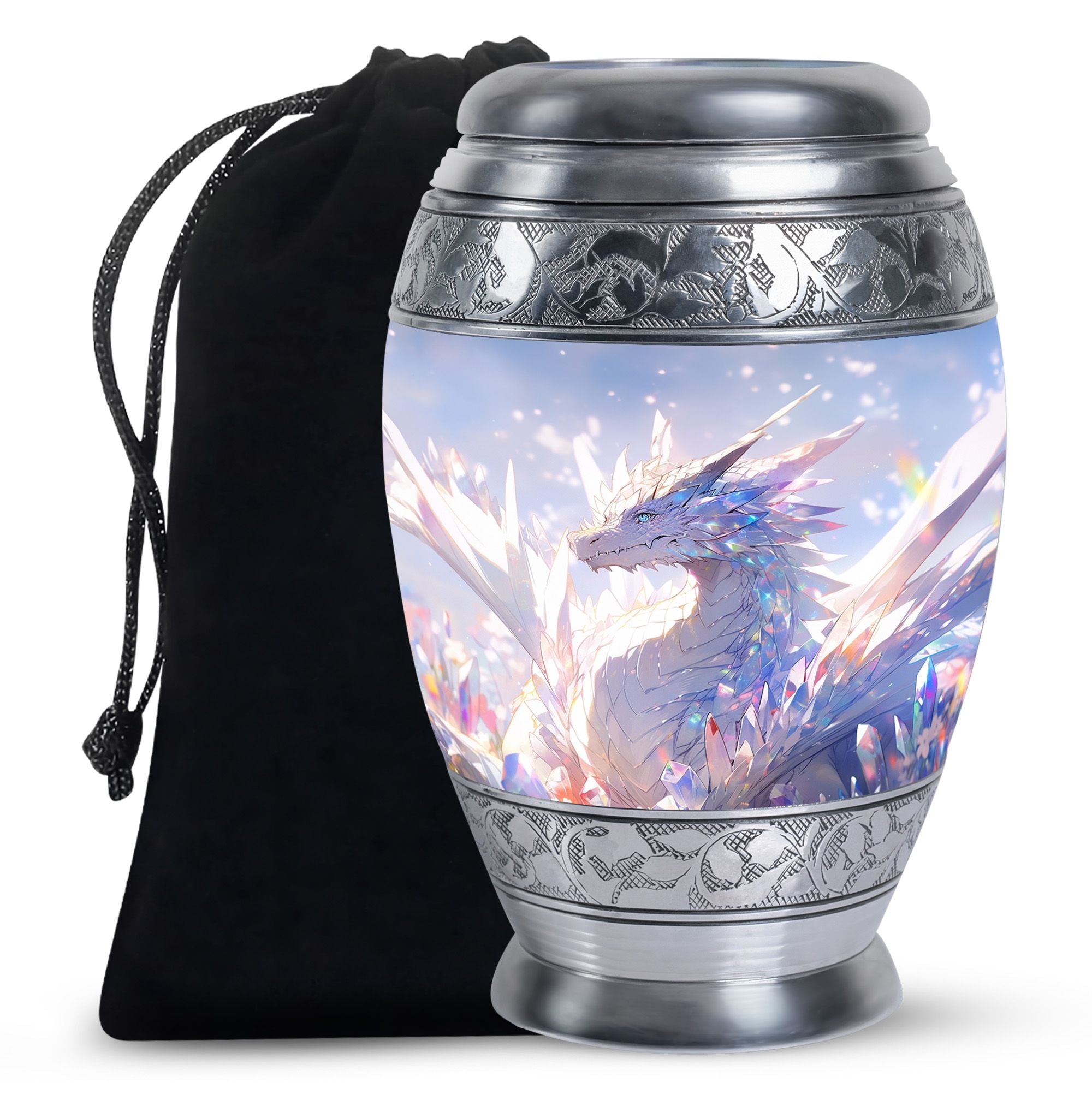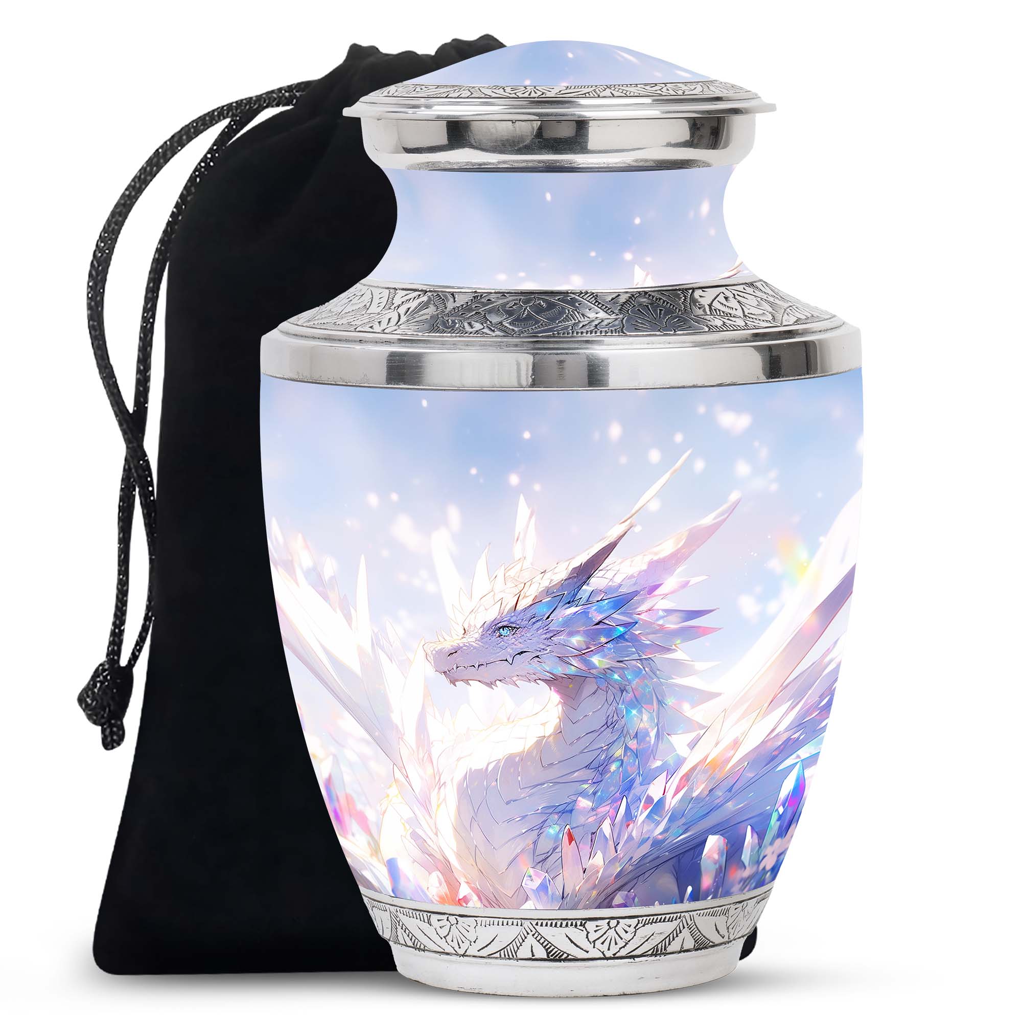 Expertly made from premium-grade aluminum, this urn features a polished crystal dragon motif that radiates light and reverence. The intricate craftsmanship ensures durability while exuding a timeless allure, perfect for home display or memorial placement. Designed to fit adult urns for human ashes large, it provides ample capacity and a secure resting place. Each urn is carefully handcrafted, symbolizing enduring love and eternal remembrance for those who hold a special place in your heart.