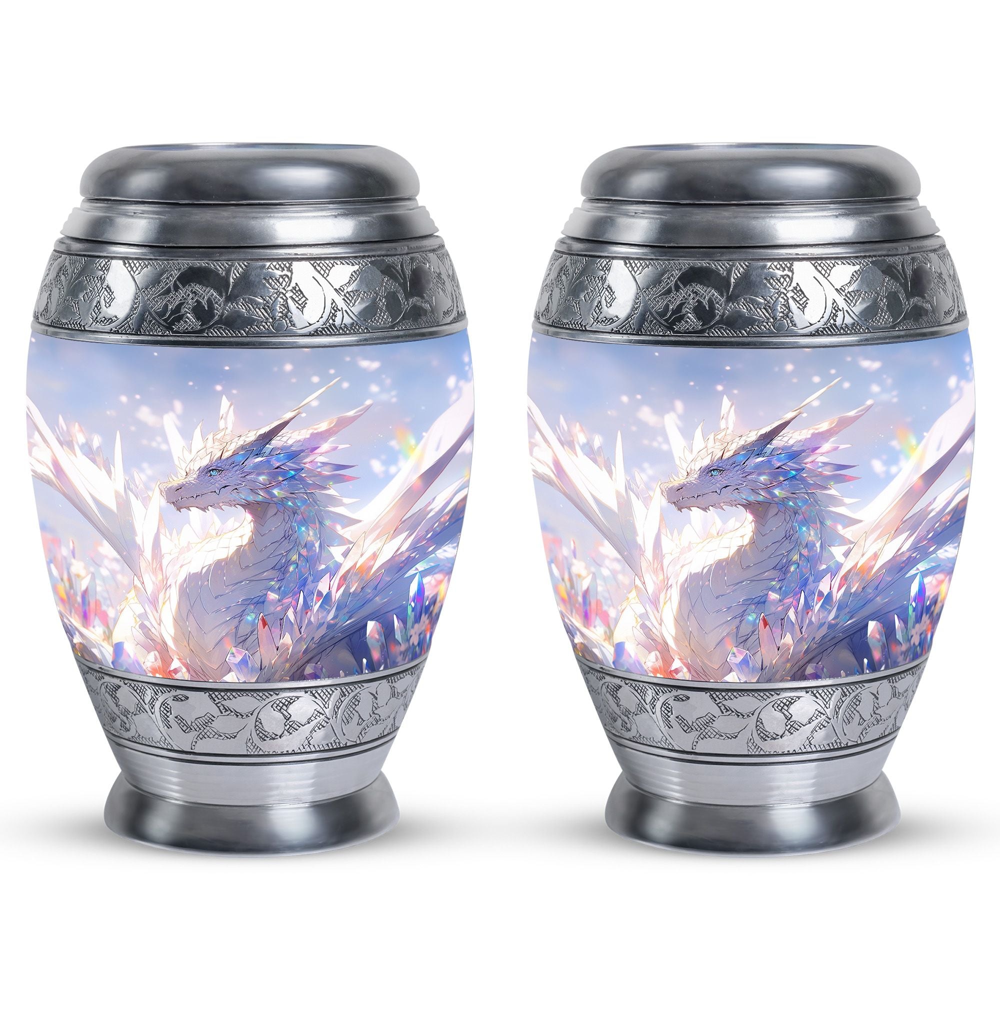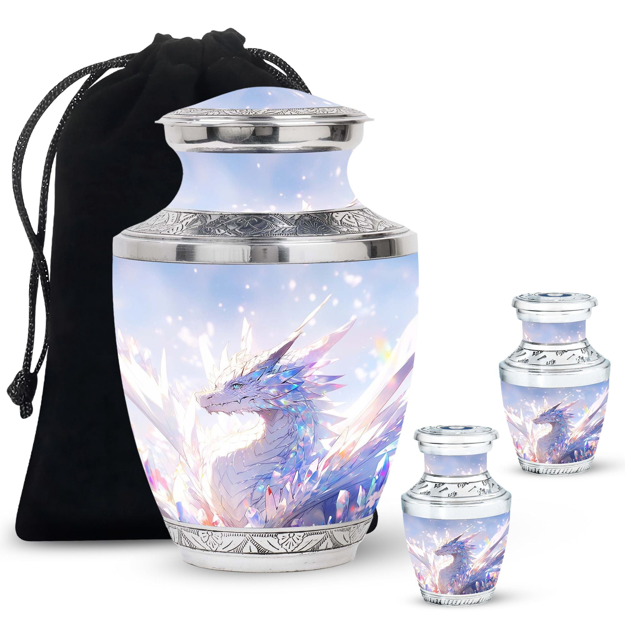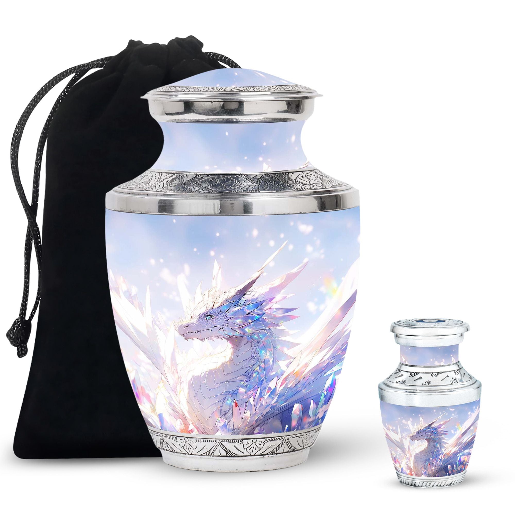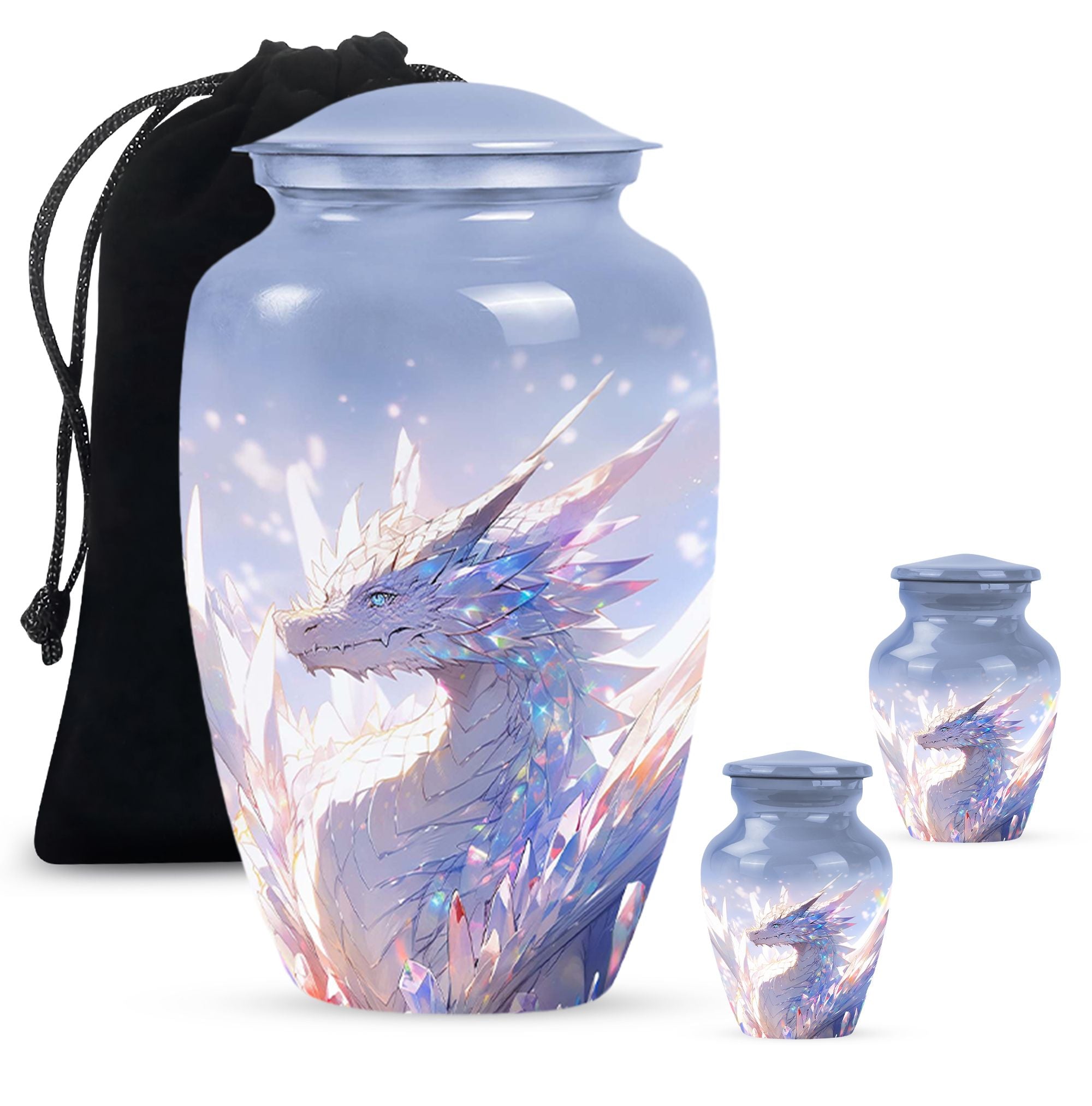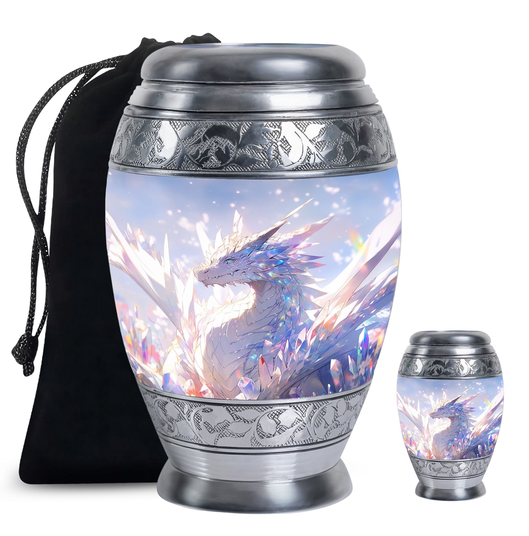 Expertly made from premium-grade aluminum, this urn features a polished crystal dragon motif that radiates light and reverence. The intricate craftsmanship ensures durability while exuding a timeless allure, perfect for home display or memorial placement. Designed to fit adult urns for human ashes large, it provides ample capacity and a secure resting place. Each urn is carefully handcrafted, symbolizing enduring love and eternal remembrance for those who hold a special place in your heart.