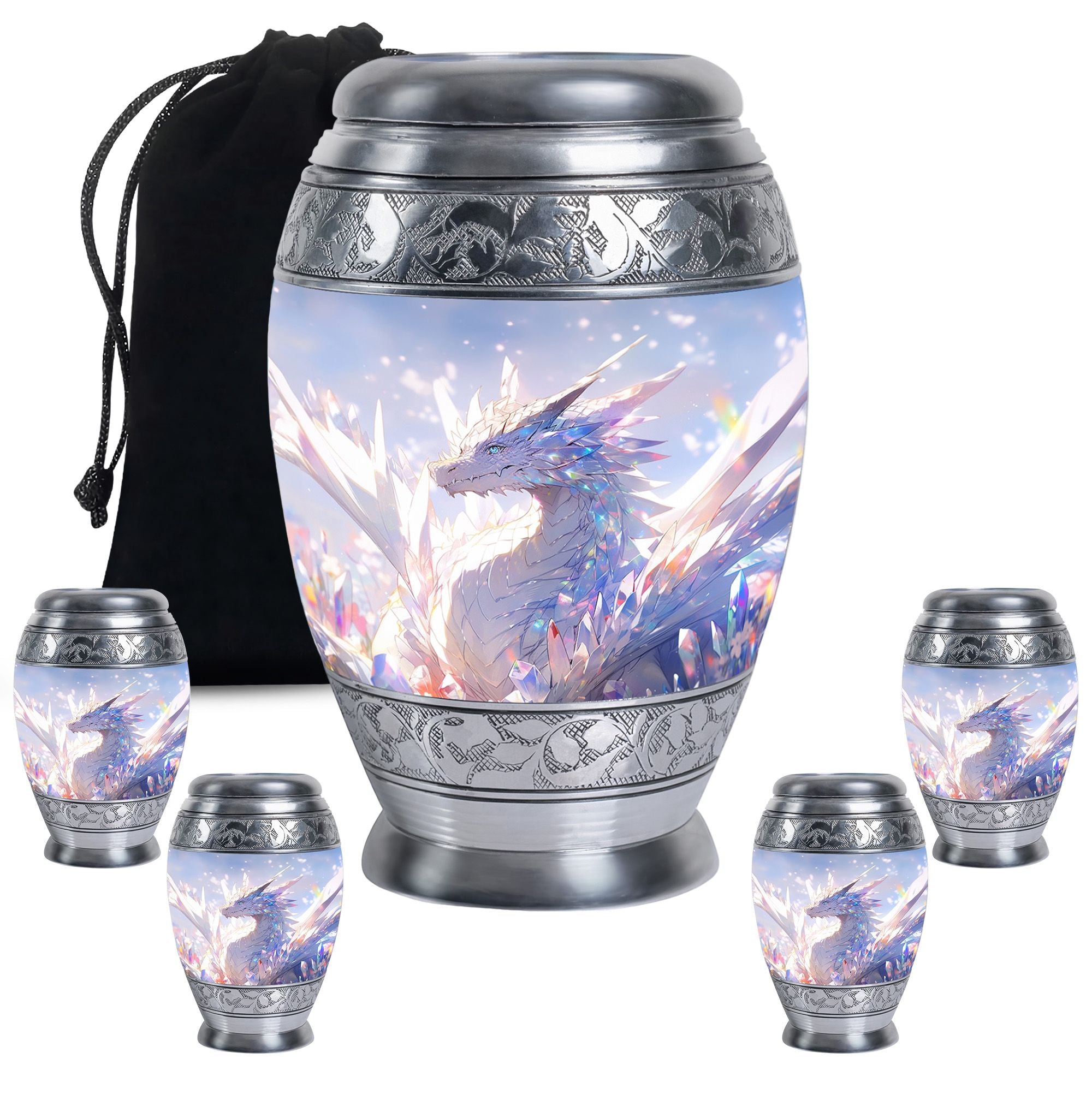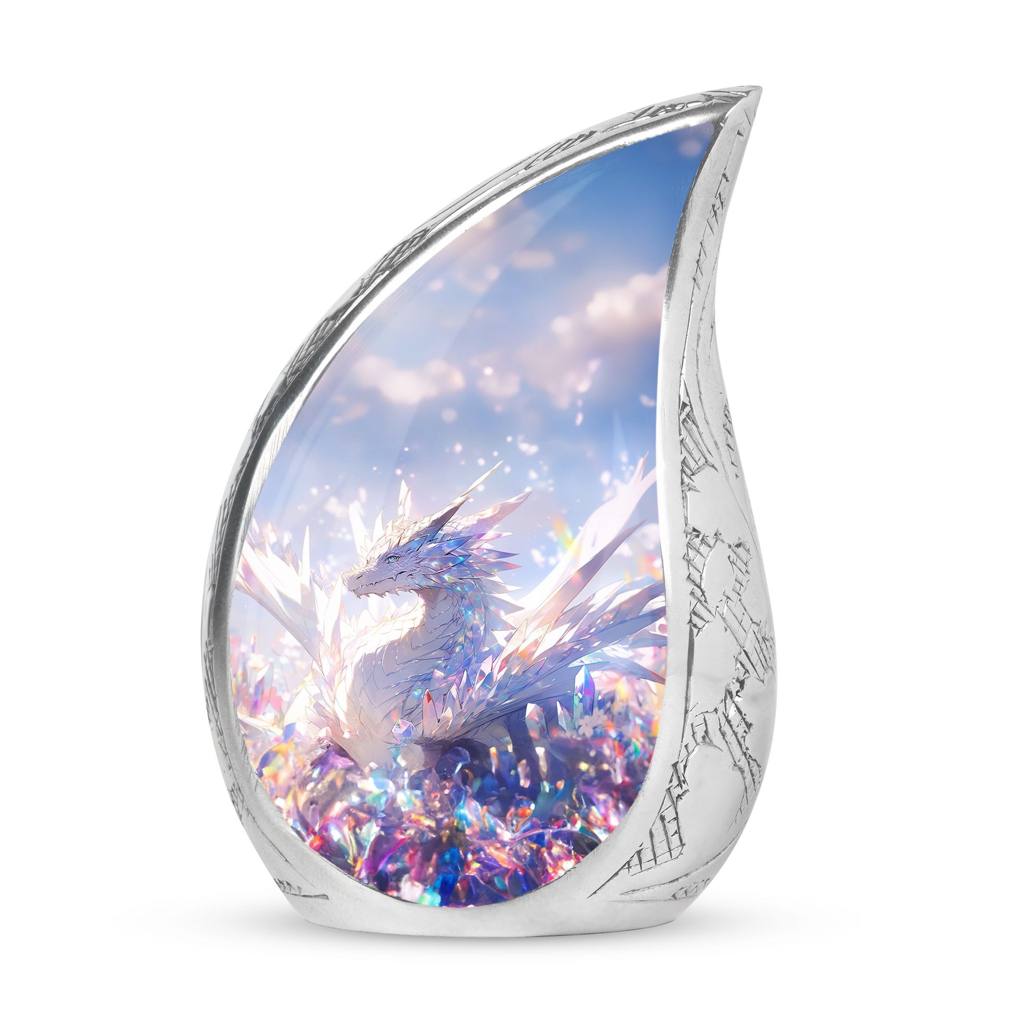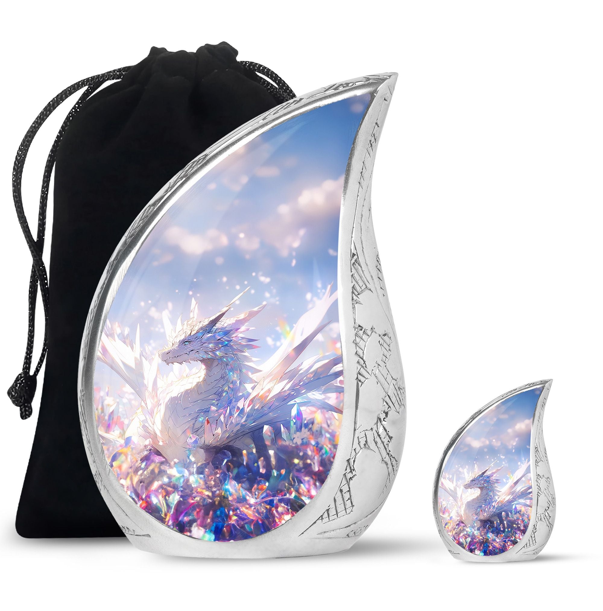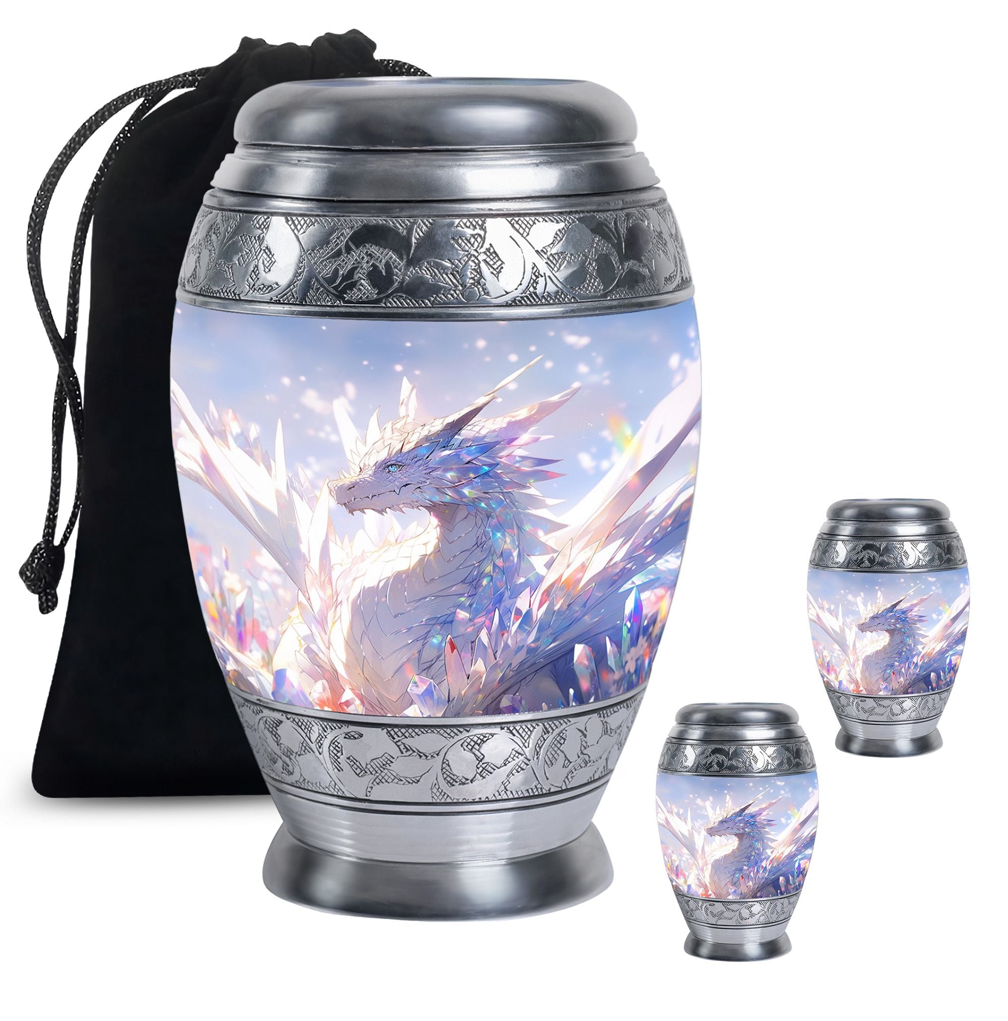 Expertly made from premium-grade aluminum, this urn features a polished crystal dragon motif that radiates light and reverence. The intricate craftsmanship ensures durability while exuding a timeless allure, perfect for home display or memorial placement. Designed to fit adult urns for human ashes large, it provides ample capacity and a secure resting place. Each urn is carefully handcrafted, symbolizing enduring love and eternal remembrance for those who hold a special place in your heart.