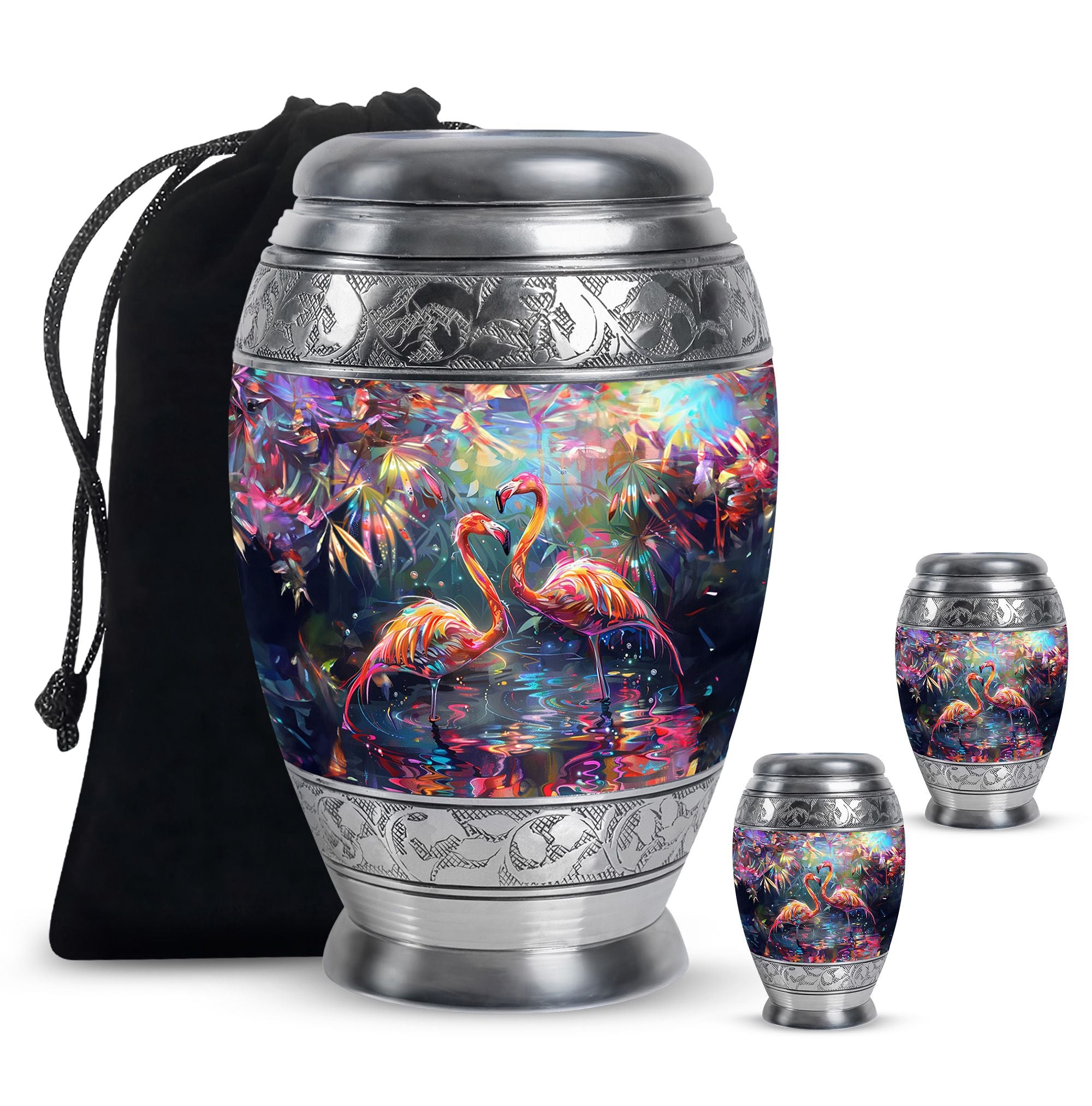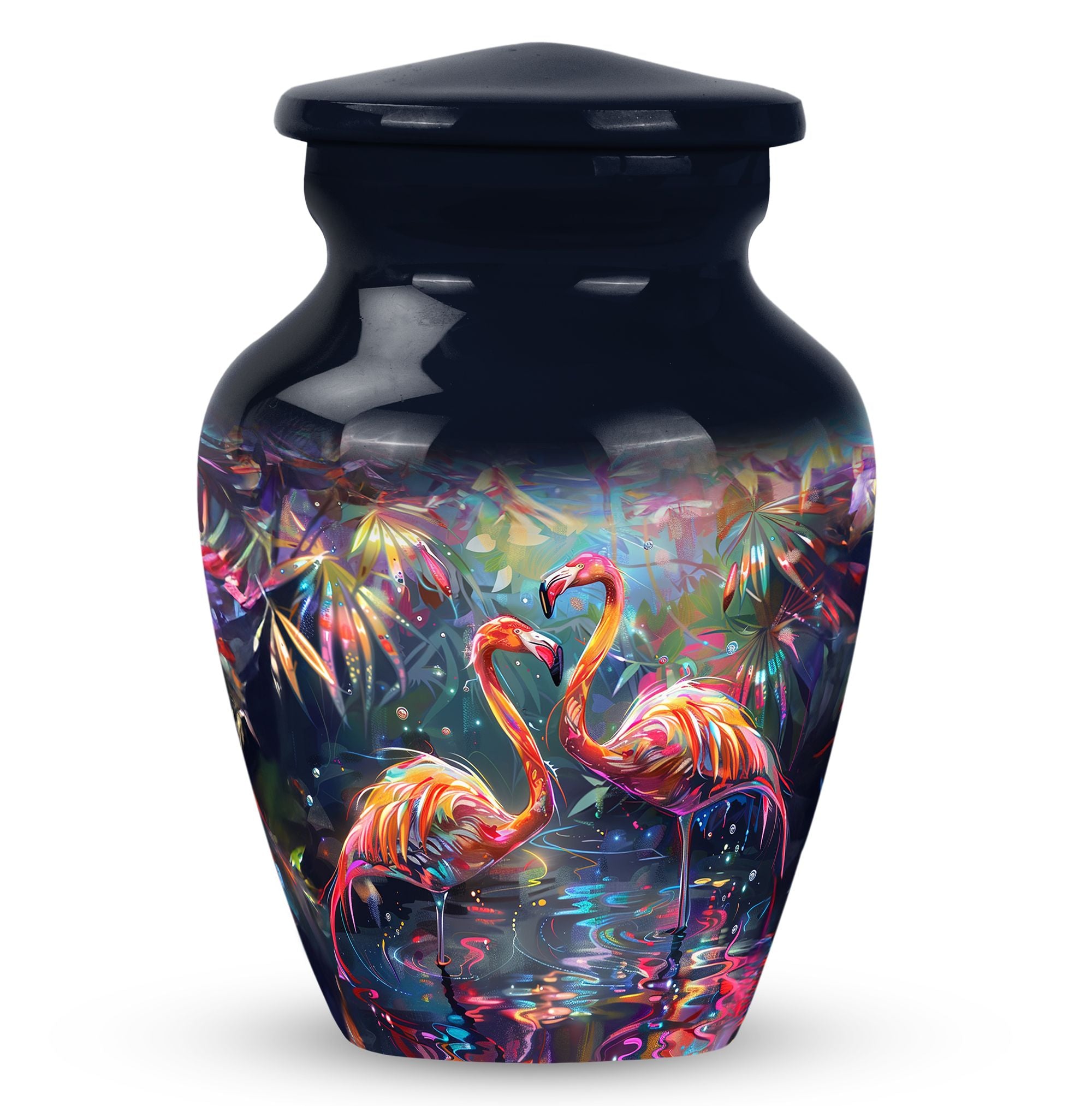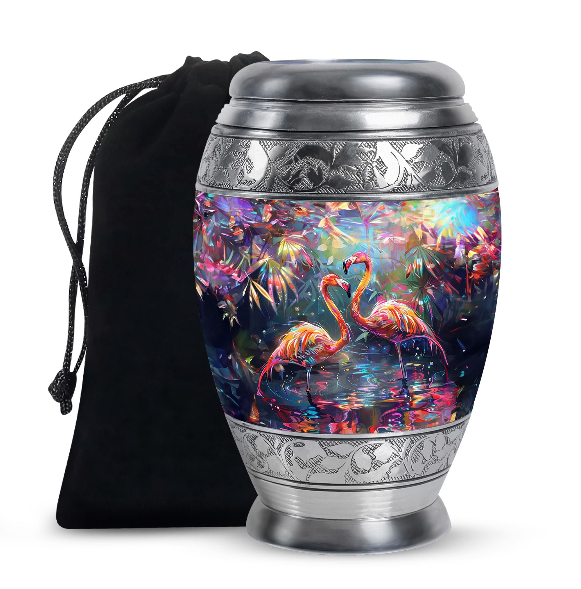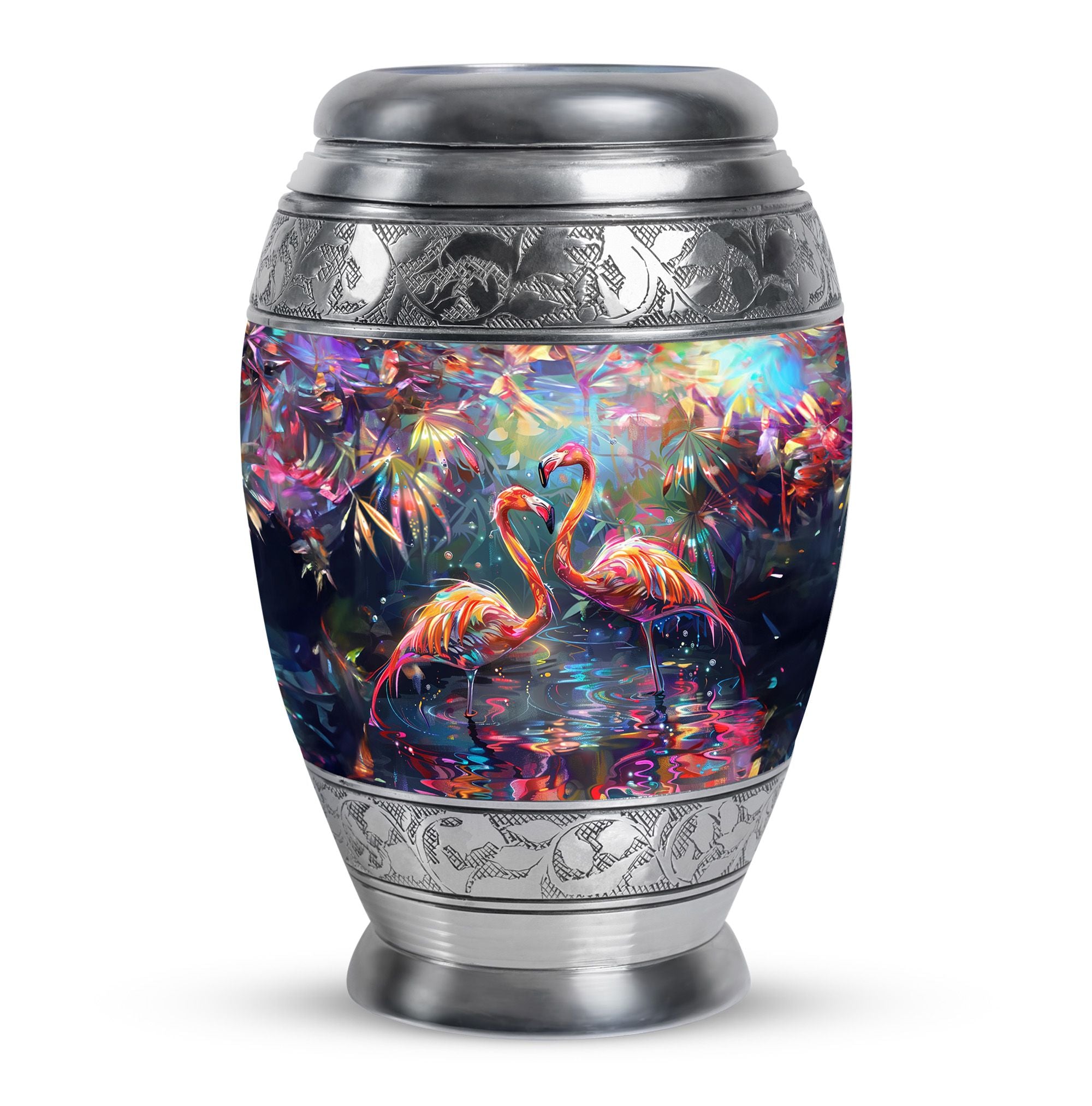 Expertly crafted from premium aluminum, this funeral cremation urn combines durability with artistry. The brilliant flamingo motif and polished finish make it ideal for display or burial. Its secure screw-top lid ensures ashes are safely preserved, offering peace of mind to families. Perfect for those seeking funeral cremation urns for ashes or a funeral adult urn, this piece can also be paired with matching small funeral urns for shared remembrance. A symbol of unity and serenity, it beautifully suits any memorial setting.