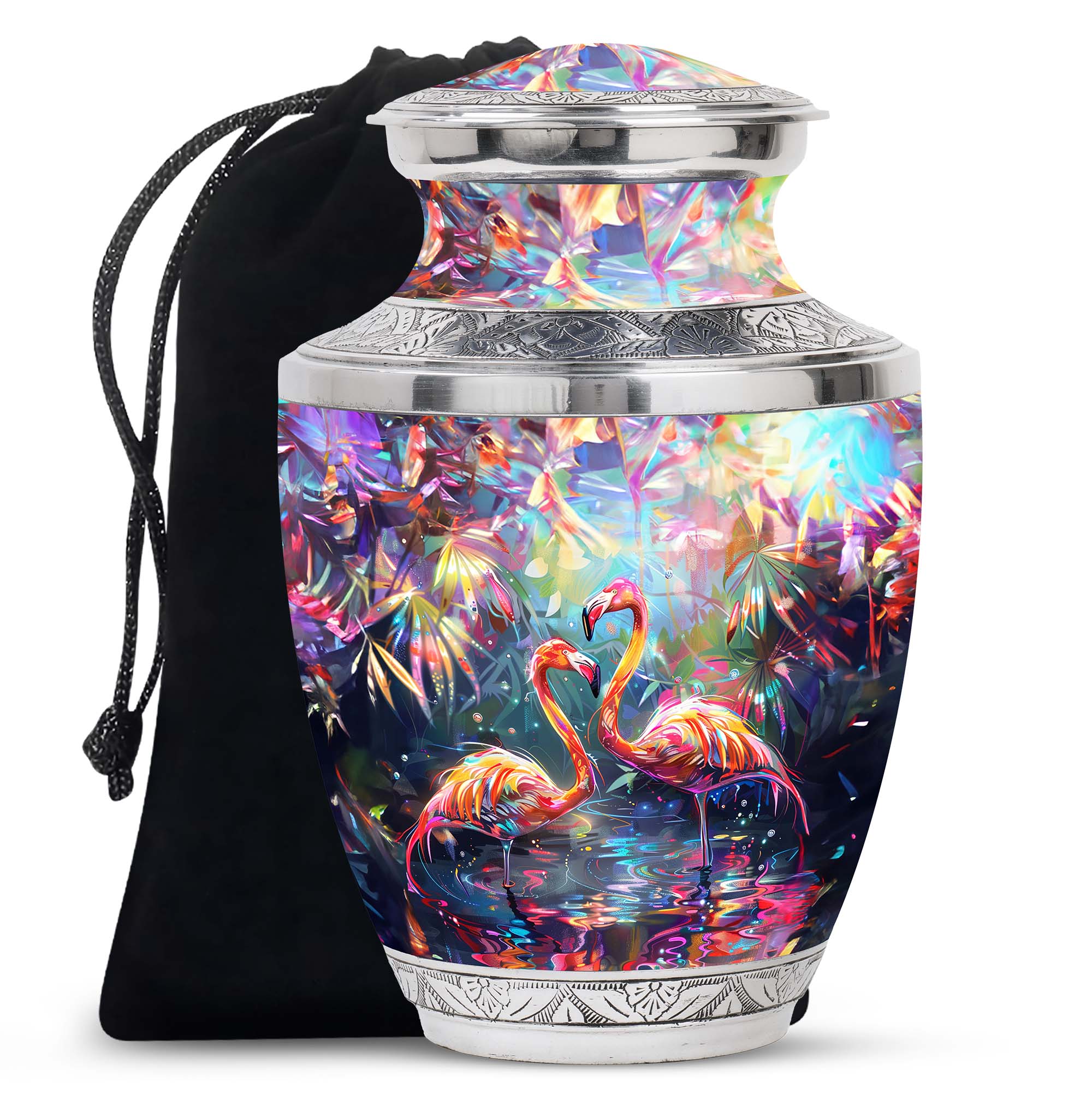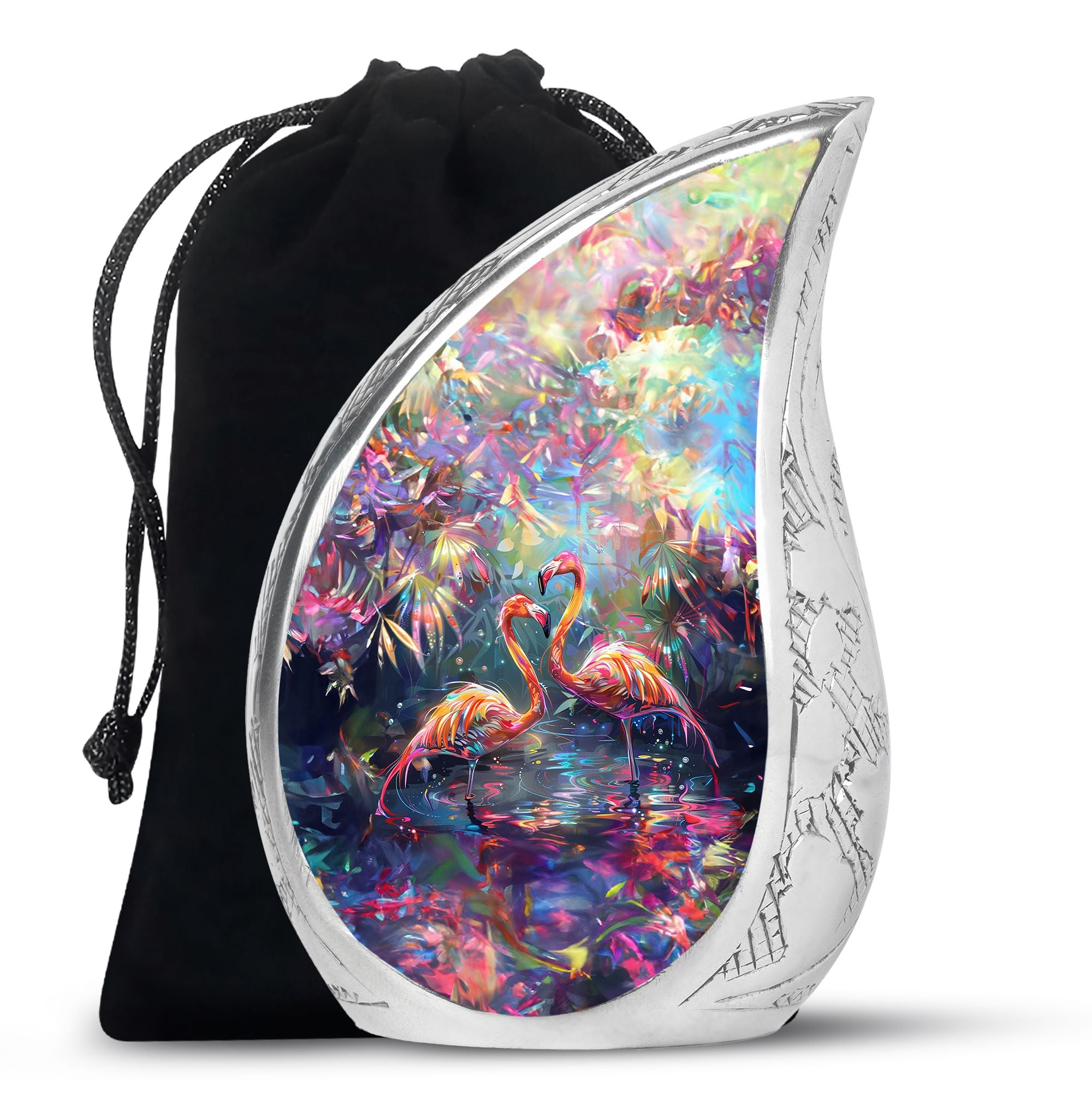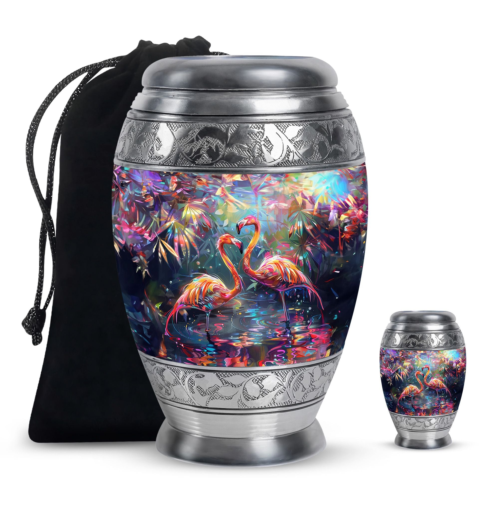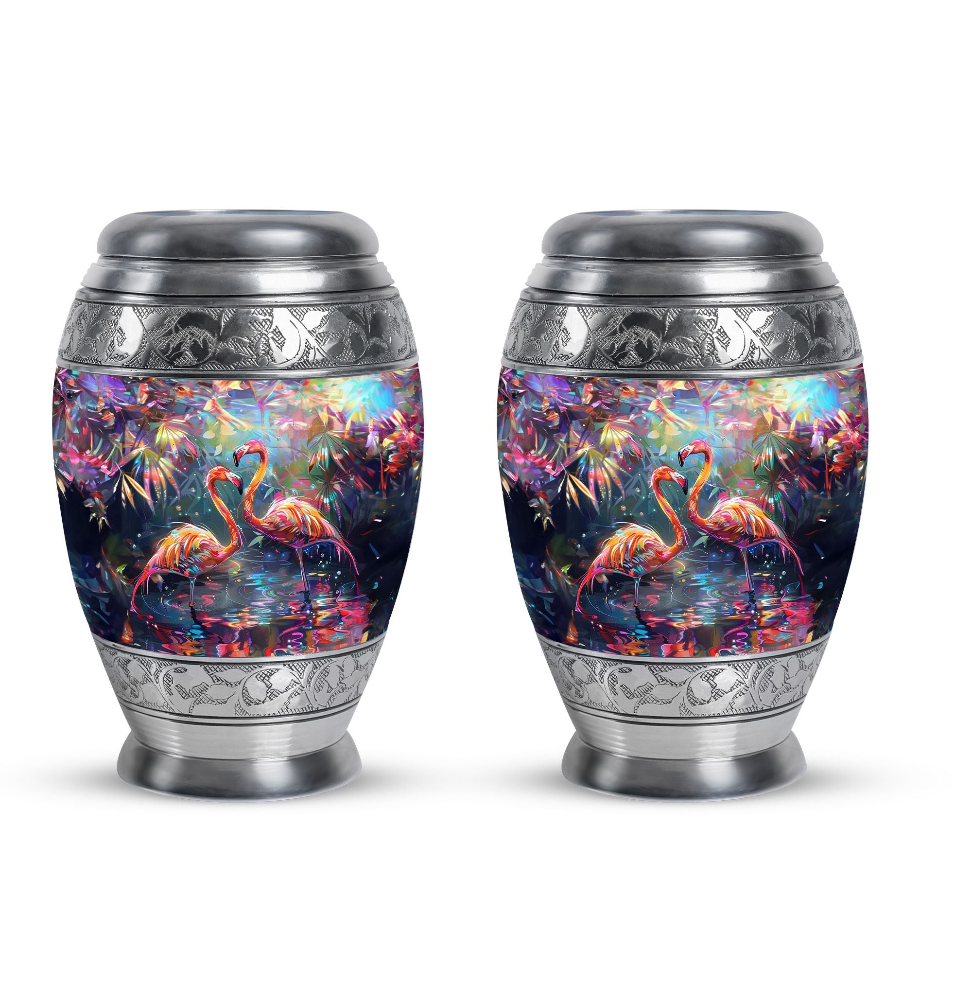 Expertly crafted from premium aluminum, this funeral cremation urn combines durability with artistry. The brilliant flamingo motif and polished finish make it ideal for display or burial. Its secure screw-top lid ensures ashes are safely preserved, offering peace of mind to families. Perfect for those seeking funeral cremation urns for ashes or a funeral adult urn, this piece can also be paired with matching small funeral urns for shared remembrance. A symbol of unity and serenity, it beautifully suits any memorial setting.
