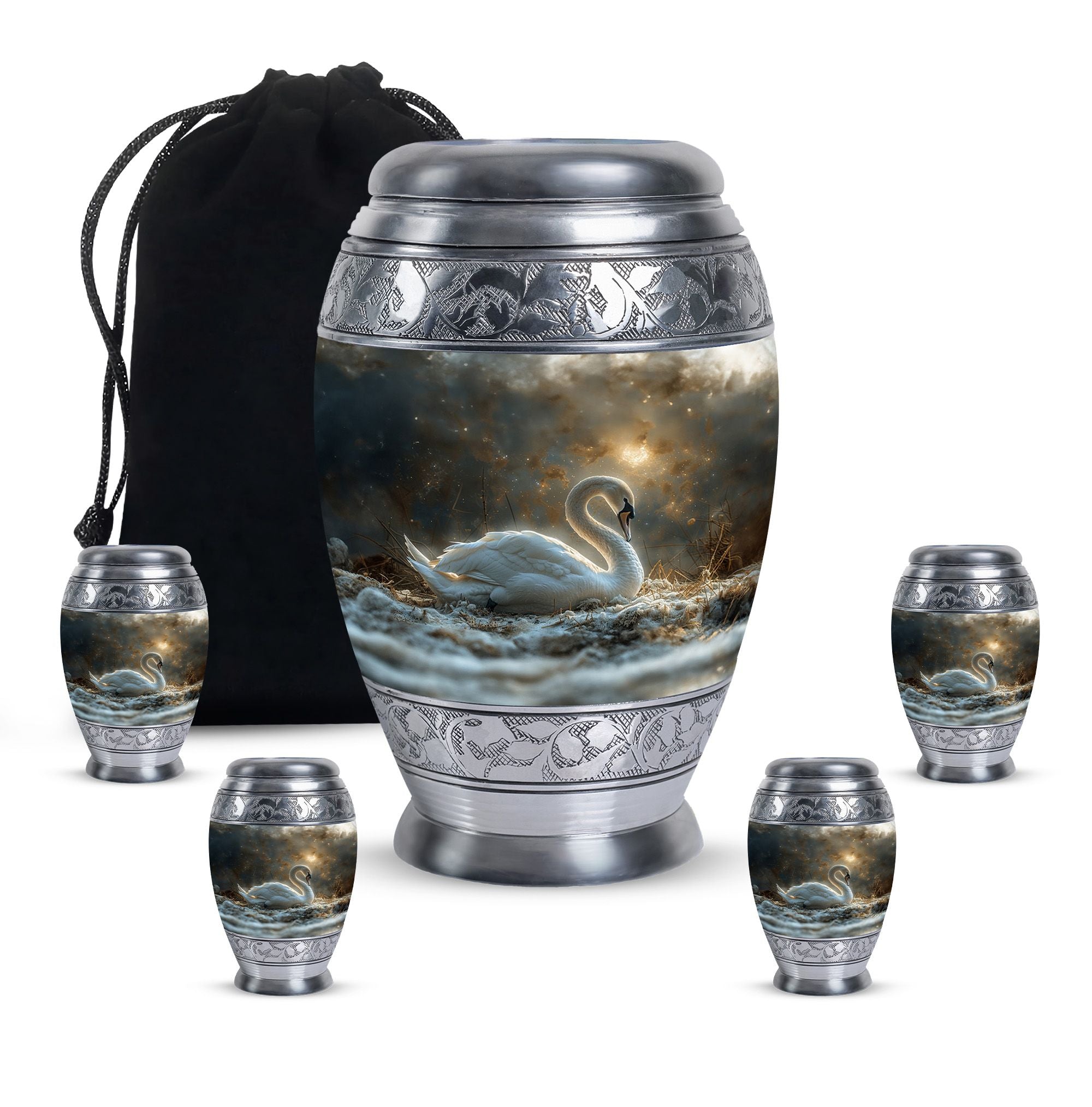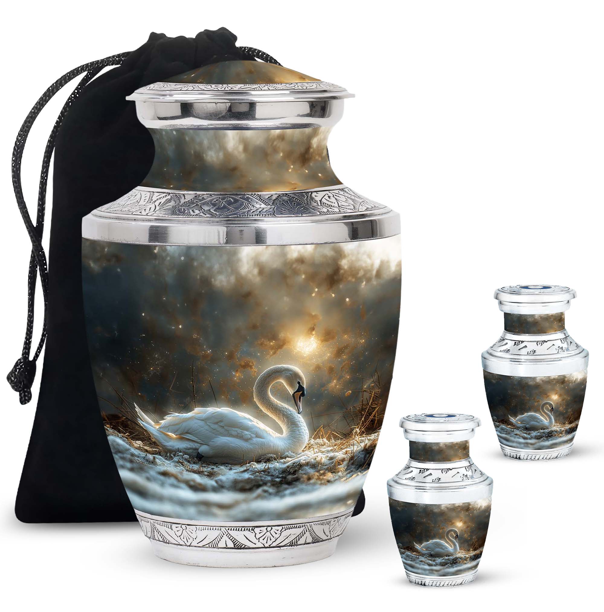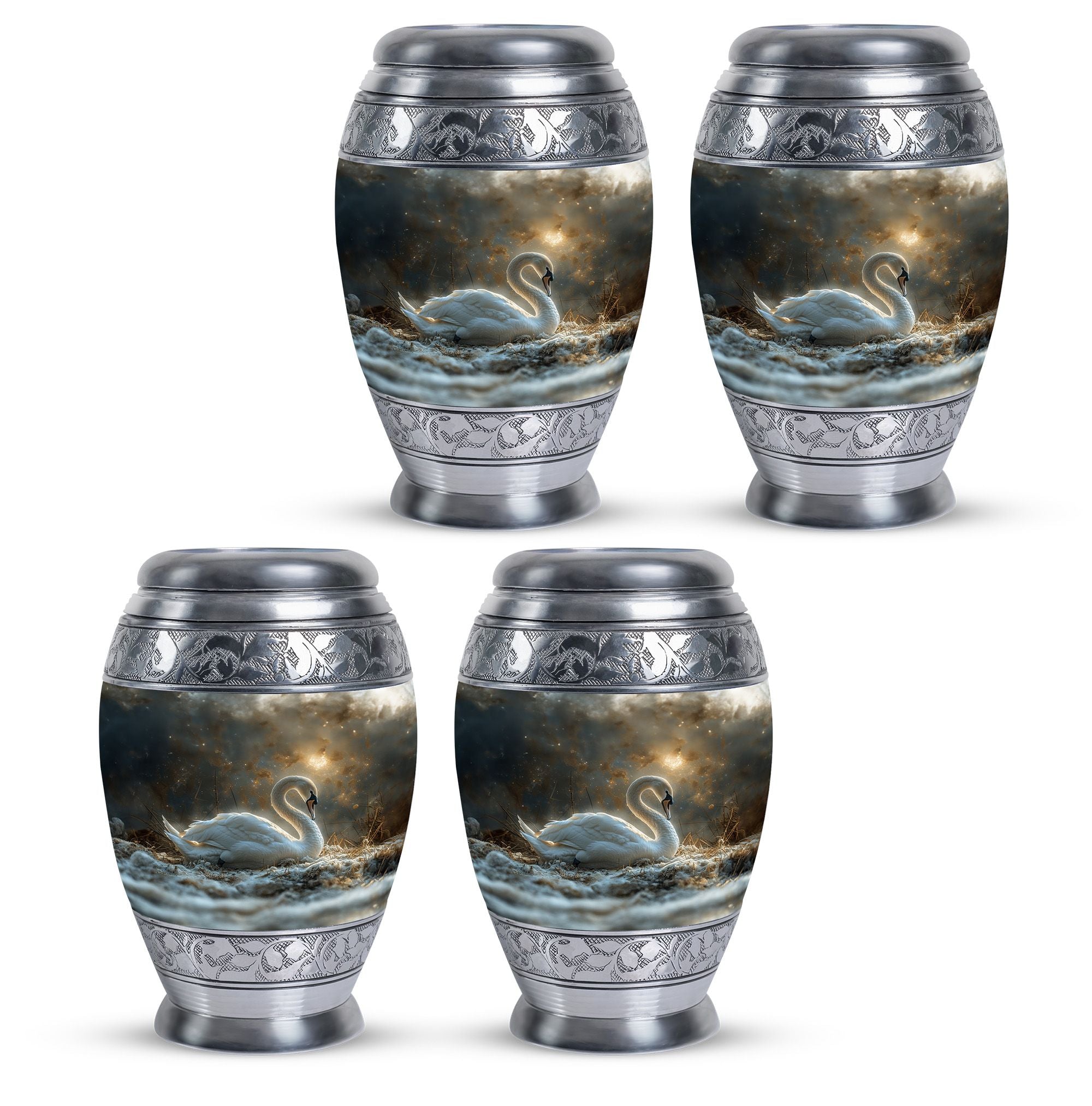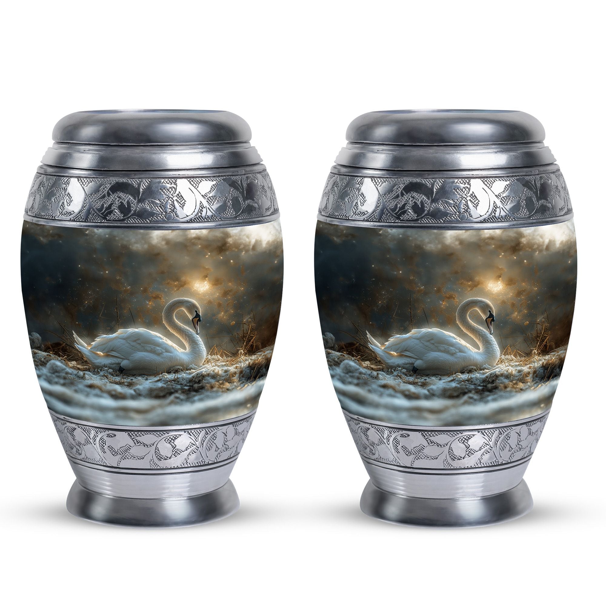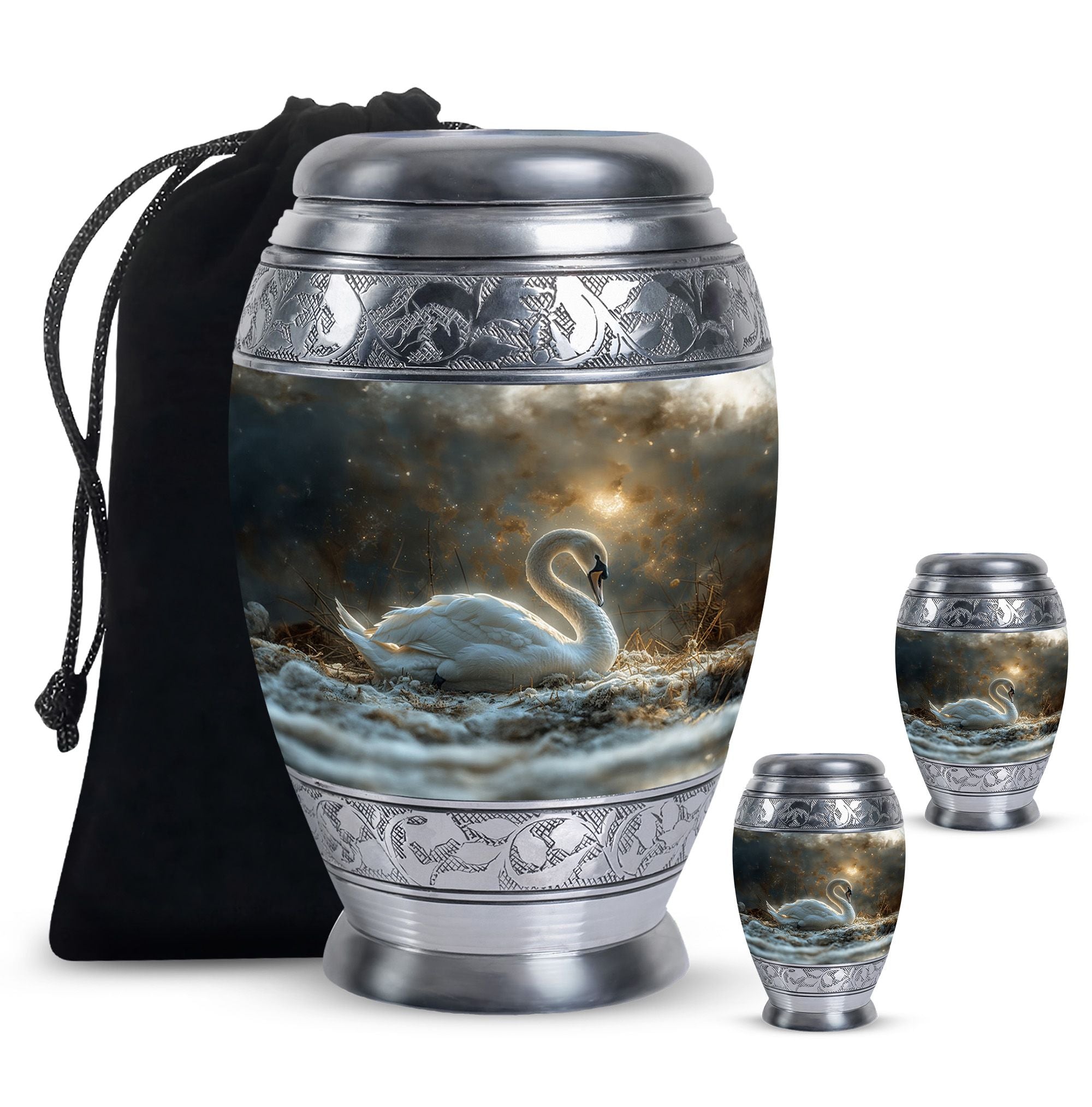 Meticulously handcrafted, this urn features a radiant gold finish adorned with graceful swan motifs — representing purity, peace, and eternal rest. Made from durable aluminum, it ensures strength and longevity while maintaining a refined appearance. Perfect for home display or a memorial niche, this adult cremation urn balances sophistication with emotional comfort. Ideal for families seeking cremation urns for human ashes adult set or individual cremation urns for adults, this design unites traditional elegance with modern craftsmanship.