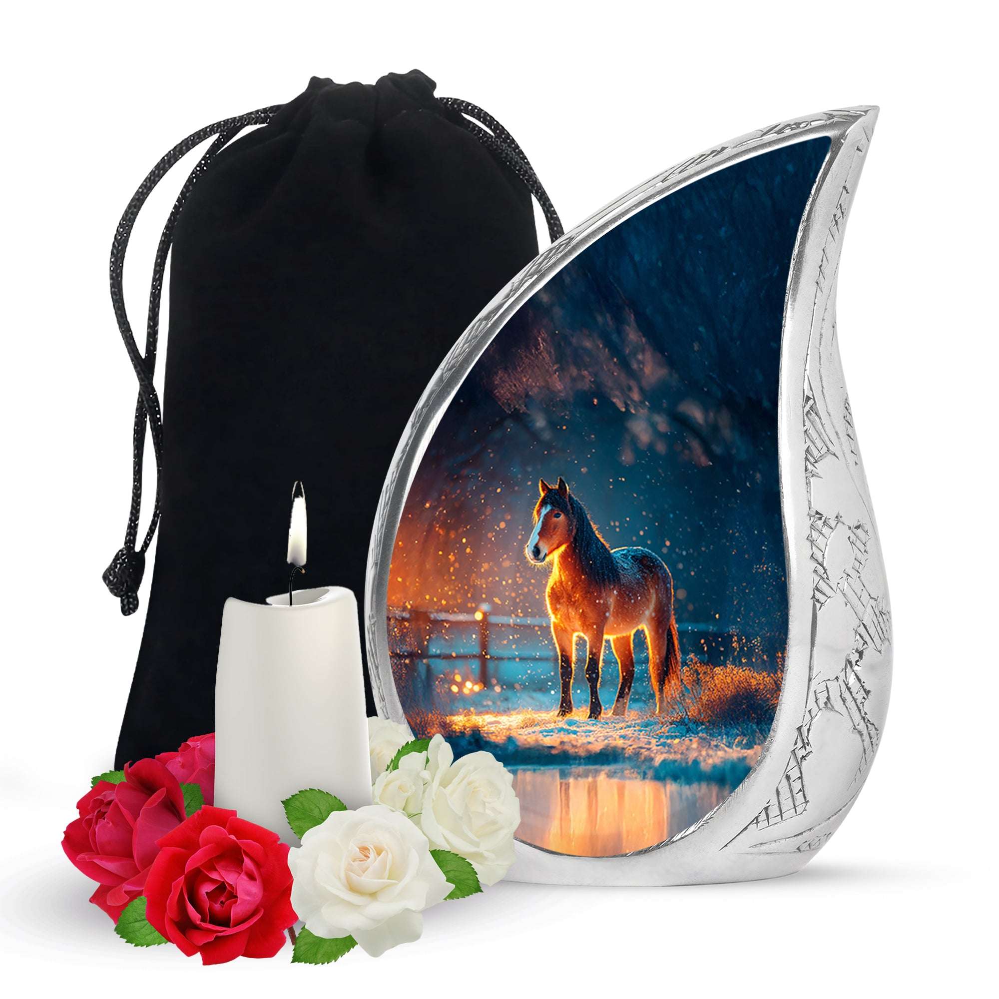 Crafted with precision, this elegant horse-themed urn is made from durable aluminium with a secure screw-top lid. Its 10-inch height and 200 cubic inch capacity make it suitable as urns adult male small, urn ashes adult male, or large urns for female & male, combining functionality, artistry, and lasting quality for any memorial setting.