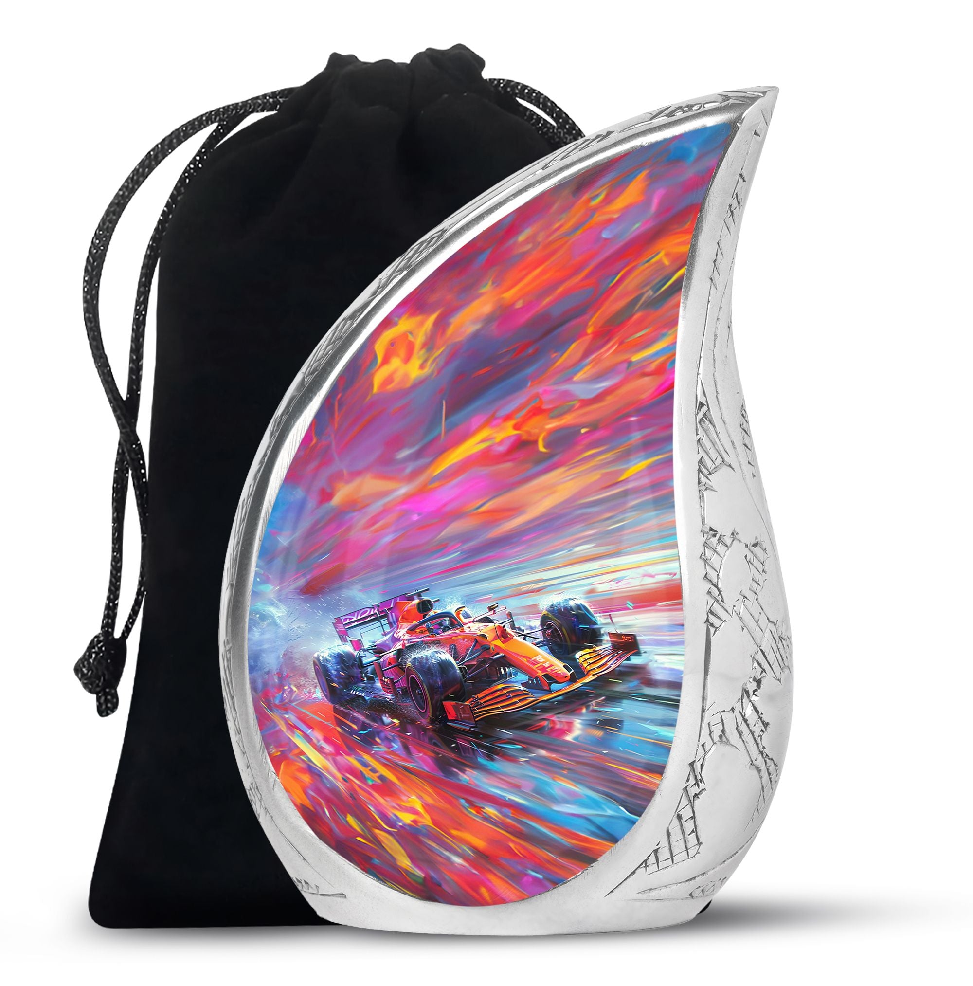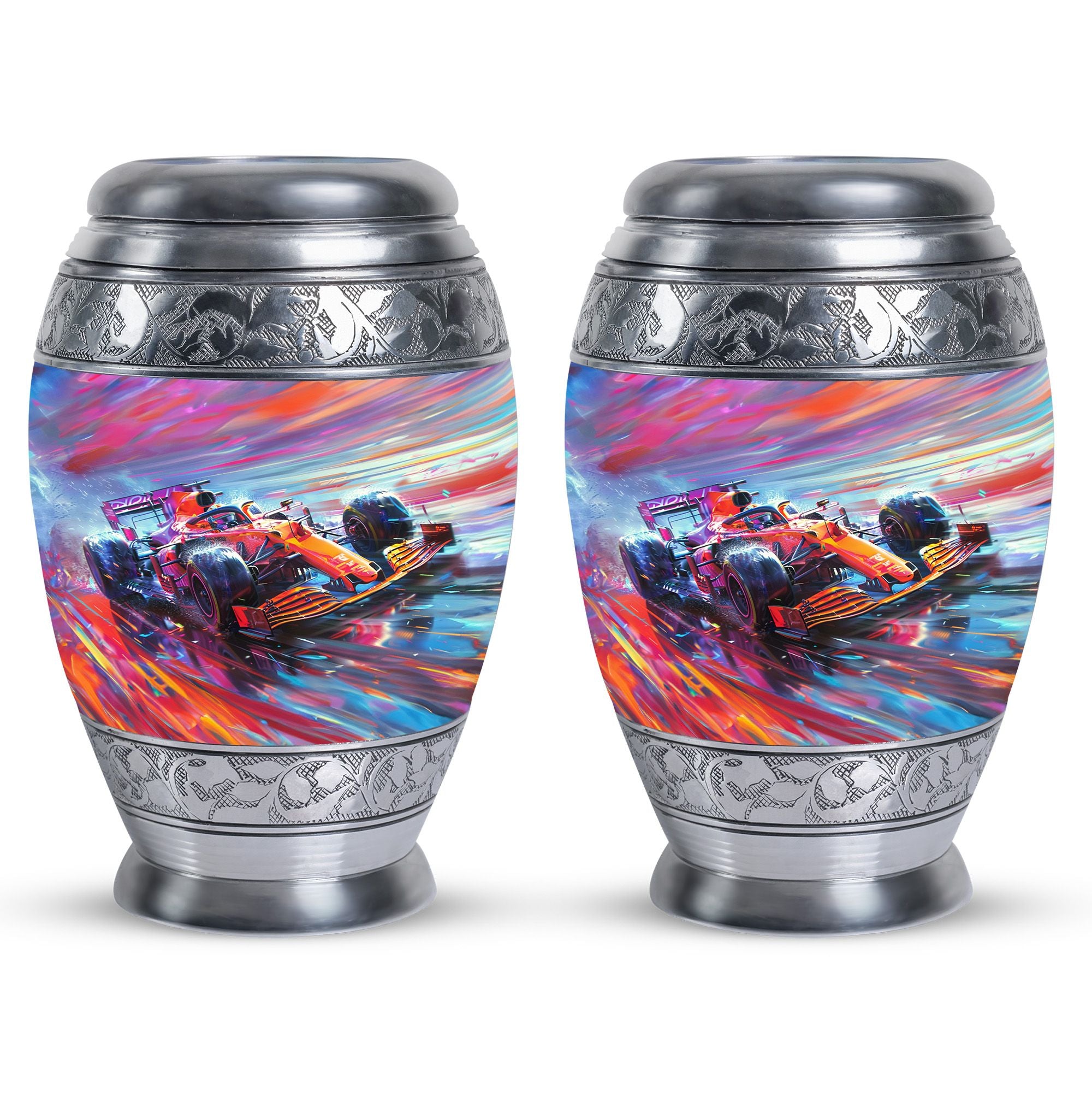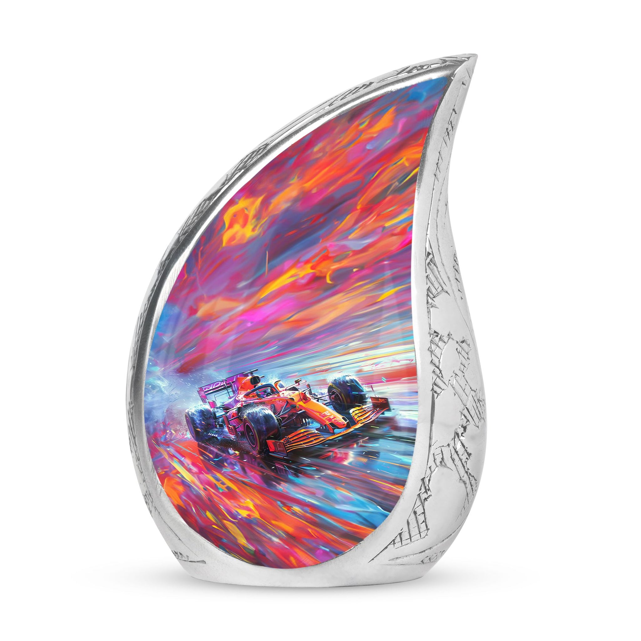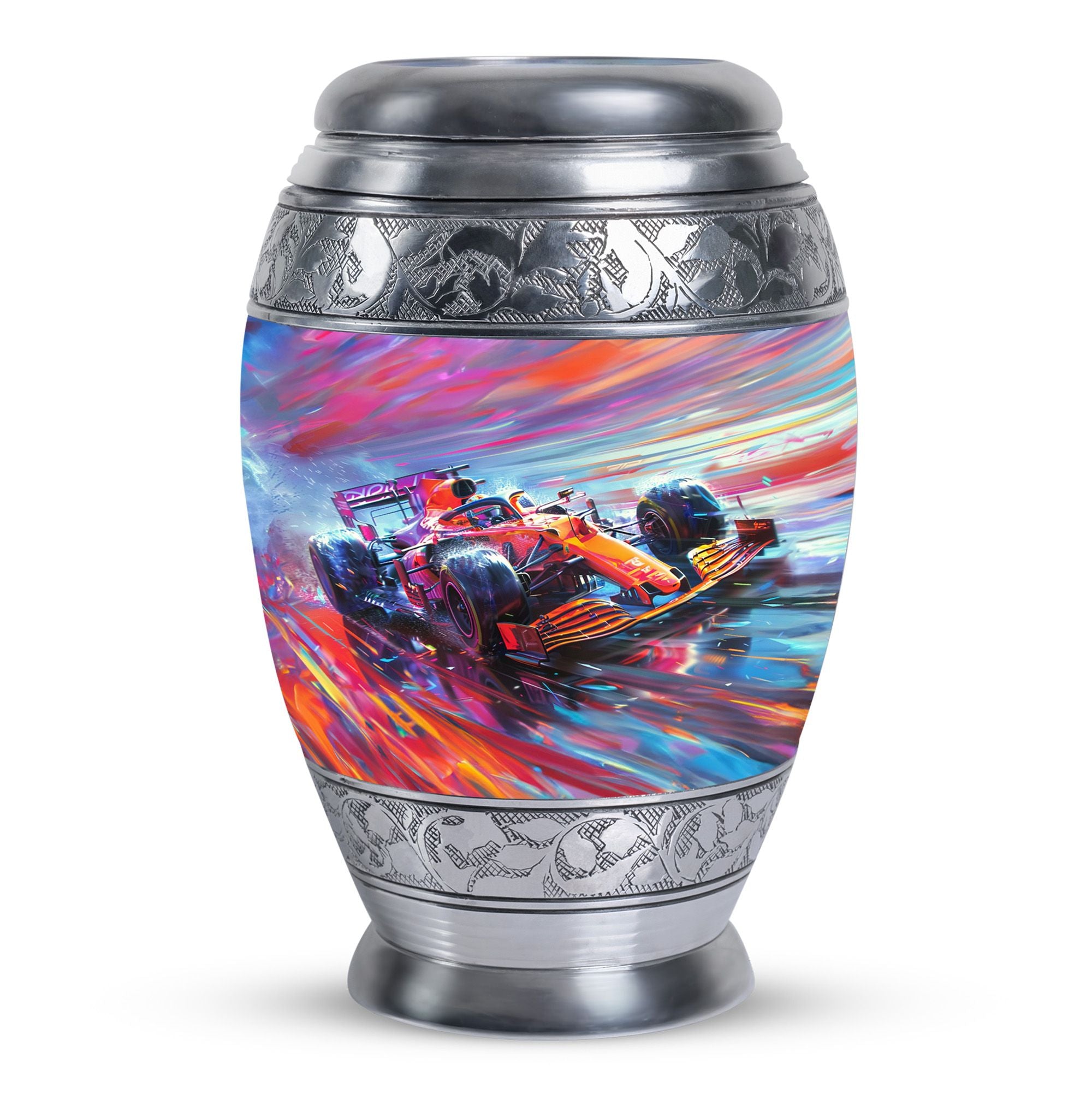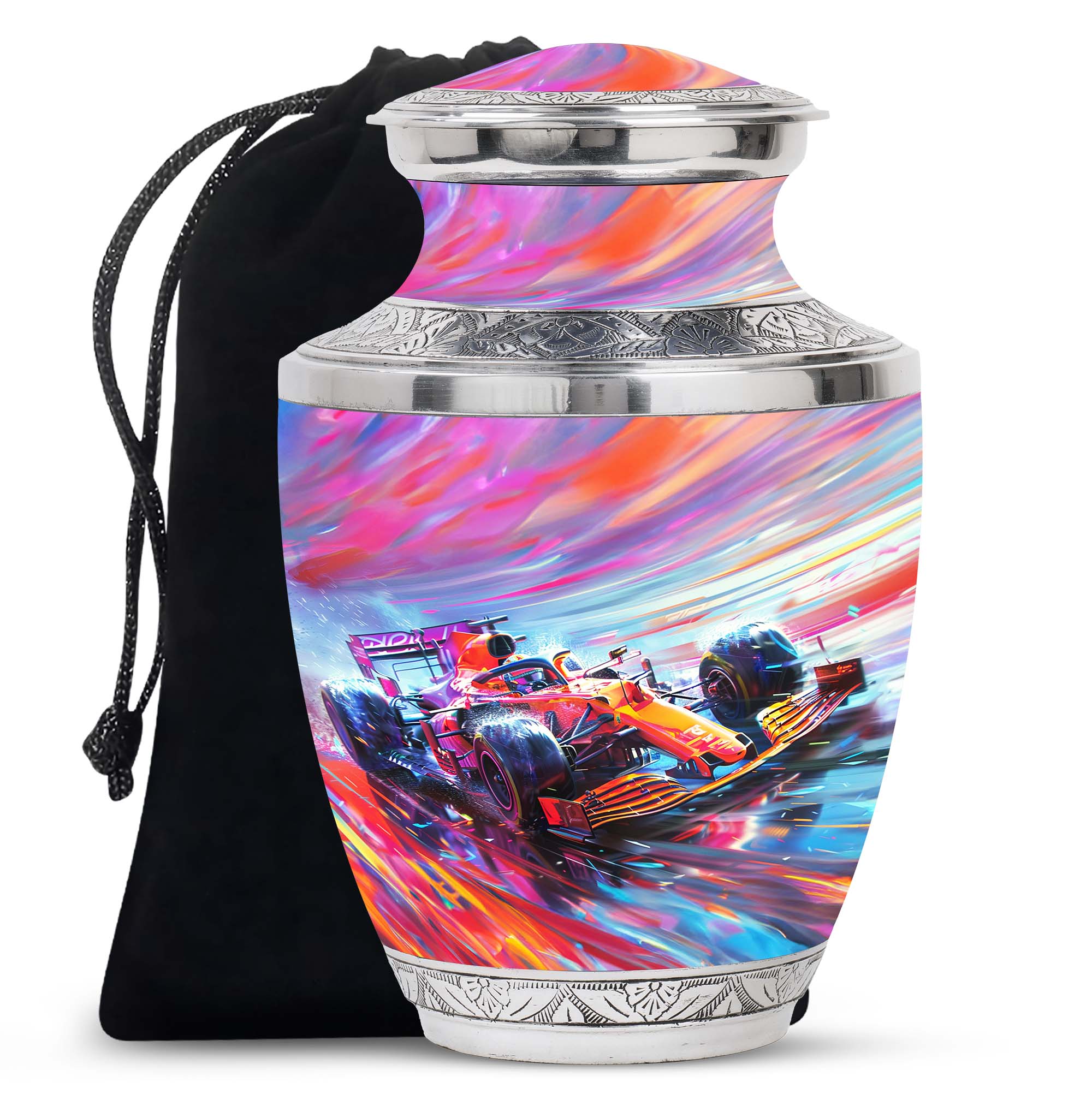 The **Hyperdrive Racing Chaos Urn** embodies the **pulse-pounding intensity of street racing, neon-lit highways, and the rush of acceleration, symbolizing adventure and an unbreakable will**.
