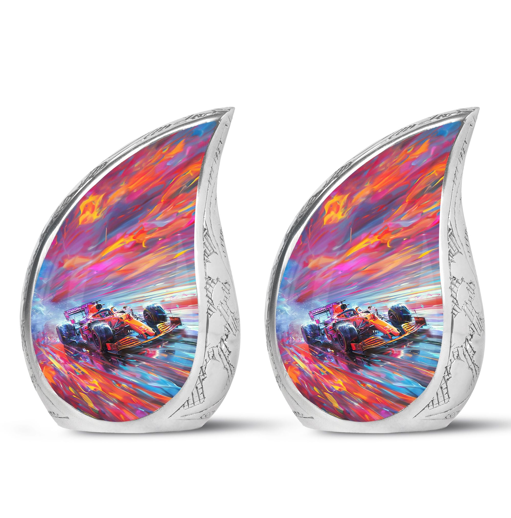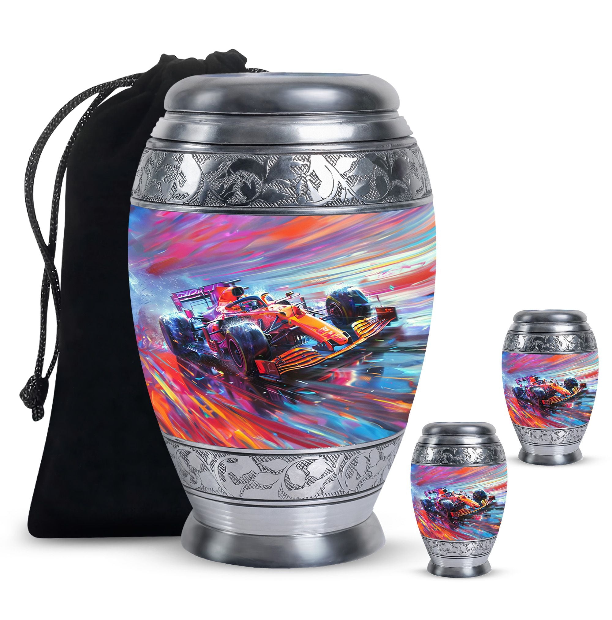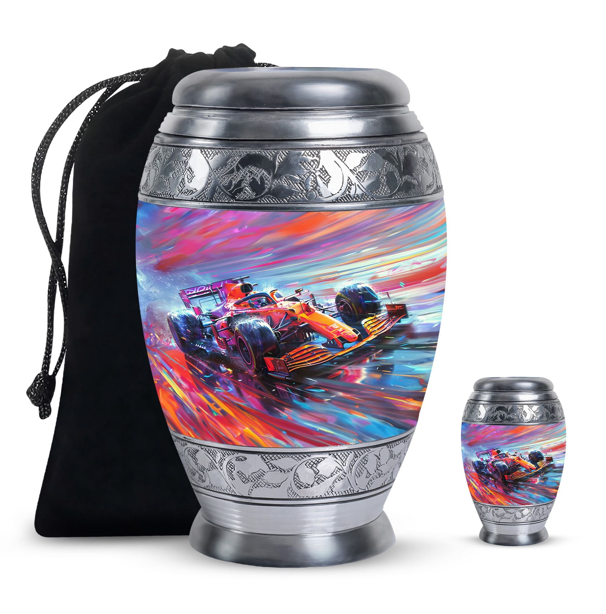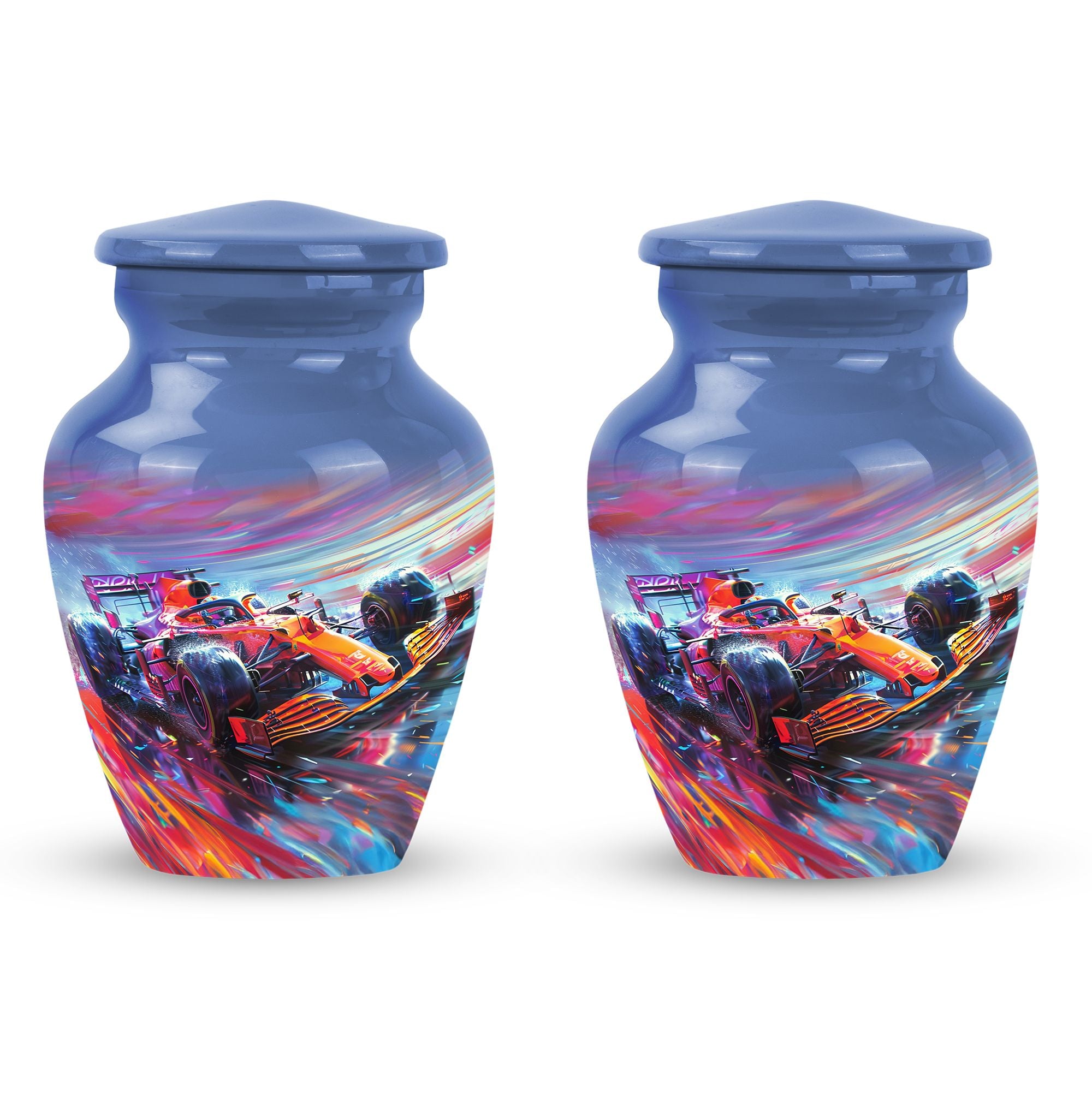 The **Hyperdrive Racing Chaos Urn** embodies the **pulse-pounding intensity of street racing, neon-lit highways, and the rush of acceleration, symbolizing adventure and an unbreakable will**.