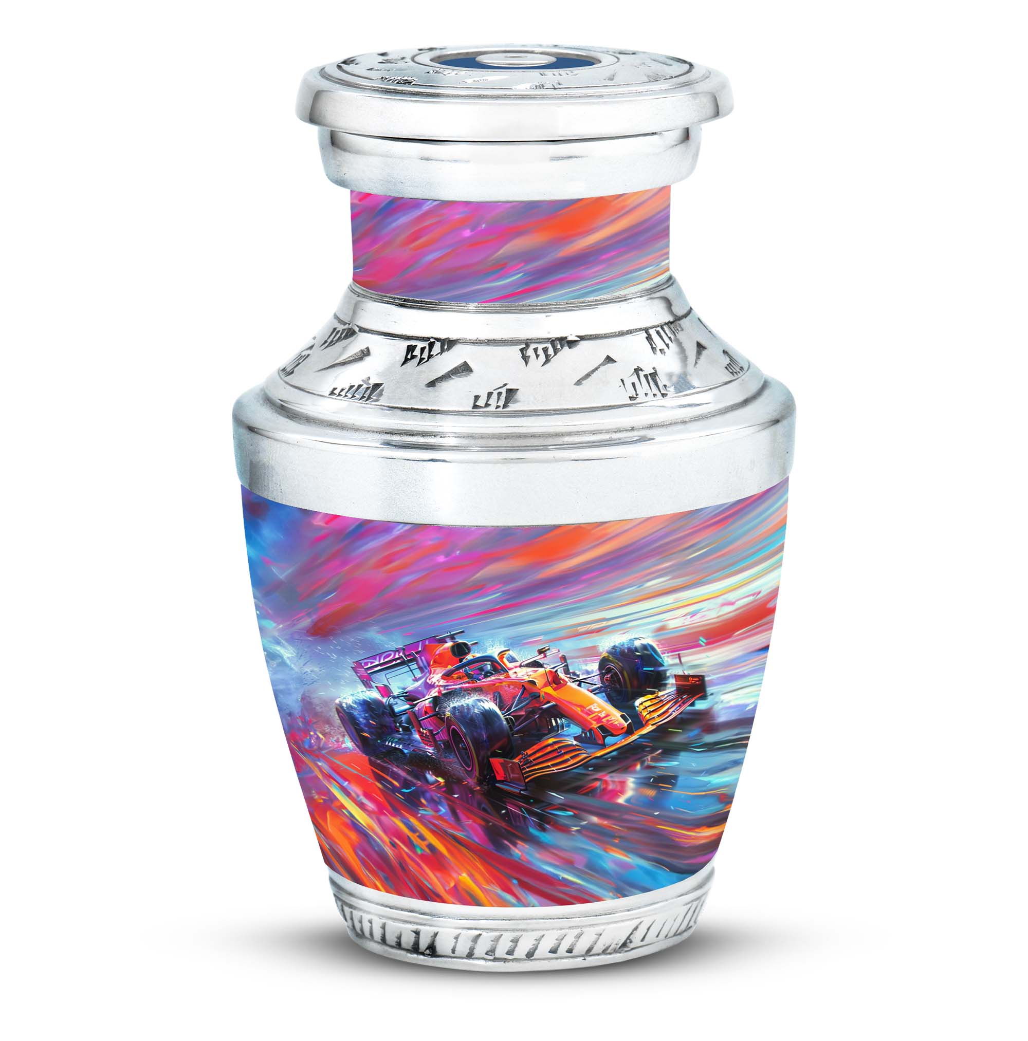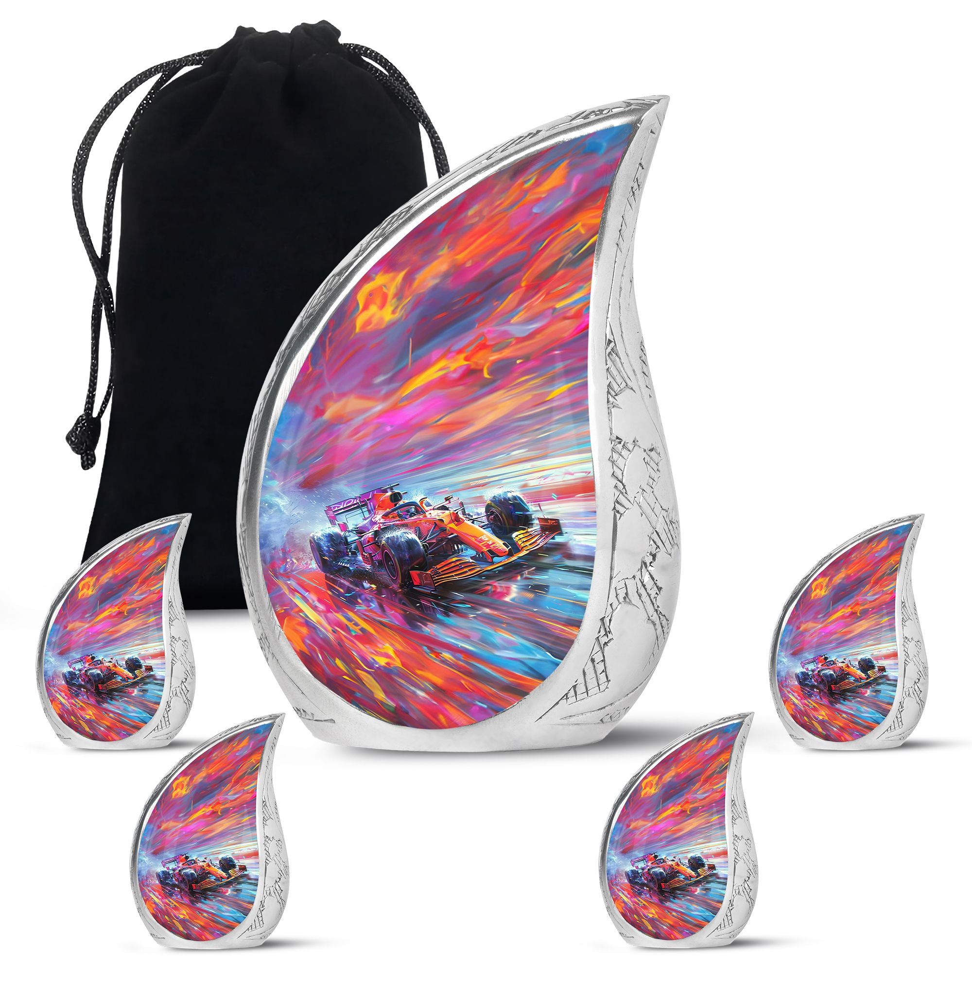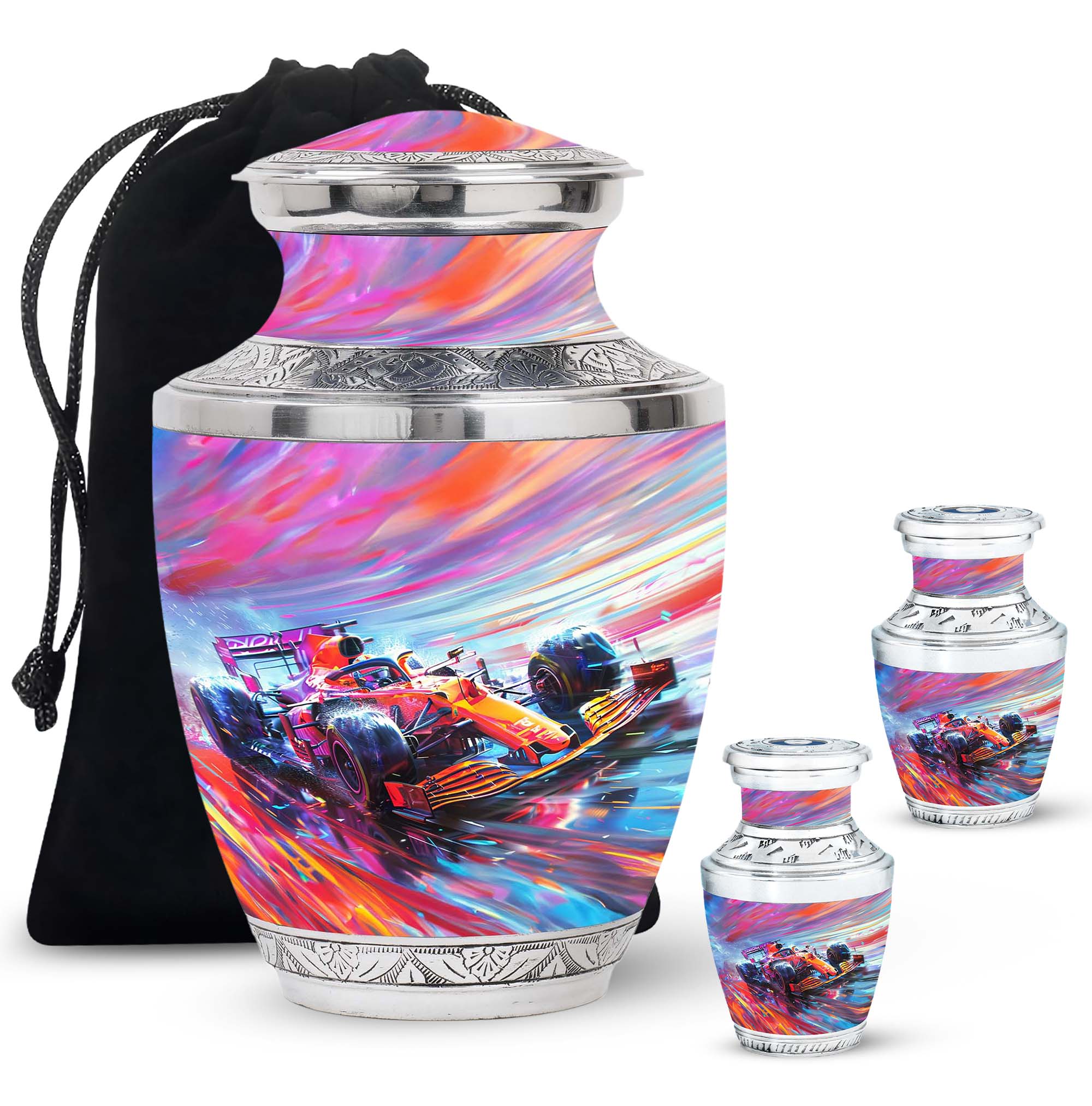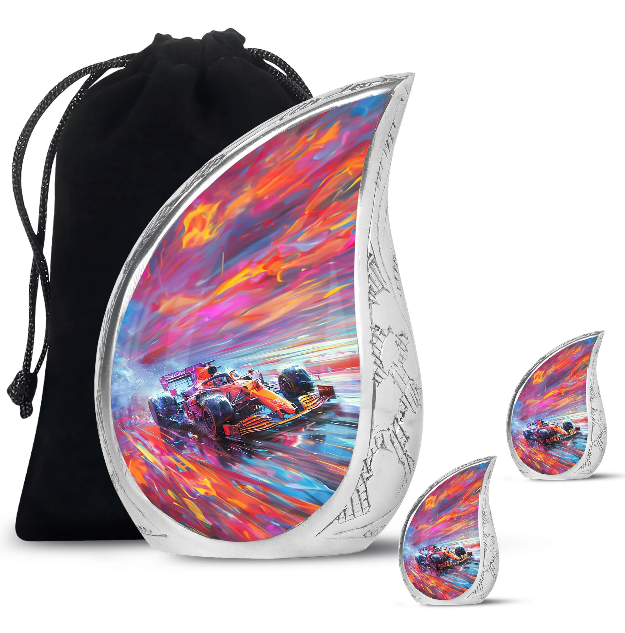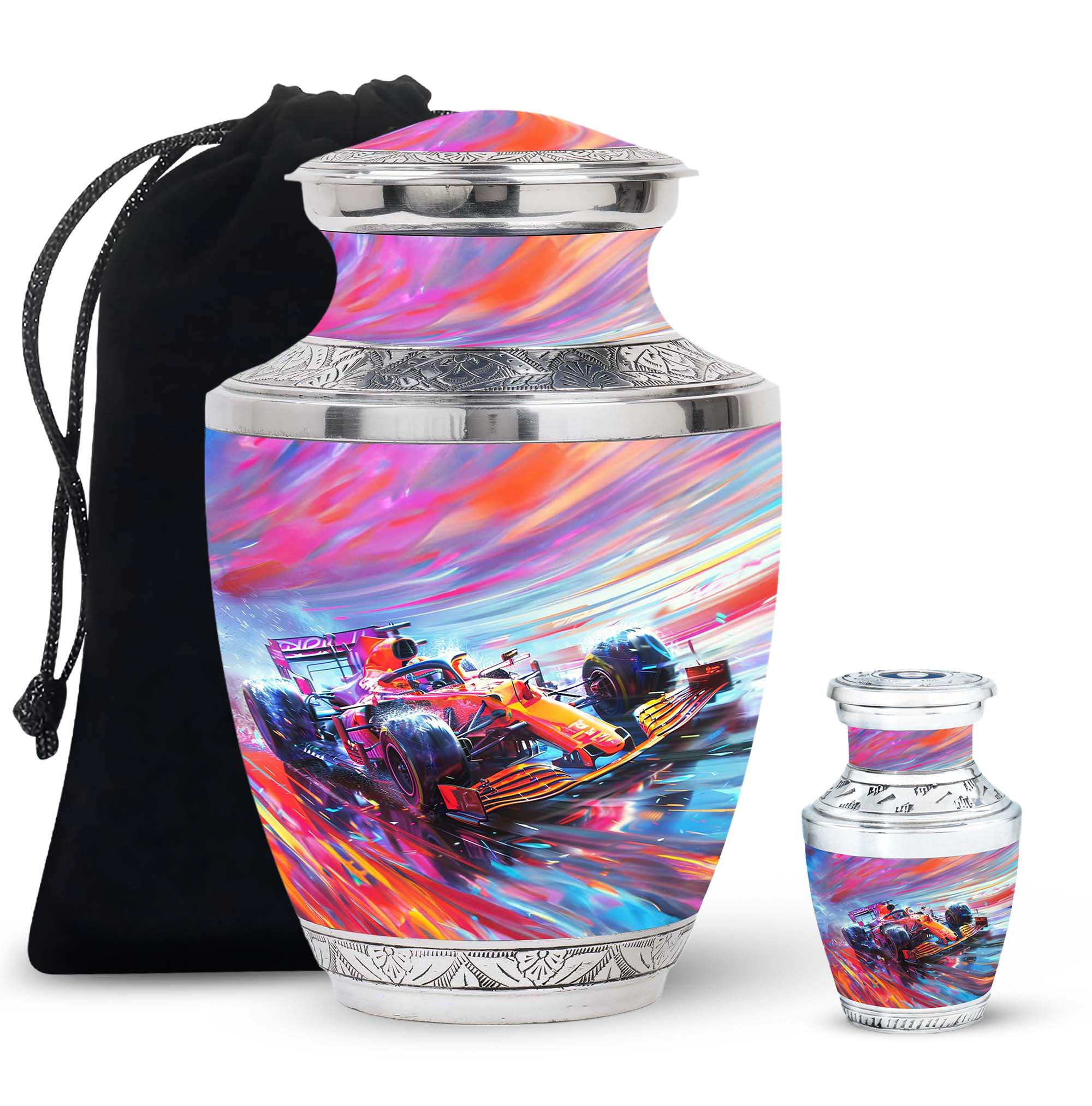 The **Hyperdrive Racing Chaos Urn** embodies the **pulse-pounding intensity of street racing, neon-lit highways, and the rush of acceleration, symbolizing adventure and an unbreakable will**.