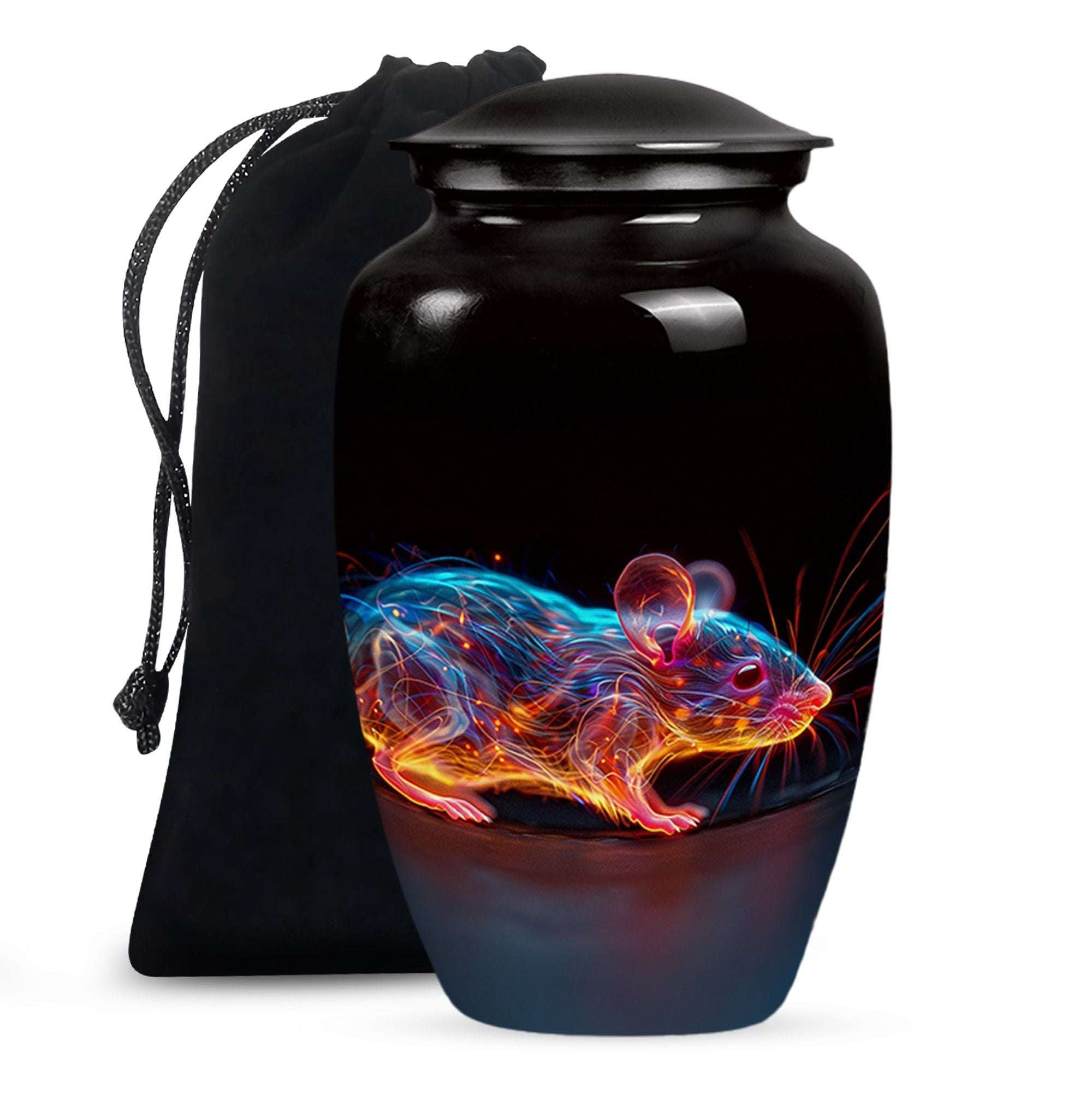 Crafted from durable aluminium, this neon rodent-themed urn combines playful design with lasting quality. Its secure screw-top lid and 10-inch height with 200 cubic inch capacity make it perfect as mini urn for human ashes, small ashes keepsake, or keepsake small urns. It is also suitable as cremation urns for human ashes or mini keepsake urns for decor.