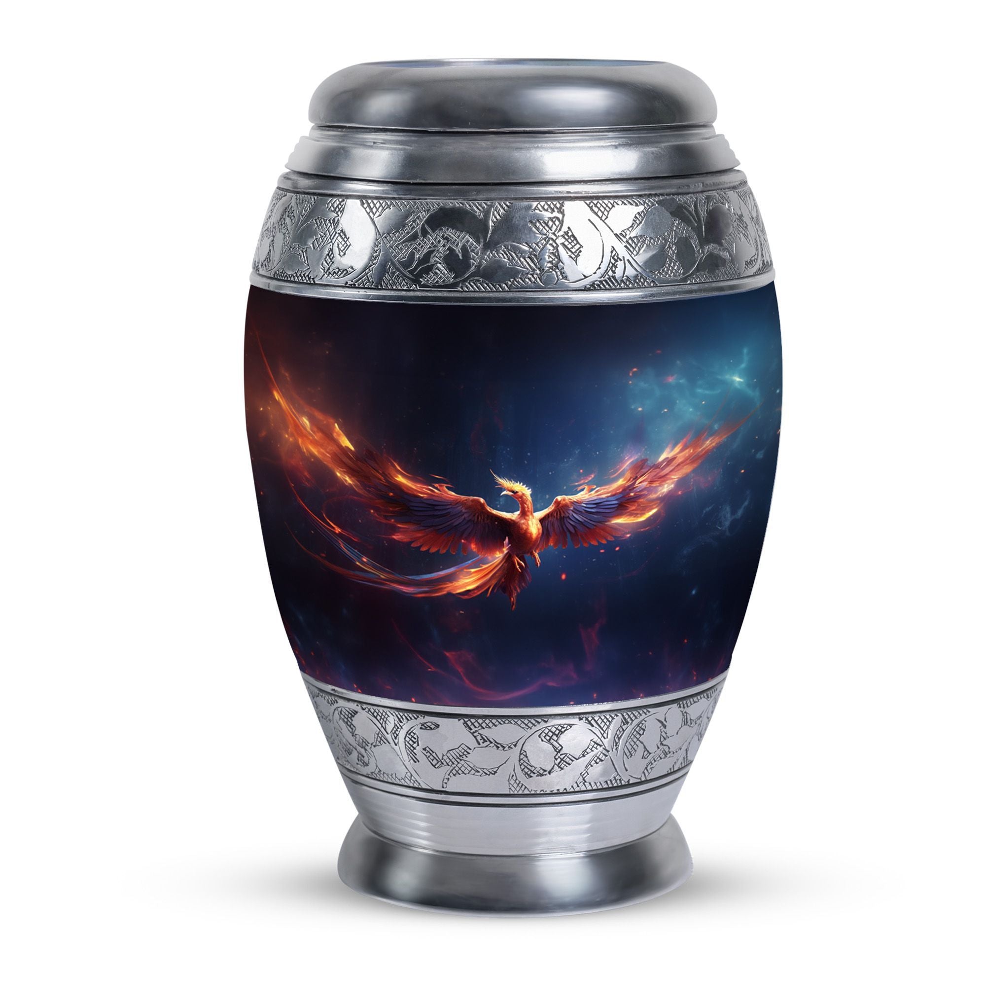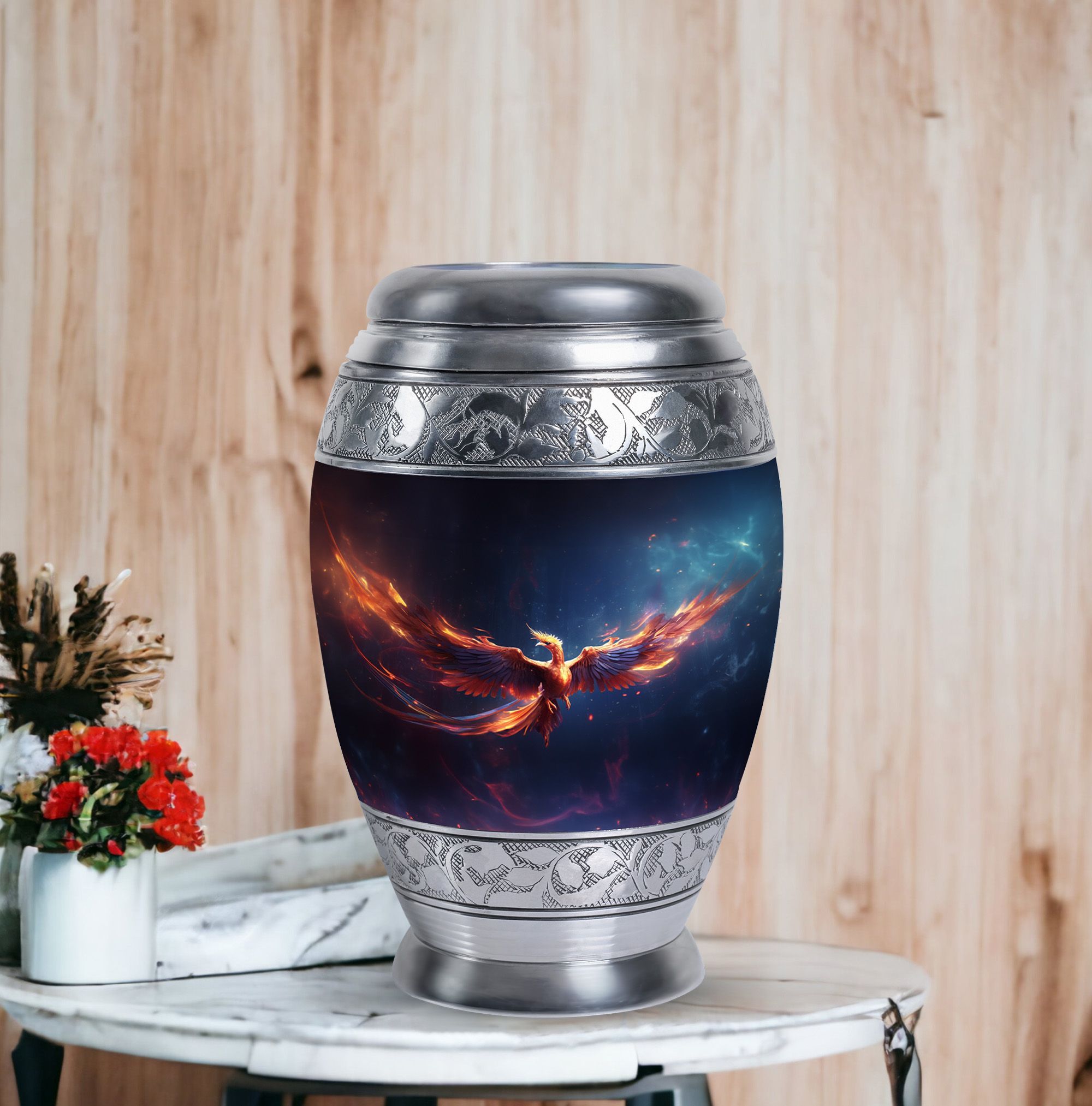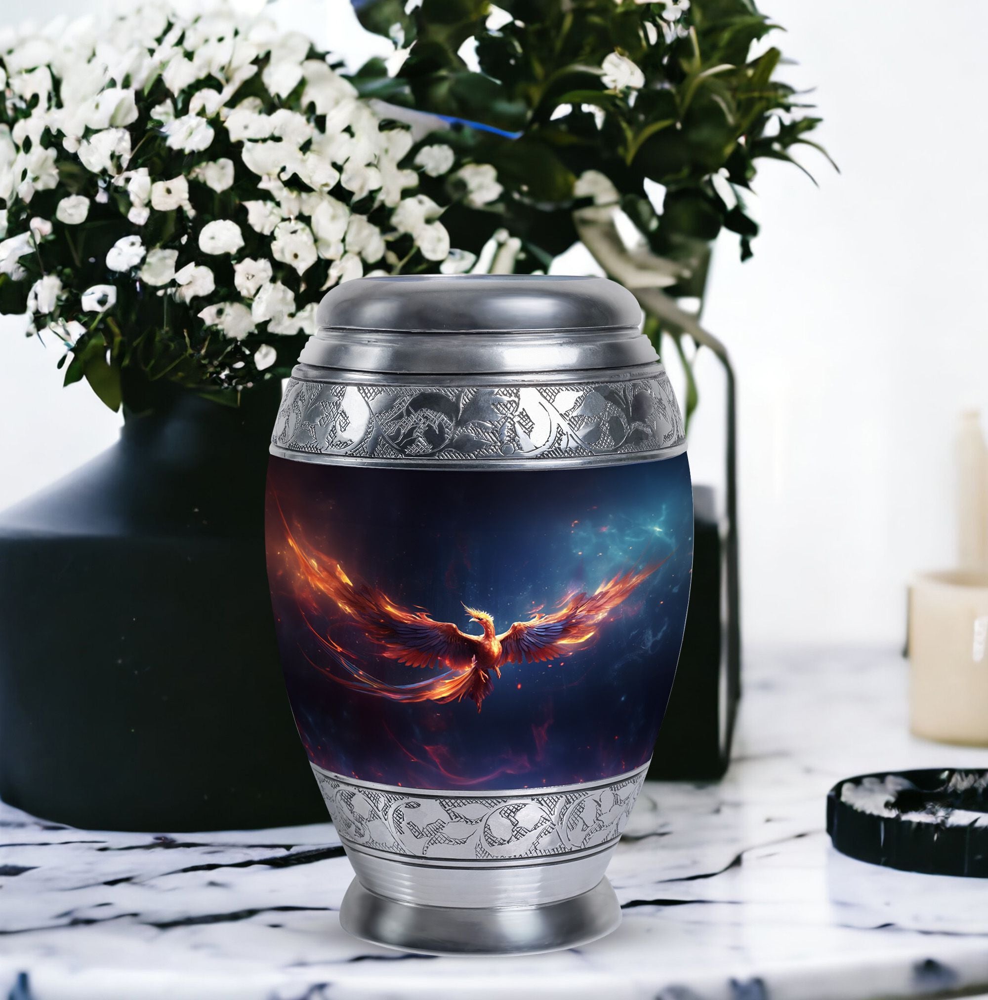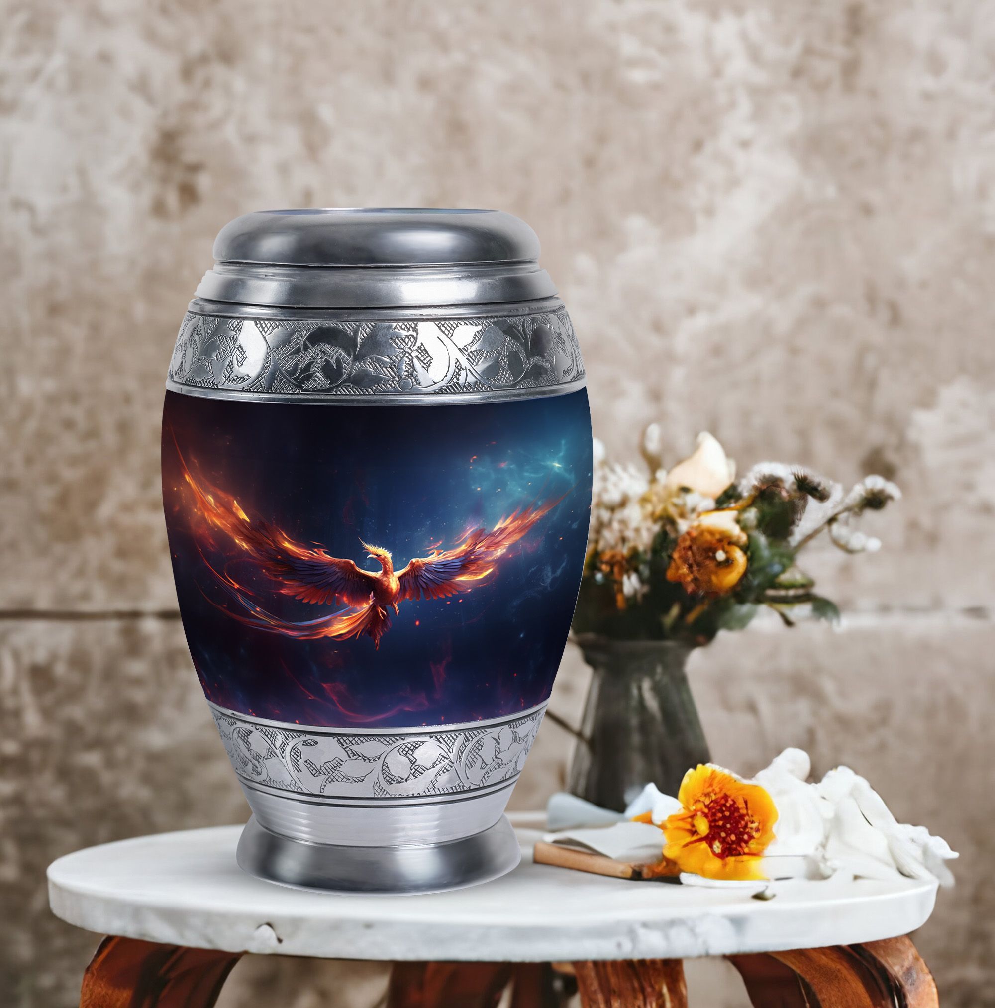 Introducing the Red and Blue Phoenix Cremation Urn, an elegant and impactful means of honoring your loved one's remains. This large sized urn constructed from high-quality aluminum brings strength and durability to keep ashes safely contained. With its impressive size of 10 inches in height and a weight of sturdy 3.3 pounds, this Burial Urn can hold up to 200 cubic inches of ashes. Alongside its functionality, it offers customization options allowing for the personal engraving of names. Conserving your treasured memories in a unique and lasting way, this urn vitally includes a soft velvet pouch to further secure your cherished remnants. Invest in this dignified memorial urn and secure a profound engagement with your passed cherished ones. Noteworthy as a high-quality metal urn for human ashes and an aptly fitting modern urn for ashes, it's a standout in funeral ashes containers. Our Red and Blue Phoenix Cremation Urn is indeed an homage for a remarkable life lived and celebrated.