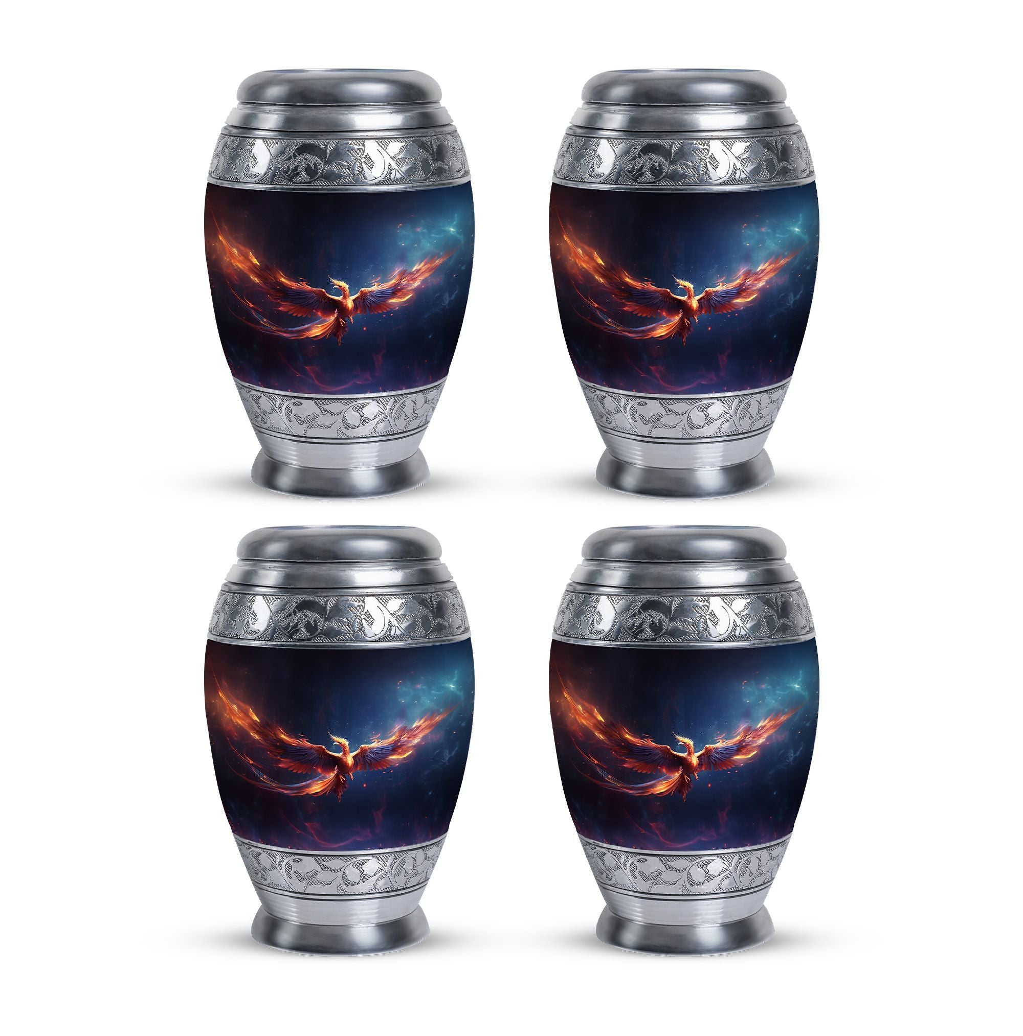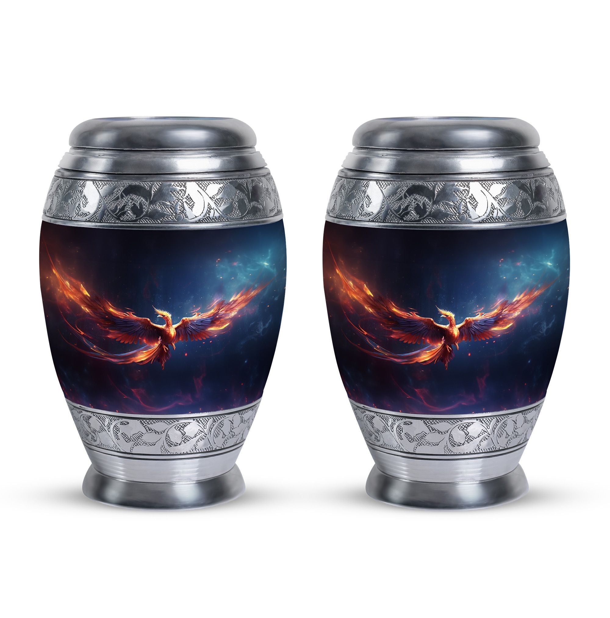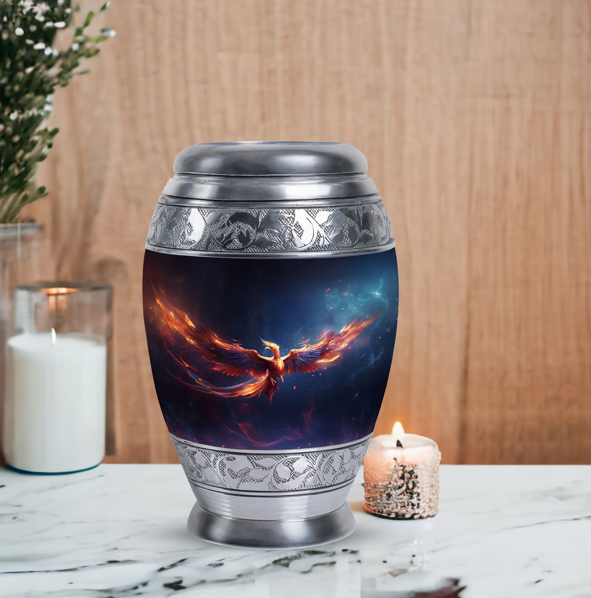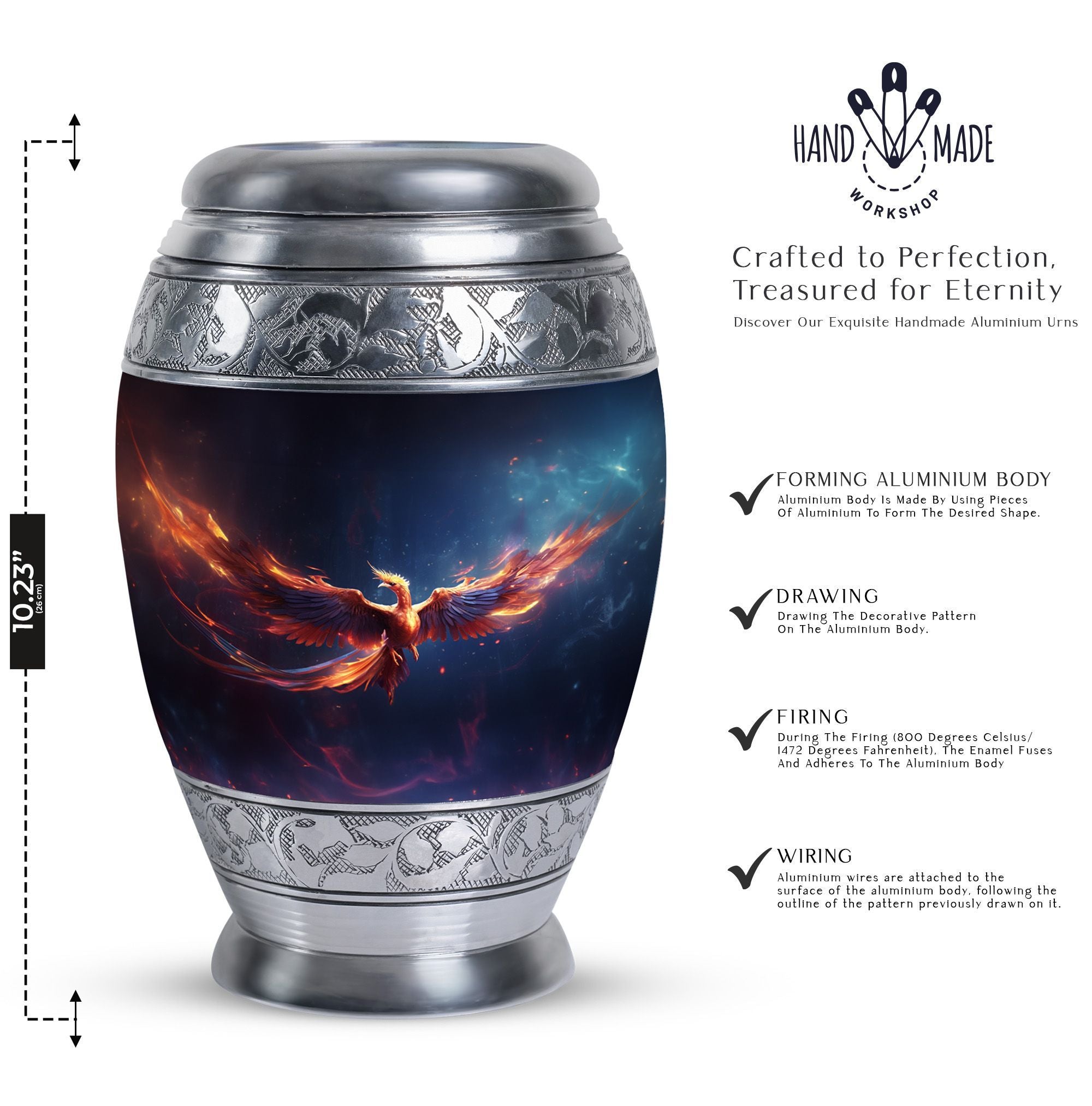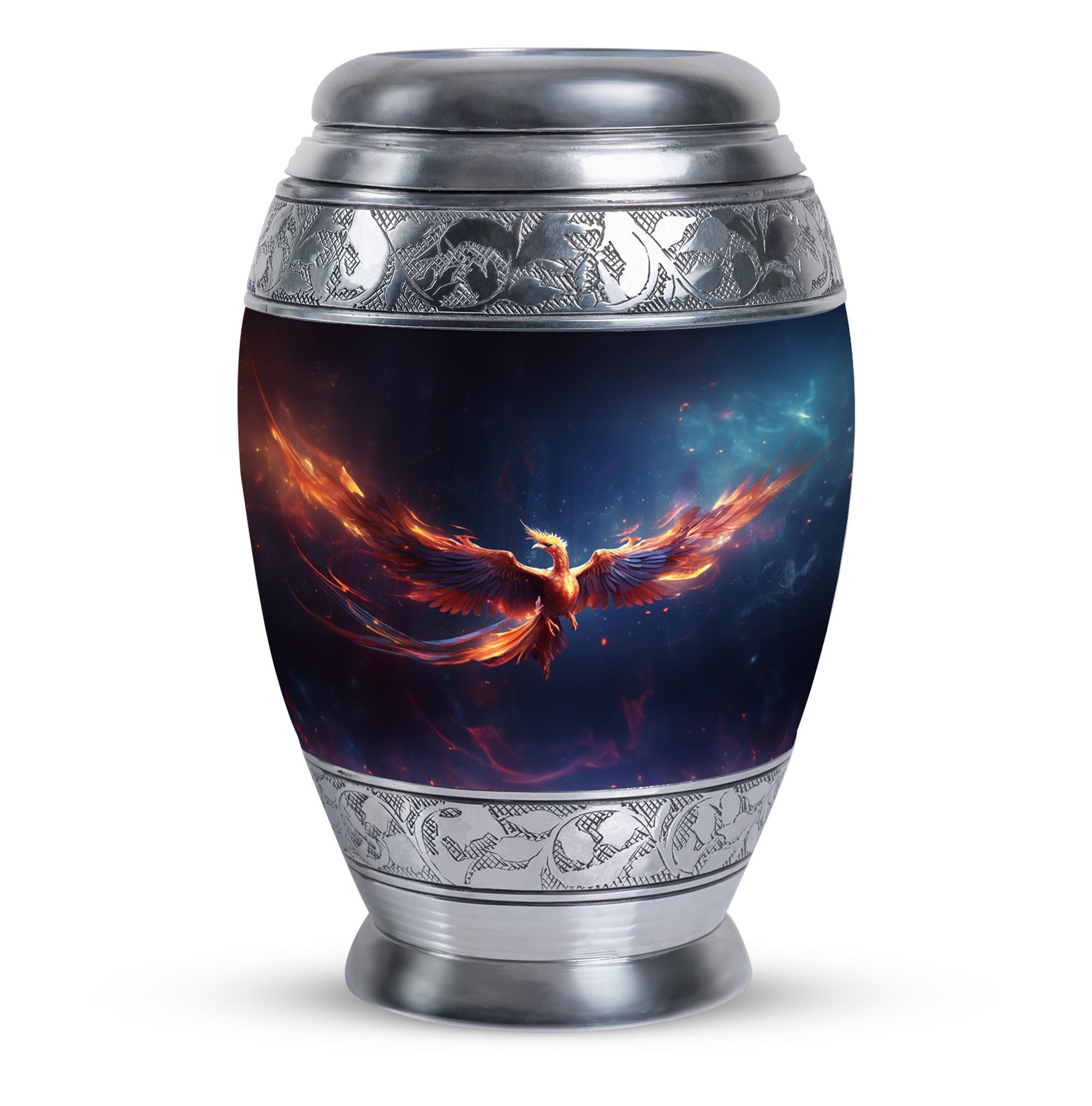 Introducing the Red and Blue Phoenix Cremation Urn, an elegant and impactful means of honoring your loved one's remains. This large sized urn constructed from high-quality aluminum brings strength and durability to keep ashes safely contained. With its impressive size of 10 inches in height and a weight of sturdy 3.3 pounds, this Burial Urn can hold up to 200 cubic inches of ashes. Alongside its functionality, it offers customization options allowing for the personal engraving of names. Conserving your treasured memories in a unique and lasting way, this urn vitally includes a soft velvet pouch to further secure your cherished remnants. Invest in this dignified memorial urn and secure a profound engagement with your passed cherished ones. Noteworthy as a high-quality metal urn for human ashes and an aptly fitting modern urn for ashes, it's a standout in funeral ashes containers. Our Red and Blue Phoenix Cremation Urn is indeed an homage for a remarkable life lived and celebrated.