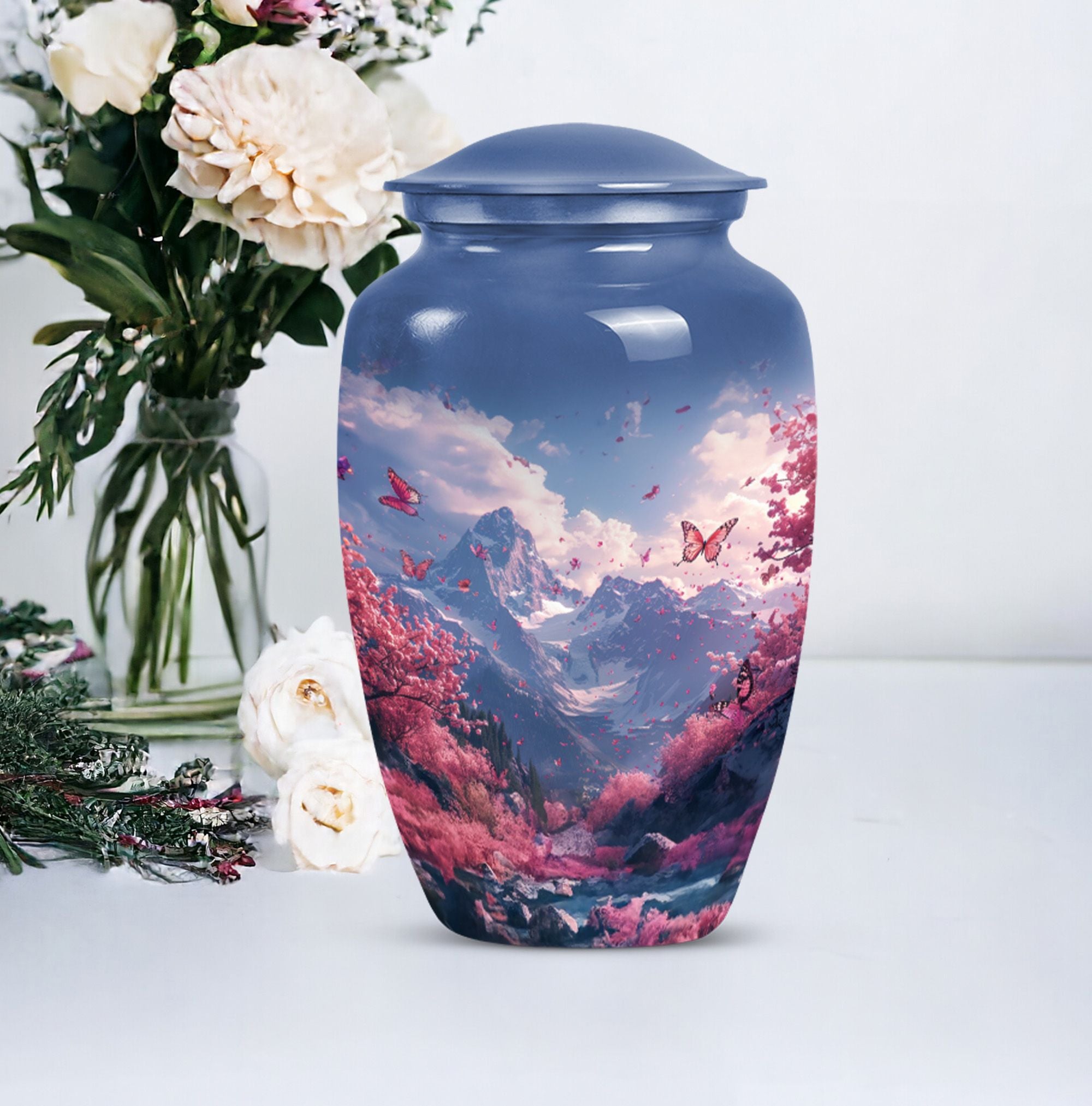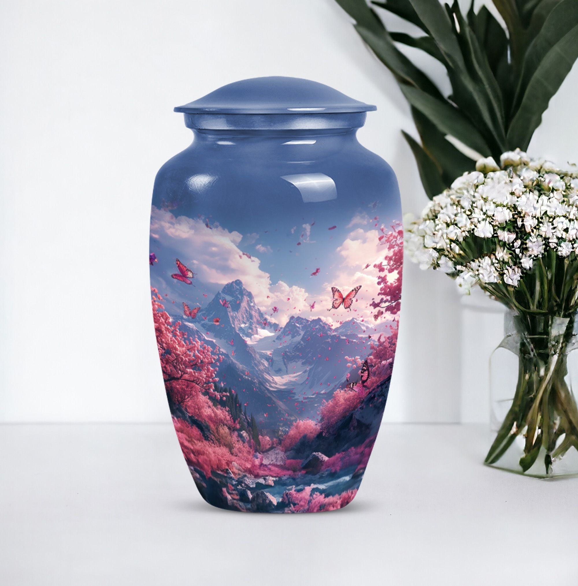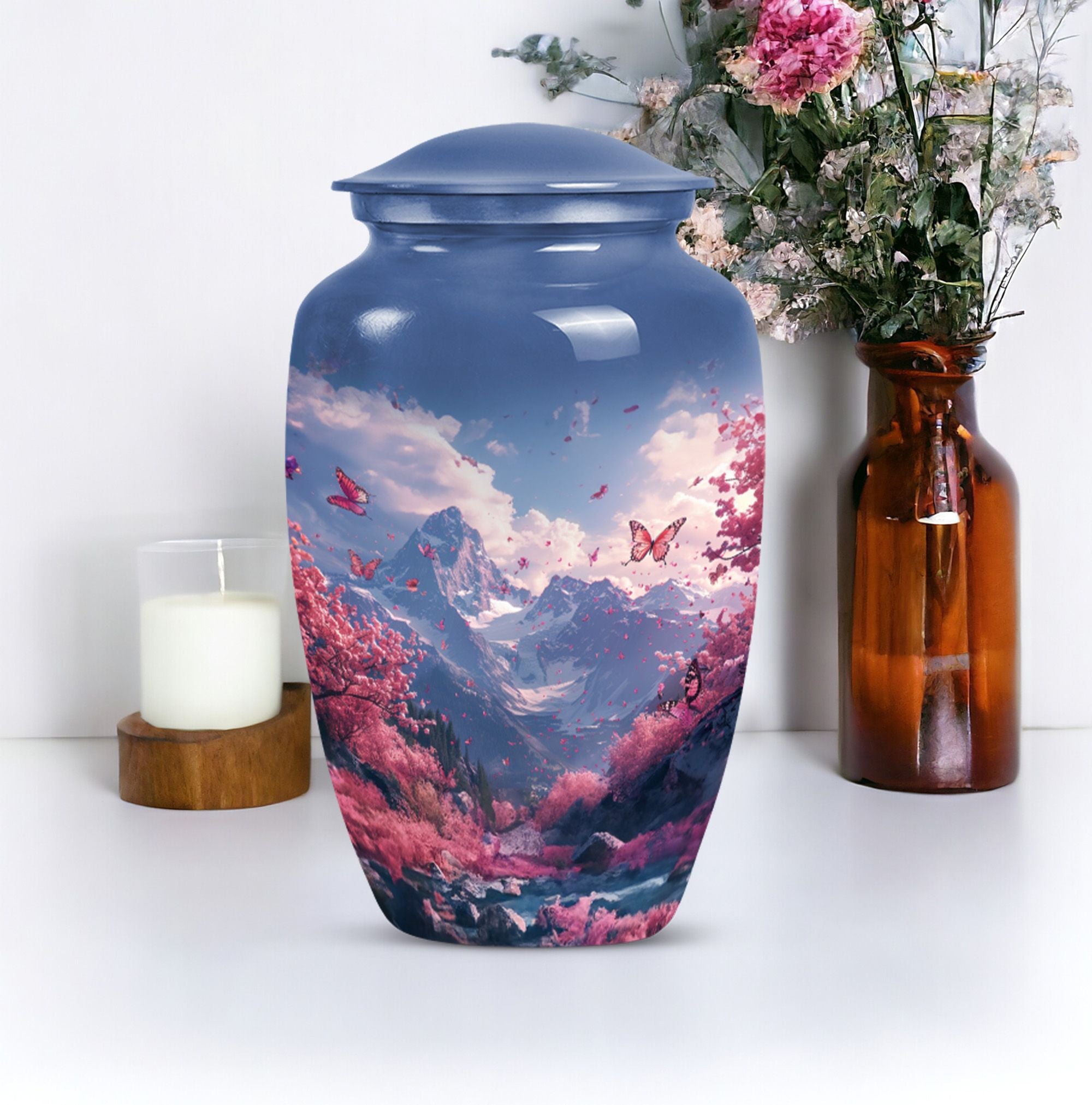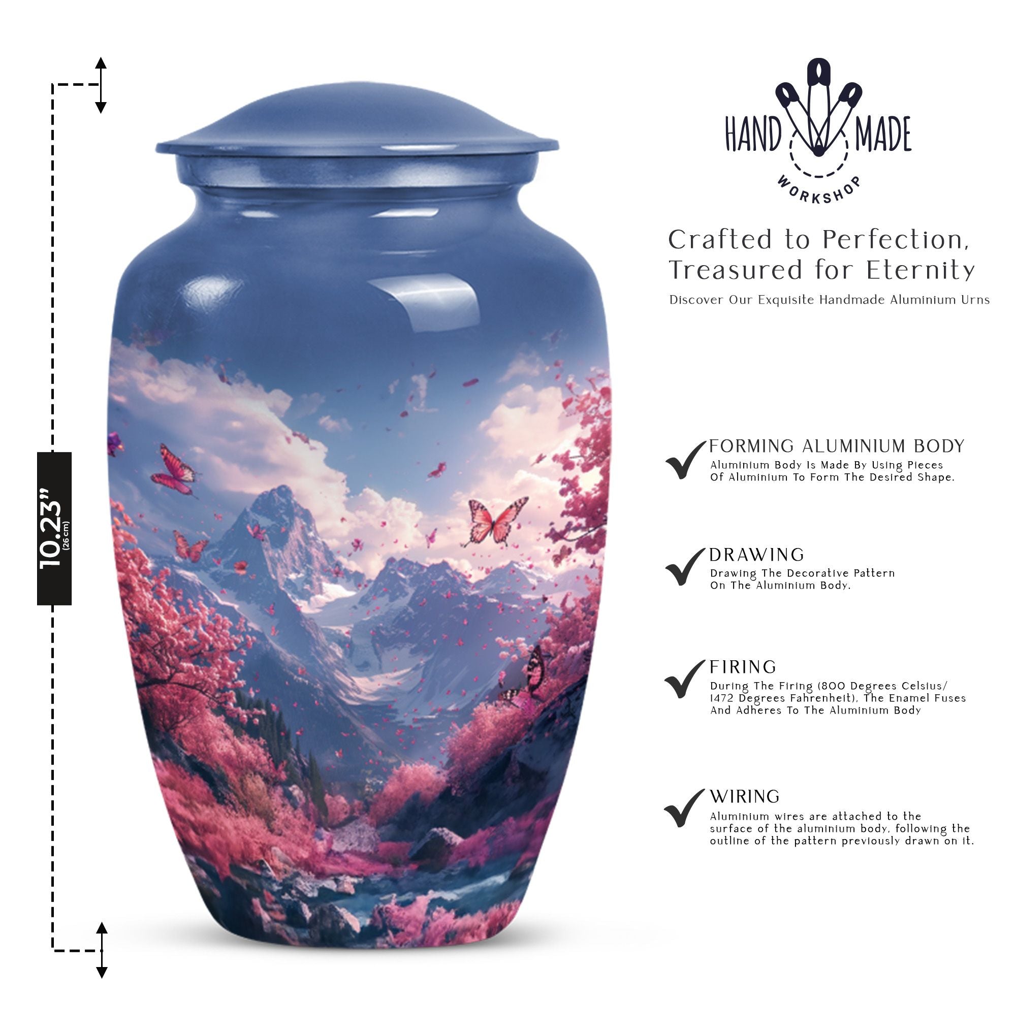Delicately crafted to ensure reverential respect, this 10 Inch pink butterfly urn is an elegant tribute for your departed loved one. Intricate butterfly imagery adorns its aluminium framework, evoking a serene aura. Tipping the scales at a solid 3.3 pounds, this large urn is robust yet intimate, holding up to 200 cubic inches of ashes. As a cremation urn for ashes of adult males, it is designed for the solemnity of memorial ceremony needs. Easily transportable for travels, it accompanies you with a special velvet pouch, ensuring containment and preservation of the ashes. For a unique touch, personalization through engraved names is optional, allowing you to curate a genuine testament of love. Bypass common metal mandirs for home use and choose this portable urn to honour the memory of your cherished one. N.B. This description is optimized for SEO, considering keywords such as 'cremation urn', 'pink butterfly urn', 'urns for male' and 'human urn for ashes female'.