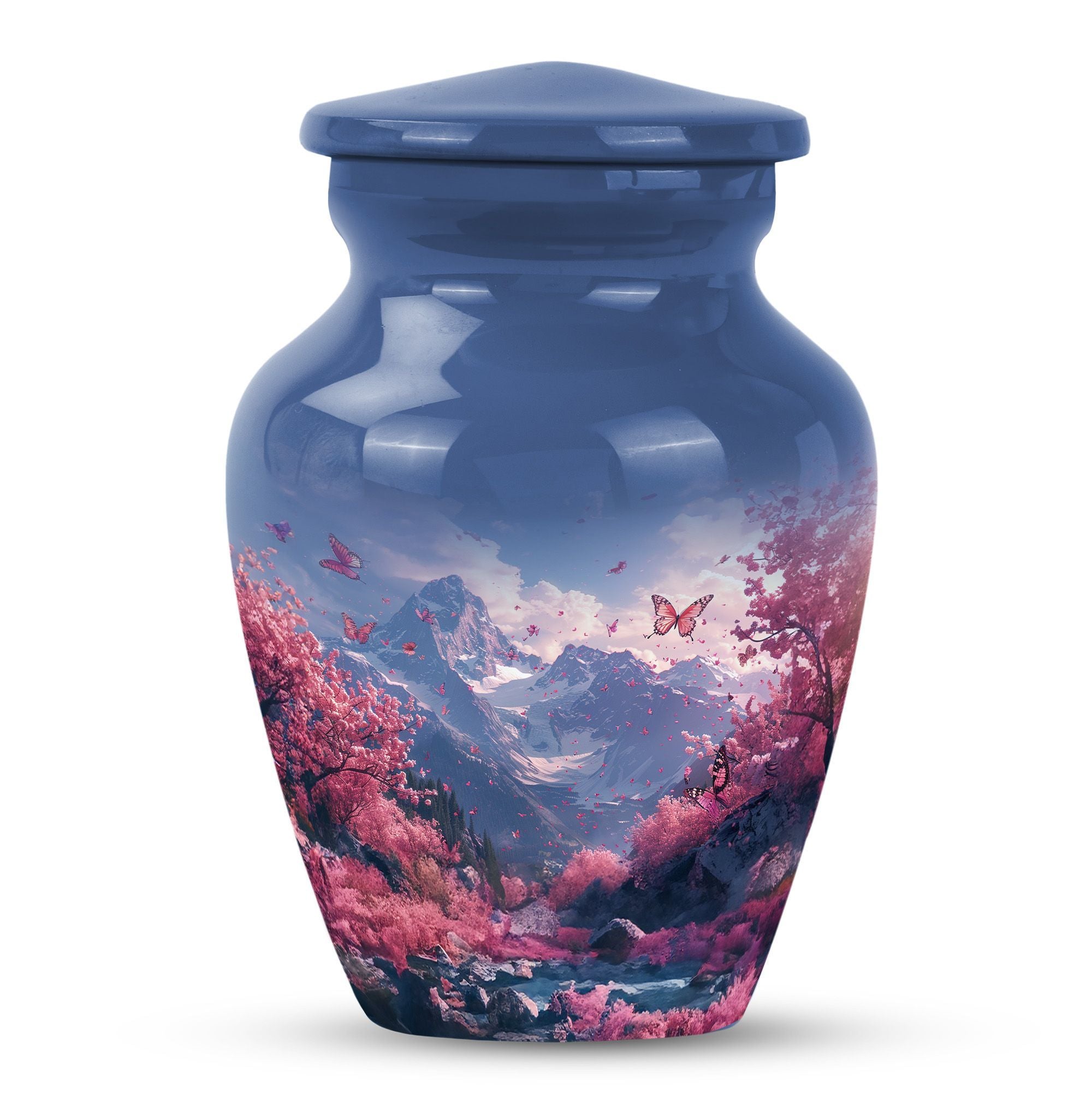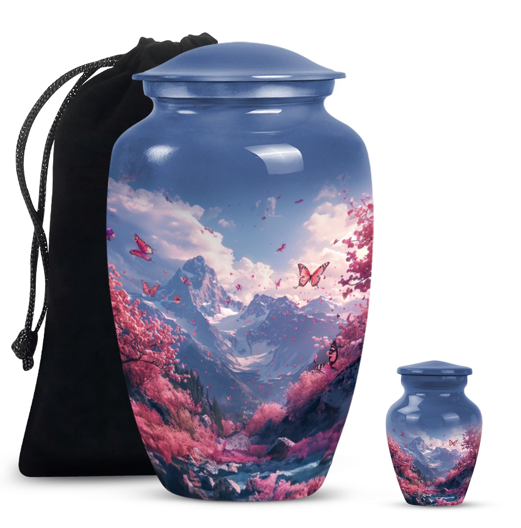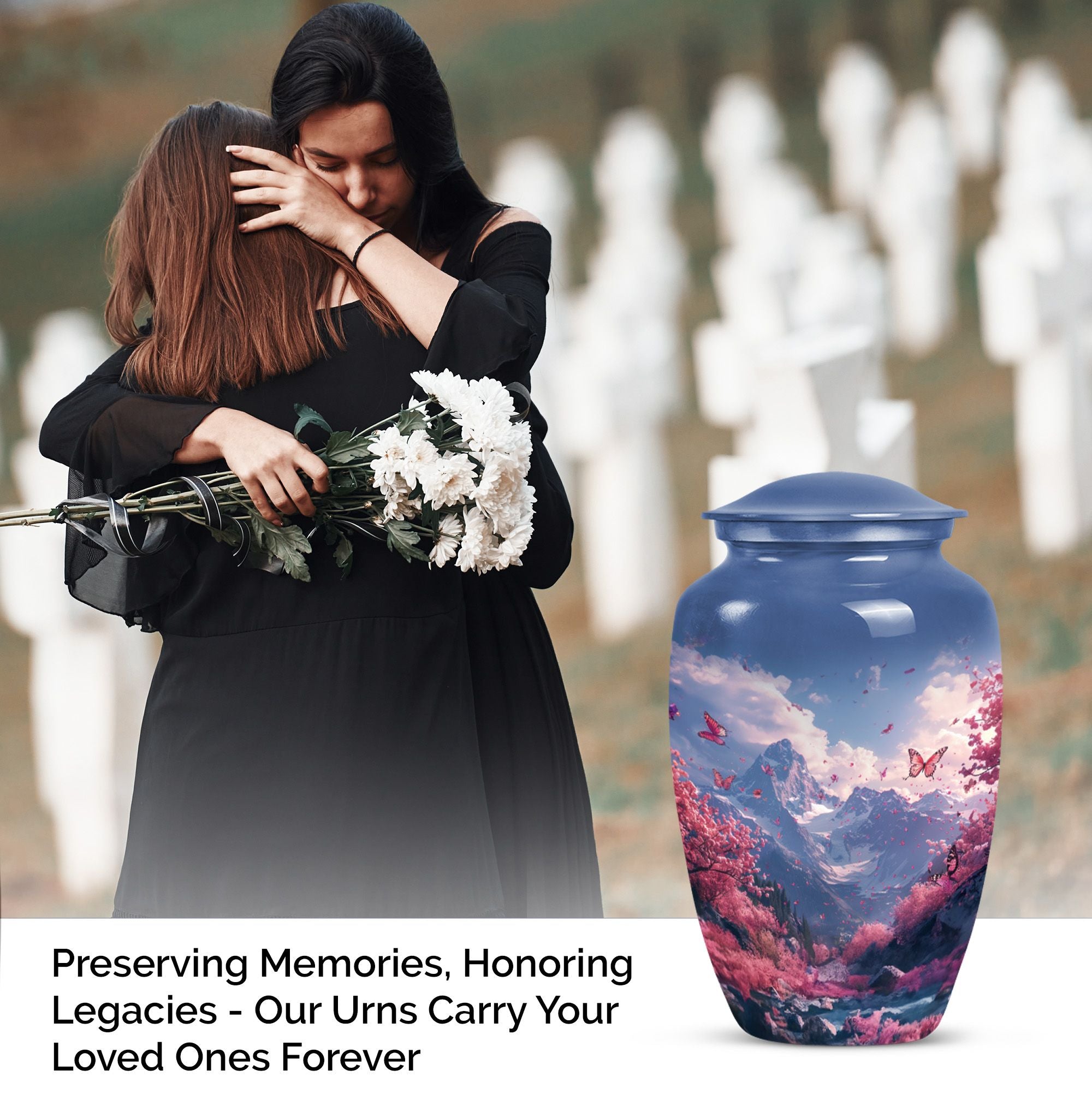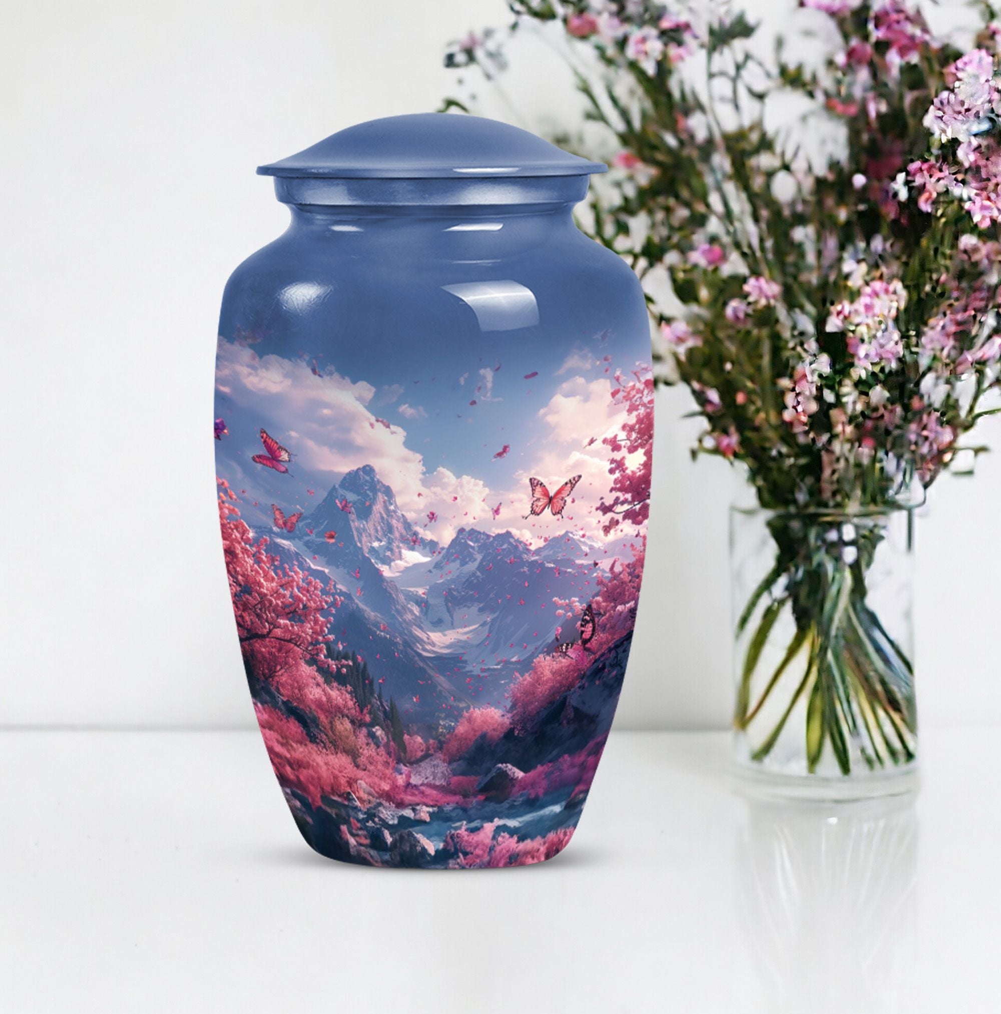 Delicately crafted to ensure reverential respect, this 10 Inch pink butterfly urn is an elegant tribute for your departed loved one. Intricate butterfly imagery adorns its aluminium framework, evoking a serene aura. Tipping the scales at a solid 3.3 pounds, this large urn is robust yet intimate, holding up to 200 cubic inches of ashes. As a cremation urn for ashes of adult males, it is designed for the solemnity of memorial ceremony needs. Easily transportable for travels, it accompanies you with a special velvet pouch, ensuring containment and preservation of the ashes. For a unique touch, personalization through engraved names is optional, allowing you to curate a genuine testament of love. Bypass common metal mandirs for home use and choose this portable urn to honour the memory of your cherished one. N.B. This description is optimized for SEO, considering keywords such as 'cremation urn', 'pink butterfly urn', 'urns for male' and 'human urn for ashes female'.