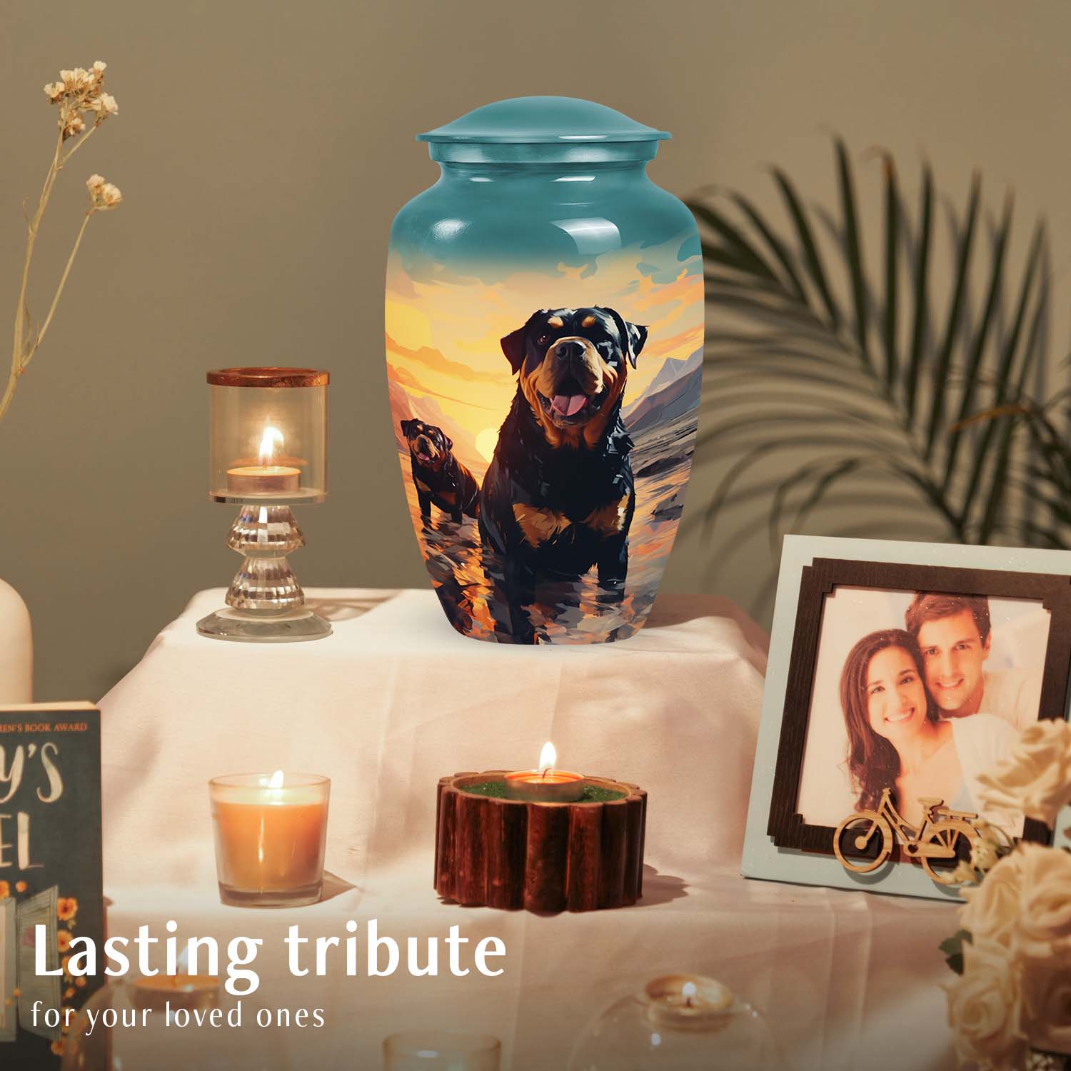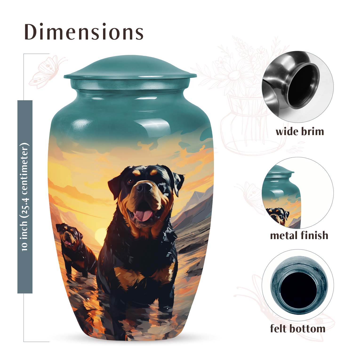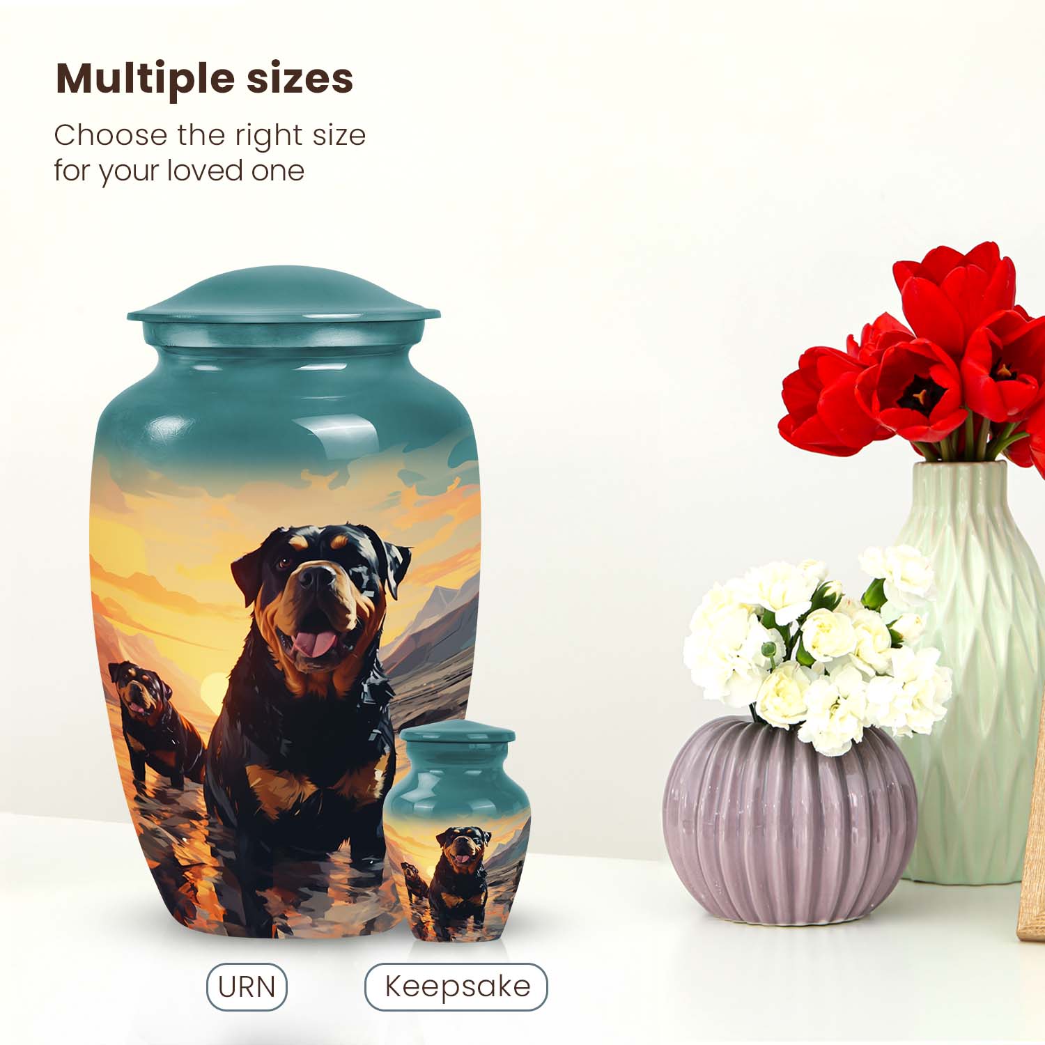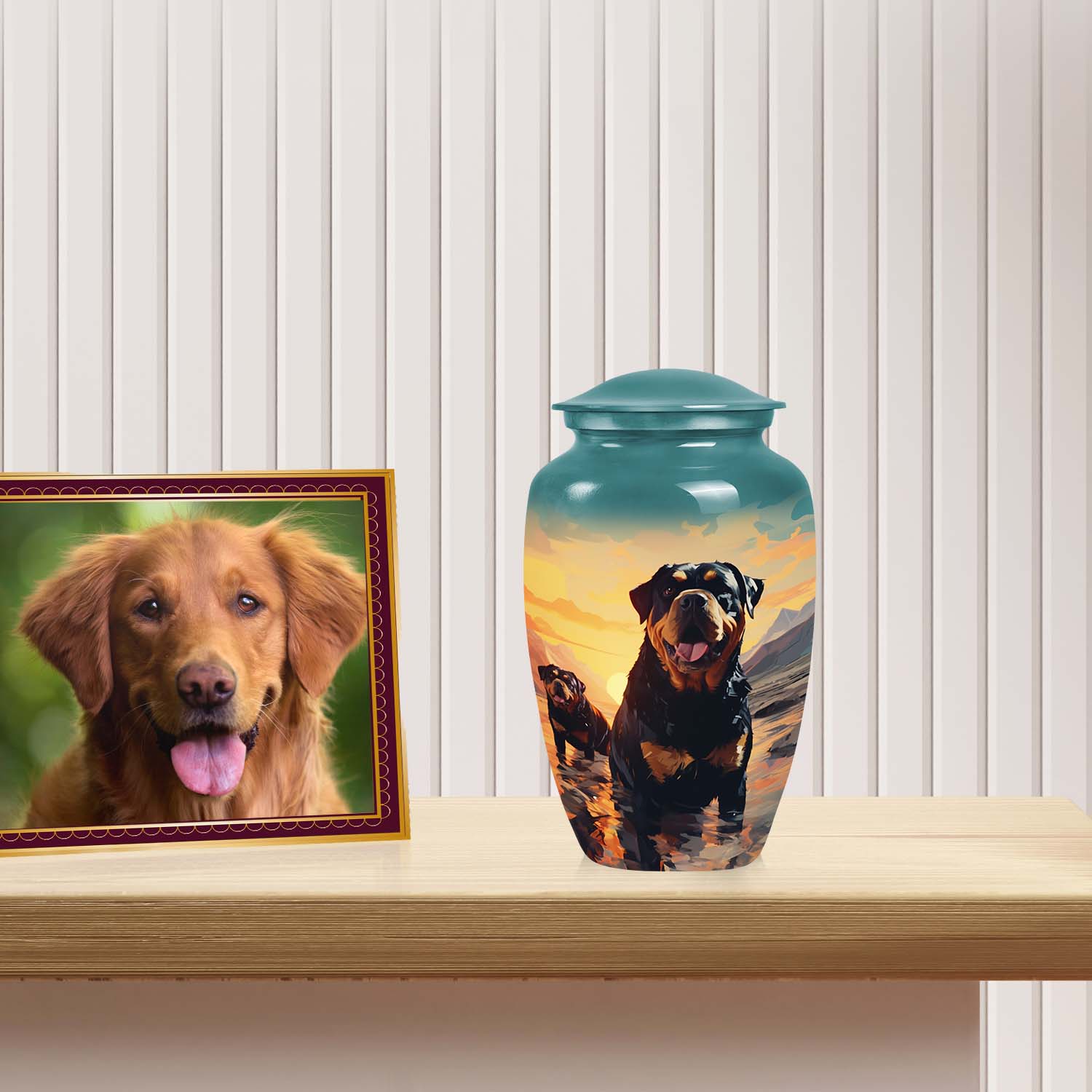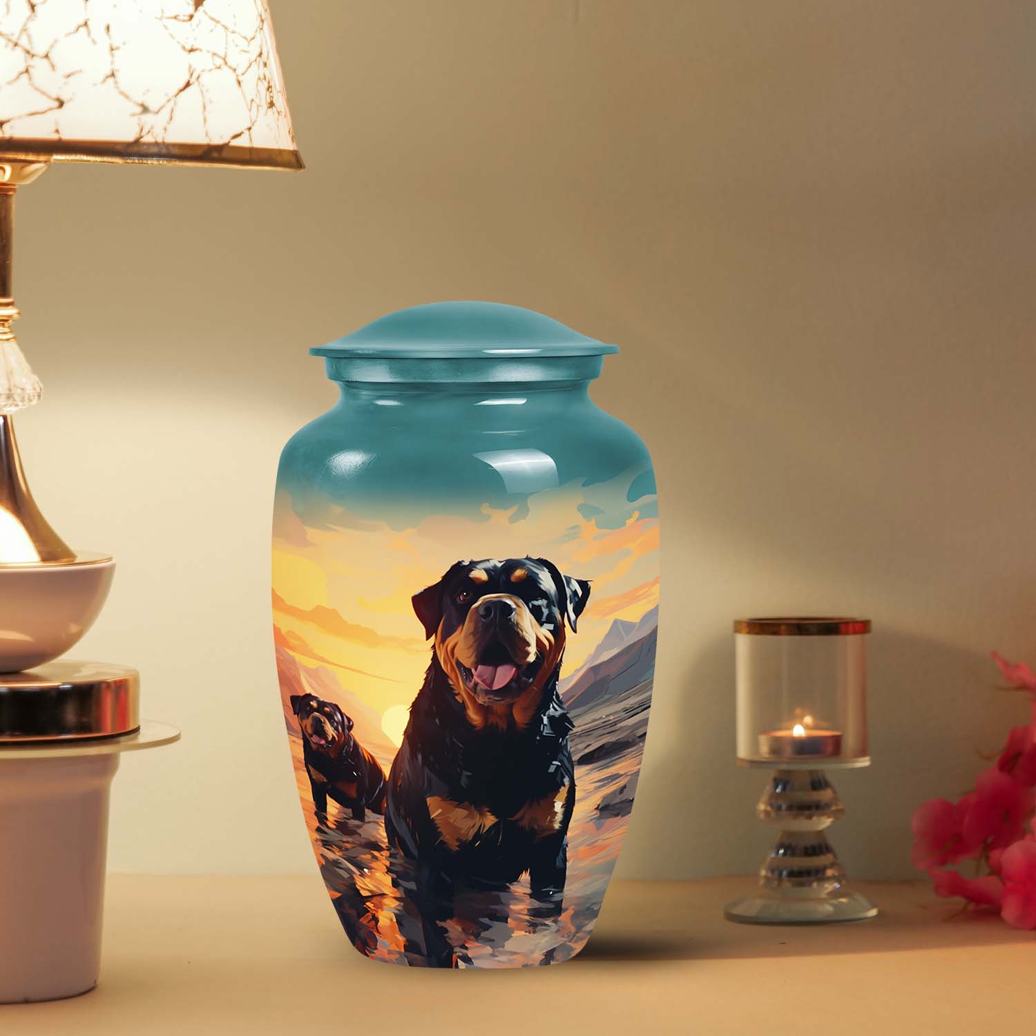 The Rottweiler Cremation Urn for Pet Ashes – Dog Memorial Urn with Sunset is a breathtaking tribute to a life well-loved. Its design features a noble Rottweiler gazing toward a serene sunset — a symbol of eternal rest and faithful companionship. Perfect for honoring your beloved pet’s memory, this urn embodies the heartfelt essence of dog memorial ashes and everlasting devotion.