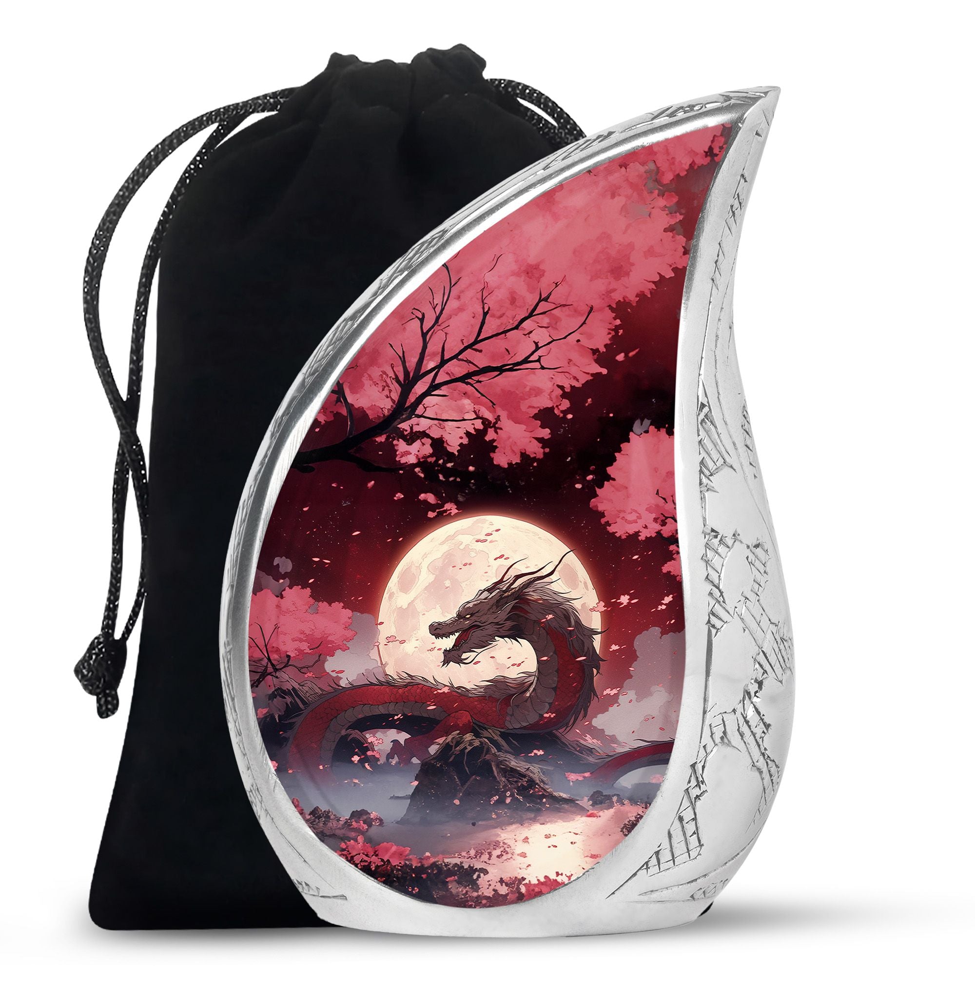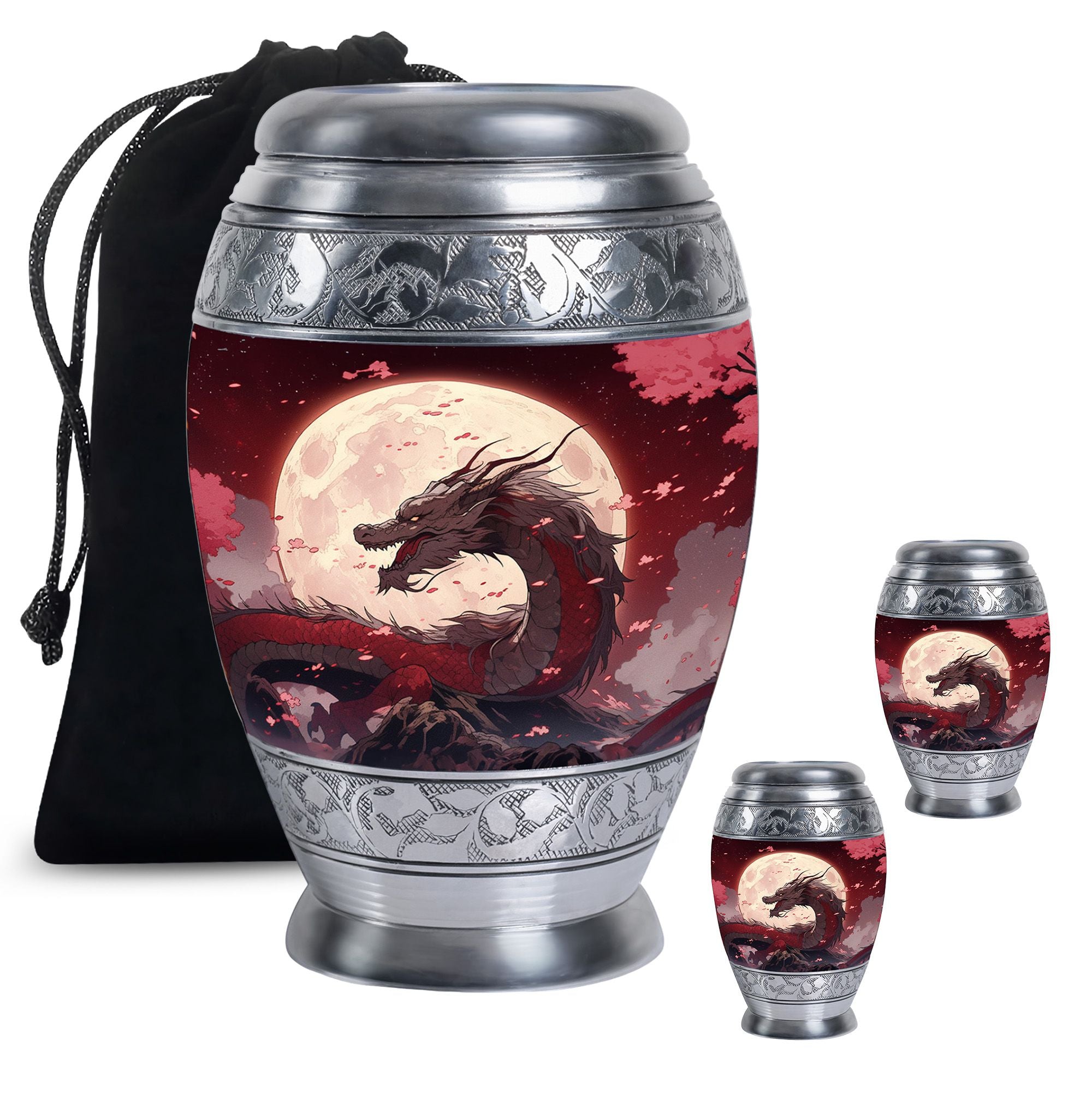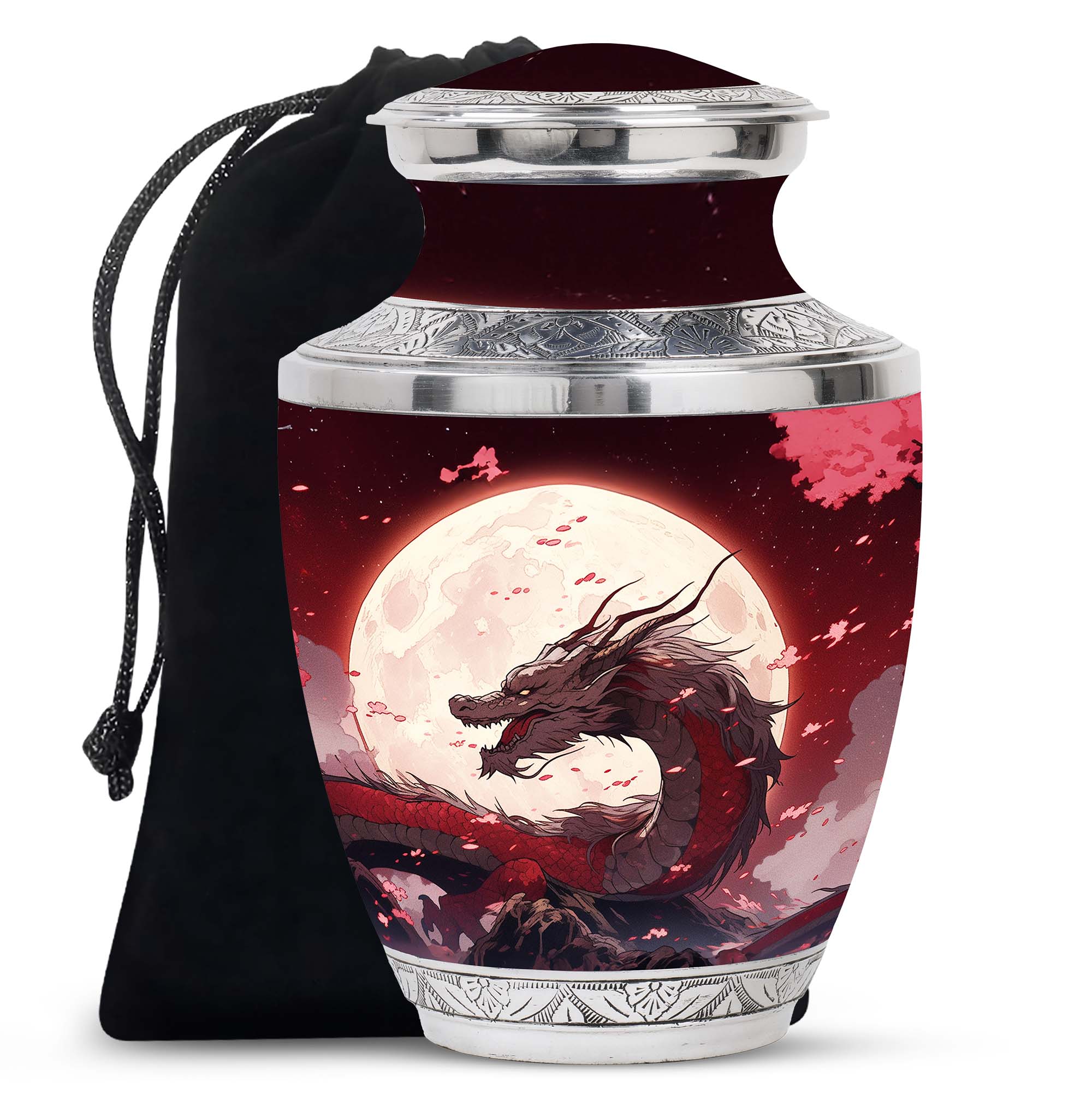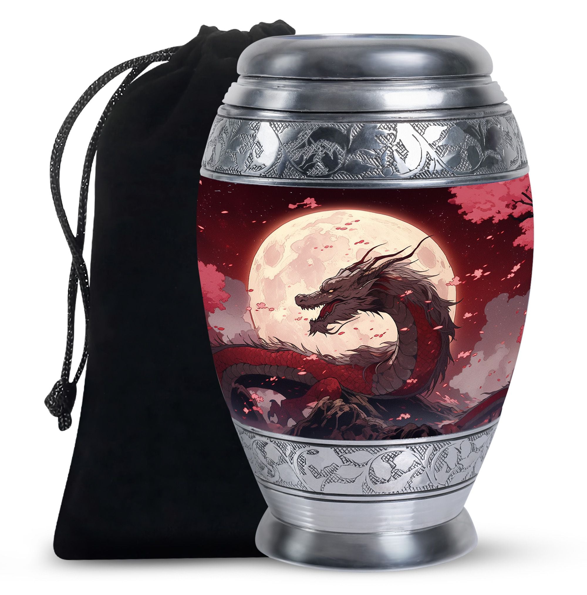 Designed with exquisite craftsmanship, this large decorative urn showcases a majestic dragon circling a glowing moon — a representation of strength guarding serenity. Made from durable aluminium, it ensures long-lasting protection for your loved one’s remains. This cremation urn large adult piece serves as both a memorial and a striking piece of art, suitable for home display or burial.