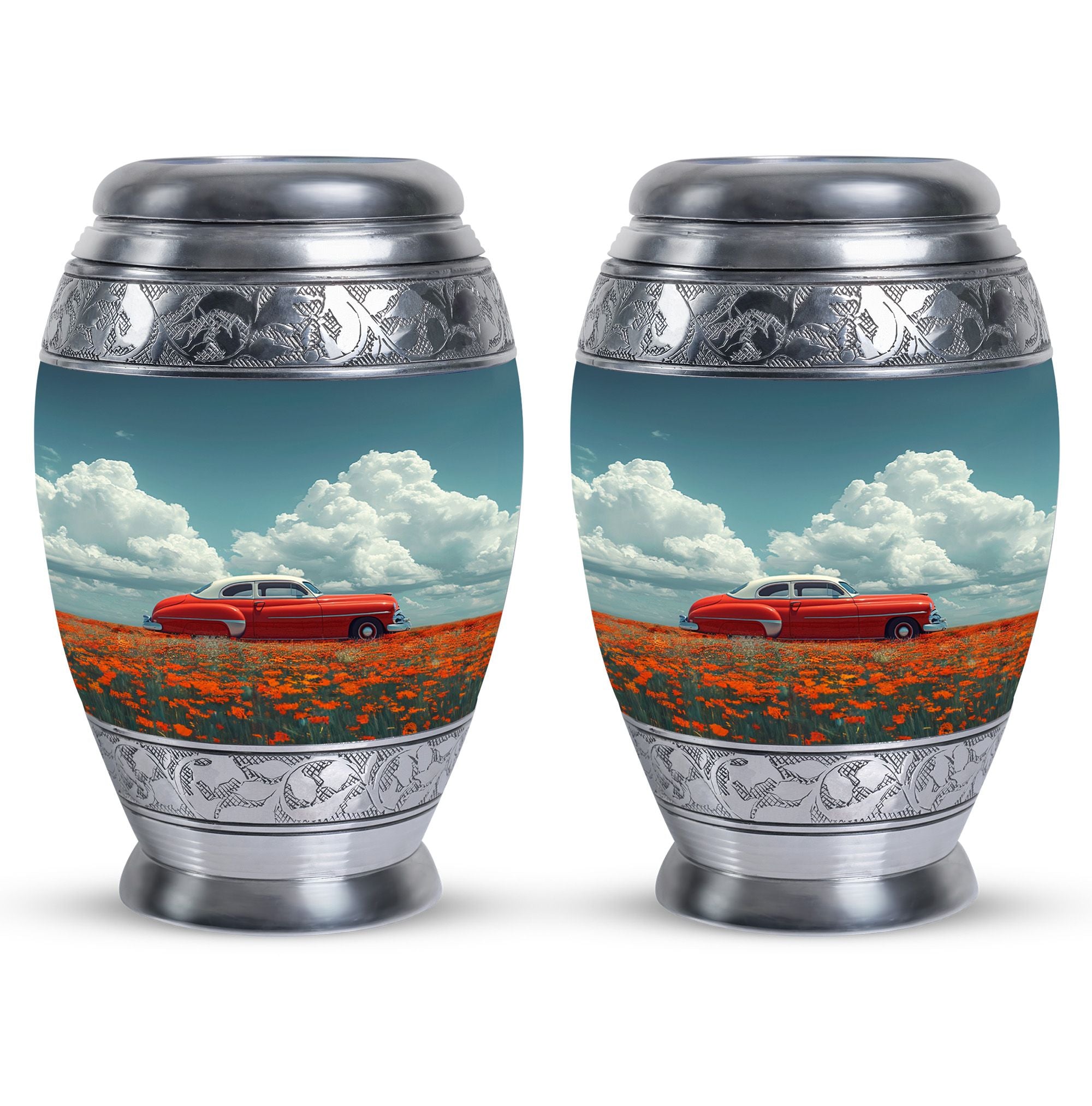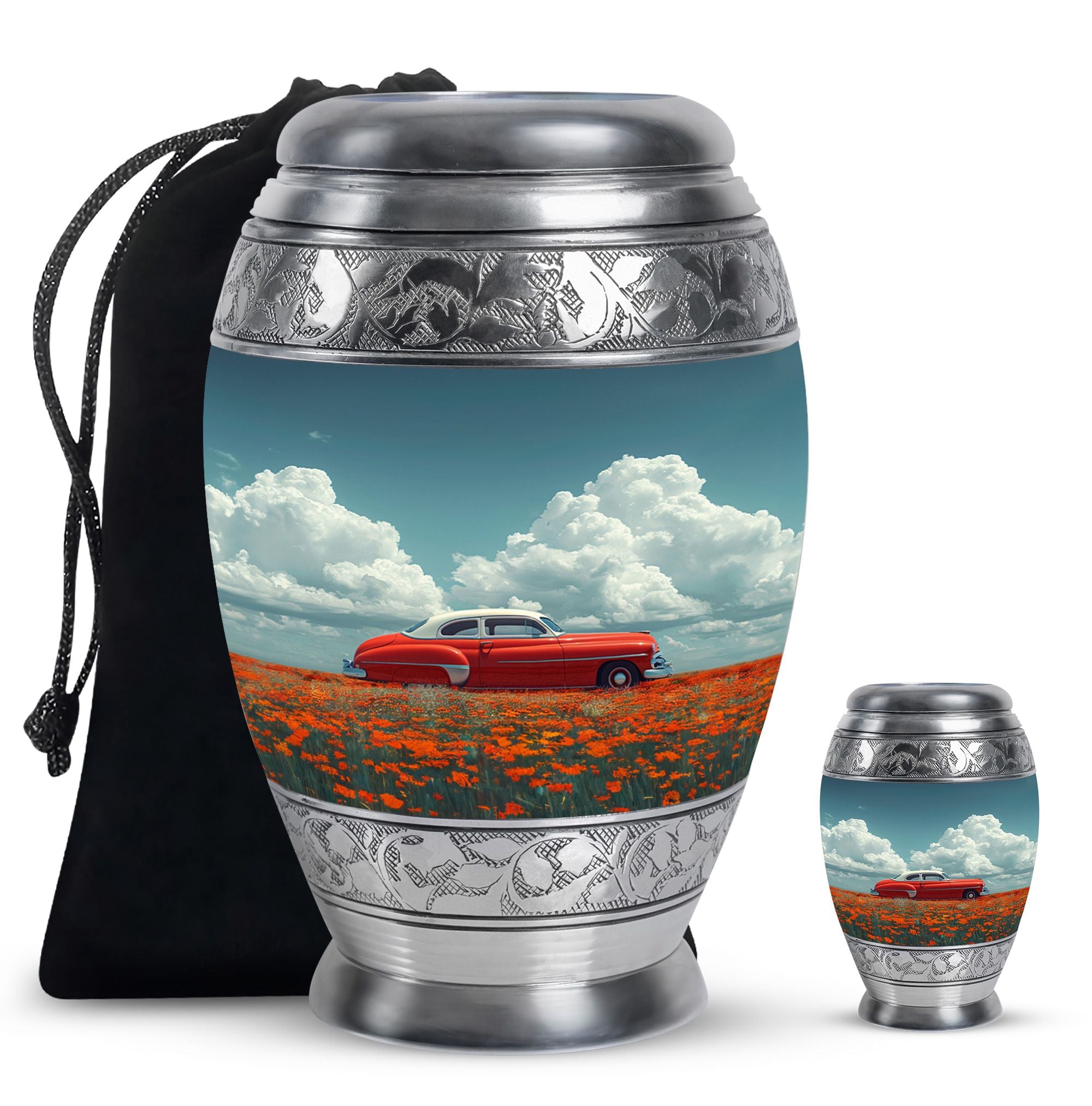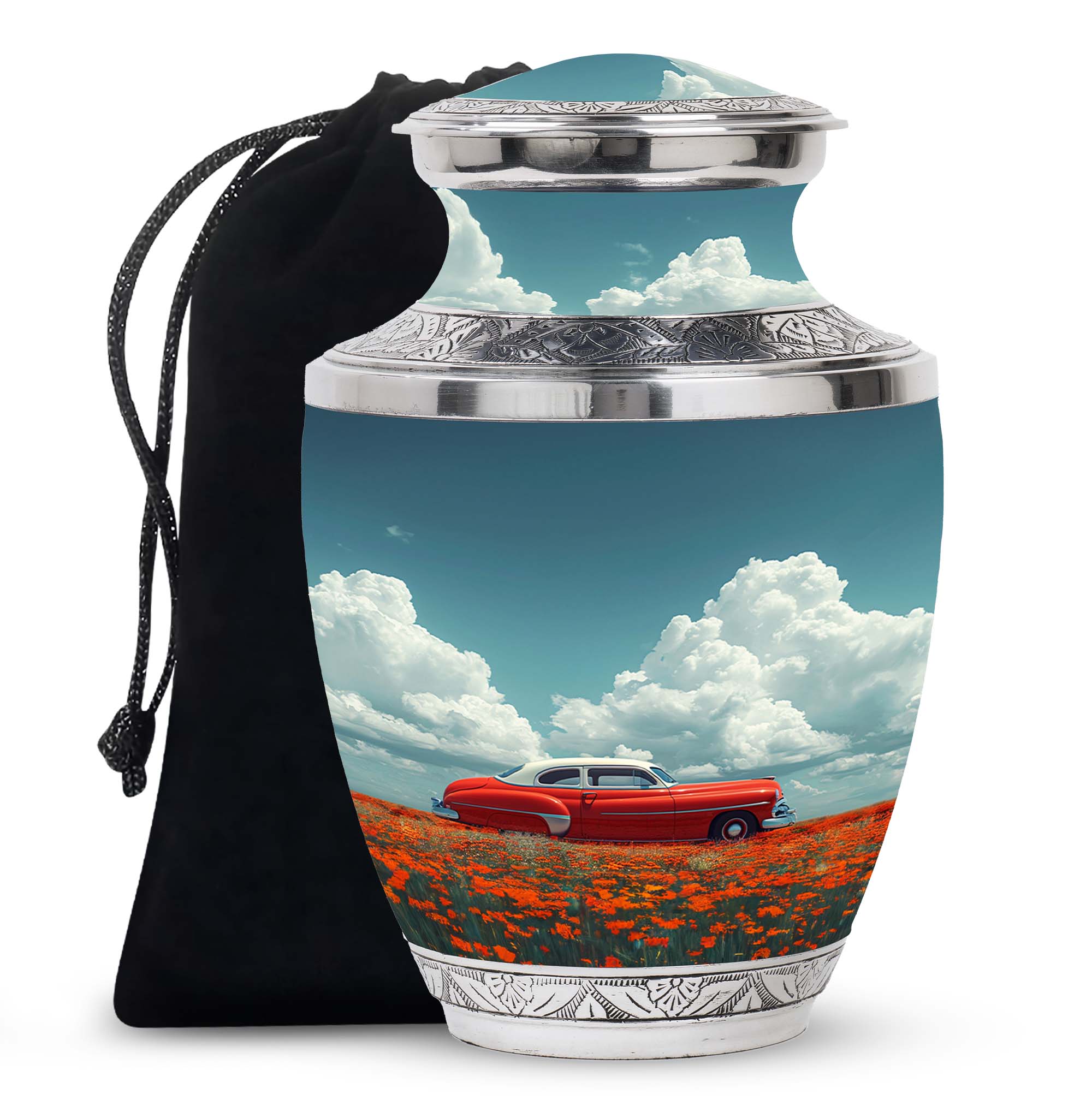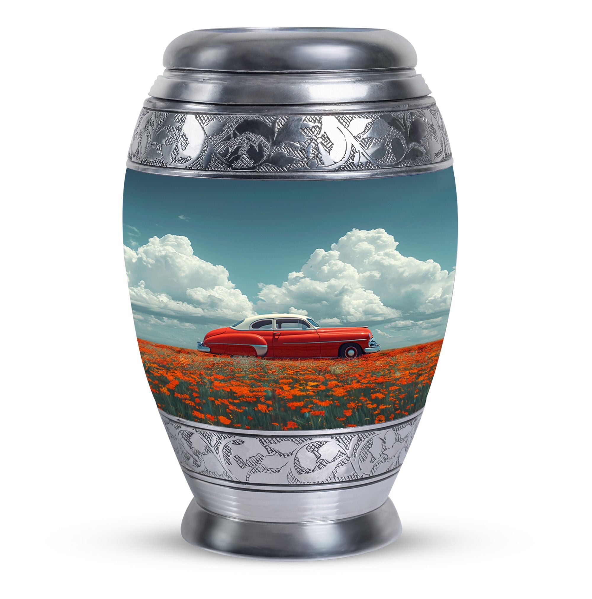 Expertly handcrafted, this large decorative urn for human ashes features a radiant red vintage car design, symbolizing vitality and timeless elegance. Made from durable aluminum, it ensures long-lasting protection and beauty. The secure screw-top lid offers peace of mind, keeping your loved one’s ashes safe. This large adult urn is perfect for home display or burial, blending artistry with heartfelt significance. Each large urn human ashes is finished with care, making it a meaningful keepsake for generations to come.