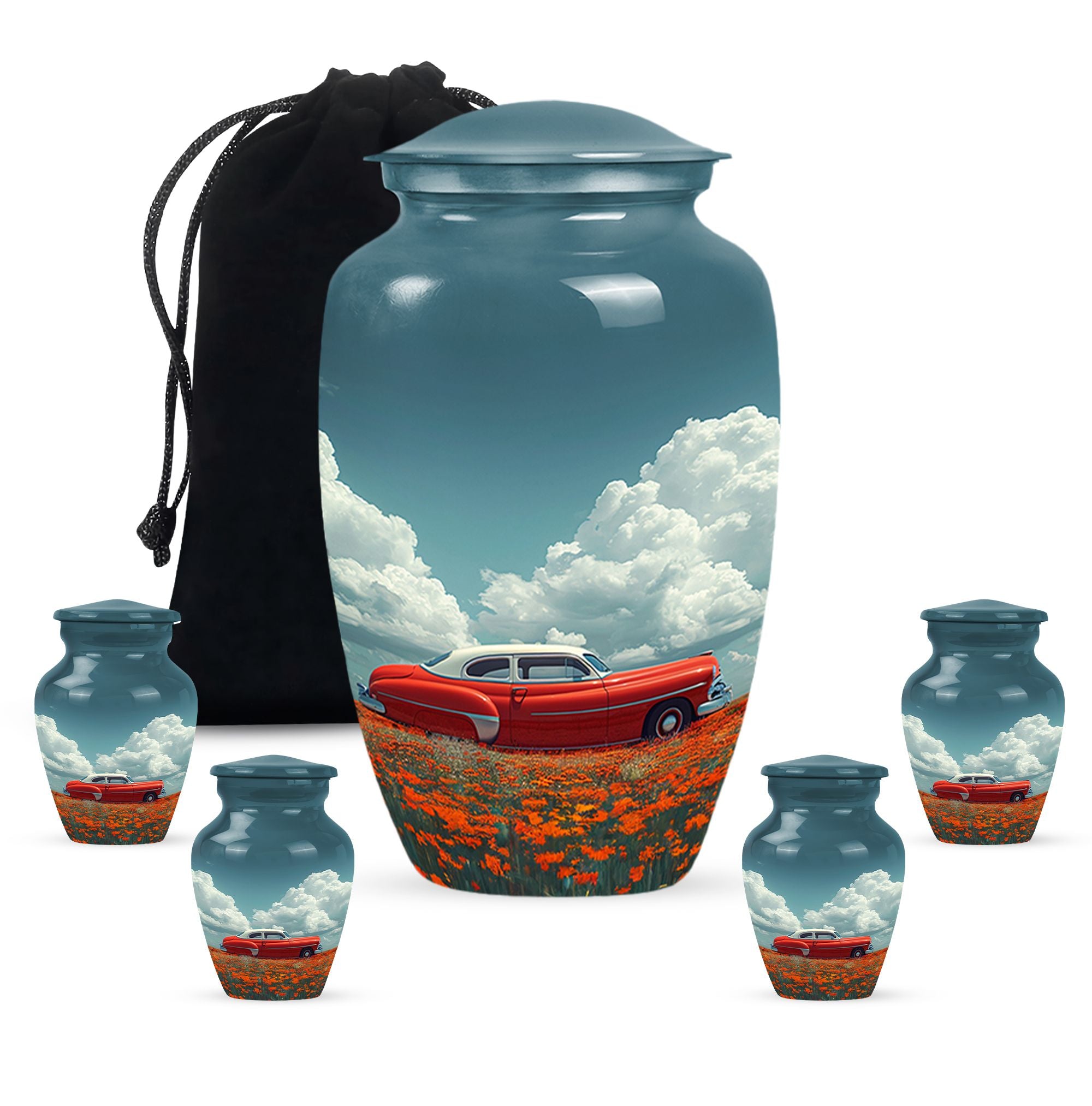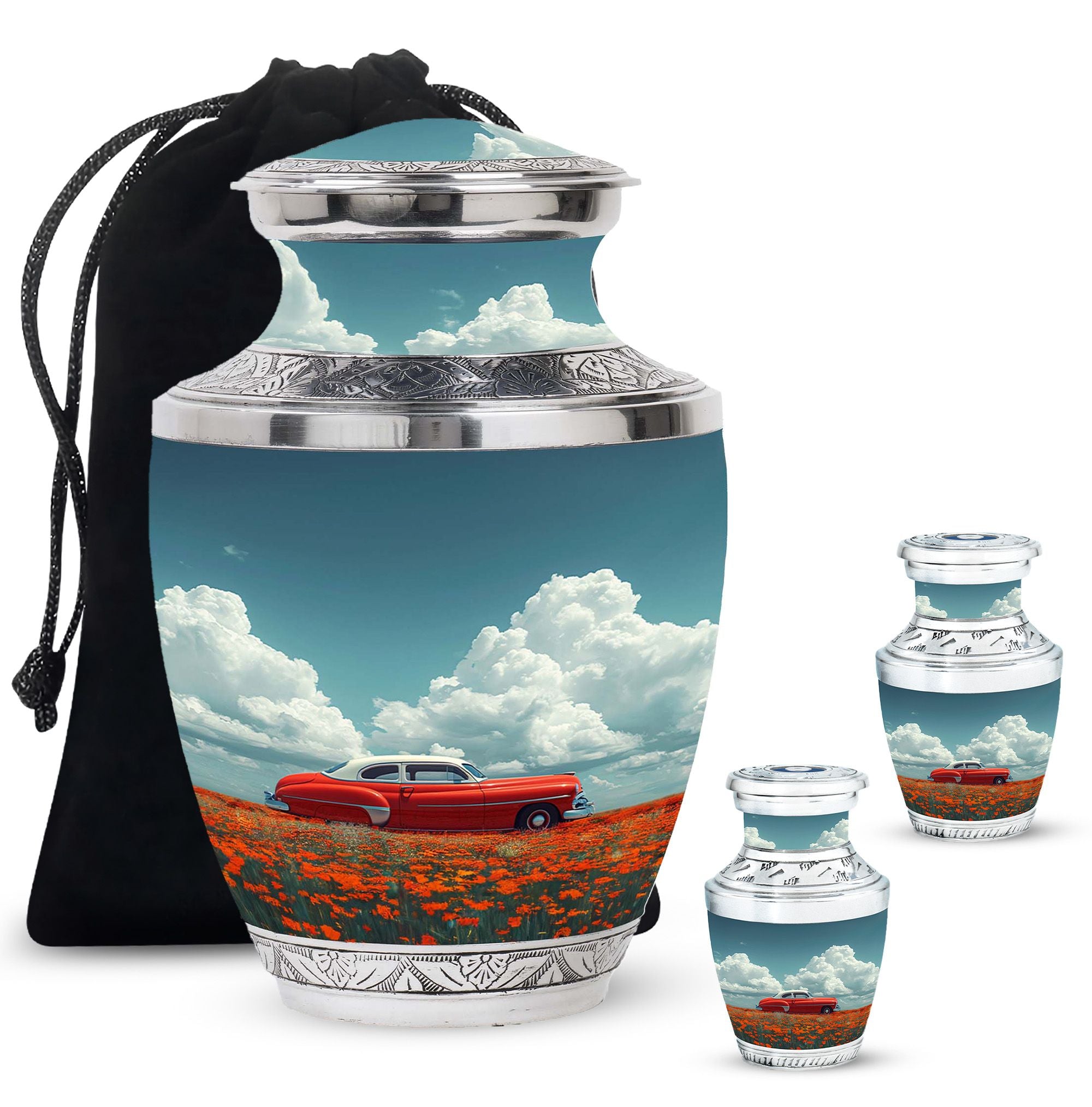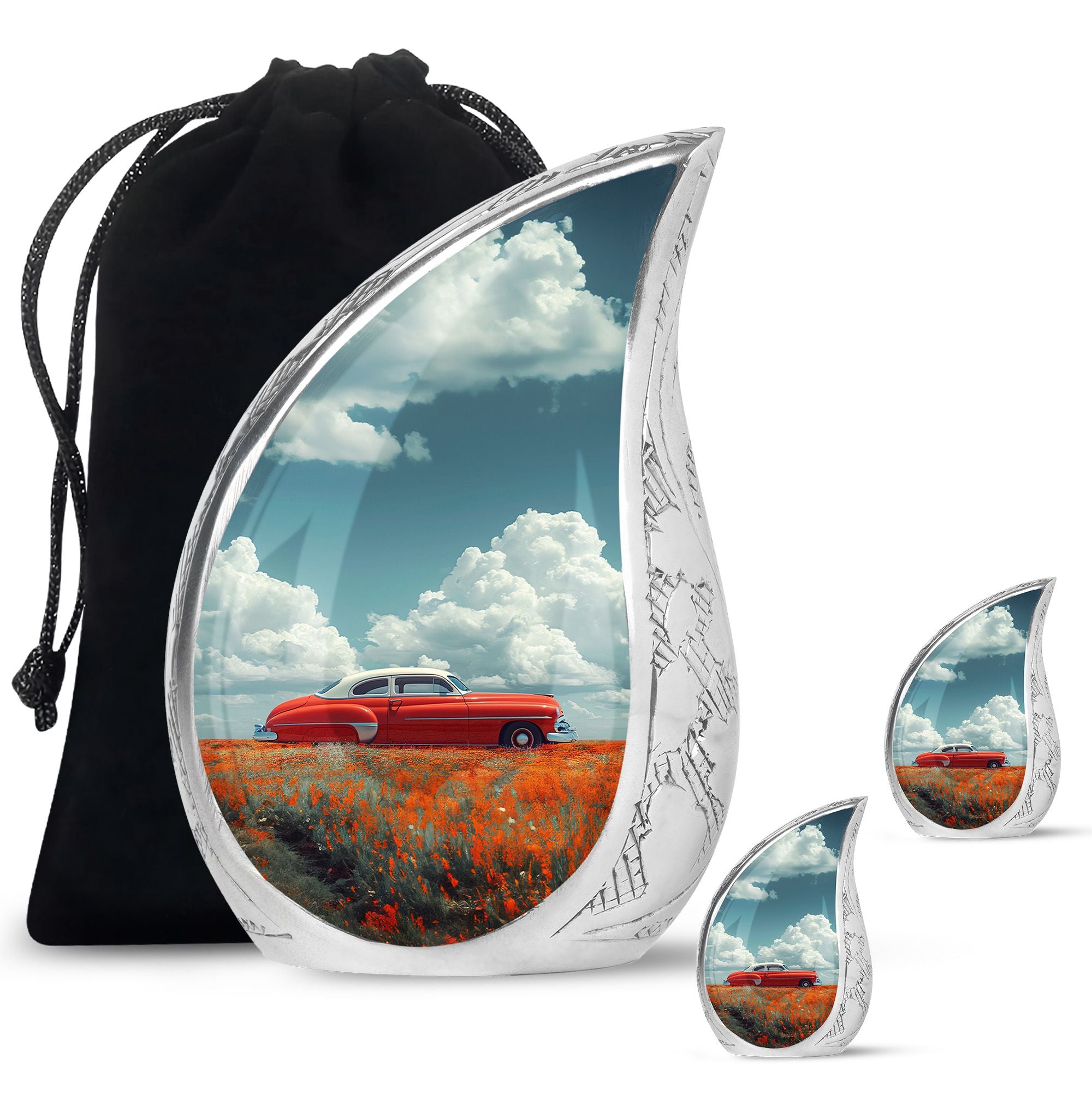 Expertly handcrafted, this large decorative urn for human ashes features a radiant red vintage car design, symbolizing vitality and timeless elegance. Made from durable aluminum, it ensures long-lasting protection and beauty. The secure screw-top lid offers peace of mind, keeping your loved one’s ashes safe. This large adult urn is perfect for home display or burial, blending artistry with heartfelt significance. Each large urn human ashes is finished with care, making it a meaningful keepsake for generations to come.
