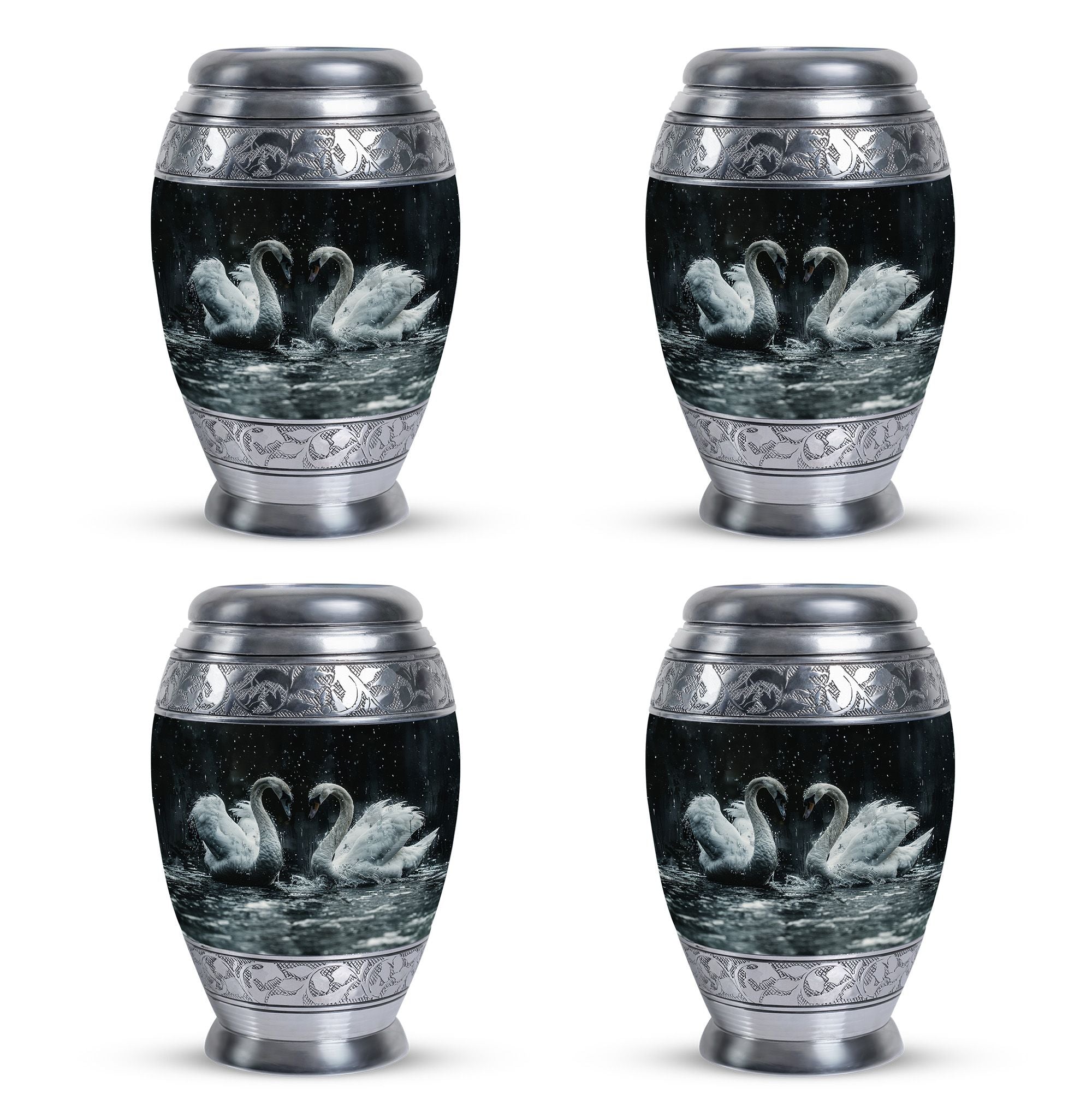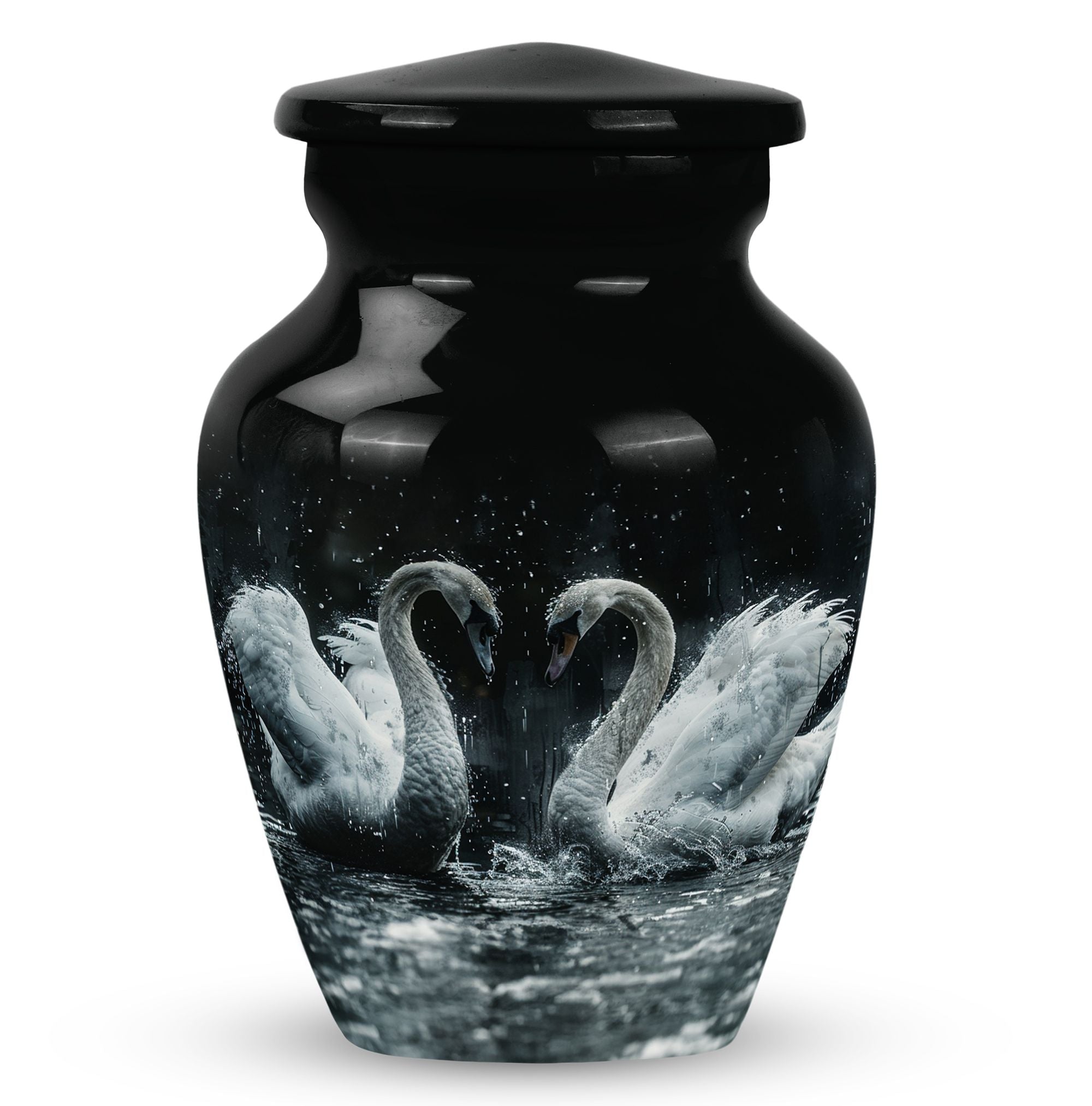 Crafted with care from premium aluminium, this urn showcases two intertwined swans symbolizing love and unity. Its graceful design makes it ideal as large urns for human ashes adult female, urns for ashes adult male large, or large cremation urns for any adult. The secure screw-top lid ensures safe storage, while its generous capacity makes it suitable as a large human ashes urn or urns for human ashes large adult.