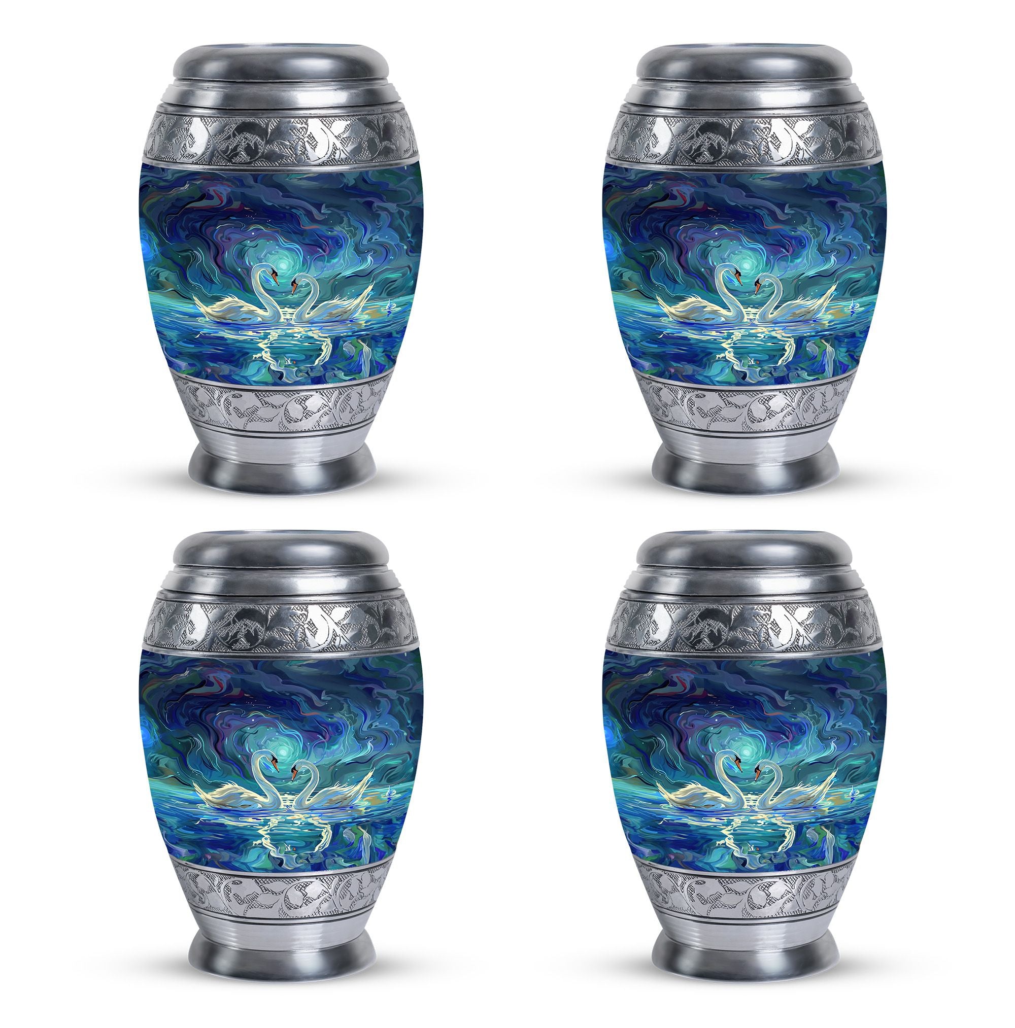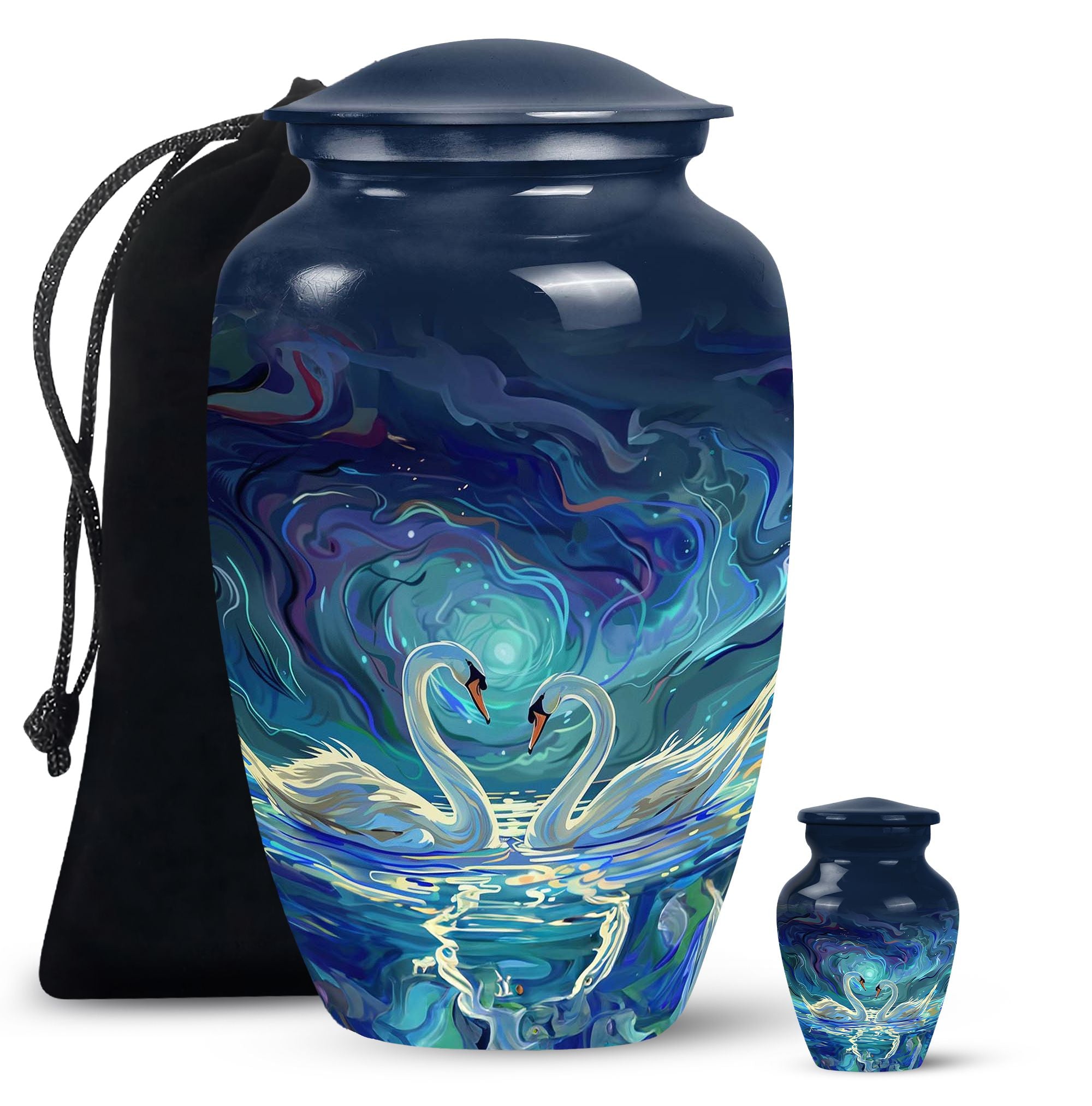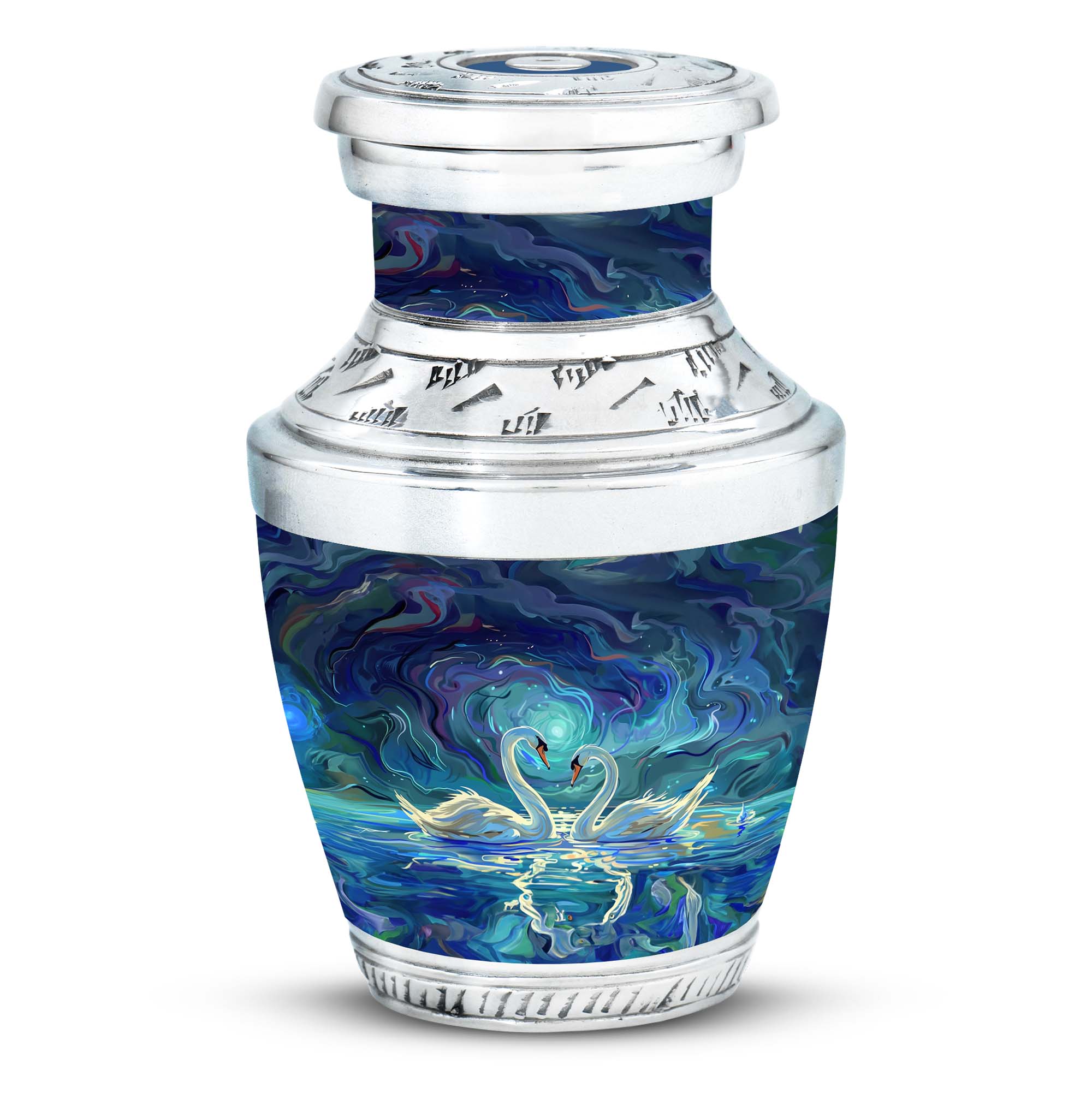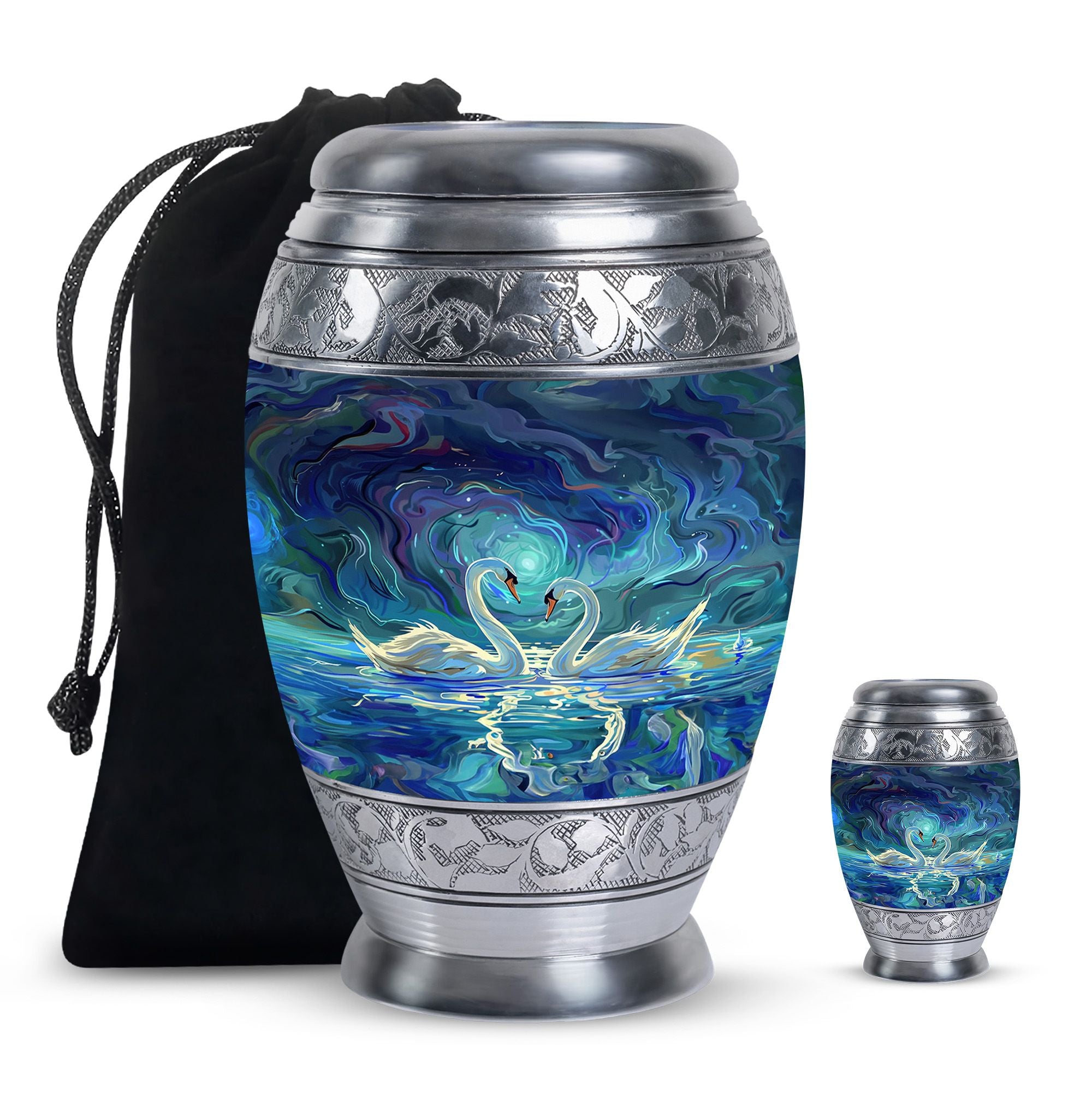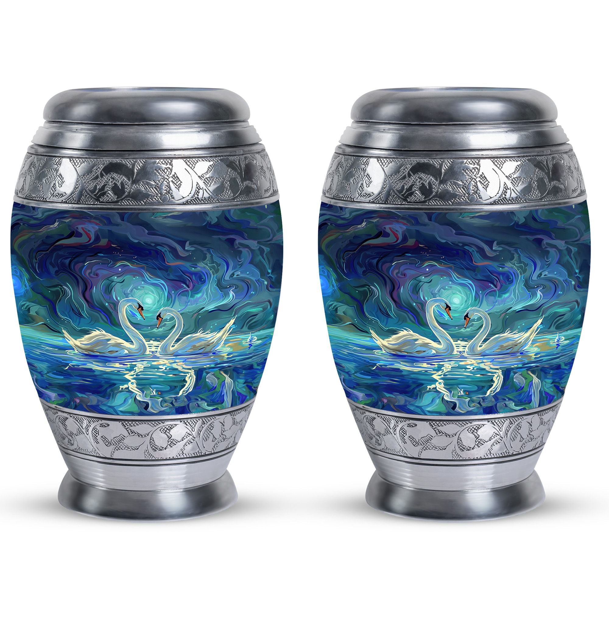 Expertly handcrafted, this large cremation urn features a lustrous moonlight finish adorned with elegant swan motifs — a symbol of purity and eternal unity. Made from durable aluminum, it ensures long-lasting protection for your loved one’s remains. This large urn for human ashes combines beauty and strength, offering a fitting tribute for both men and women. The secure screw-top lid keeps ashes safe, while the polished surface complements any interior space. Whether chosen as urns for ashes large or urns for human ashes adult female, it serves as a timeless keepsake of love.