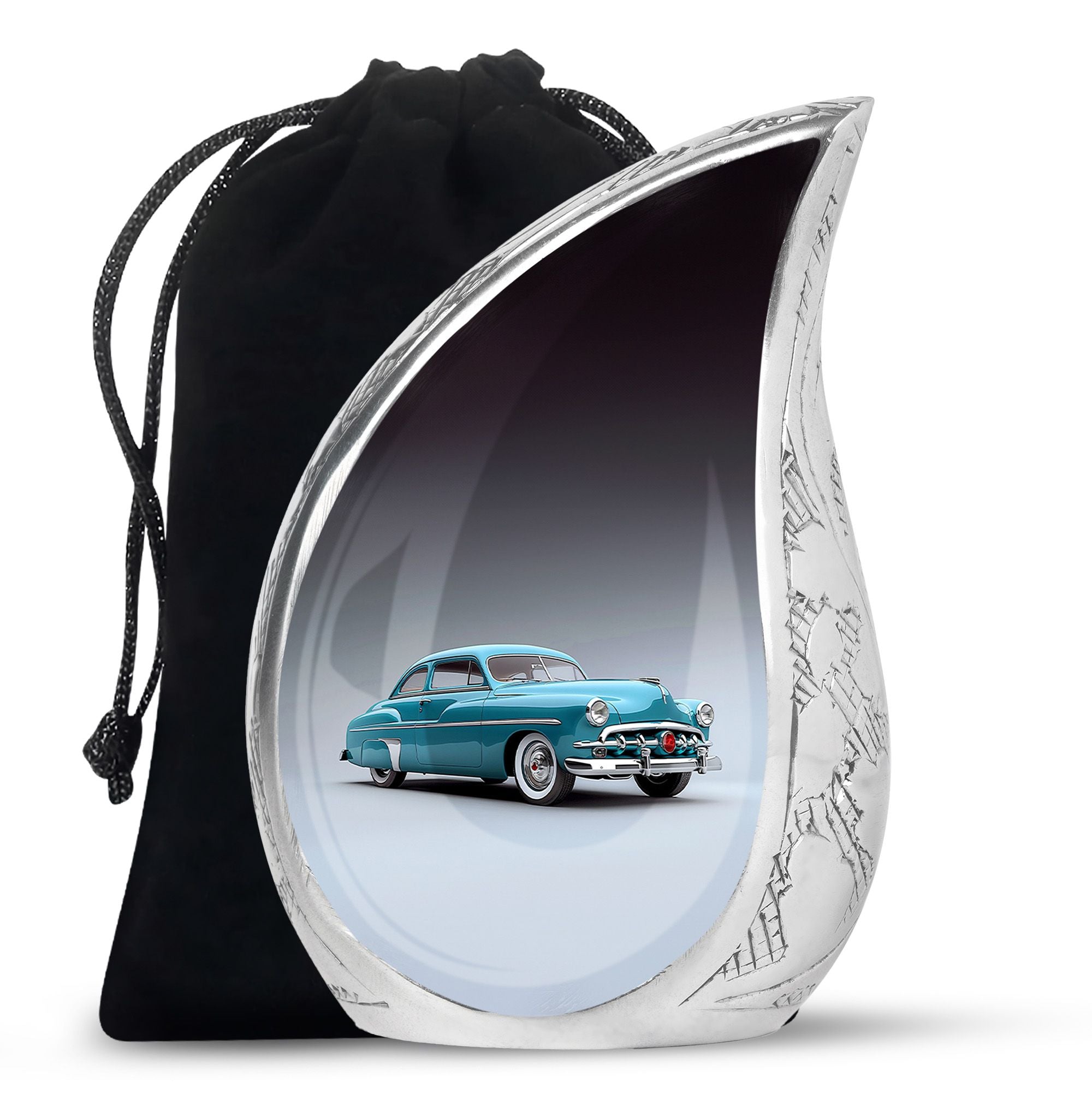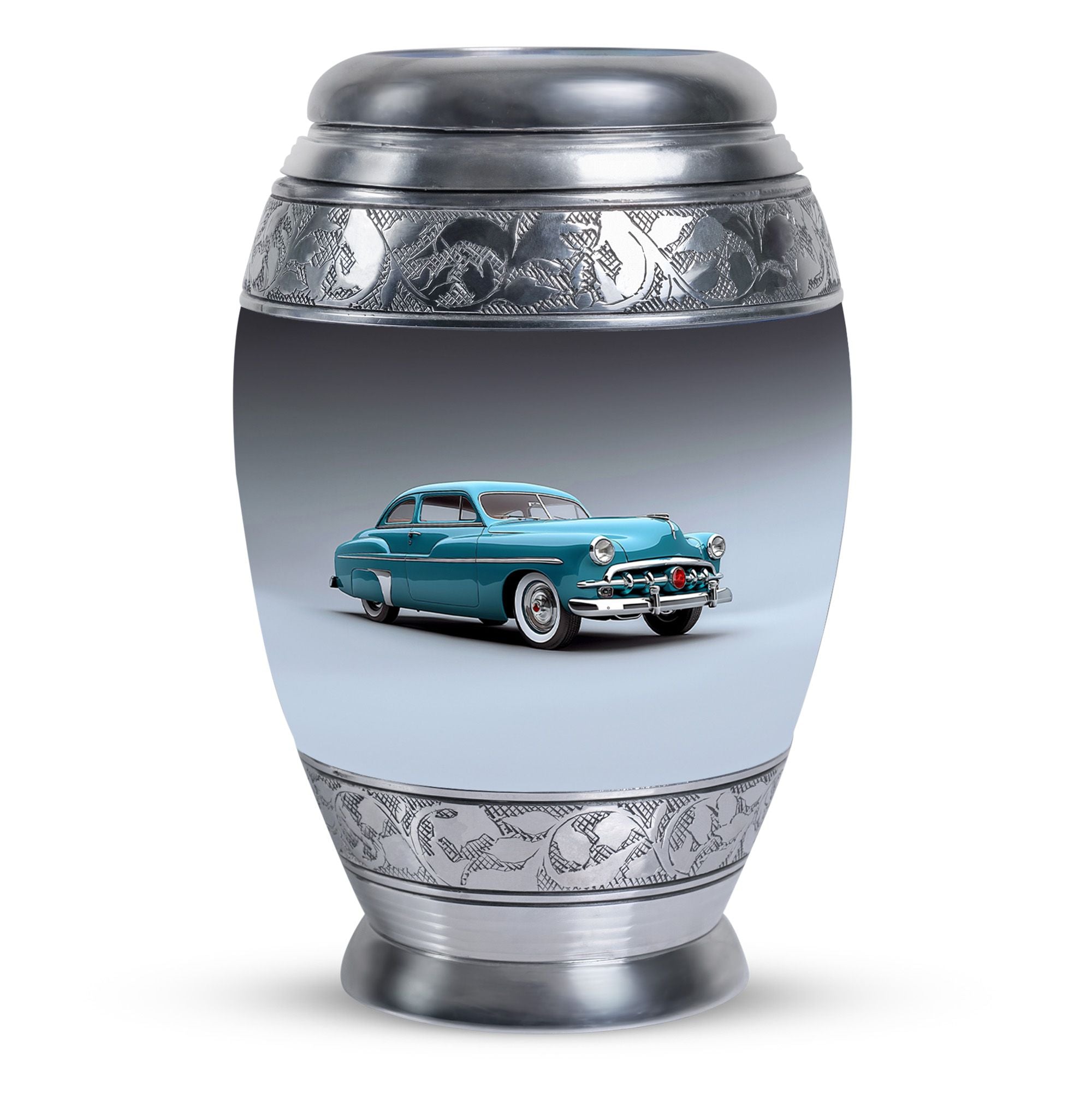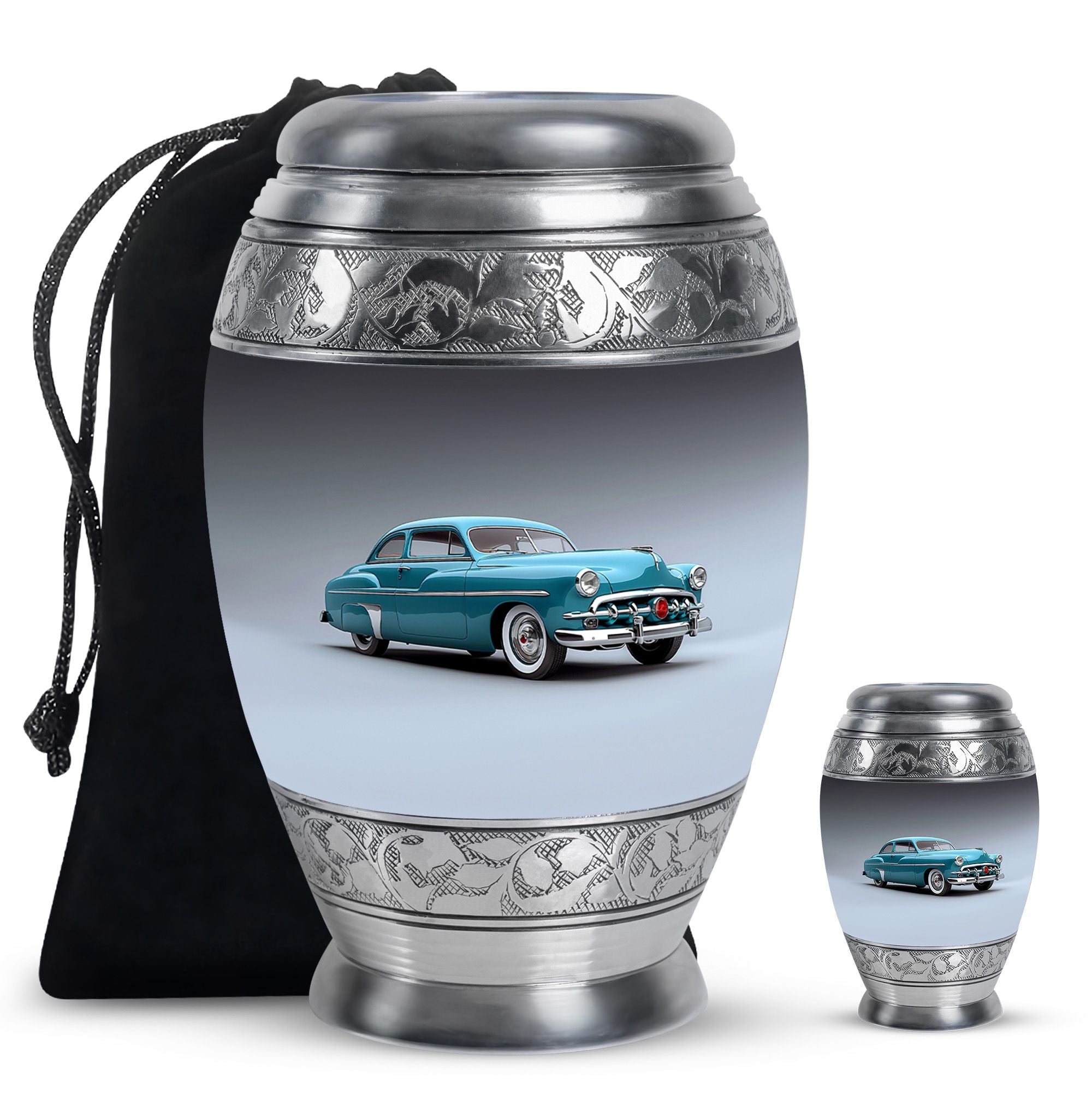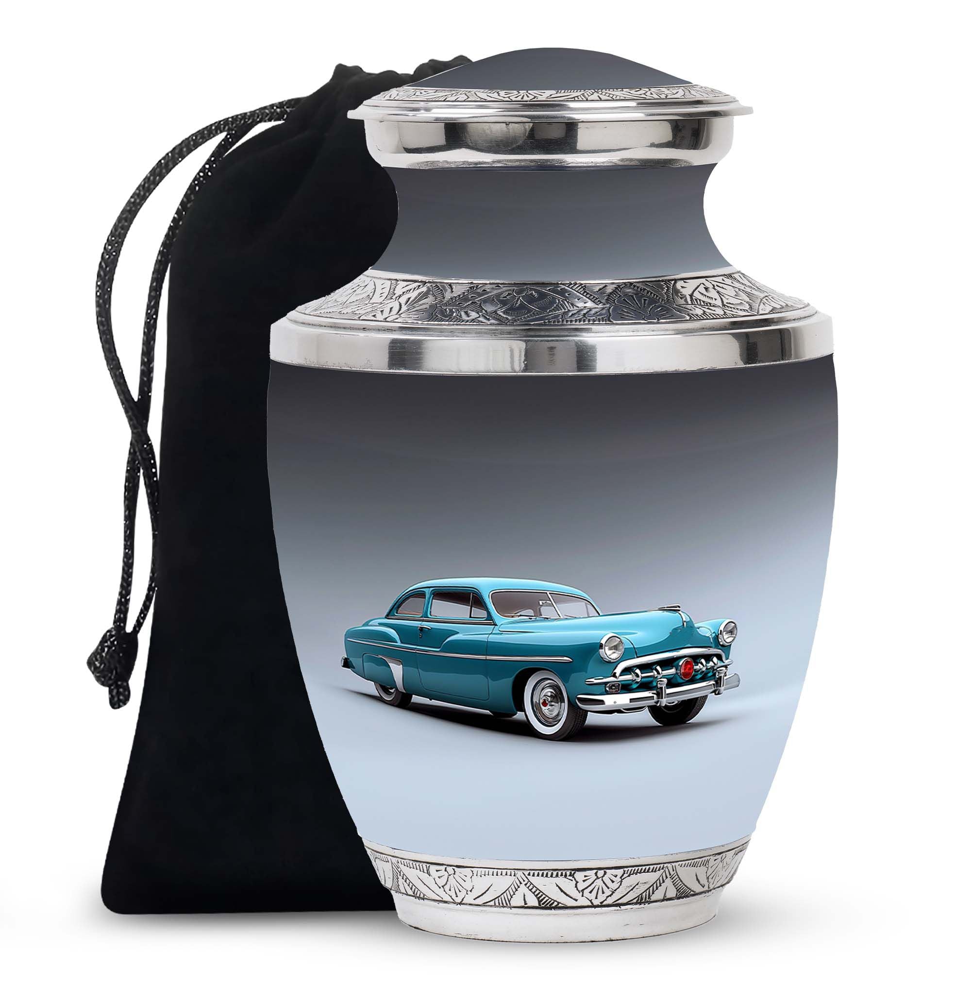 Beautifully handcrafted, this urn for human ashes adult male features a deep vintage red car motif with silver detailing, evoking classic elegance and enduring craftsmanship. Constructed from durable aluminum, it ensures lasting protection and peace of mind. The secure screw-top lid keeps ashes safely enclosed, while its polished surface adds a touch of sophistication — making it a timeless urn for ashes adult male small keepsake or a stunning display piece for memorial settings. Whether chosen as urns for human ashes adult female mom or urns for human ashes adult male dad, each design honors life’s treasured memories.