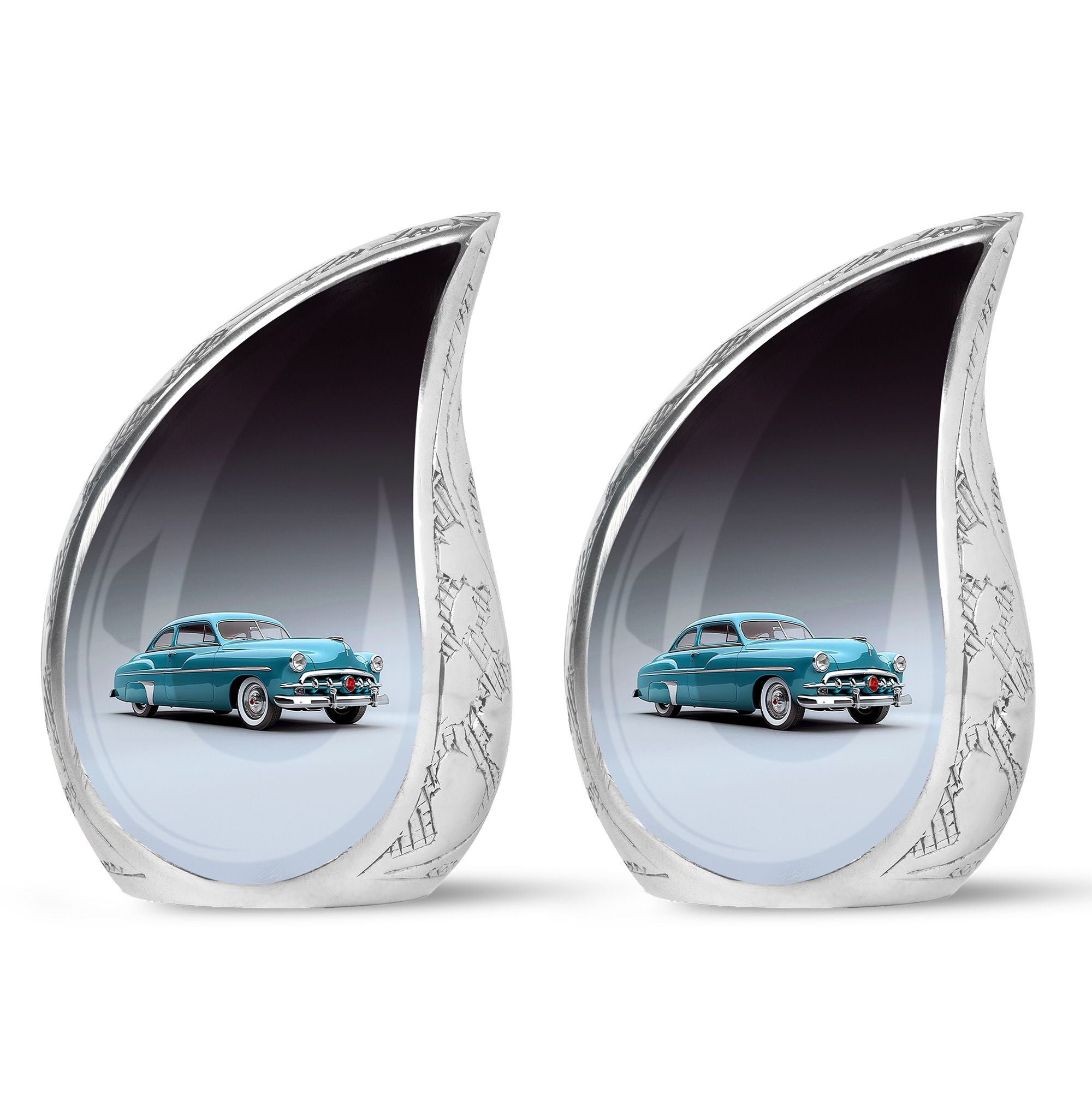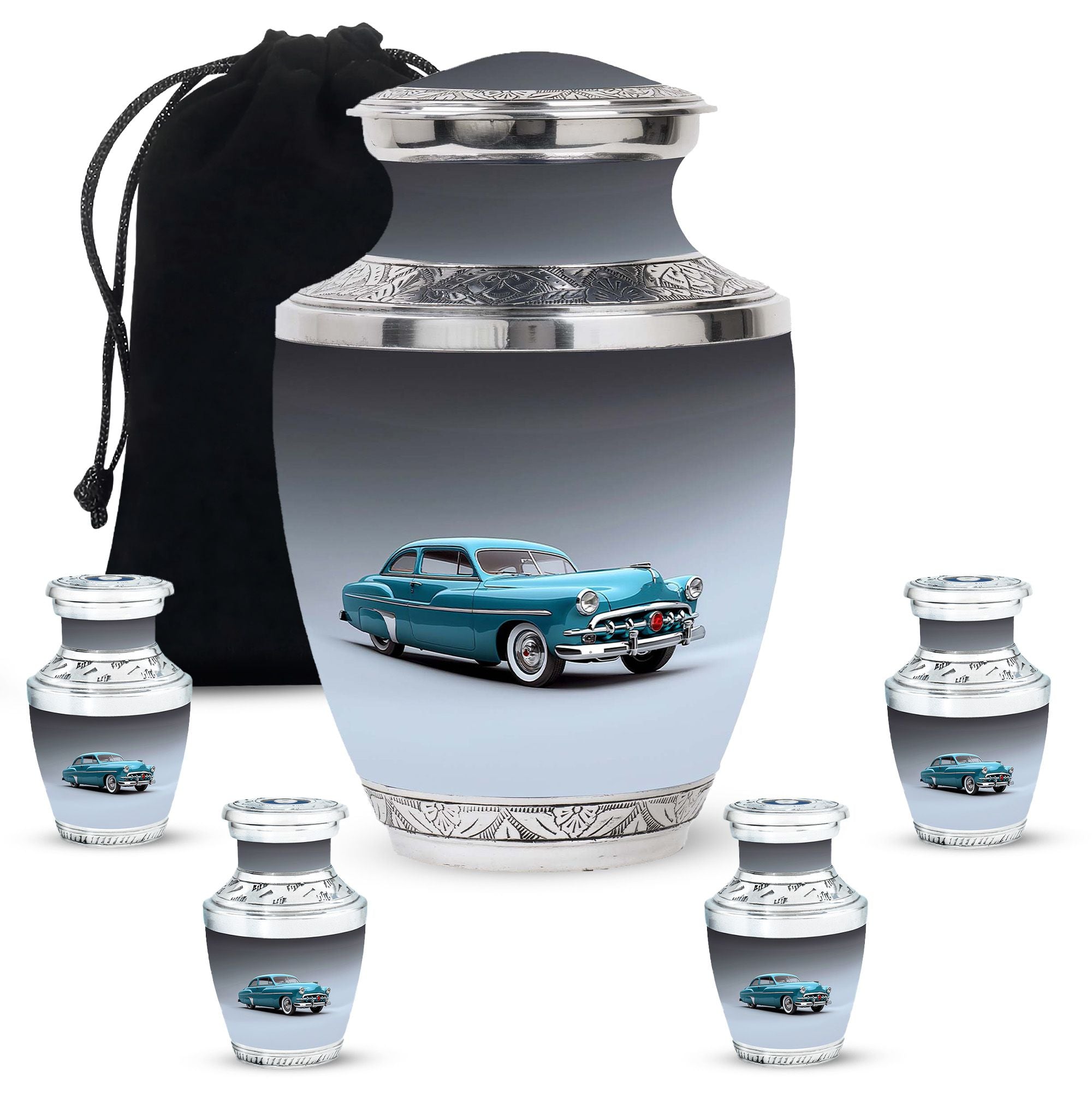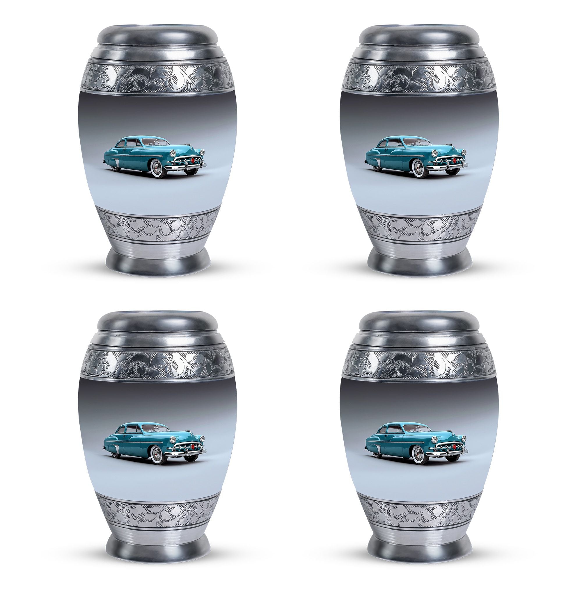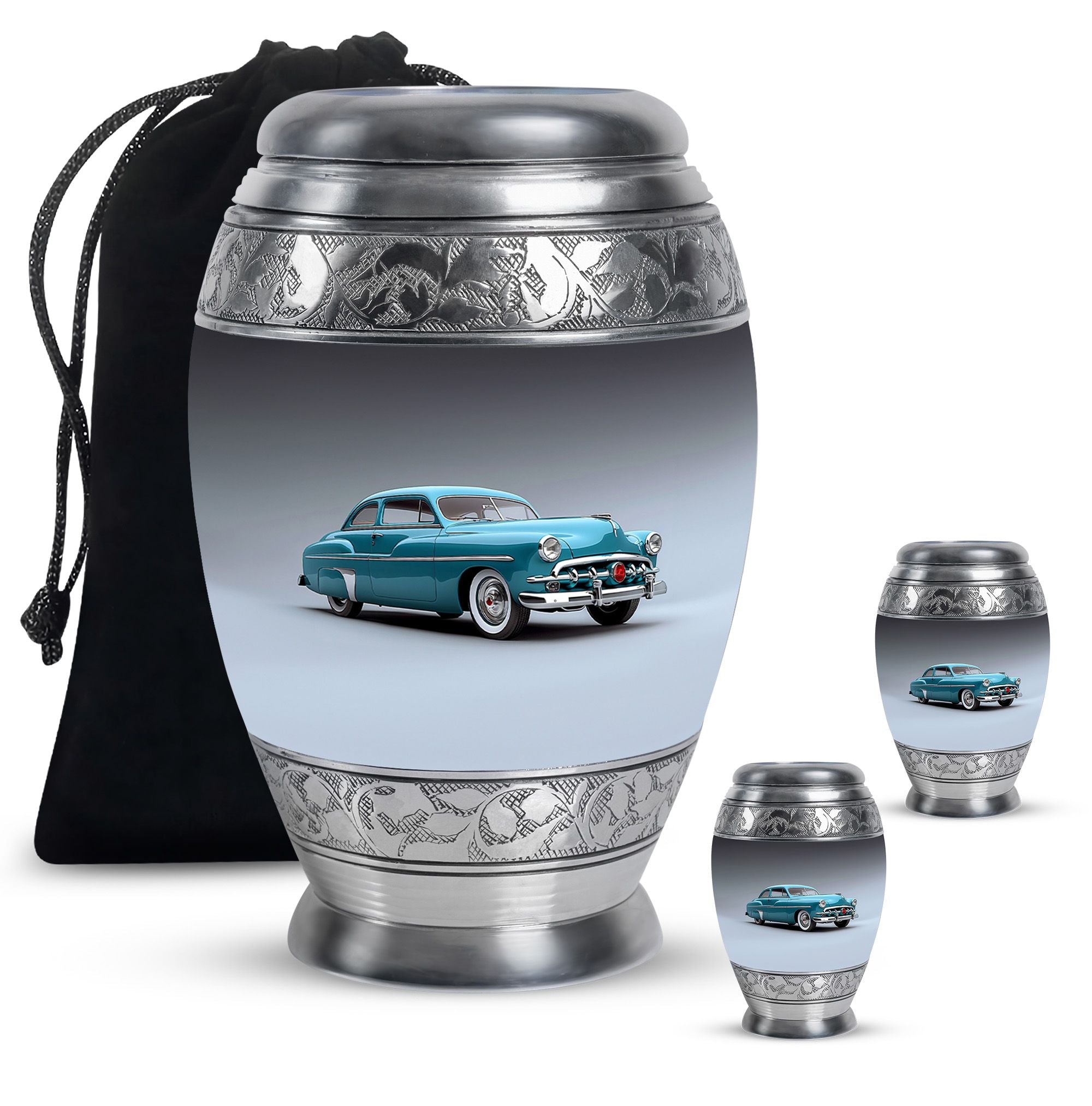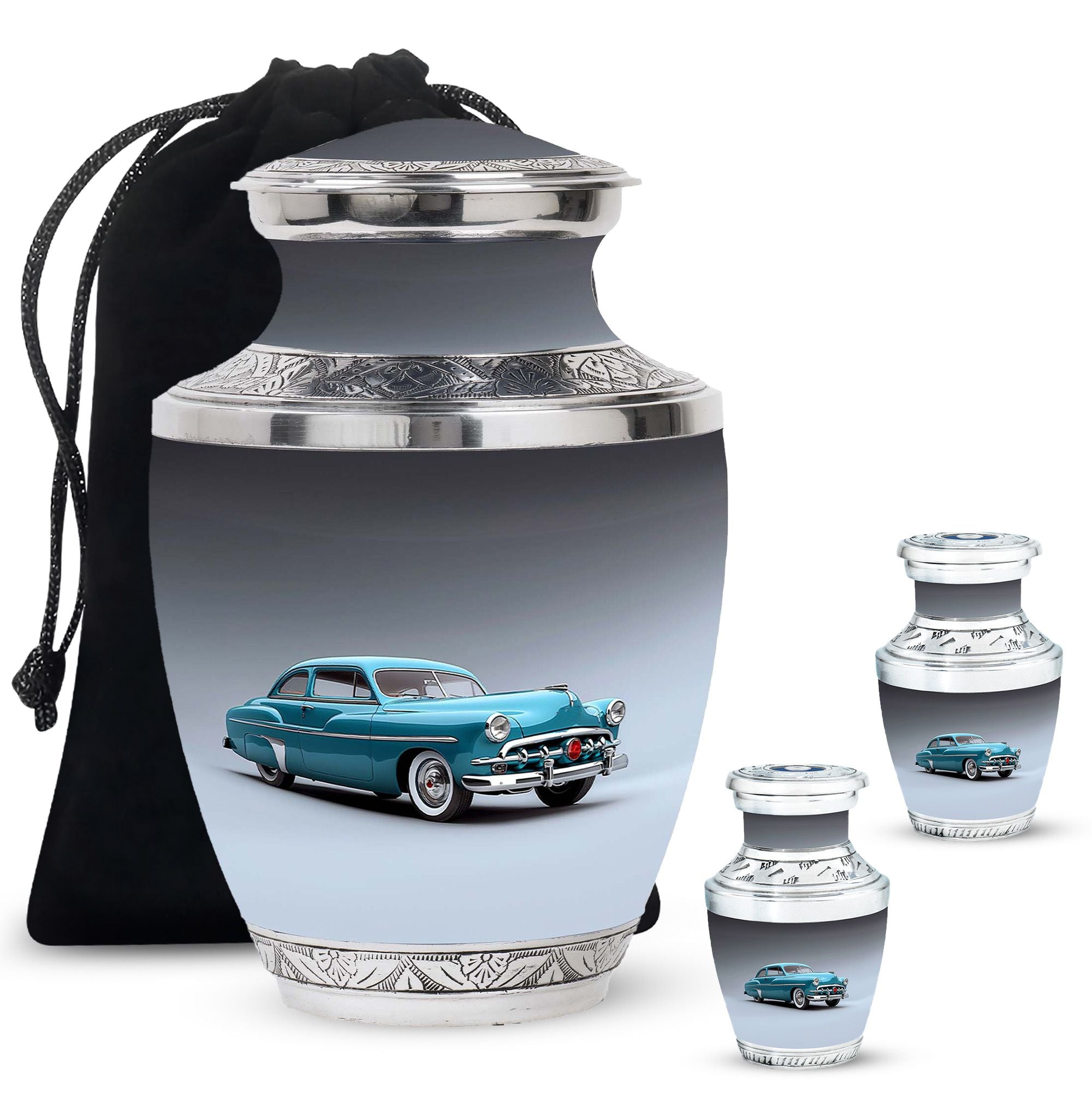 Beautifully handcrafted, this urn for human ashes adult male features a deep vintage red car motif with silver detailing, evoking classic elegance and enduring craftsmanship. Constructed from durable aluminum, it ensures lasting protection and peace of mind. The secure screw-top lid keeps ashes safely enclosed, while its polished surface adds a touch of sophistication — making it a timeless urn for ashes adult male small keepsake or a stunning display piece for memorial settings. Whether chosen as urns for human ashes adult female mom or urns for human ashes adult male dad, each design honors life’s treasured memories.