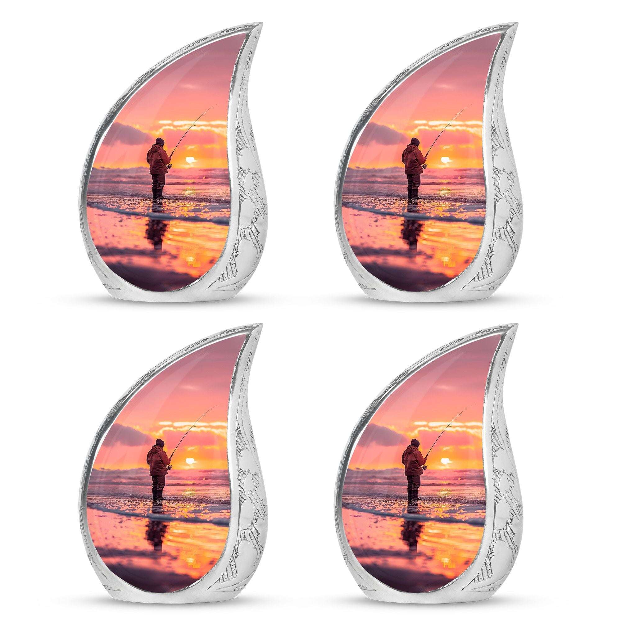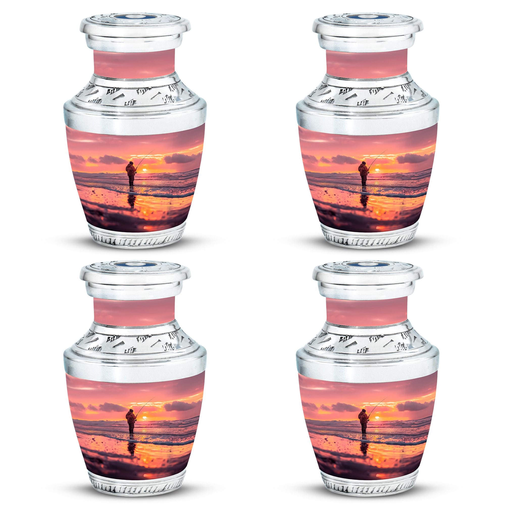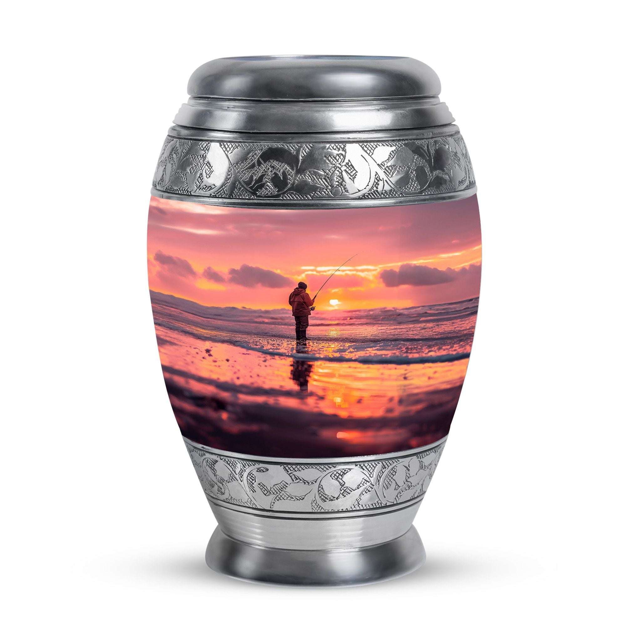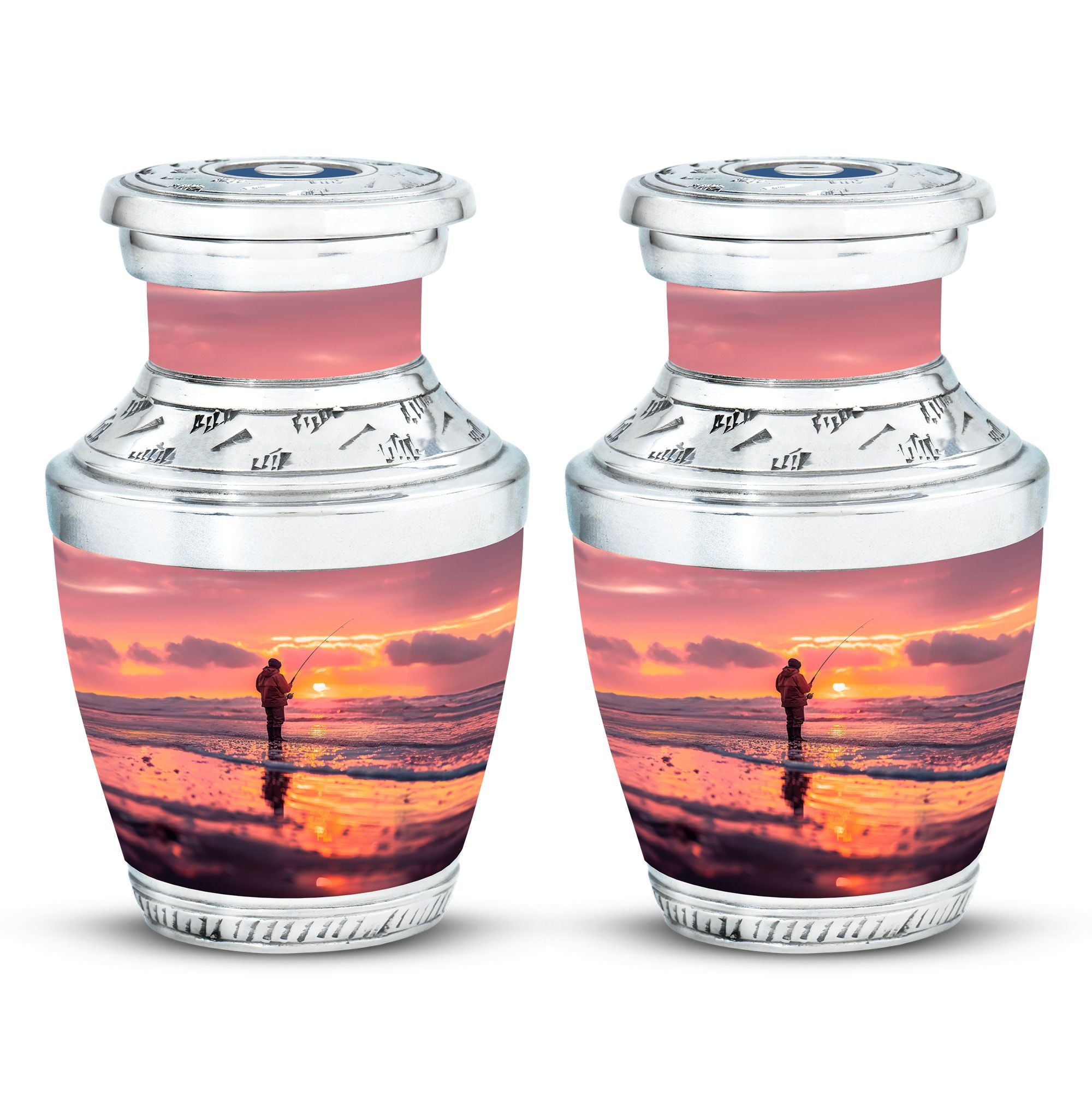 Crafted from durable aluminium, the urn features a serene ocean fishing design symbolizing peace and reflection. Its secure screw-top lid ensures safe storage, making it ideal as small cremation urn, mini cremation urns for human ashes, or cremation urn human ashes. The elegant design suits home display, intimate remembrance, or ceremonial use, offering a meaningful memorial for fathers and mothers alike.