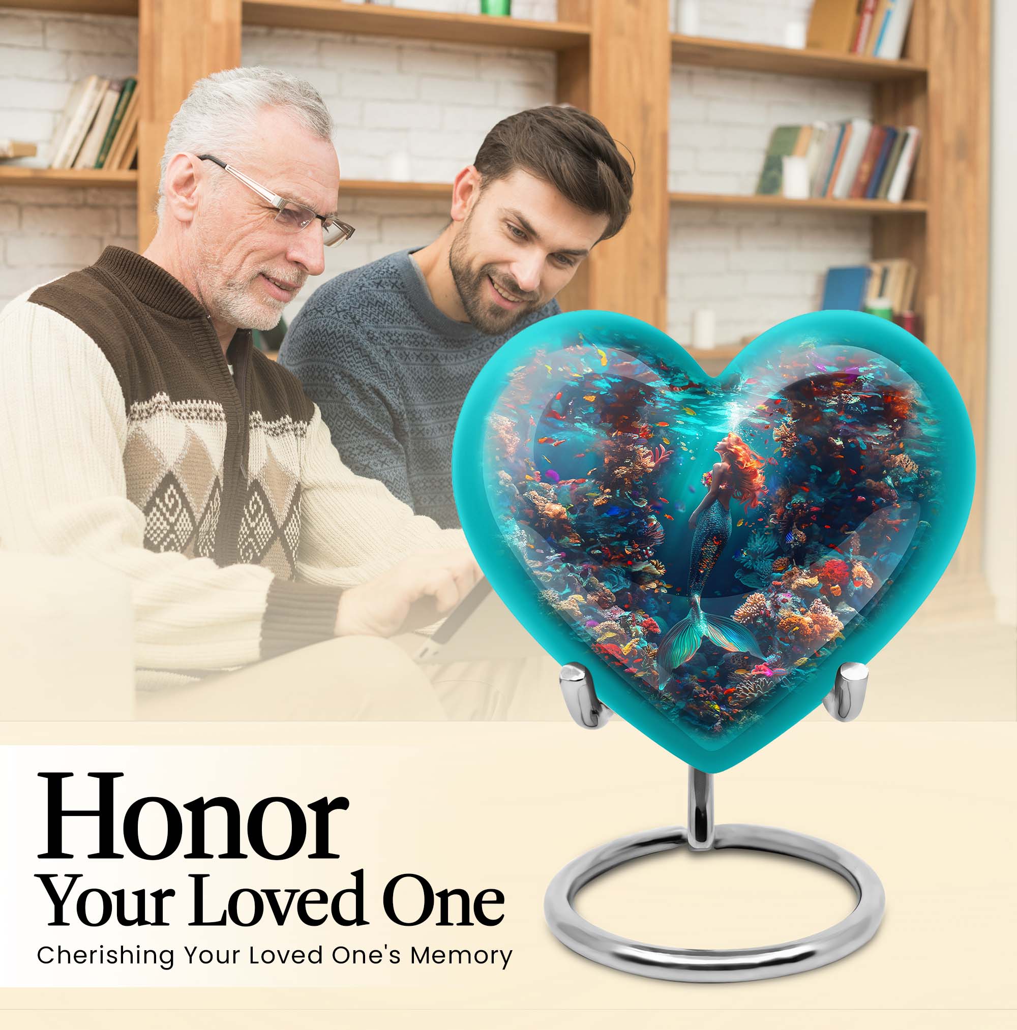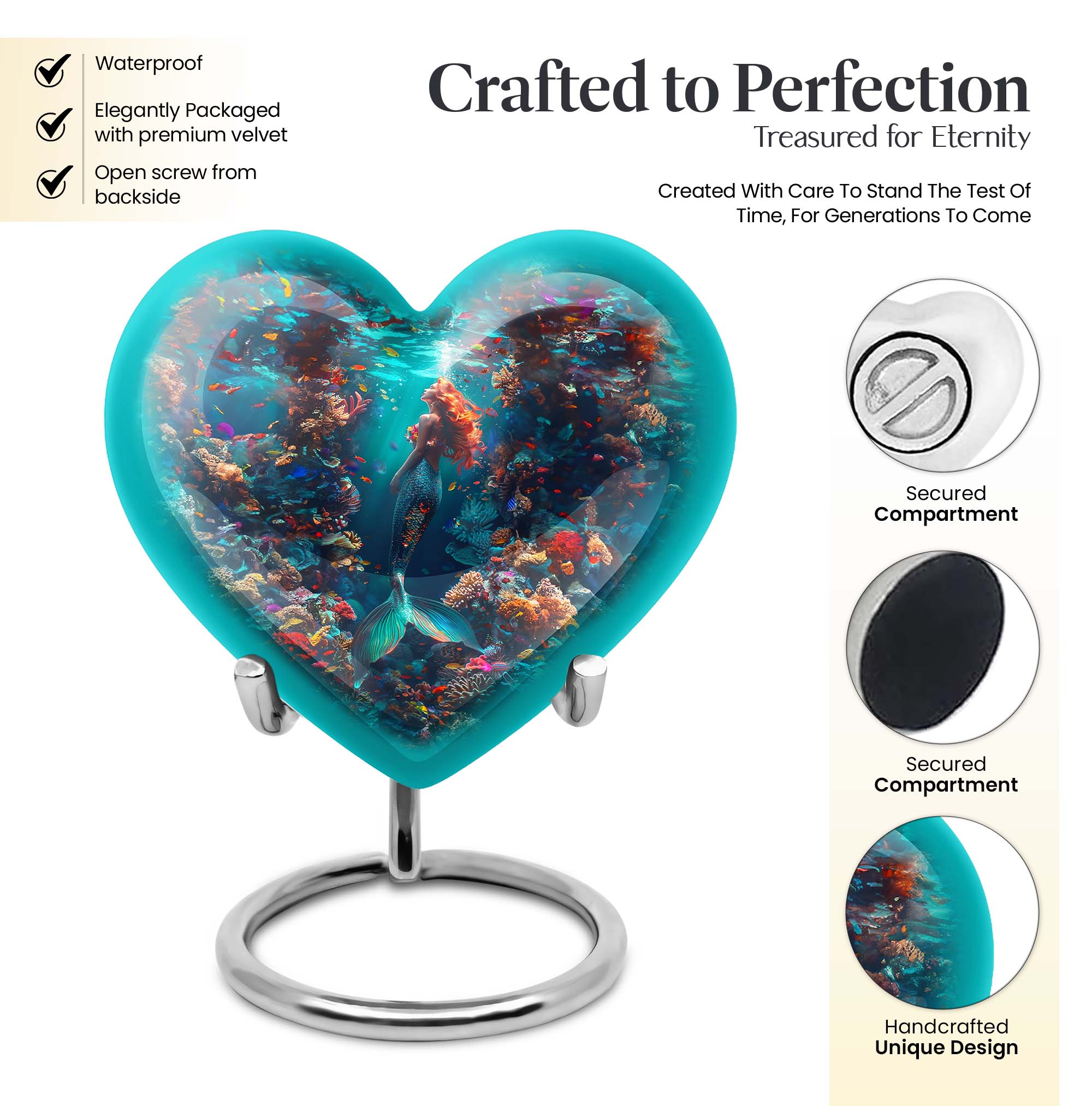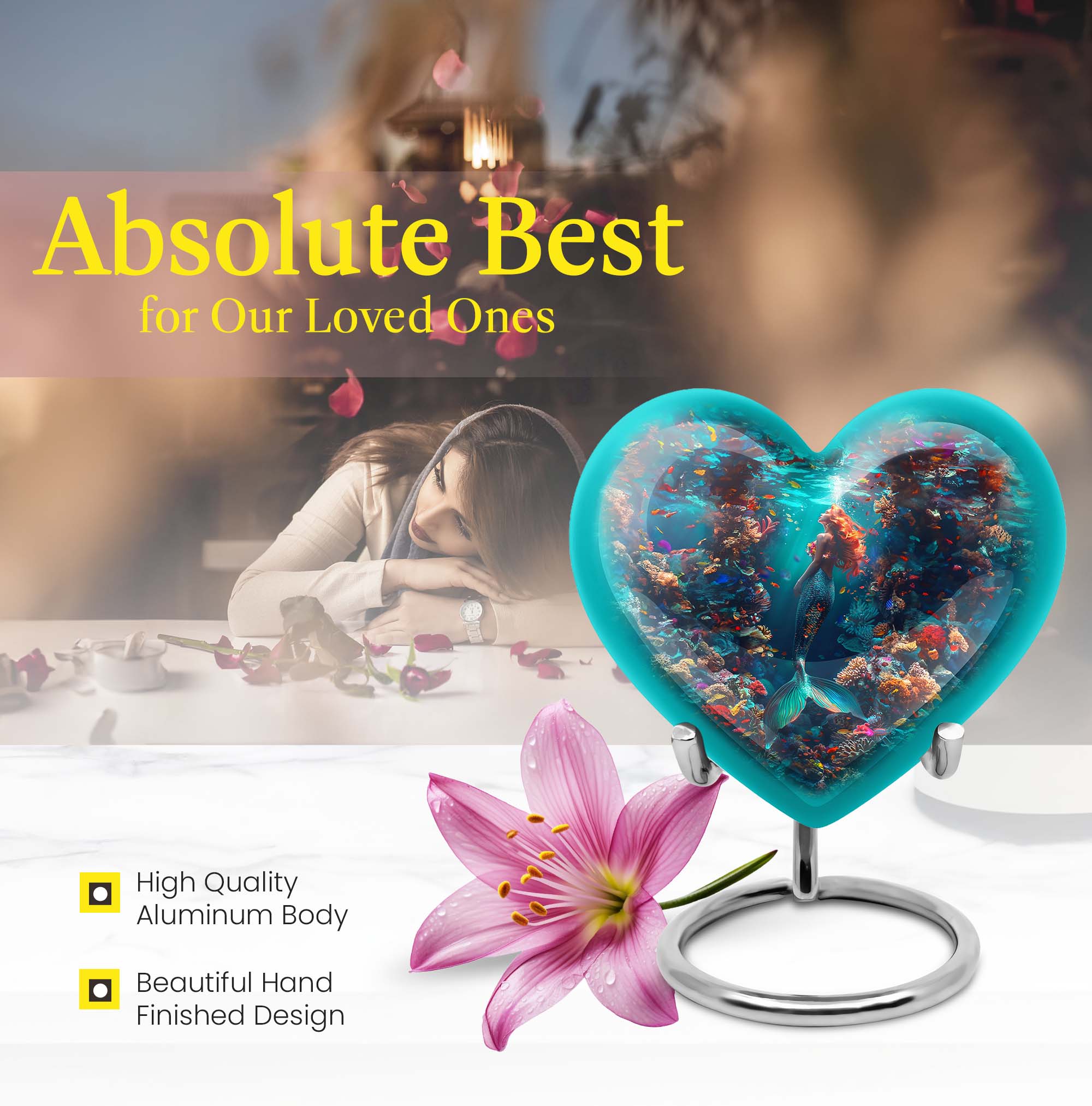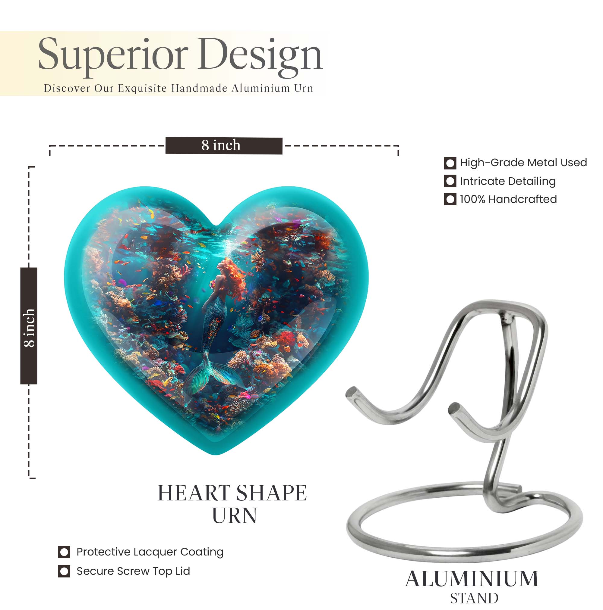 Introducing our heart-shaped Aluminium Mermaid Urn, a cherished piece designed to honor and pay tribute to your departed loved ones. It's an elegant piece from our collection of Cremation Large Urns, which stands 10 inches tall and has a hidden secure compartment with a generous capacity of 200 cubic inches for respectfully preserving ashes. The urn is meticulously crafted, robust at 3.3 pounds, and exudes a dignified aura. Reflecting its thoughtful craftsmanship is the Ocean theme, tenderly inspiring memories of ethereal beauty and transformation. The addition of personalized engravings brings a unique touch, allowing you to inscribe cherished names. Each purchase includes a velvet pouch to carefully envelop the urn, exuding both care and honor on this ordained memorial journey. Search keywords include 'cremation urn', 'human ash urn', 'funeral gifts', and 'metal urns for human ashes' for this respected token of remembrance.