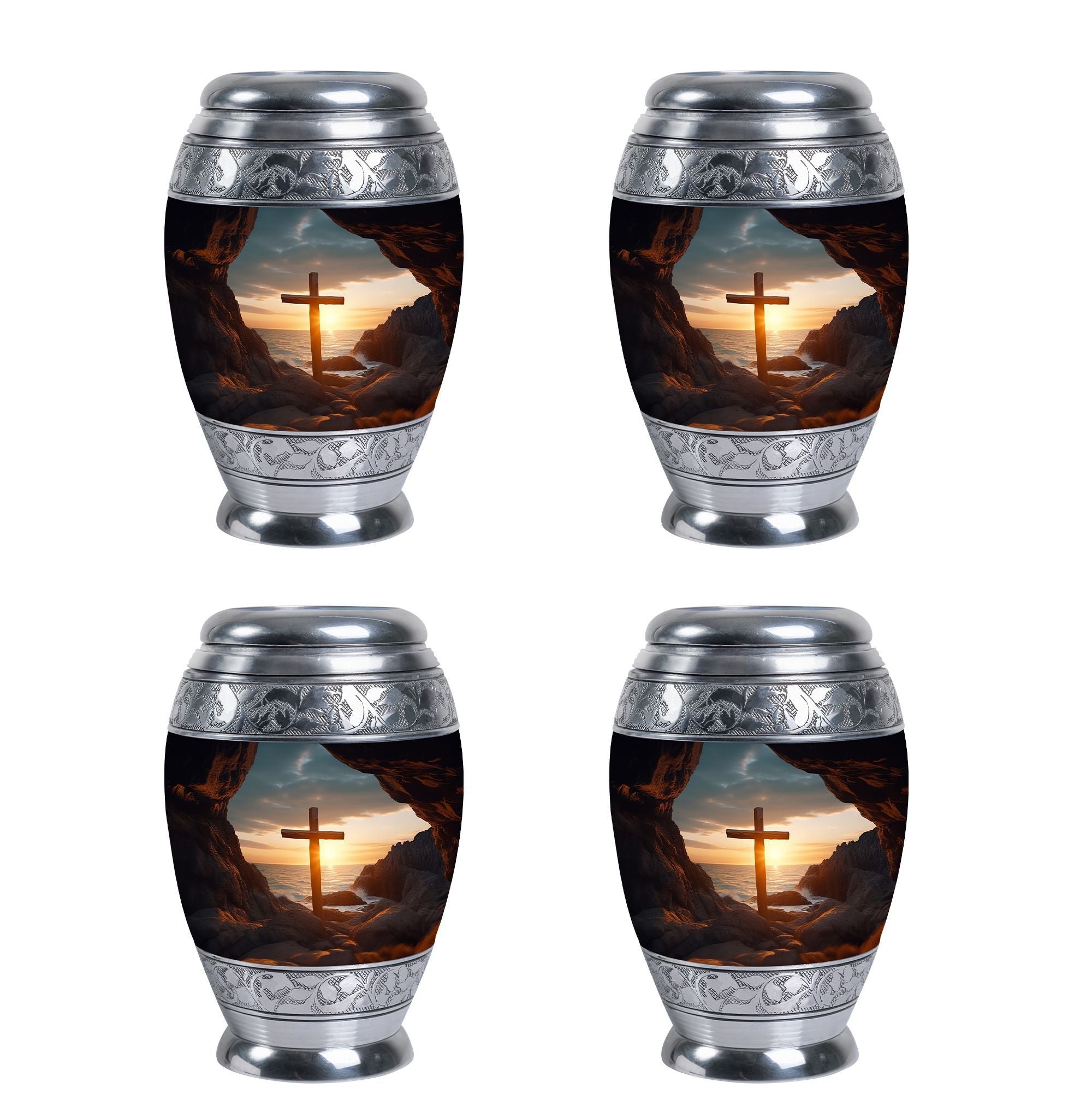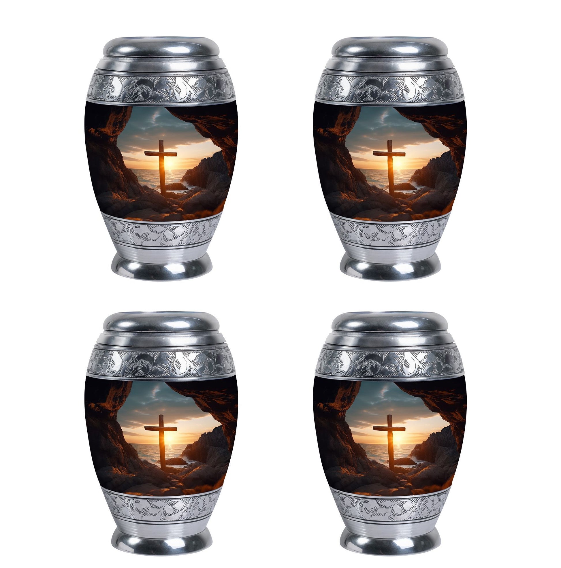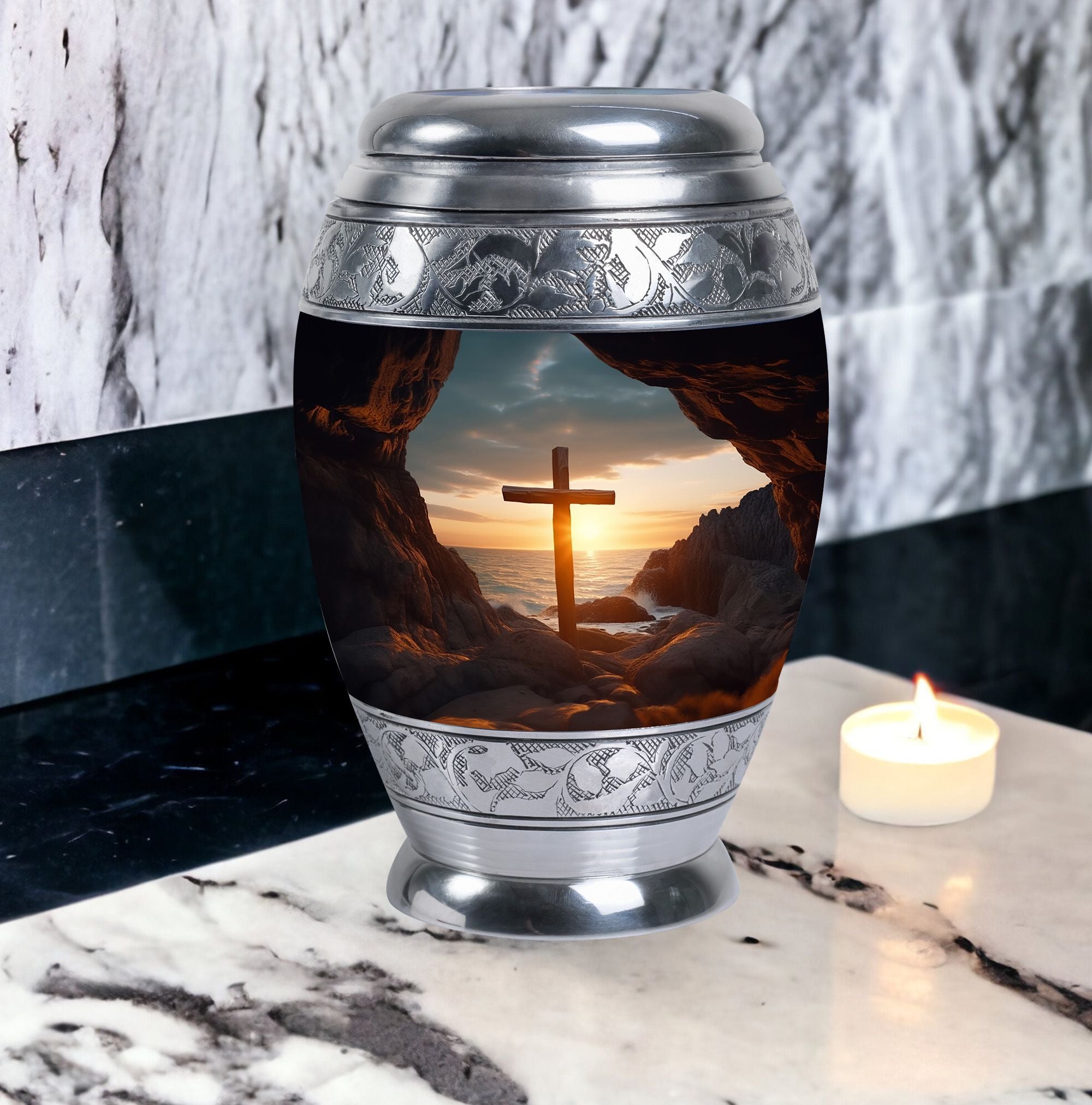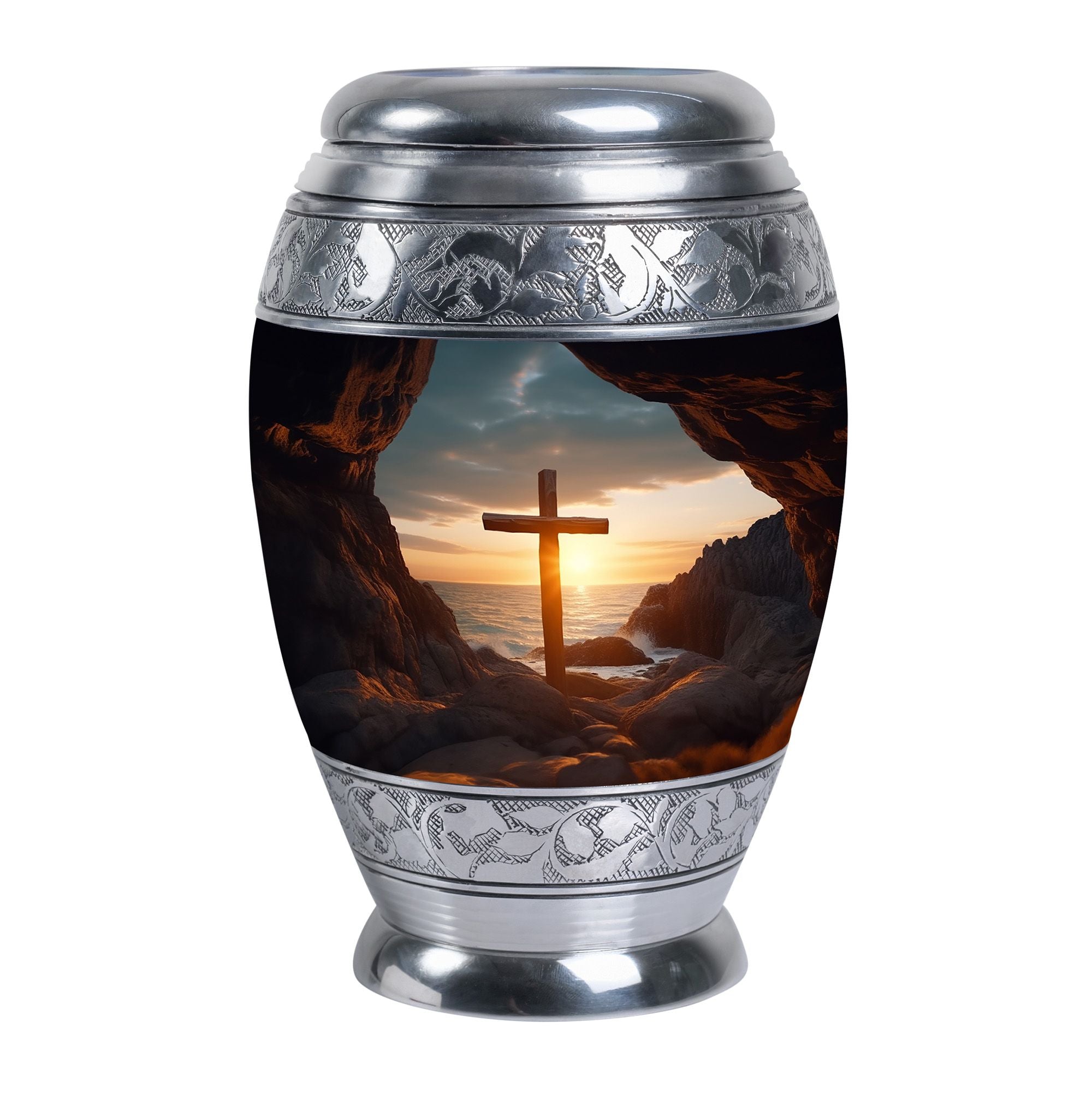 Experience an exquisite blend of durability, size, and beauty with our Ocean Jesus Cross Urns, specifically designed for adult and senior believers. Made from high-quality aluminium material, this Large Urn serves as an ideal last resting place for loved ones. It weighs 3.3 pounds, stands 10 inches tall, and is spacious enough with a capacity of 200 cubic inches, making it one of the perfect cremation urns you can find online. Personalization is possible with engraved names, turning it into a truly unique urns for ashes. The urn comes with a velvet pouch for containment of ashes, a thoughtful addition ensuring respectful treatment of your cherished one's remains. This classic urn design intricately presents the 'Ocean Jesus Cross', seamlessly merging spirituality with memorial. Get this ashes holder today, and celebrate the life of your loved one in an elevated, sanctified way, making each remembrance as deep as the ocean.