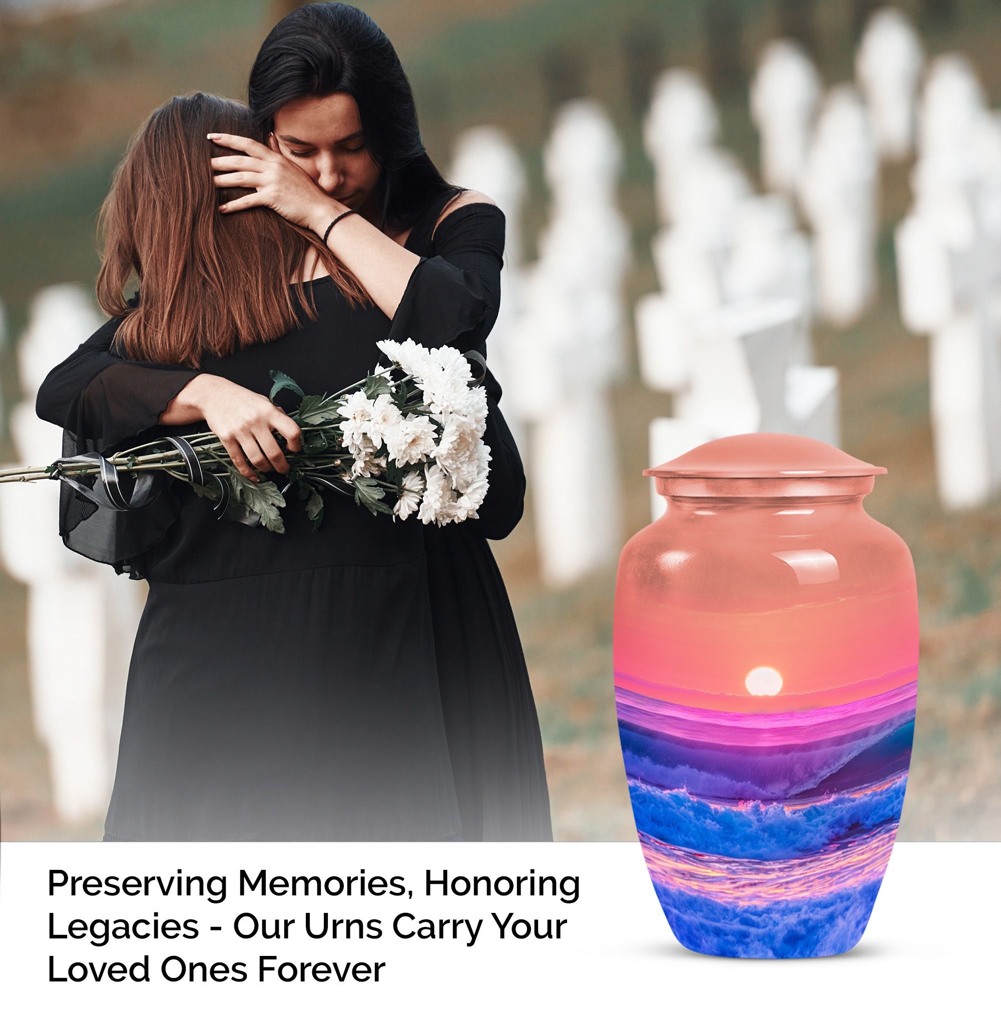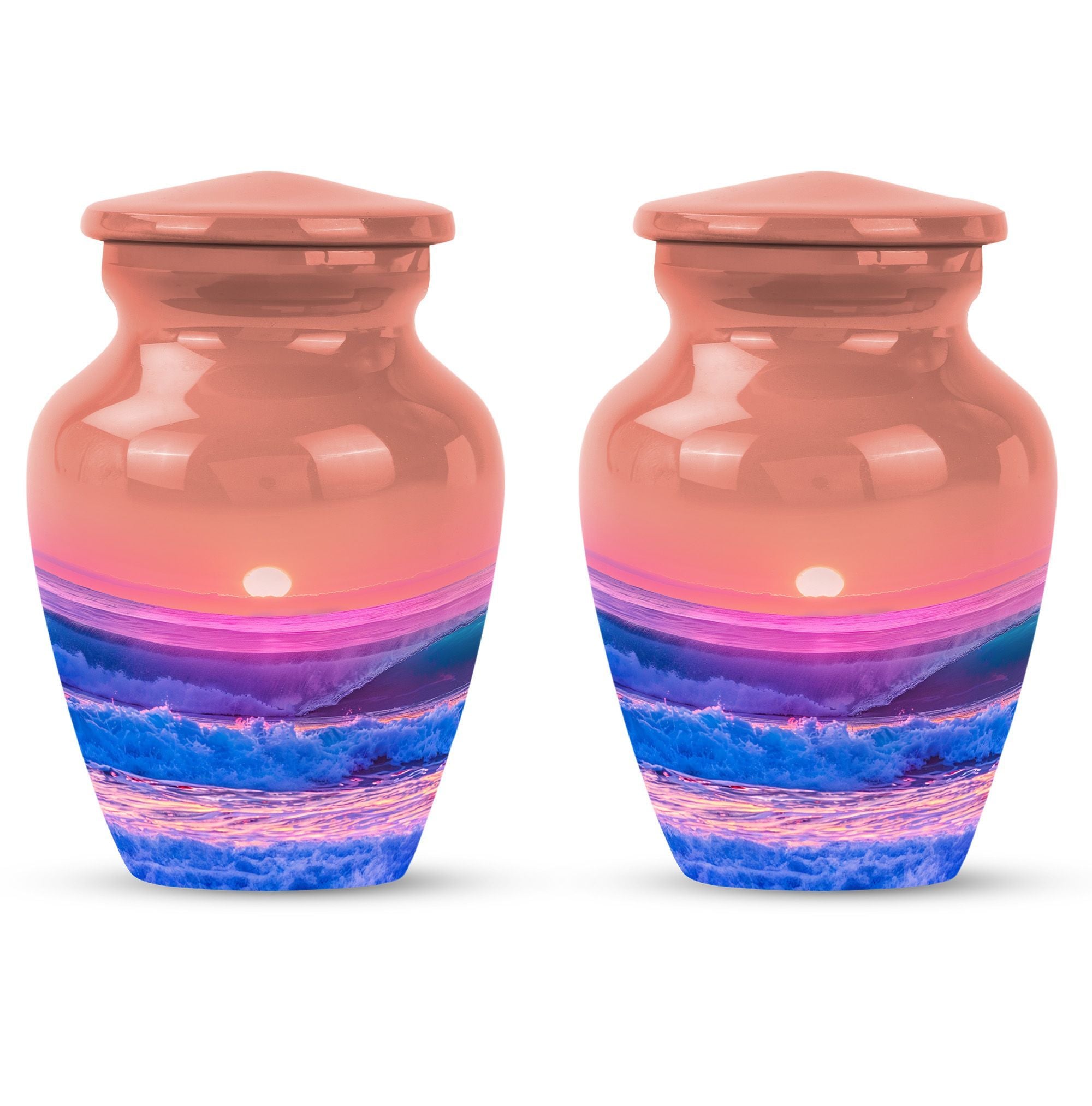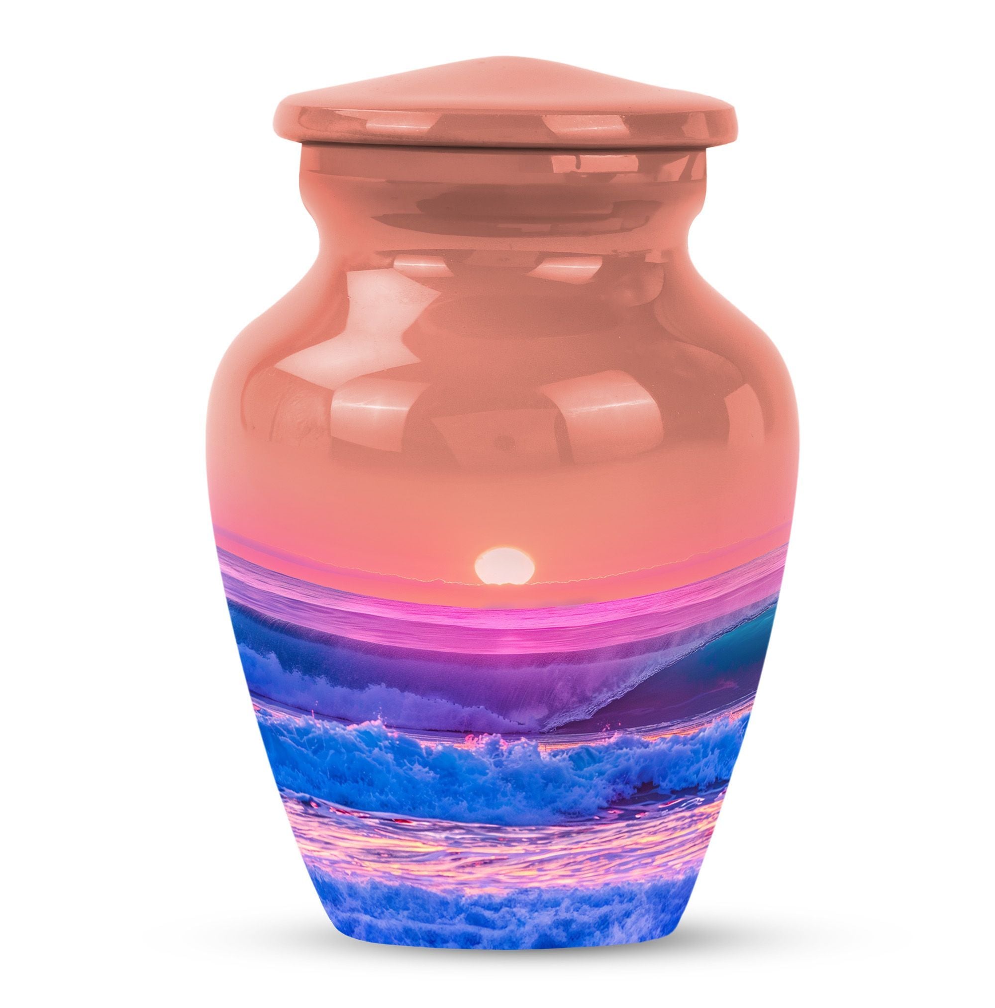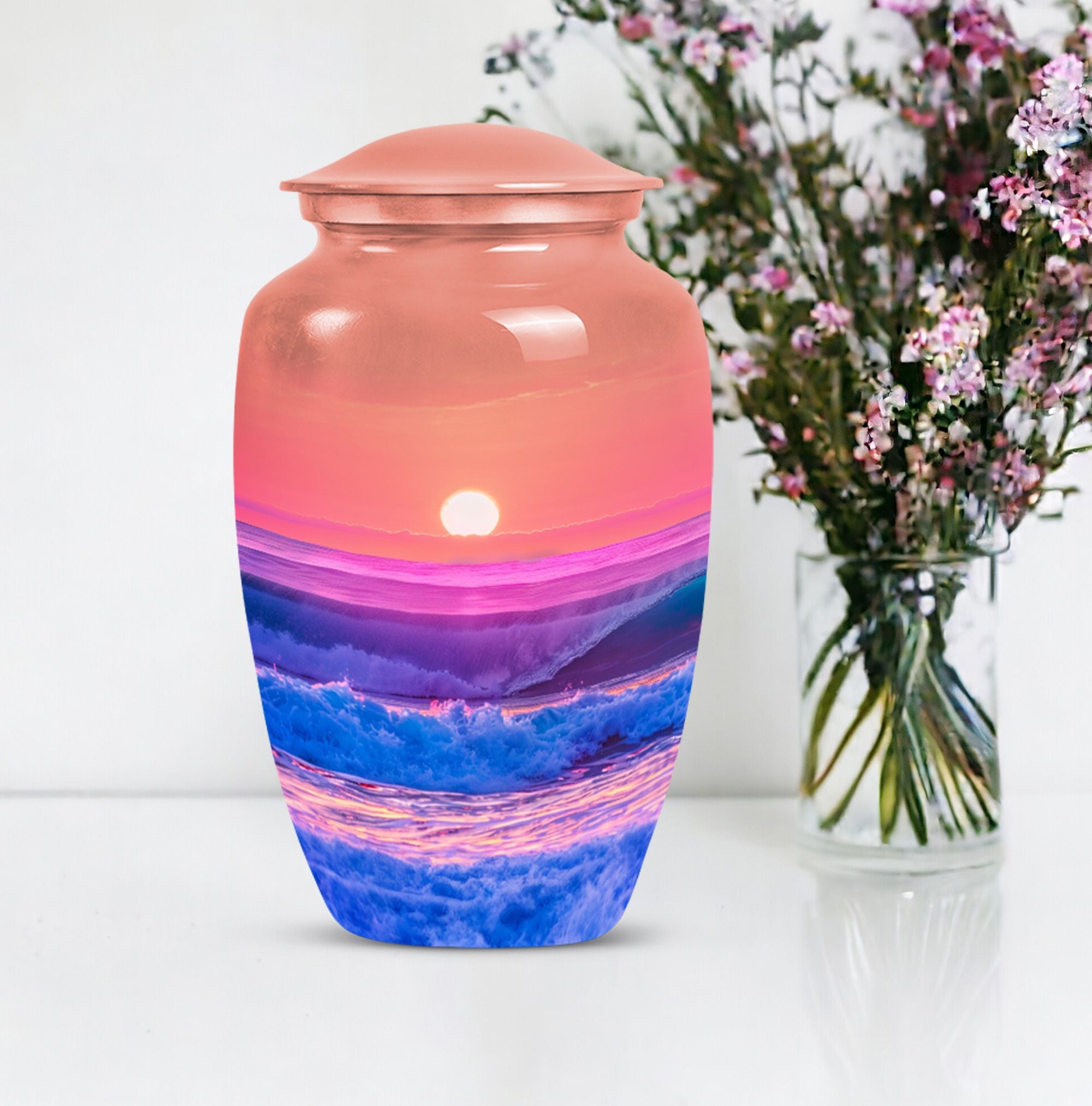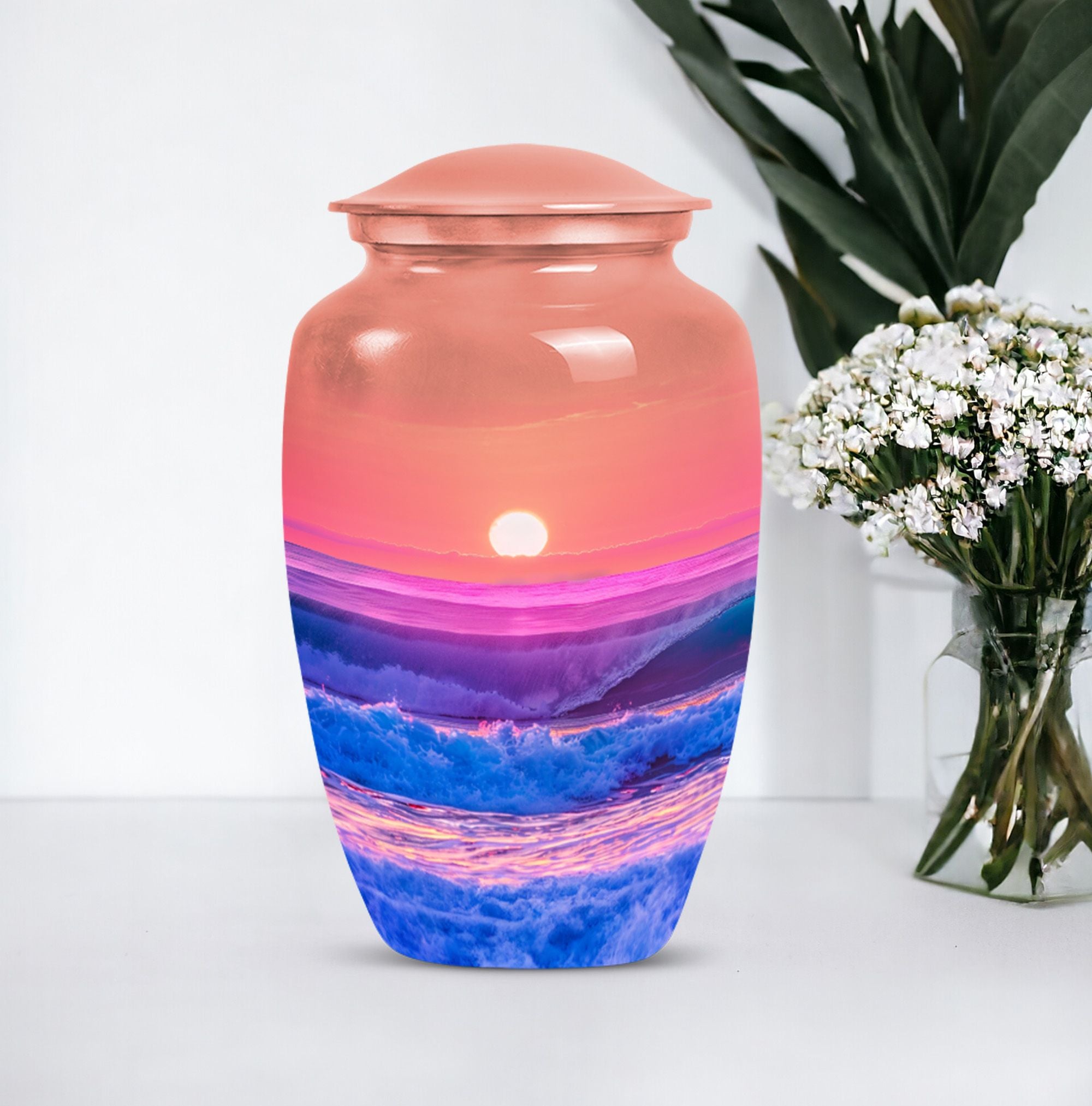 Immerse yourself in the serene elegance of this ocean waves urn, a fitting tribute to honor the memory of adults and seniors. Our ever-respected butterfly theme is delicately echoed in this large urn, hinting at peace, transformation, and continuity. Crafted meticulously from resilient aluminium, it resounds the high-quality tenacity the container possesses. The memorial urn stands proud and noticeable at 10 inches, with a weight of a reasonable 3.3 pounds, making it a tasteful centerpiece to any memorial ceremony. This funeral burial urn ensures a substantial capacity of 200 cubic inches, providing ample space for human ashes. Adding a personal touch, you have the option to customize this sublime urn by engraving names for an intimate remembrance. Each urn arrives with a luxurious velvet pouch for containment of ashes, encapsulating its elegance while adding an extra security layer. Dive into serenity with these exquisite human ash urns - providing a vessel of remembrance as boundless and ever-lasting as the ocean waves.