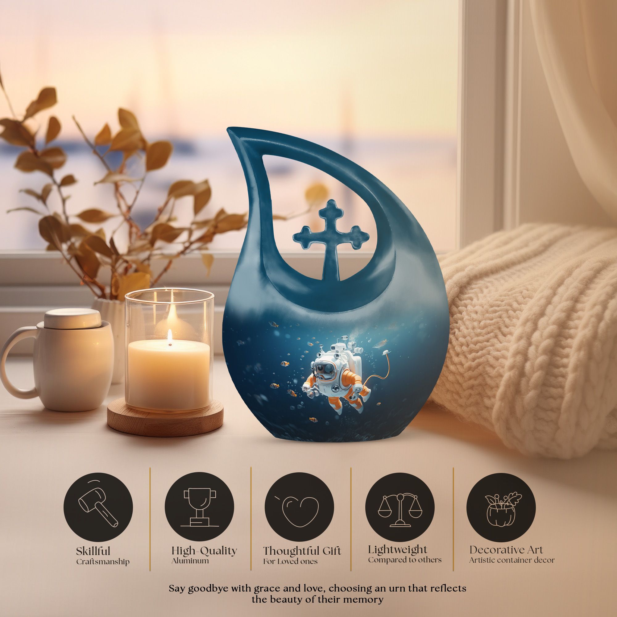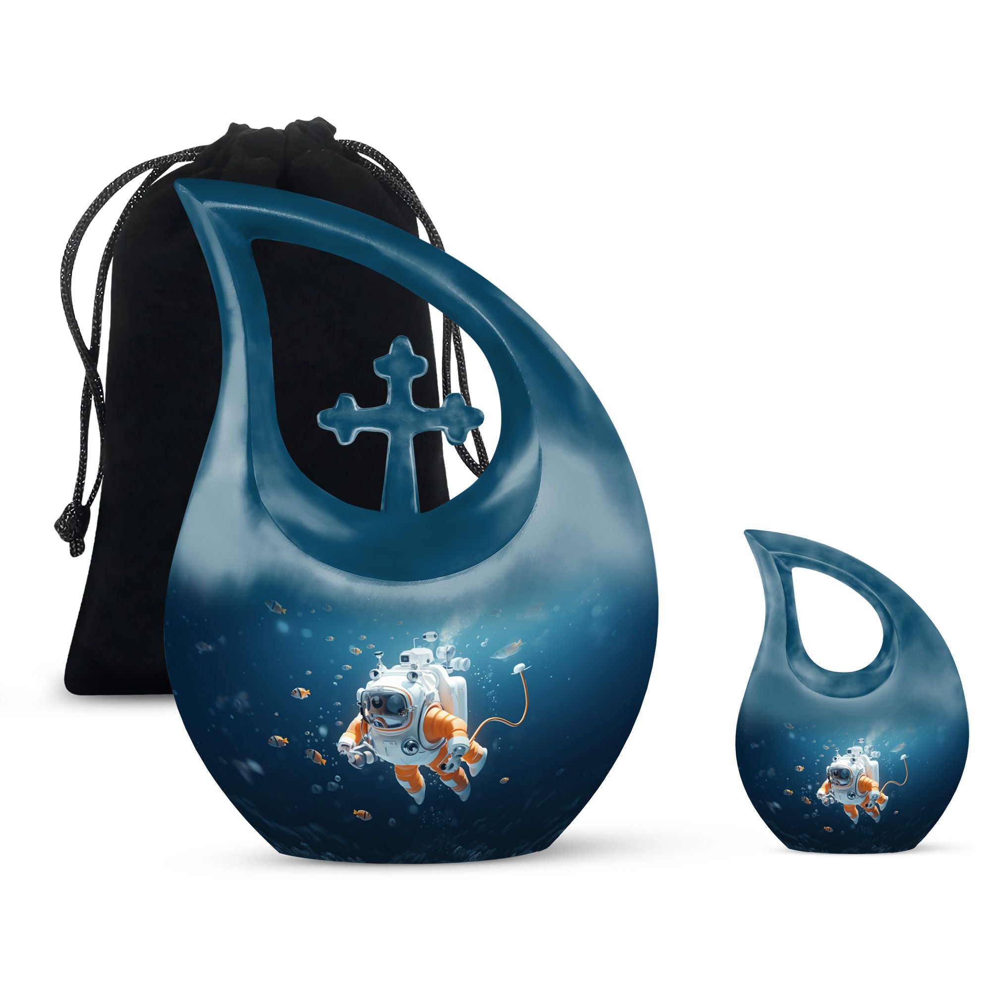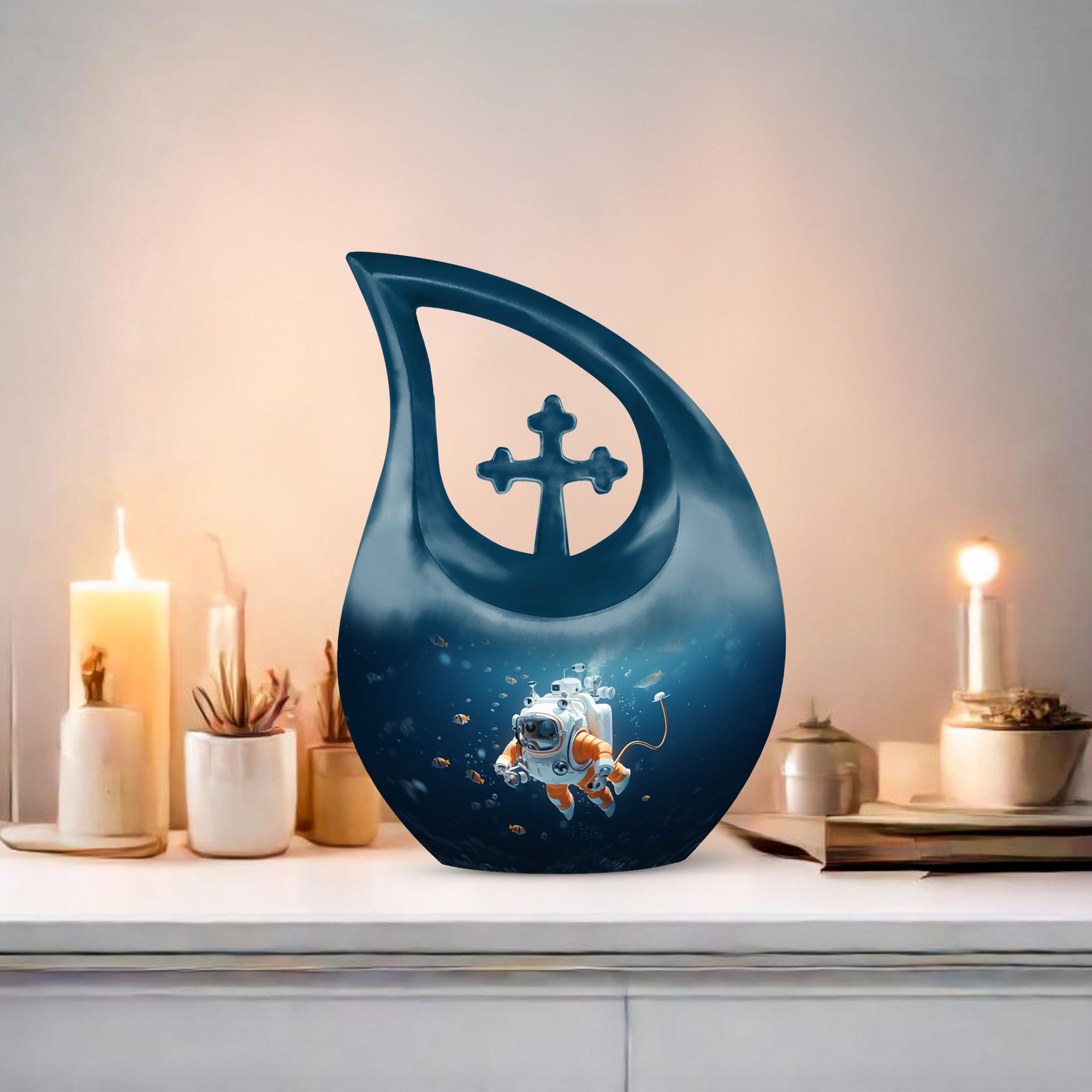 Embark on a poignant voyage of remembrance with our Exploring The Oceanic Urn. Crafted from high-quality aluminium, this Large Urn harmoniously combines aesthetics and functionality. Its weight of 3.3 pounds and dimensions of 10 inches in height, make it as sturdy as it is striking. Designed with a capacity of 200 cubic inches, the urn comfortably and securely holds your loved one's ashes. The Cross Drop Urn design exudes a serene ambiance, echoing the vastness and tranquility of the ocean. Adding a personal touch, you can also personalize this remembrance urn for ashes with engraved names, etching your memories gently into its form. To further ease your process of grief, it comes with a velvet pouch providing a respectable containment for the ashes. From urns that don’t look like urns to cremation urn liners and cremation monuments, our memorial urns offer a sublime selection for adults and seniors. With our ‘Exploring The Oceanic Urn’, embrace a unique token of remembrance that reverberates with the profound depths of the ocean.