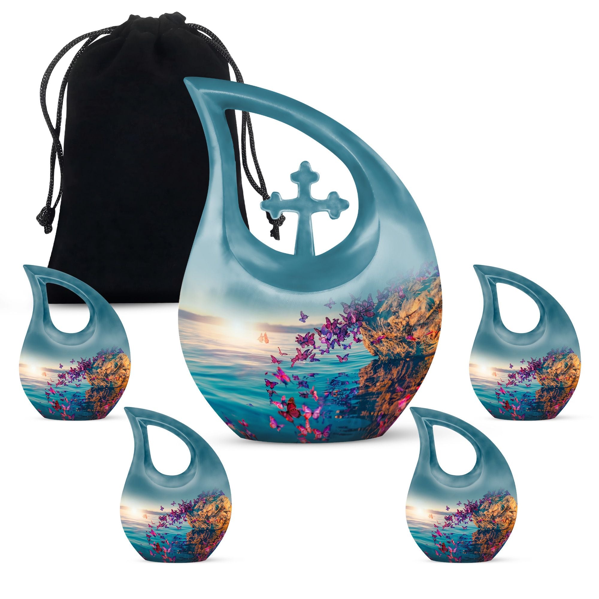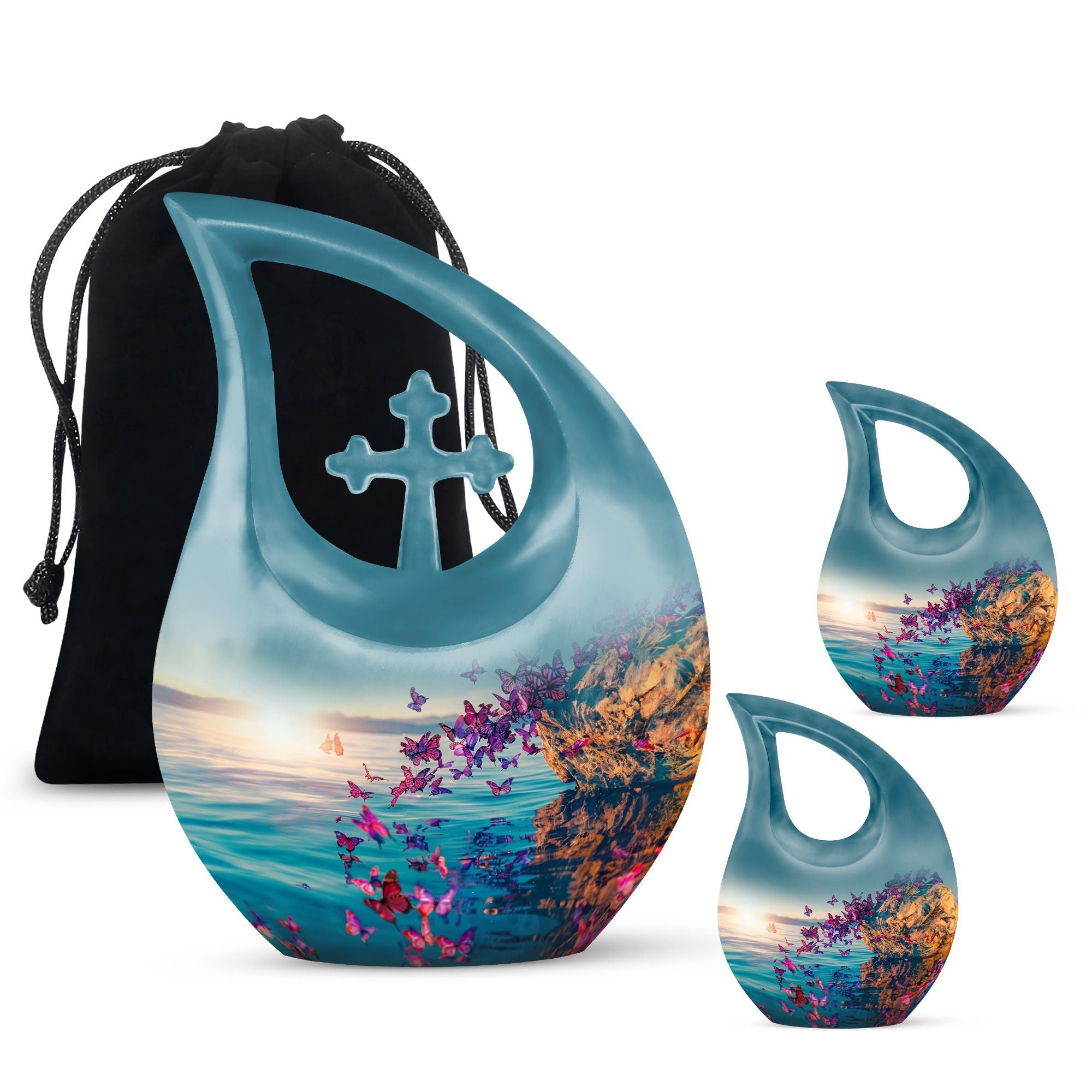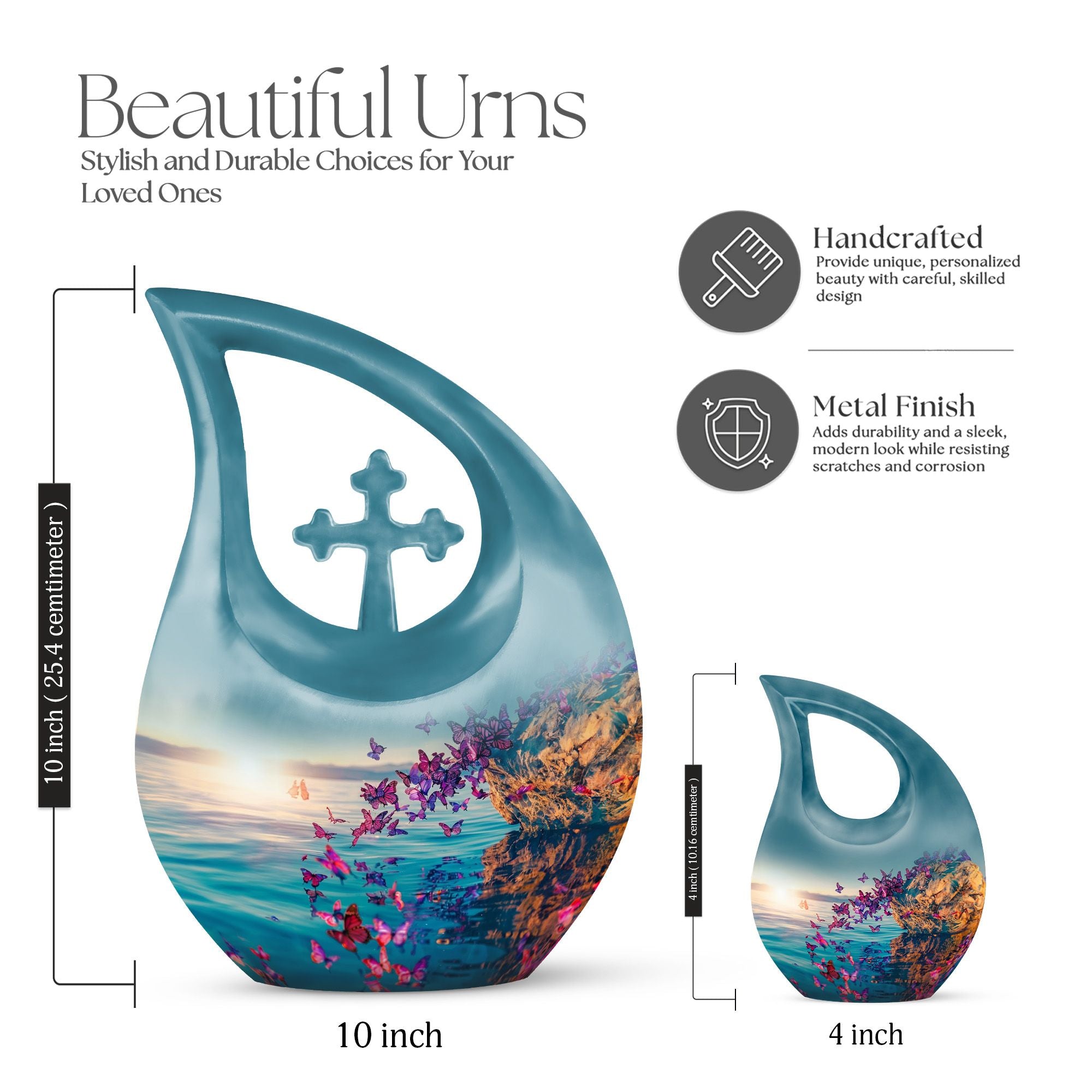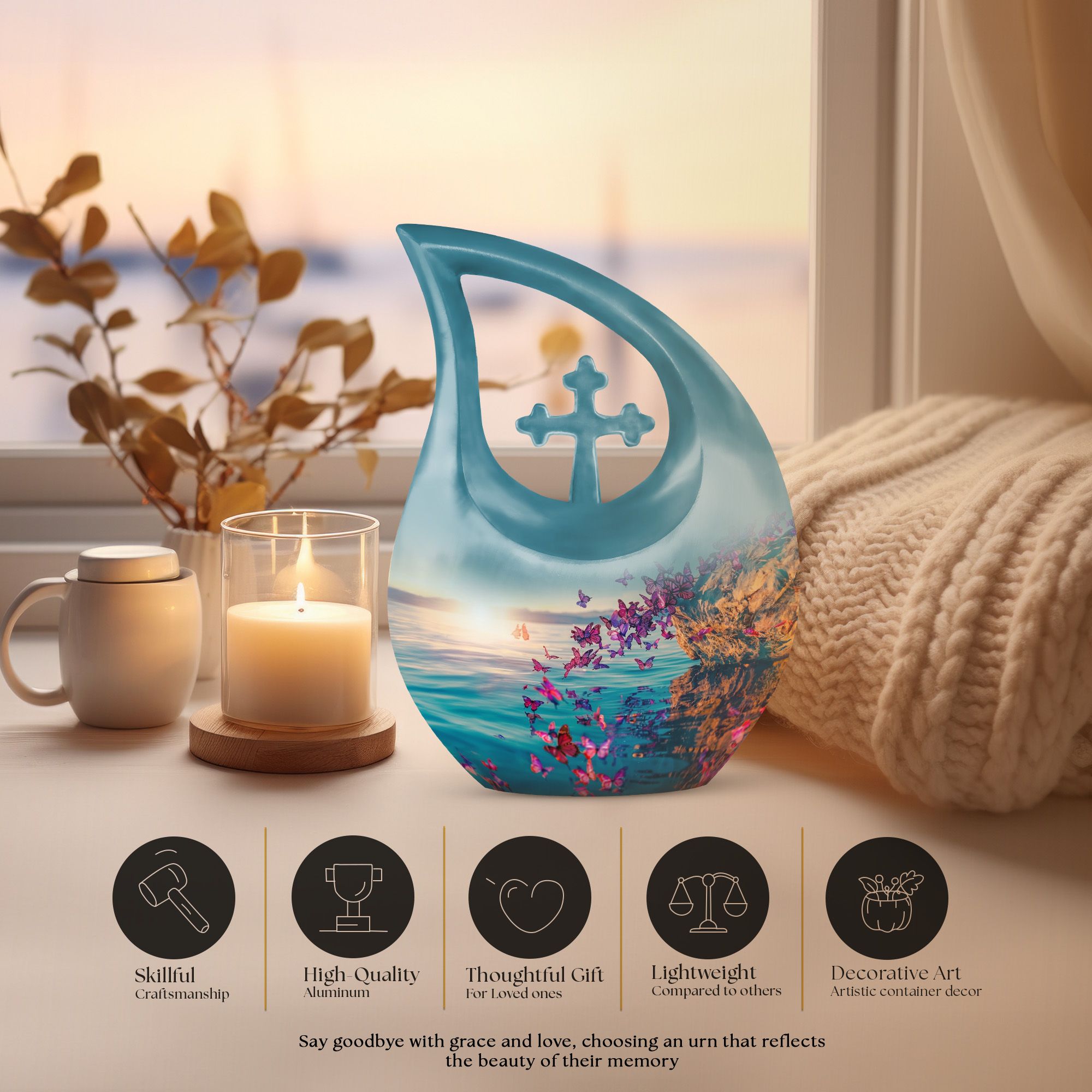 The Pink Butterflies Cremation Urn – Ocean Funeral Urn is a beautifully handcrafted memorial urn designed to honor a loved one. Featuring delicate pink butterflies soaring above a serene ocean scene, this urn symbolizes transformation, peace, and eternal remembrance. It serves as a dignified funeral urn for ashes, combining elegance with heartfelt tribute.