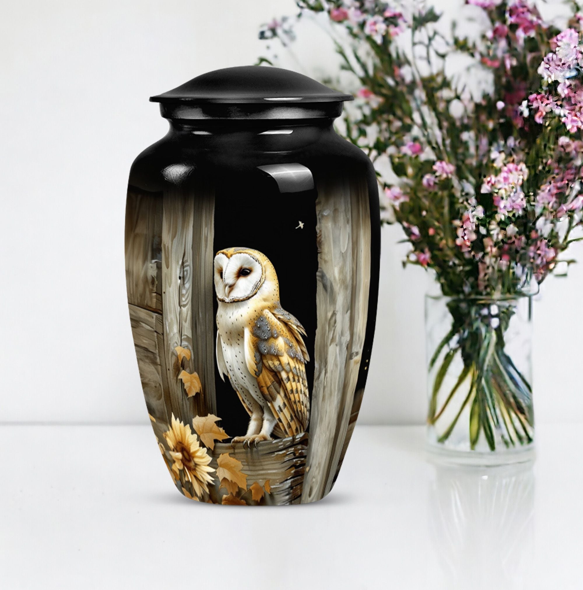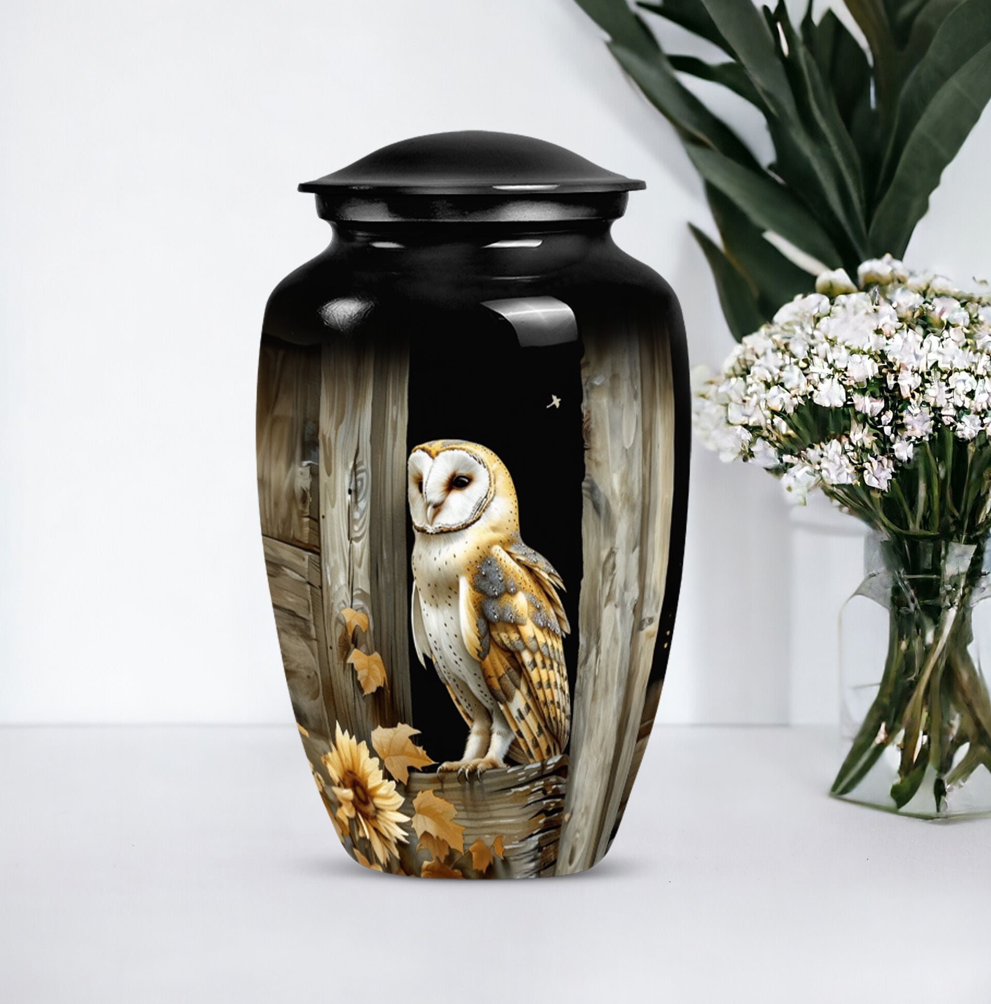 Experience a profound sense of respect and peace with our Barn Owl Urn, a beautiful burial urn for ashes adult. This high-end cremation urn stands magnificently at a size of 10 inch, offering a stylish abode for your loved one's eternal rest. Crafted from durable aluminium, it is meticulously designed in a classic urn style emphasizing abstract themes, adding a unique touch to its elegance. It's spacious, boasting a capacity of 200 cubic inches and is quite sturdy with a weight of 3.3 pounds. Your package includes a plush velvet pouch for containment of ashes. Further enhance the value of this rich tribute to your dear one with our customization services that allow you to personalize with engraved names. Perfect for large urns requirements, this memorial adult urn showcases the perfect blend of aesthetics and sentiment, making it ideal for adult burial or as a loving cremation urn for dad. This unique urn certainly stands out from common cremation urns for ashes for adult humans.