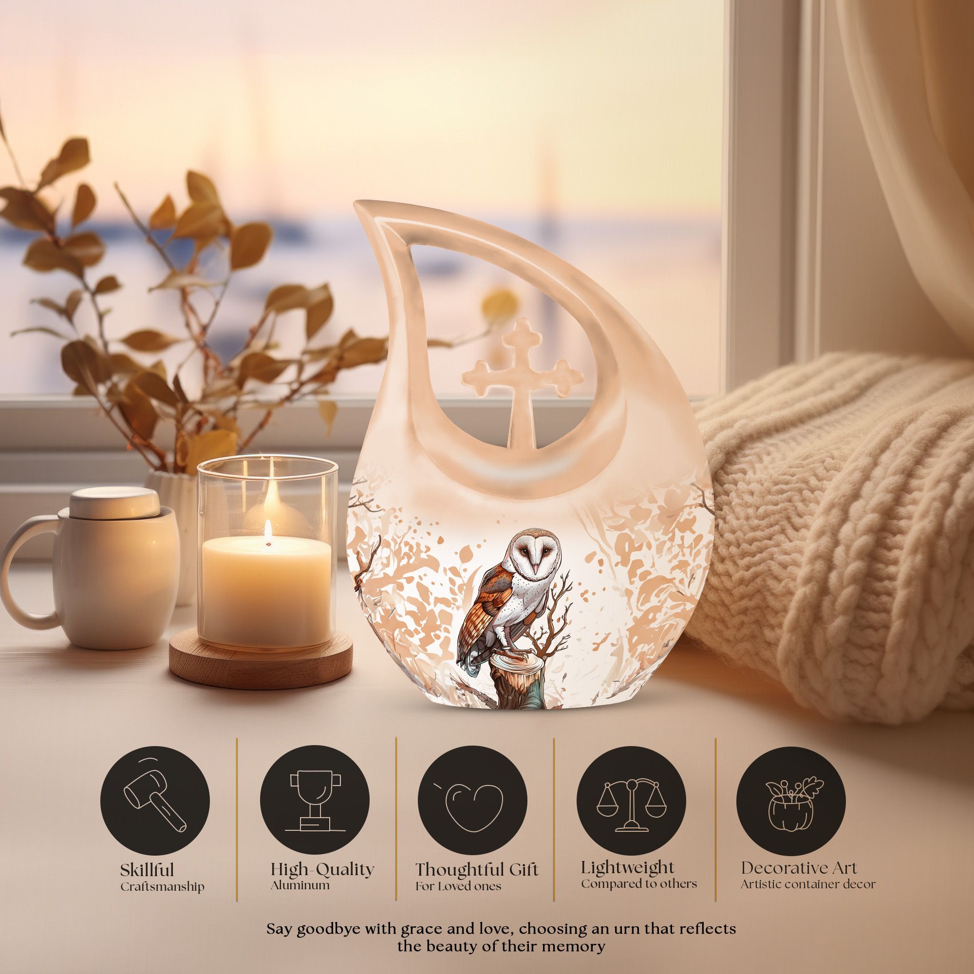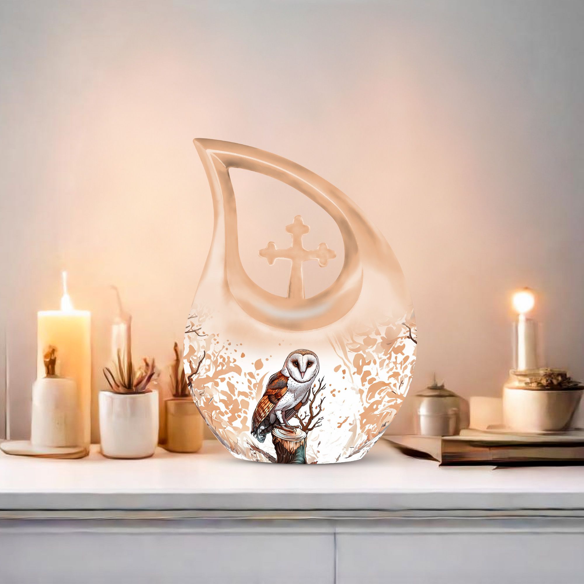 Handmade from durable aluminium, this urn features a calming barn owl design with soft, natural details. Ideal for families needing mini cremation urns for human ashes or small cremation urns, it ensures security with a threaded lid and lasting beauty through its fine craftsmanship. Its compact yet meaningful design supports cremation urn human ashes needs and pairs beautifully with cremation keepsake urn options for shared remembrance. As part of adult cremation urns, it remains reliable and elegant for long-term memorial use.