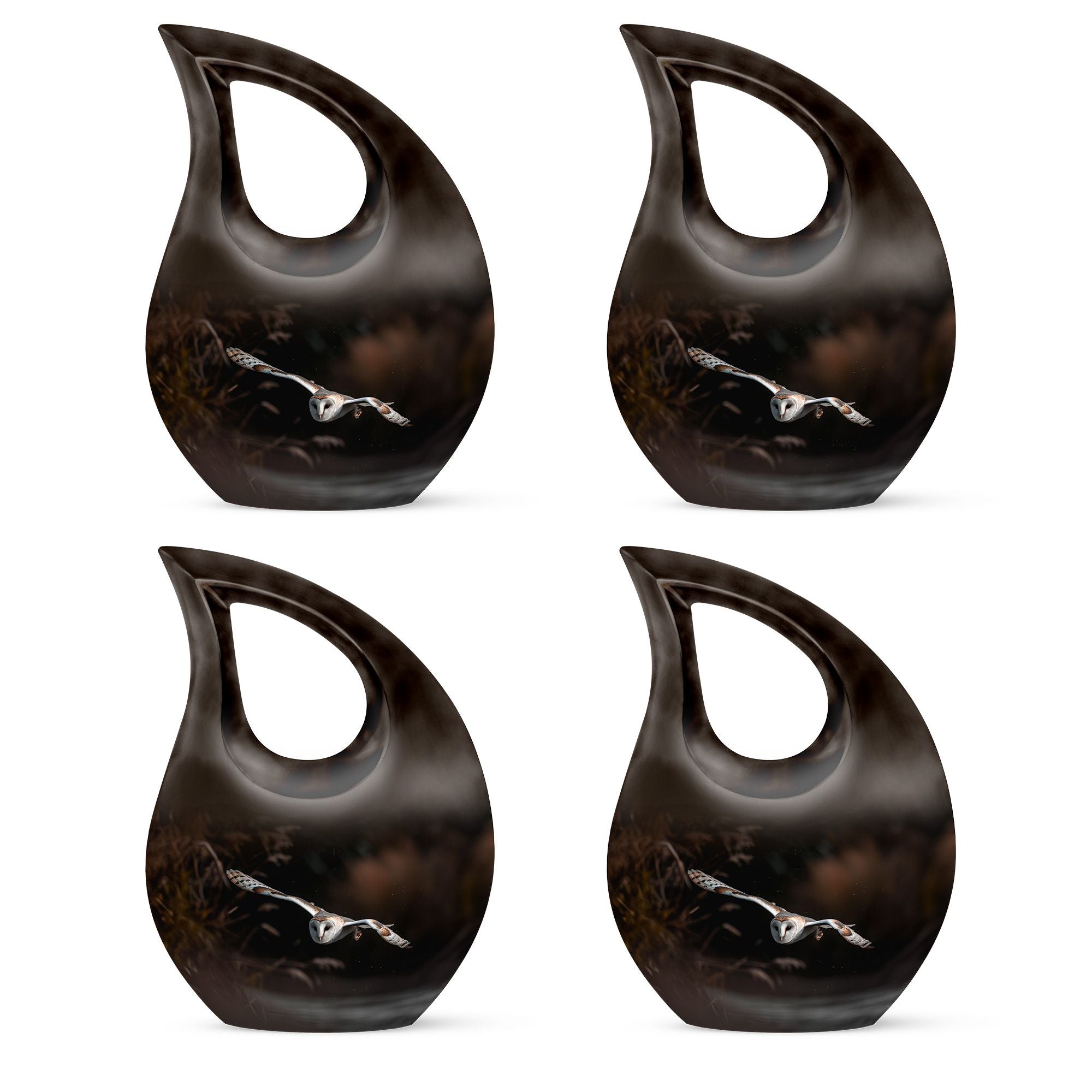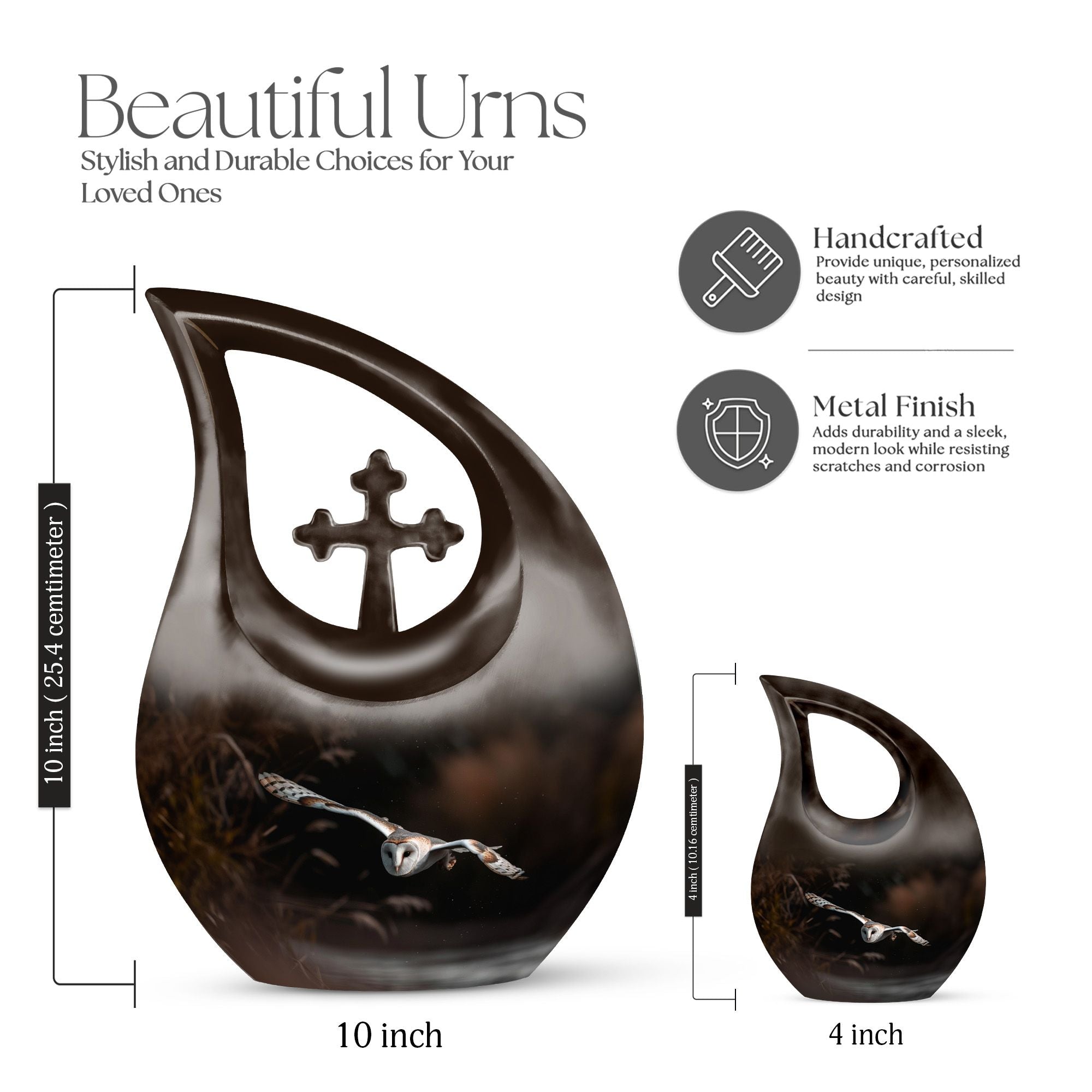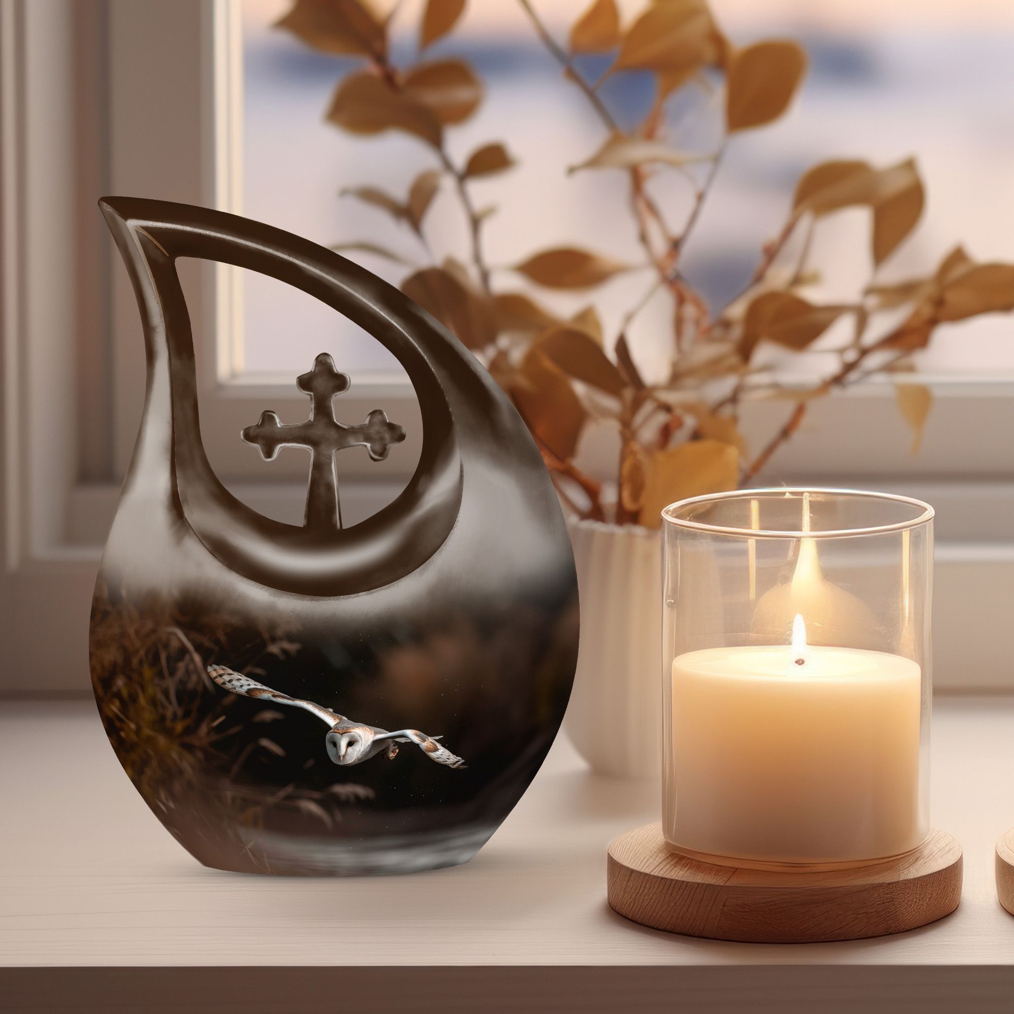 Handcrafted from durable aluminium, this 10-inch urn blends elegant design with secure functionality. The detailed barn owl motif and smooth finish create a timeless memorial suitable for any home or ceremonial setting. Whether chosen as an urn for human ashes adult women, a memorial piece for men, or part of adult urns for women collections, it ensures protection with its threaded screw-top lid. It also pairs beautifully with small urns for women human ashes for shared remembrance.