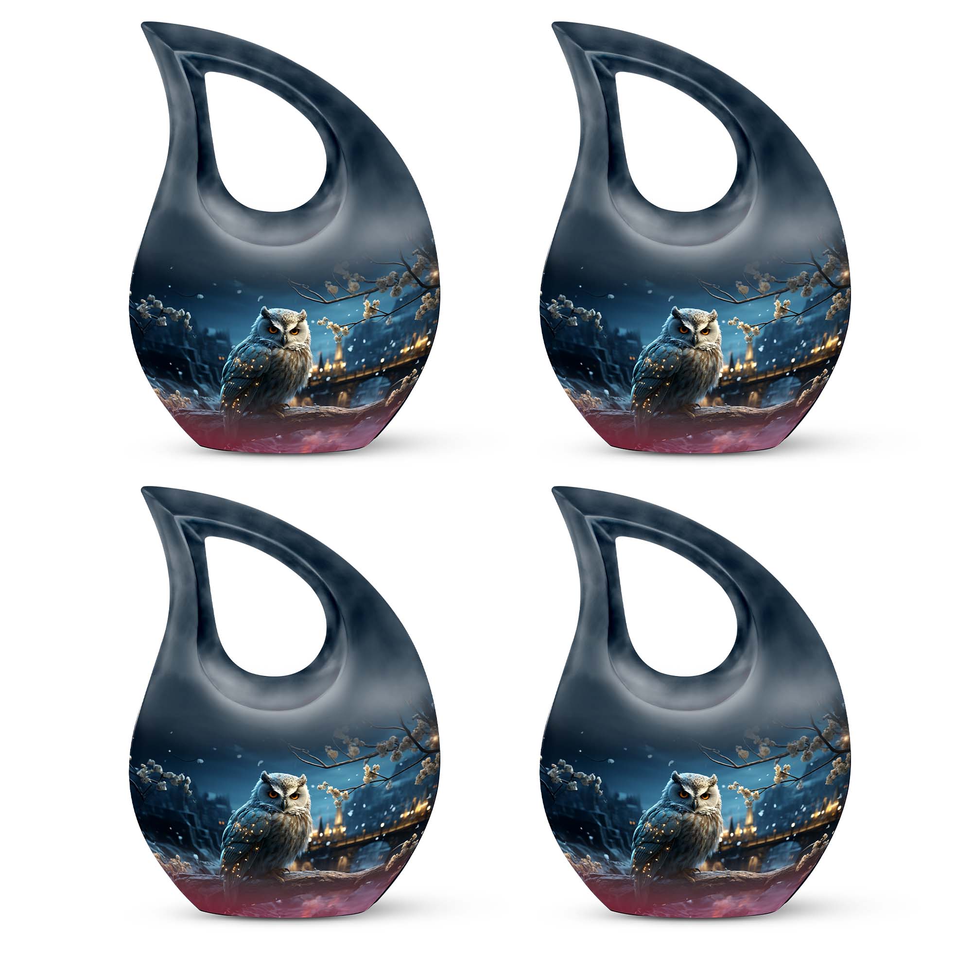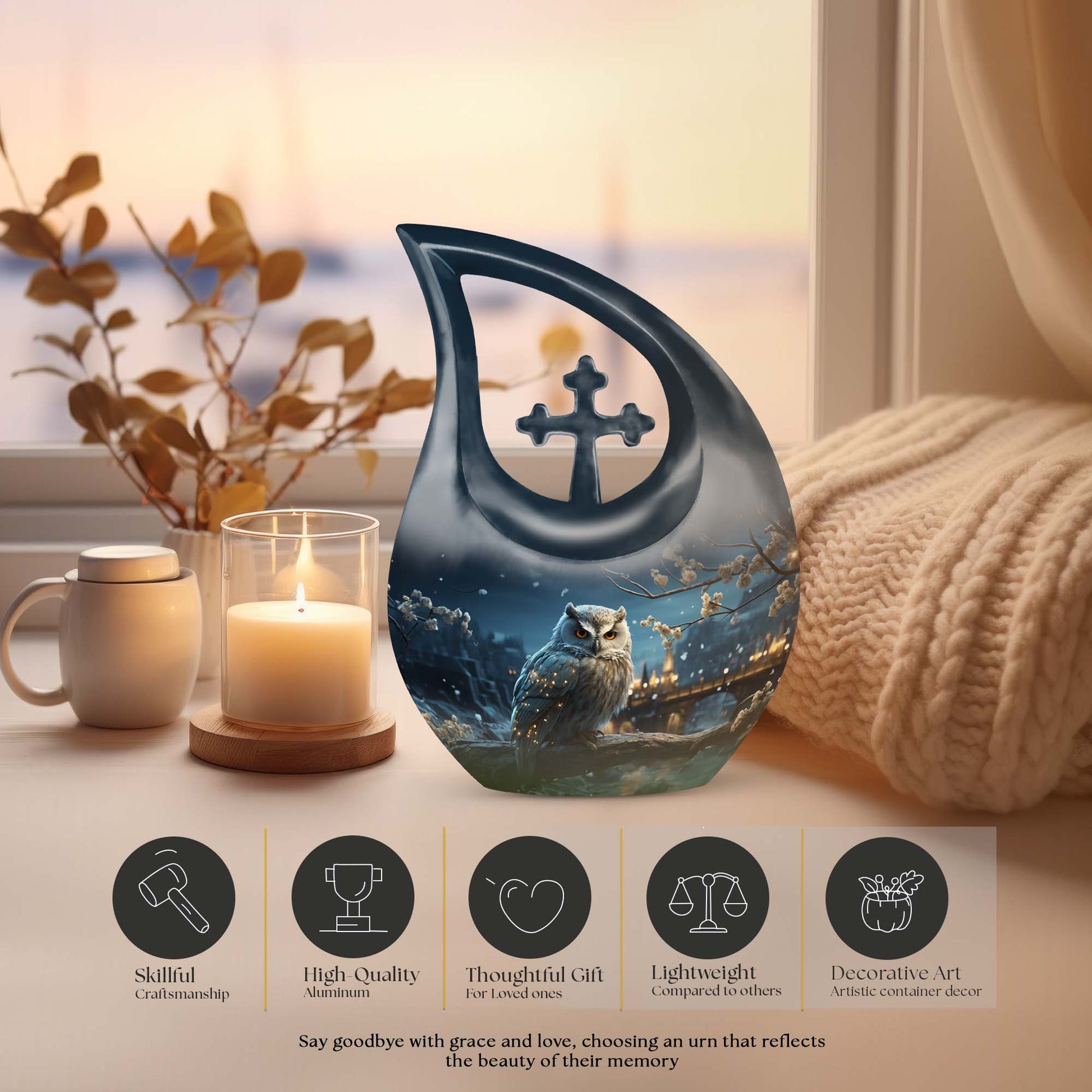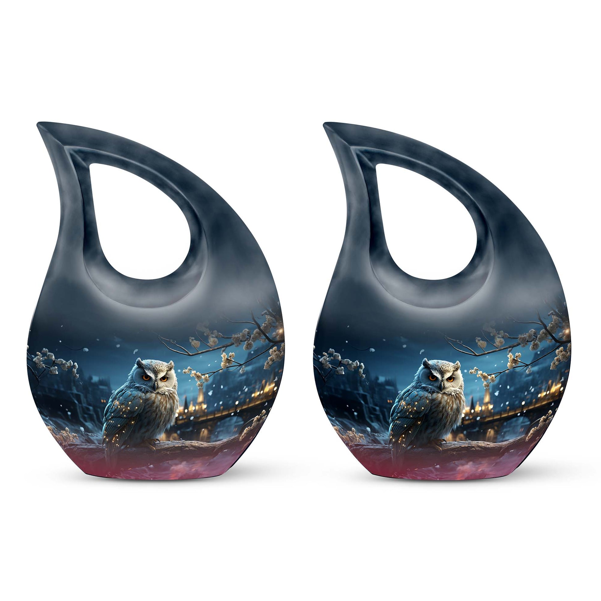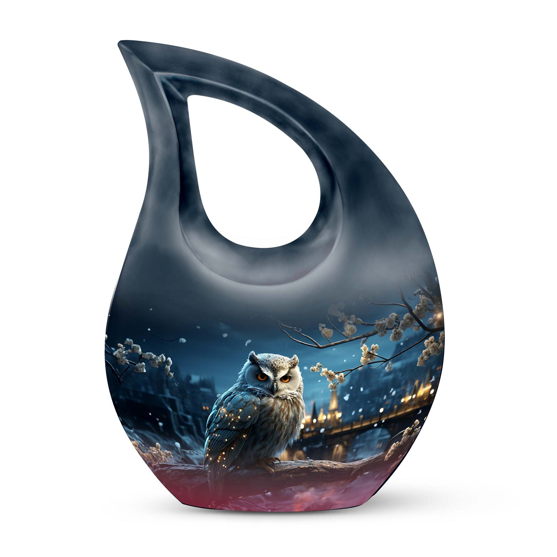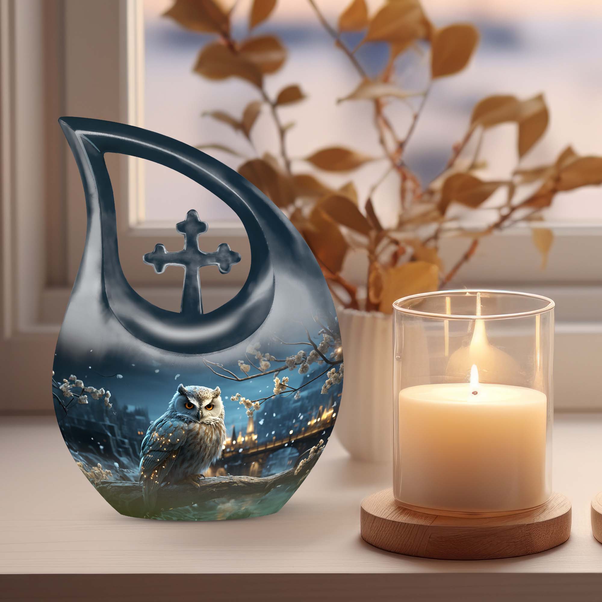 Crafted from high-quality aluminum, this snowfall large sized urn combines elegance and strength. Its smooth white surface glows under light, while the detailed owl engraving represents guidance and everlasting connection. Perfect for display at home or use as a burial urn, this piece stands among the most beautiful urns women and men urns for human ashes, offering timeless remembrance.