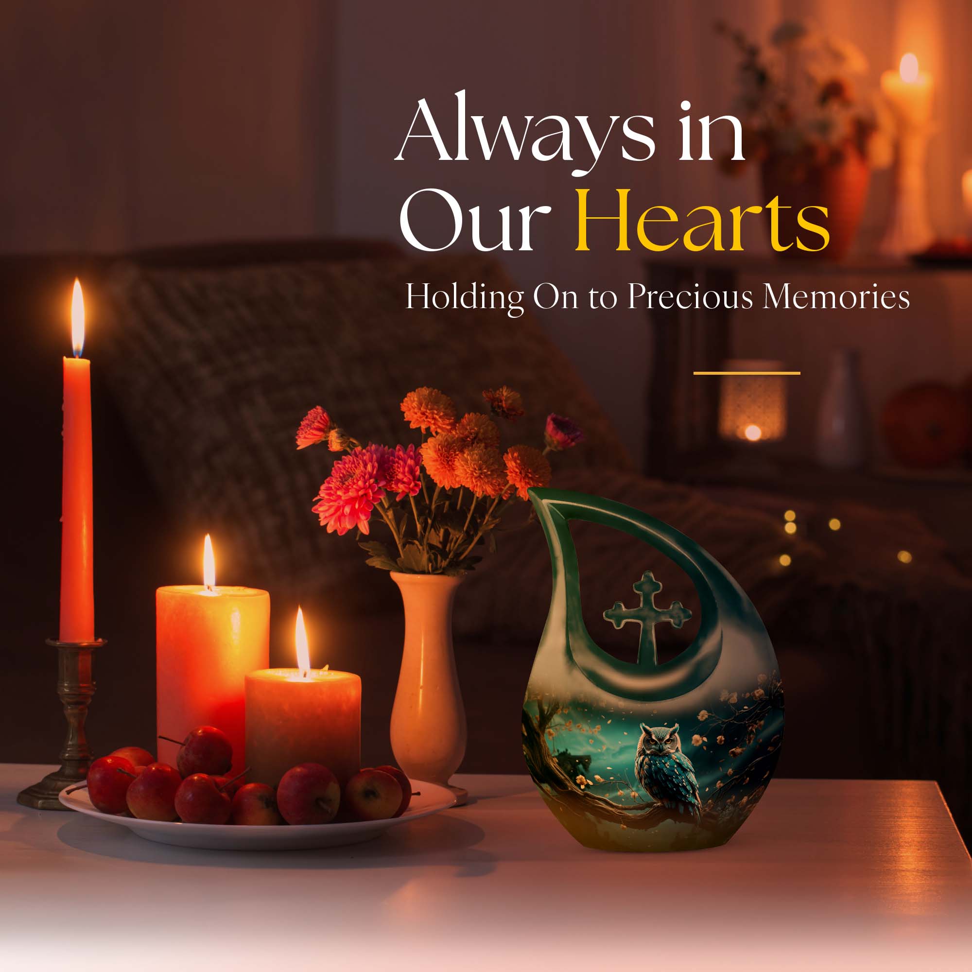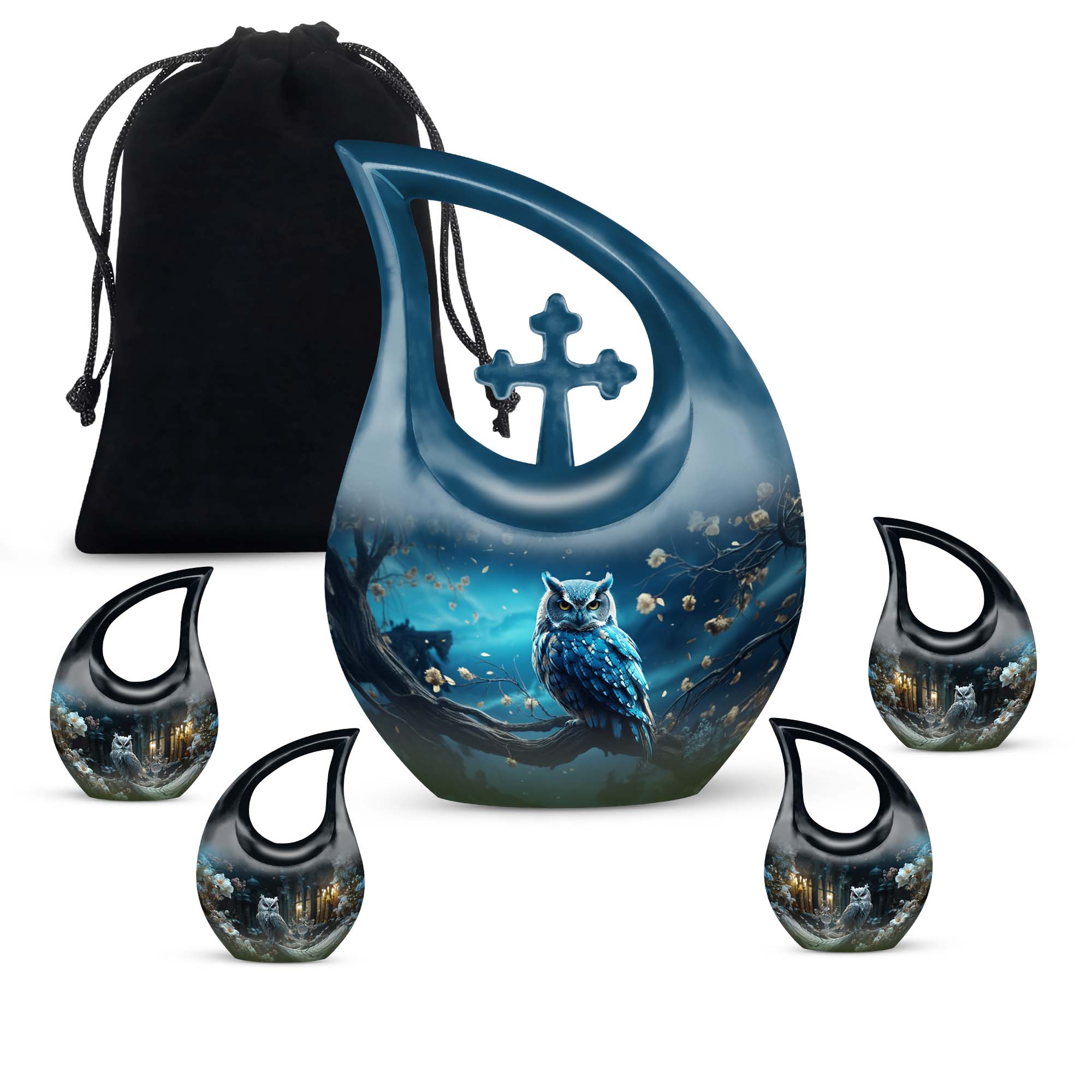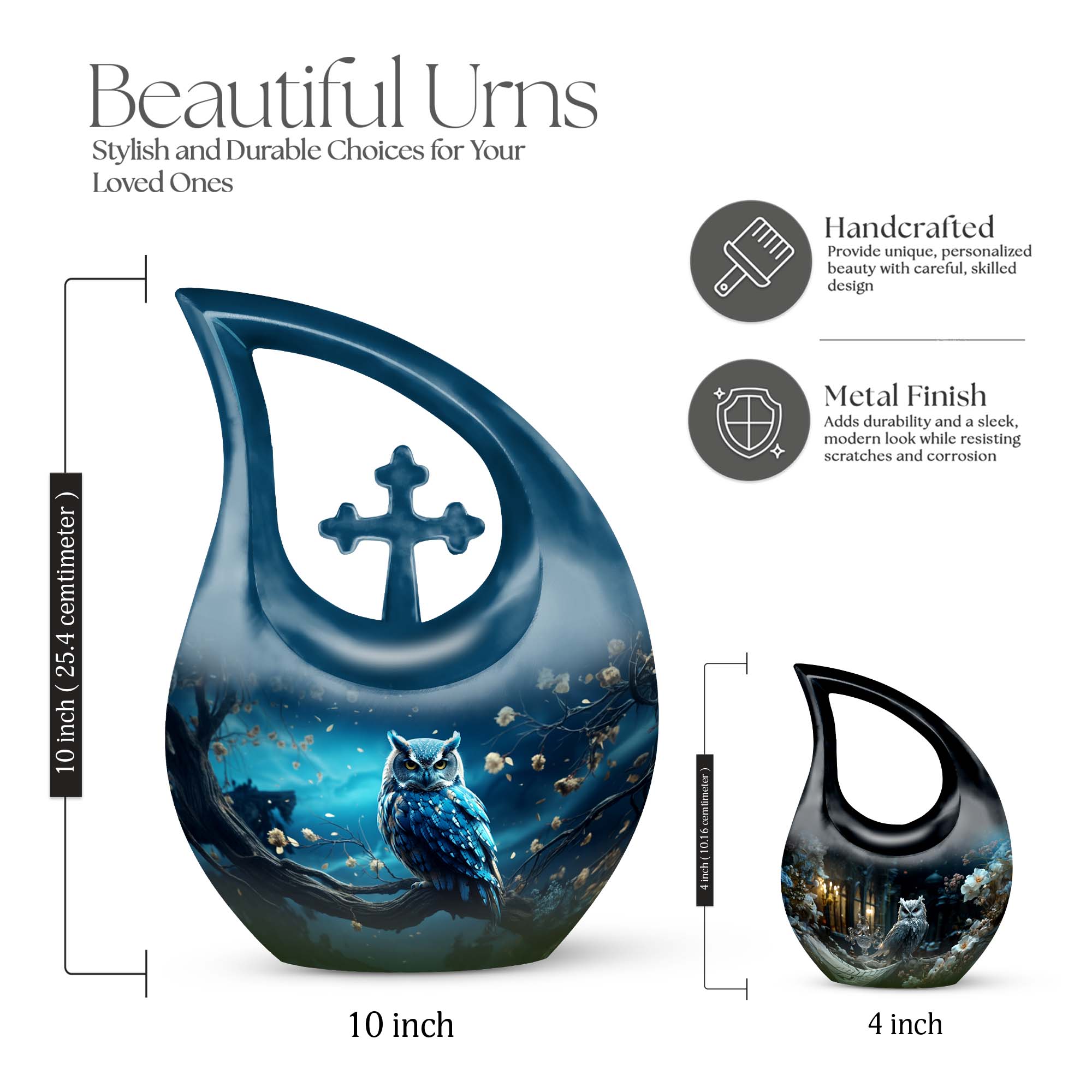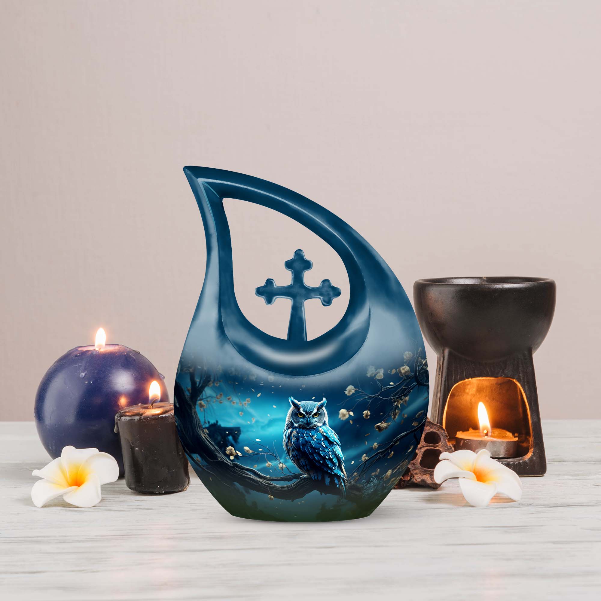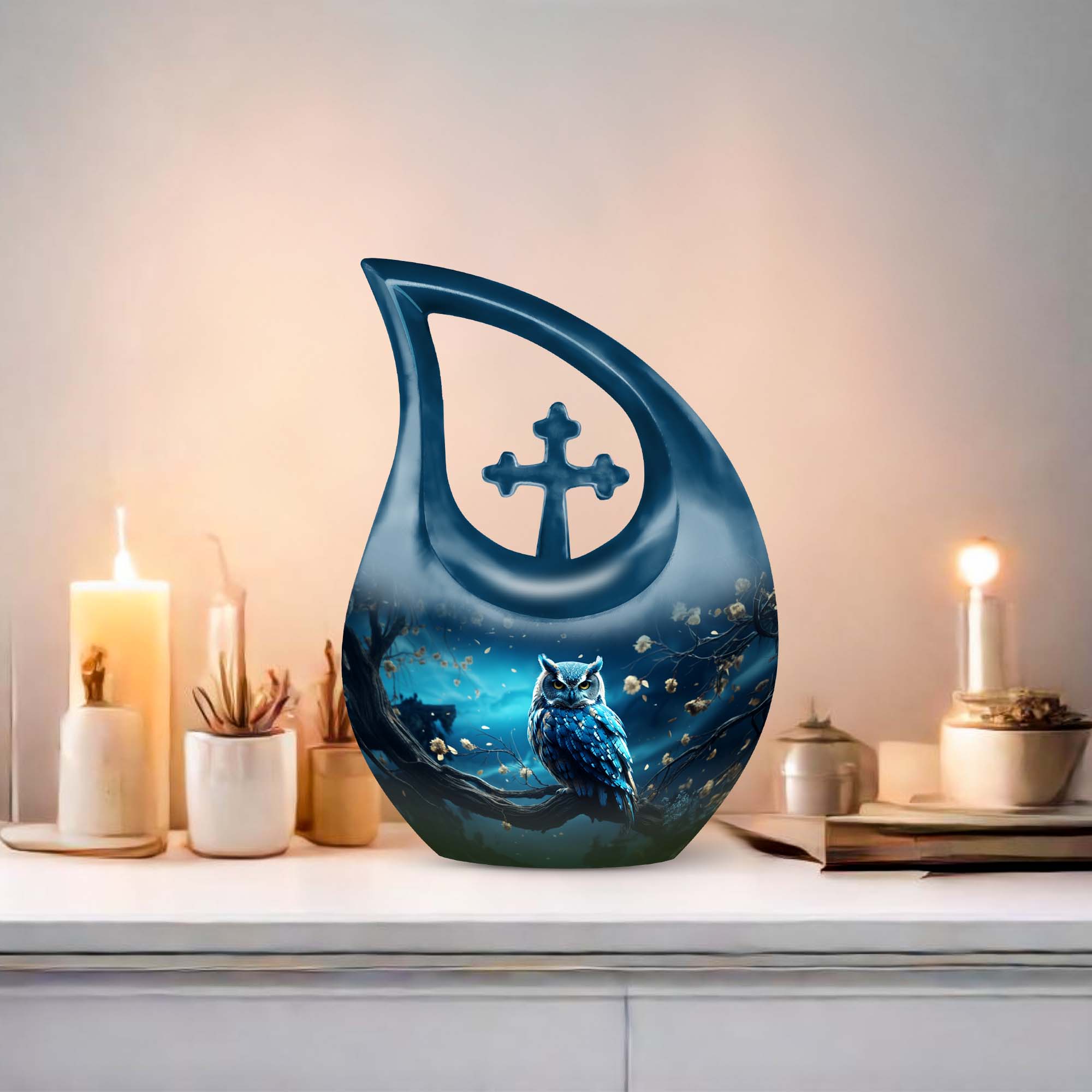 Expertly handcrafted from high-quality aluminum, this large decorative urn for human ashes showcases a deep blue night motif adorned with a majestic owl, symbolizing guidance and protection. The smooth finish and graceful shape make it suitable as both cremation urns for men and cremation urns for women, offering a perfect balance of strength and serenity. Ideal for home display or as a funeral urn for adult ashes men, it captures timeless beauty and peace.