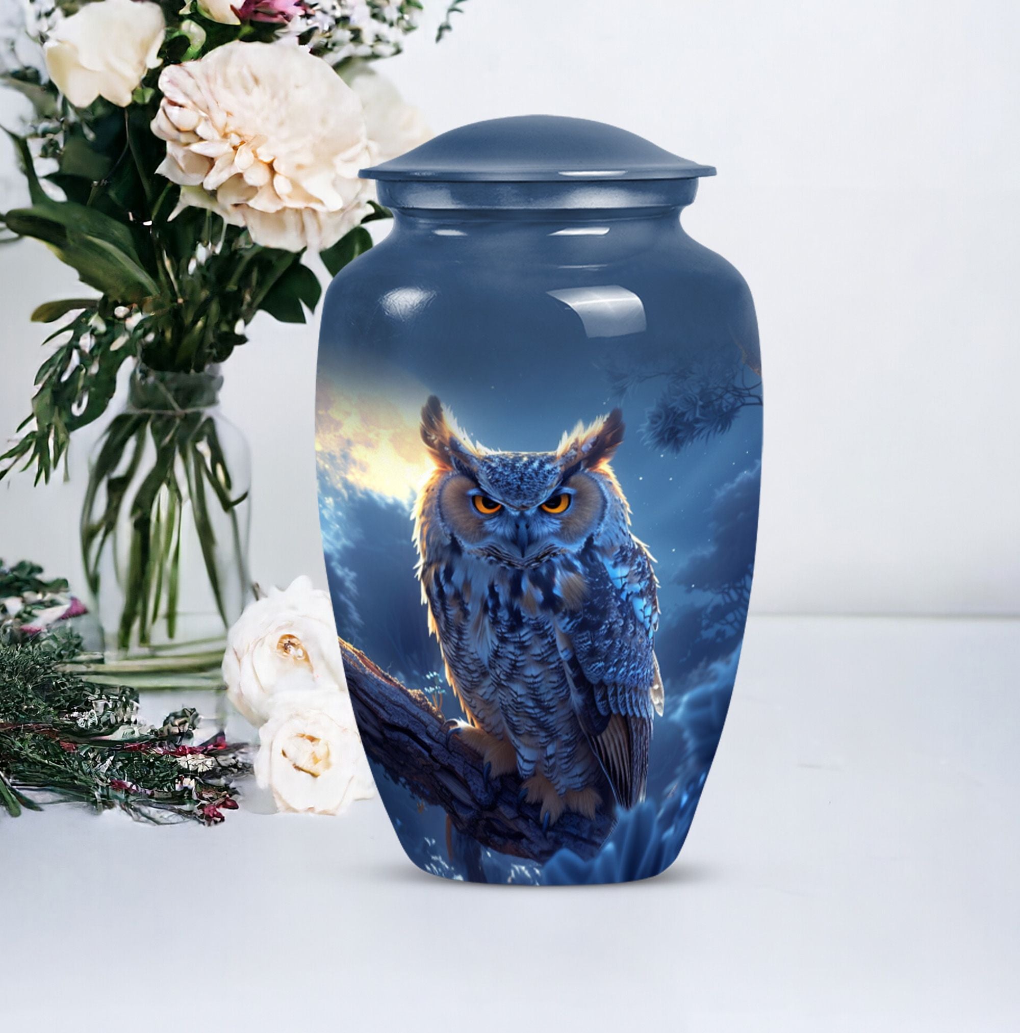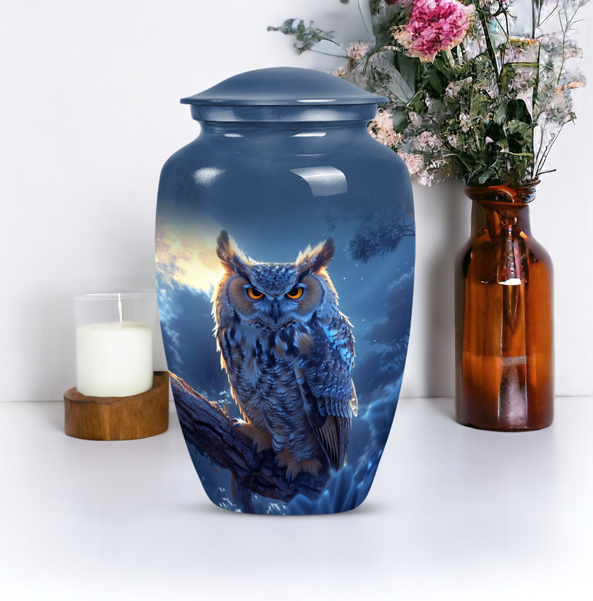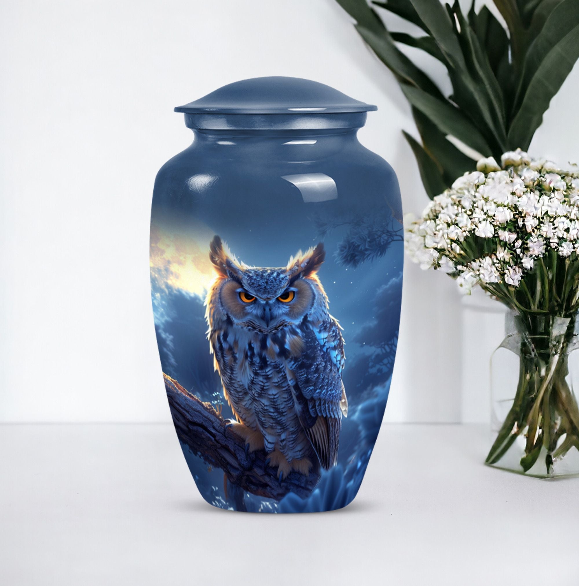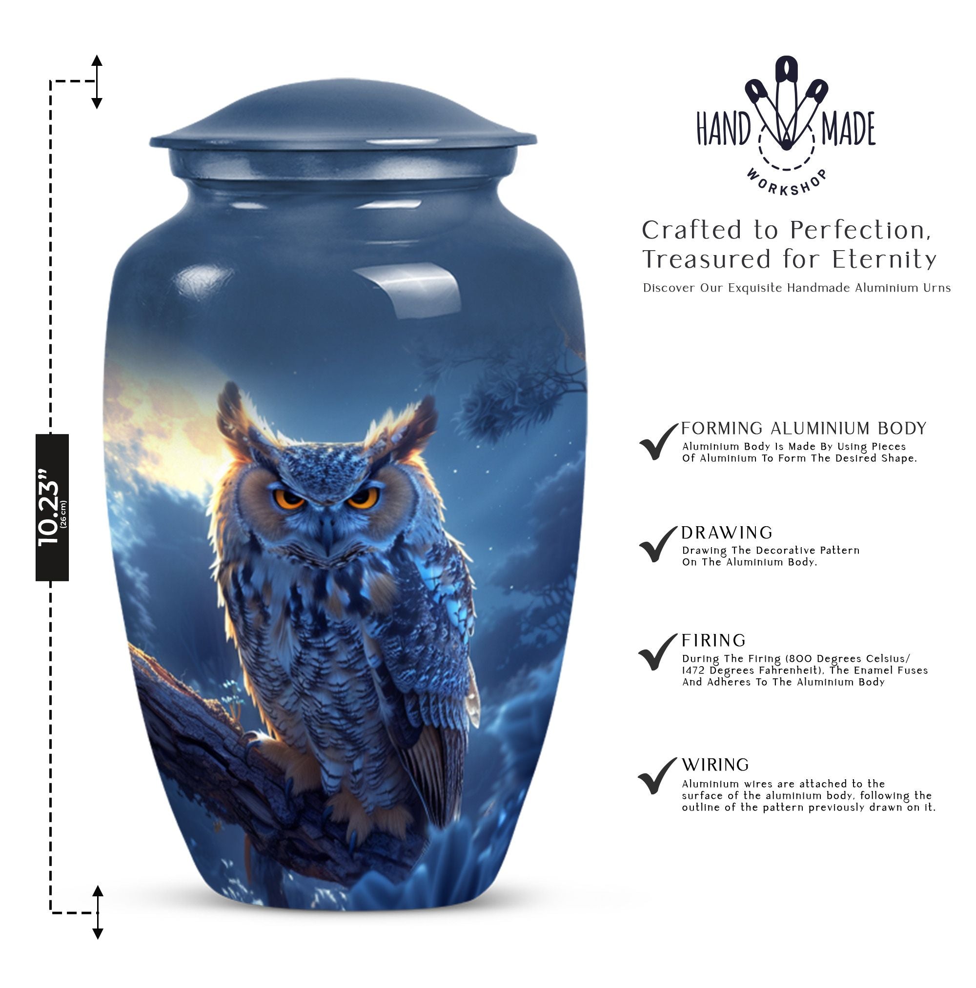 Exuding a tasteful blend of abstract theme and subtle intricacy, this 10-inch large owl urn seamlessly captures the essence of a lost loved one. Crafted with expert precision using premium aluminium, the urn weighs a solid 3.3 pounds and is characterized by exceptional durability. With a capacity to hold up to 200 cubic inches of ashes, it's perfectly suited for both adult male and female needs. What sets this funeral urn apart is the unique customization feature, allowing for personalized engraved names, giving a heartfelt nod to the departed's legacy. Should you need to transport, it comes complete with a velvet pouch guaranteeing safe containment of the ashes. This cremation urn is more than just a box; it's a poignant homely abode celebrating the memory of loved ones in the most respectful, dignified manner. Whether you seek an urn for mom, or looking for a burial urn infused with profound symbolism, this large owl urn stands as a testimony to undying remembrance.