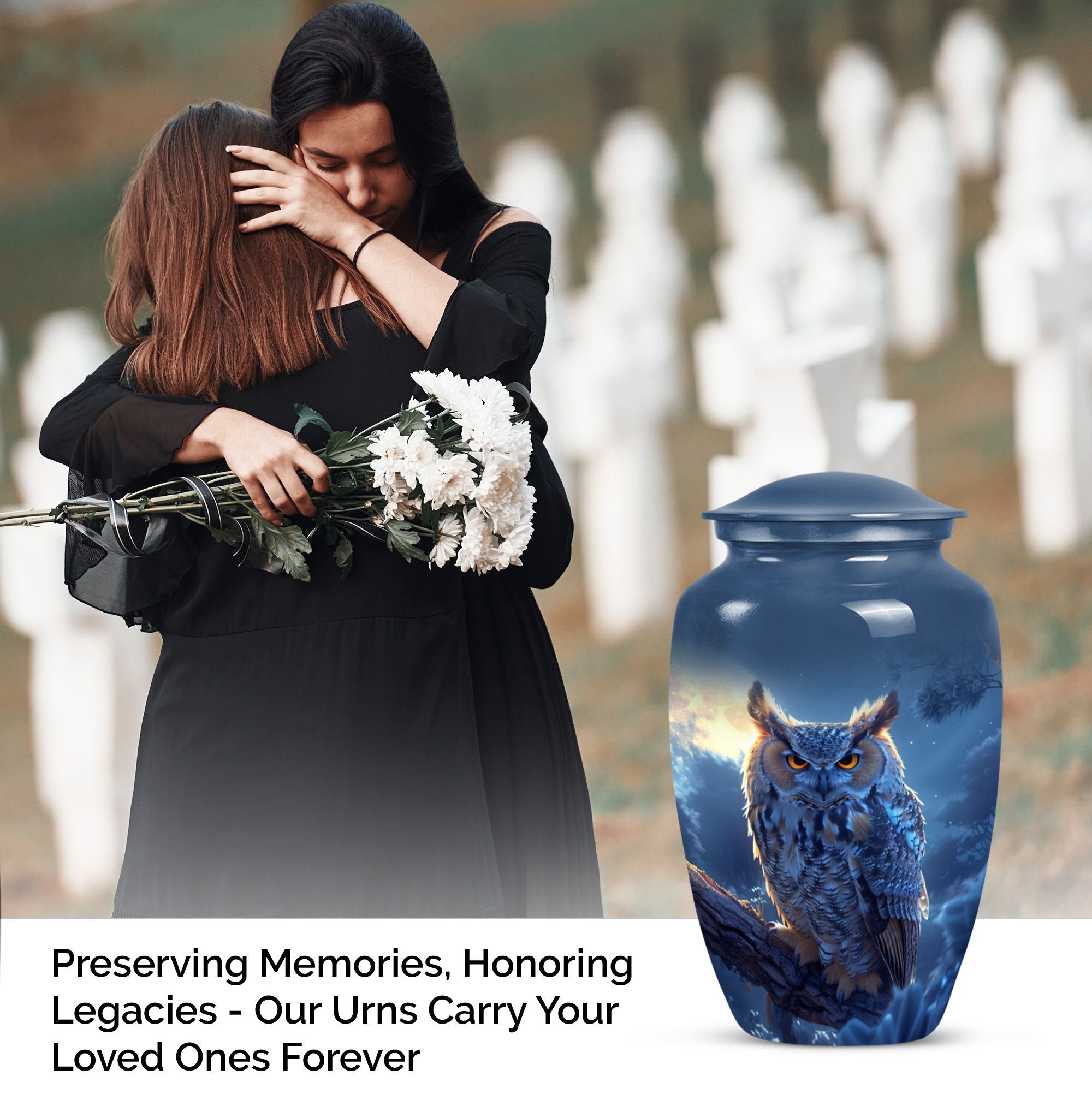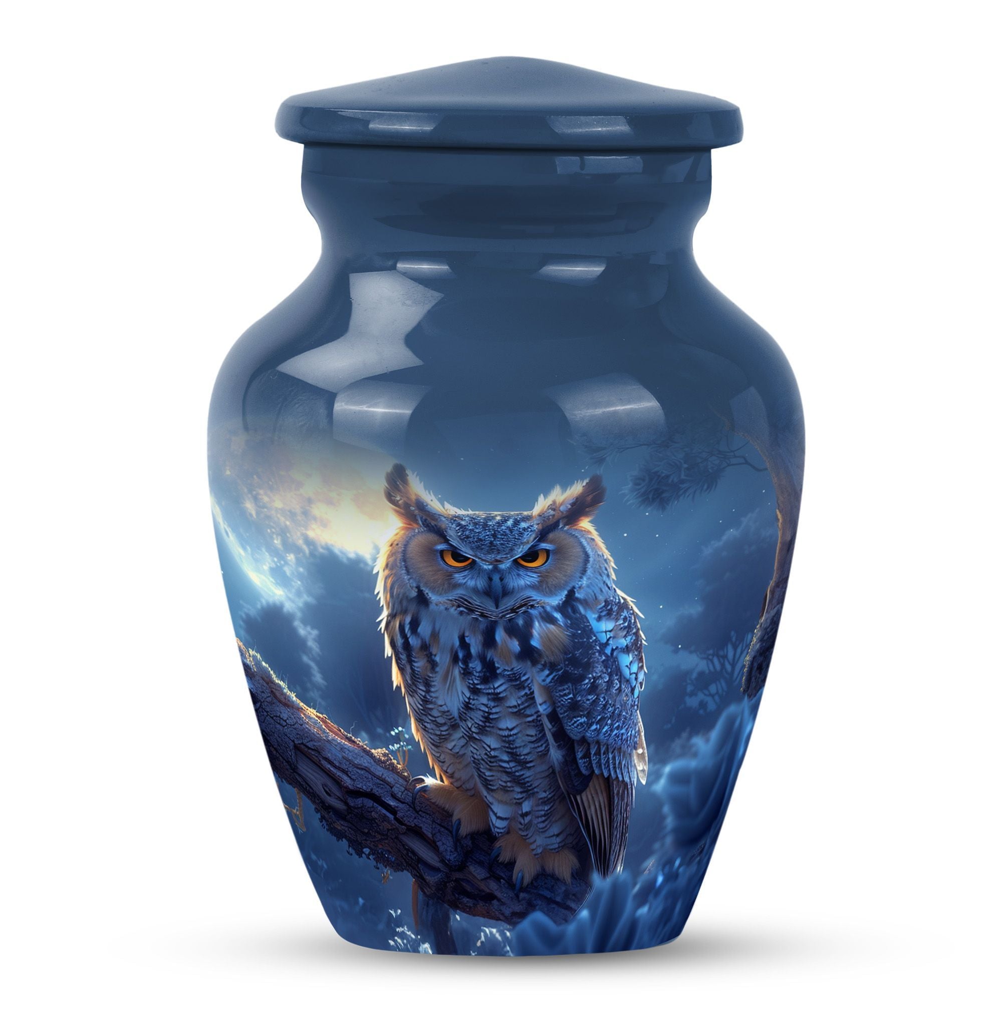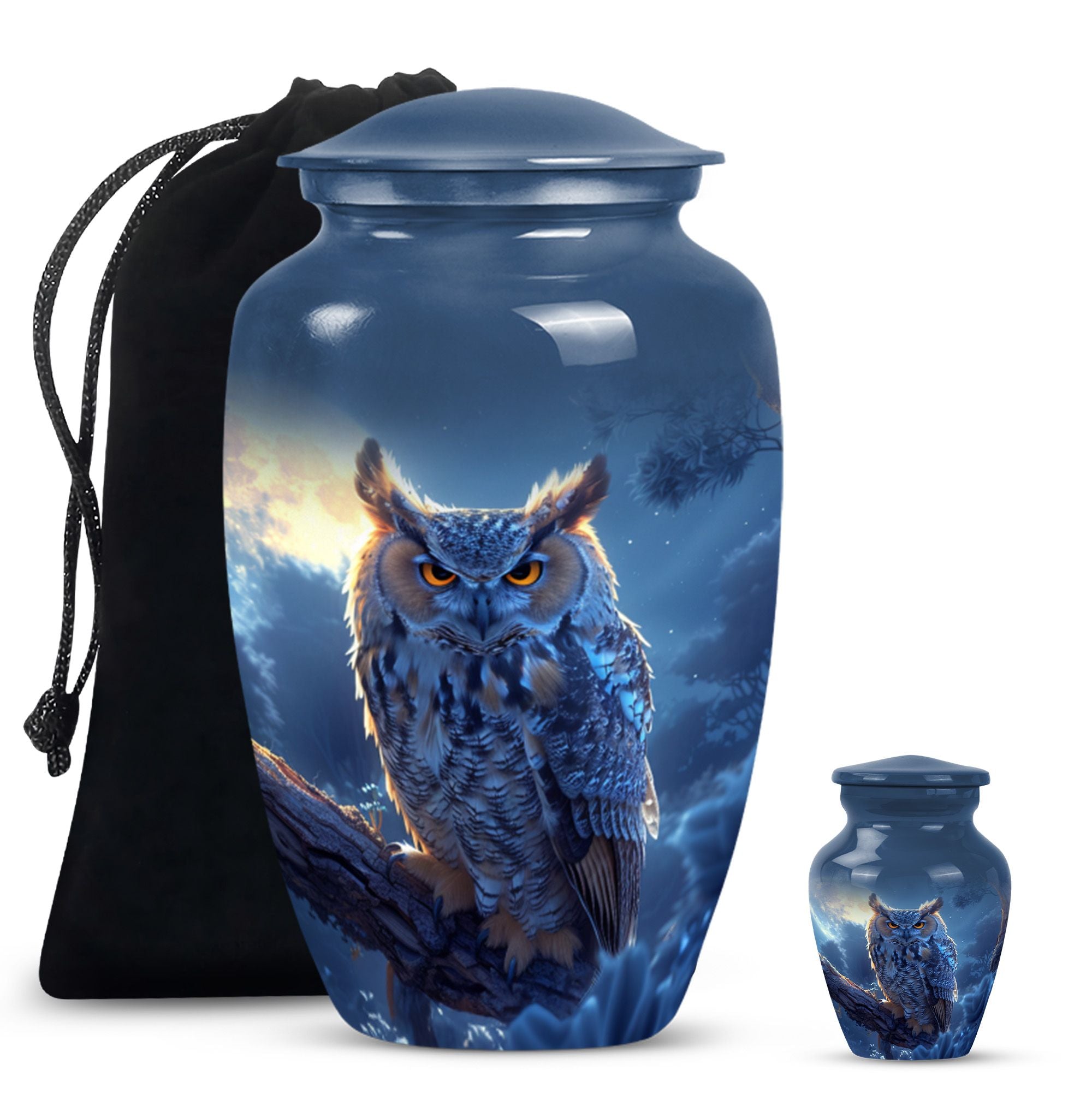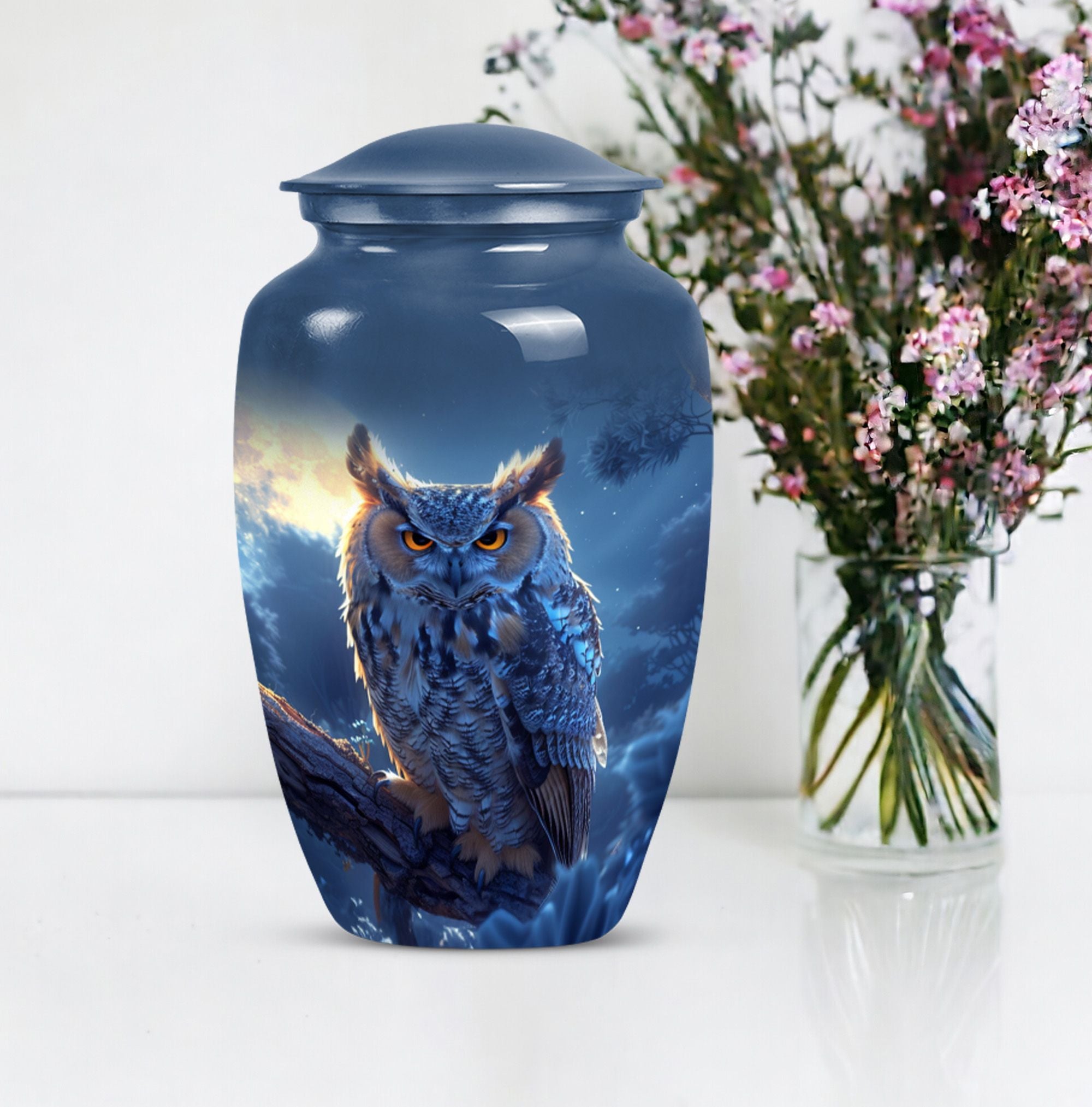 Exuding a tasteful blend of abstract theme and subtle intricacy, this 10-inch large owl urn seamlessly captures the essence of a lost loved one. Crafted with expert precision using premium aluminium, the urn weighs a solid 3.3 pounds and is characterized by exceptional durability. With a capacity to hold up to 200 cubic inches of ashes, it's perfectly suited for both adult male and female needs. What sets this funeral urn apart is the unique customization feature, allowing for personalized engraved names, giving a heartfelt nod to the departed's legacy. Should you need to transport, it comes complete with a velvet pouch guaranteeing safe containment of the ashes. This cremation urn is more than just a box; it's a poignant homely abode celebrating the memory of loved ones in the most respectful, dignified manner. Whether you seek an urn for mom, or looking for a burial urn infused with profound symbolism, this large owl urn stands as a testimony to undying remembrance.