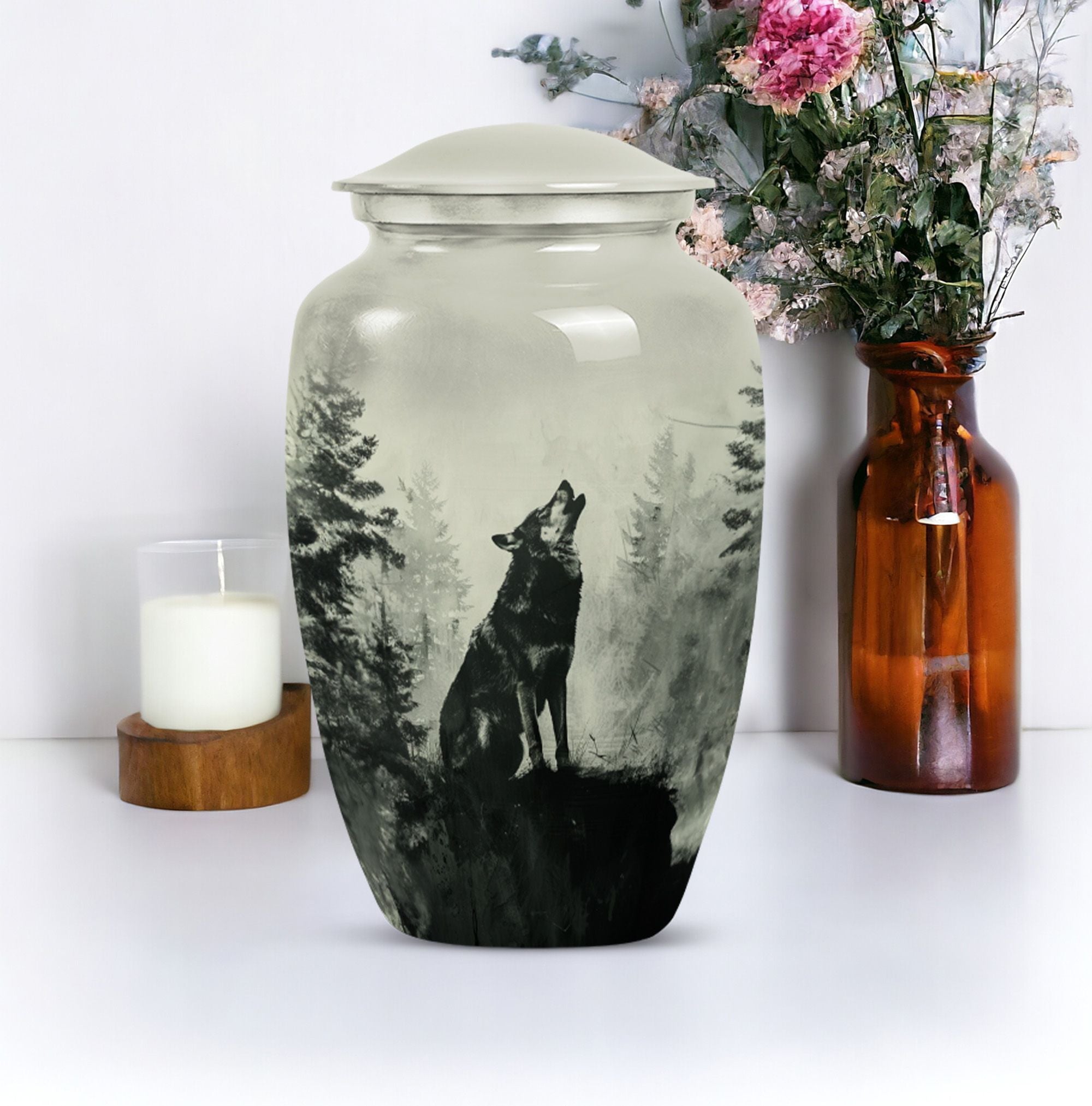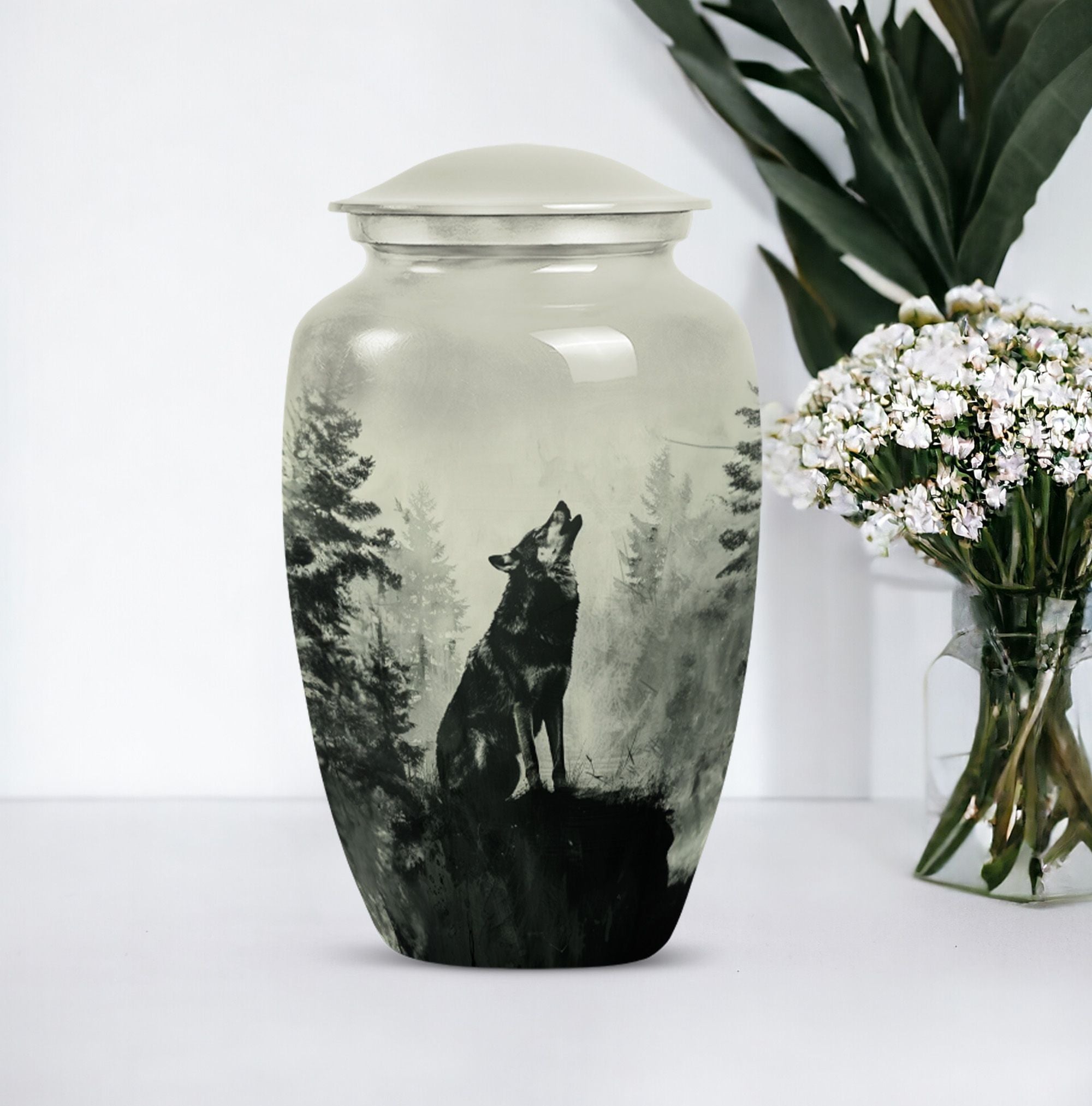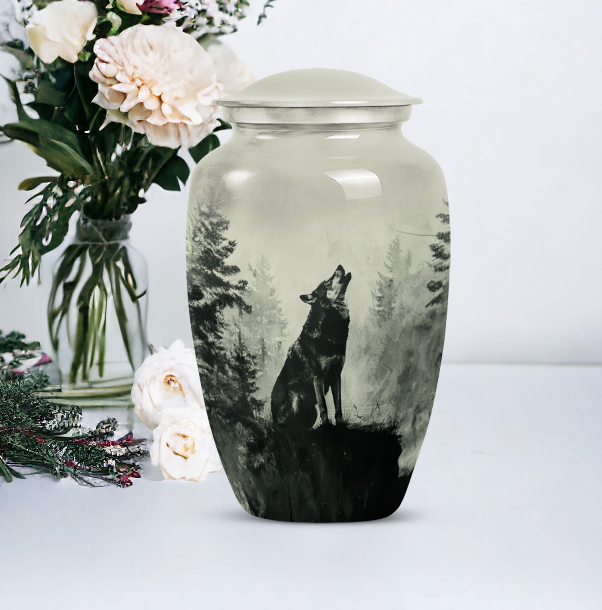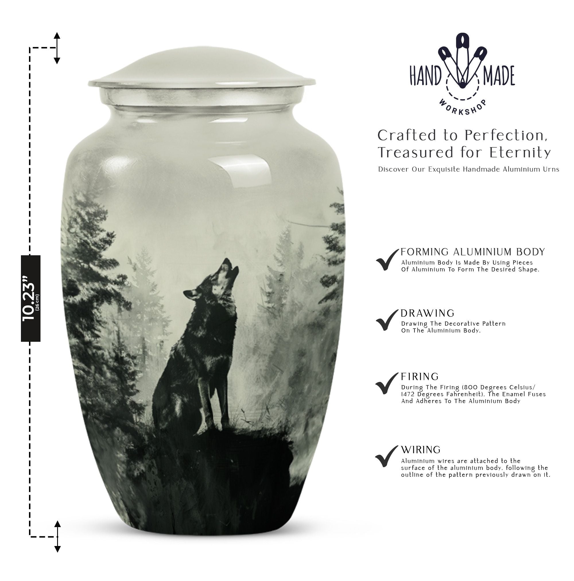 Find solace in memory of your loved ones with our 10 Inch Wolf Howling Urn. This large urn stands as a mesmerizing monument; it's not just an aluminium burial funeral cremation urn, but a piece of art that reflects the aura of your departed. Its classic theme invoking a howling wolf penetrates the heart with a sense of peace and spiritual connection. Weighing at just 3.3 pounds, and with dimensions of 10 inches in height, it can hold up to 200 cubic inches of ashes. In addition, its package includes a velvet pouch for the discreet and respectful containment of ashes. The urn can be customized, allowing you to personalize it with engraved names - making it more than a container, but a profound tribute. Please note that the design does not come into play here. Also popular as decorative urns for home, they're not just for adult male ashes but can also gracefully hold the ashes of a woman too. Remember your loved ones in a unique and spiritual way with our wolf howling urns, a cherished focal point in any memorial setting.