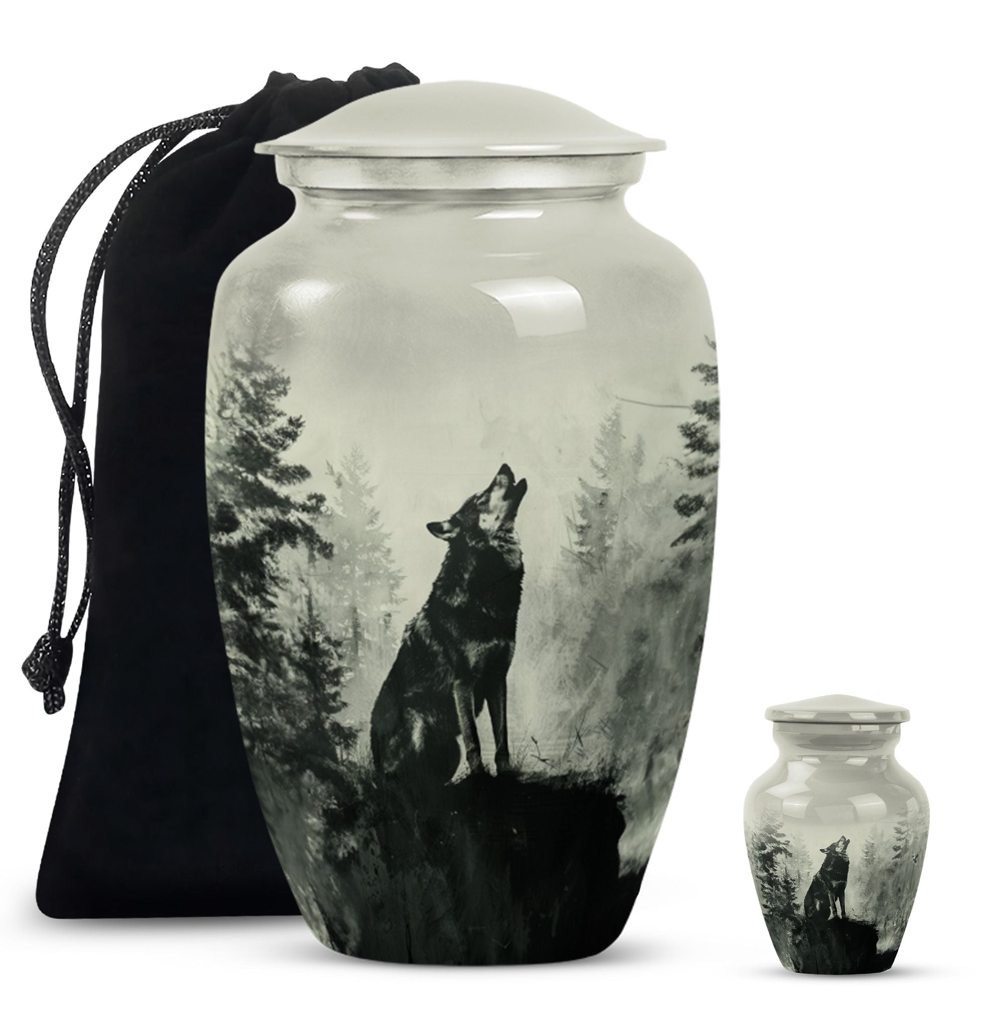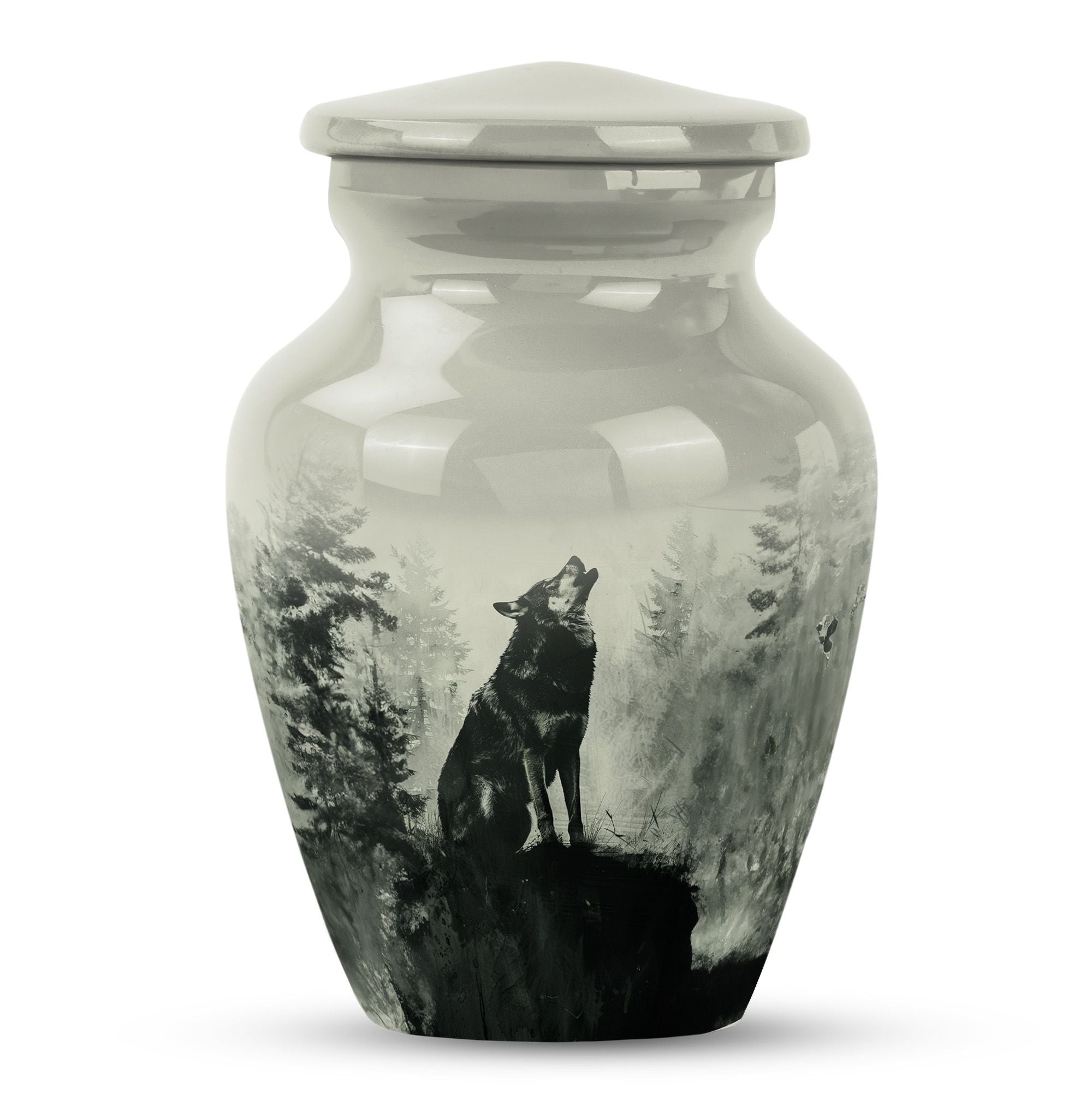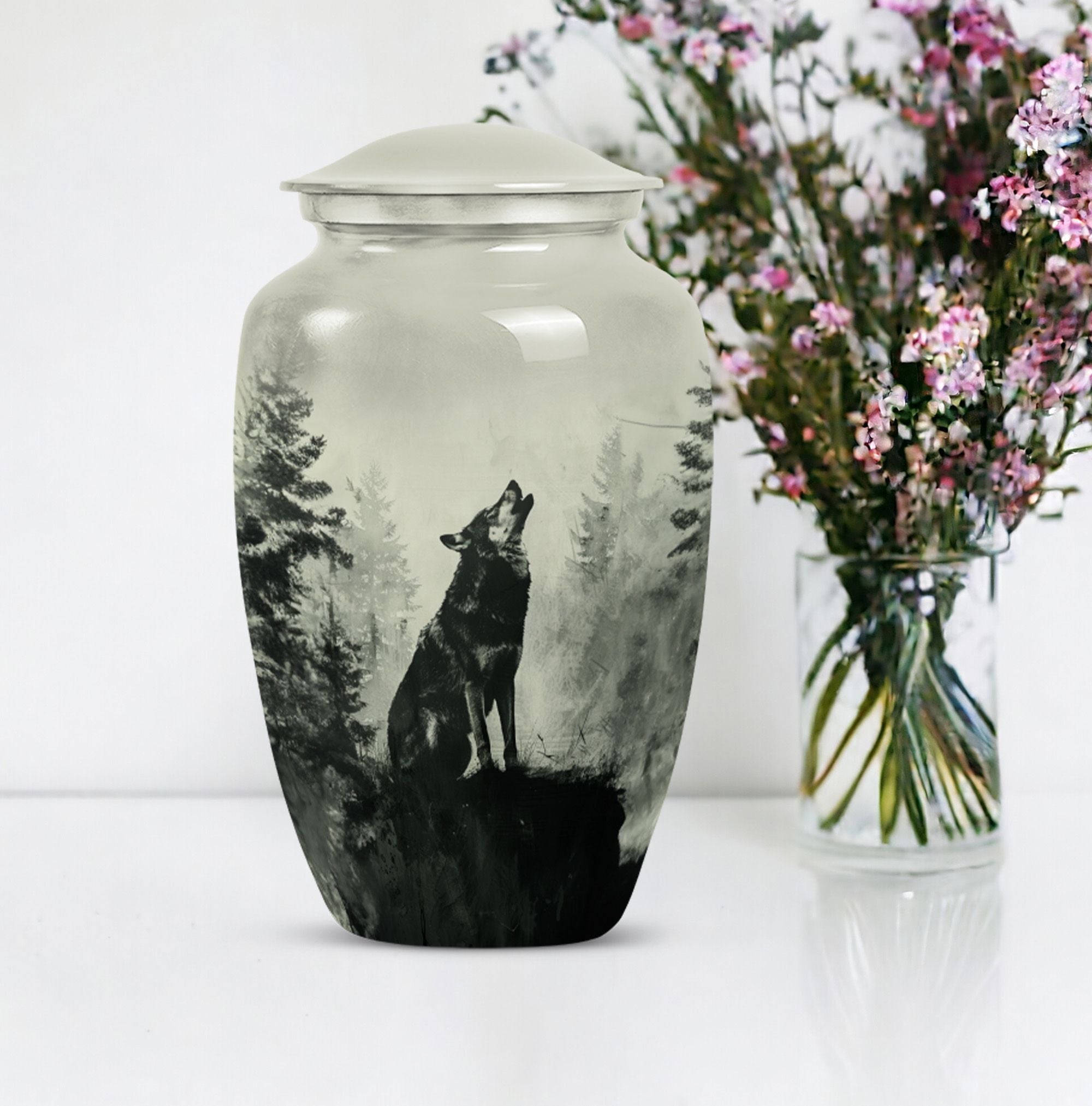 Find solace in memory of your loved ones with our 10 Inch Wolf Howling Urn. This large urn stands as a mesmerizing monument; it's not just an aluminium burial funeral cremation urn, but a piece of art that reflects the aura of your departed. Its classic theme invoking a howling wolf penetrates the heart with a sense of peace and spiritual connection. Weighing at just 3.3 pounds, and with dimensions of 10 inches in height, it can hold up to 200 cubic inches of ashes. In addition, its package includes a velvet pouch for the discreet and respectful containment of ashes. The urn can be customized, allowing you to personalize it with engraved names - making it more than a container, but a profound tribute. Please note that the design does not come into play here. Also popular as decorative urns for home, they're not just for adult male ashes but can also gracefully hold the ashes of a woman too. Remember your loved ones in a unique and spiritual way with our wolf howling urns, a cherished focal point in any memorial setting.