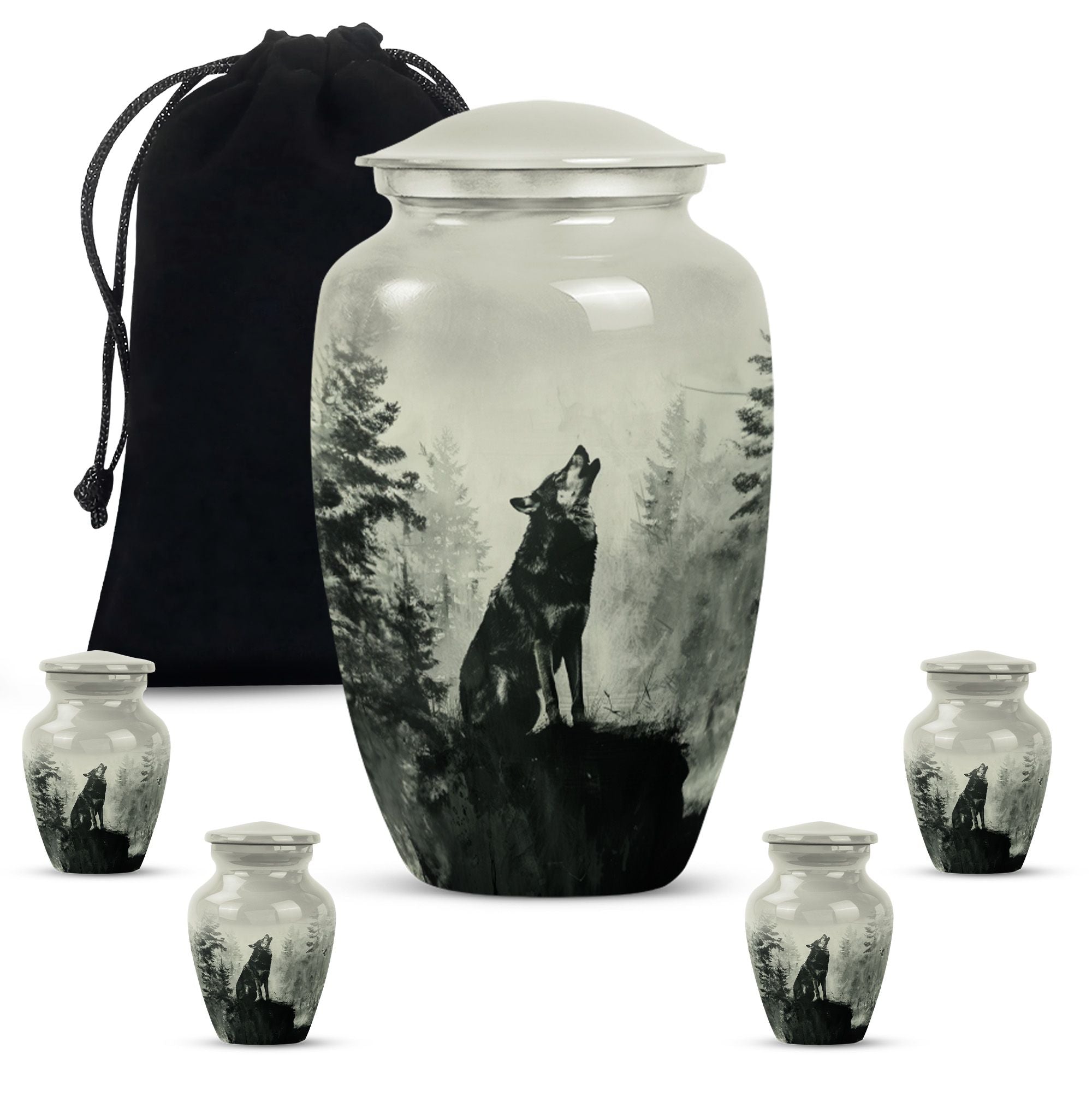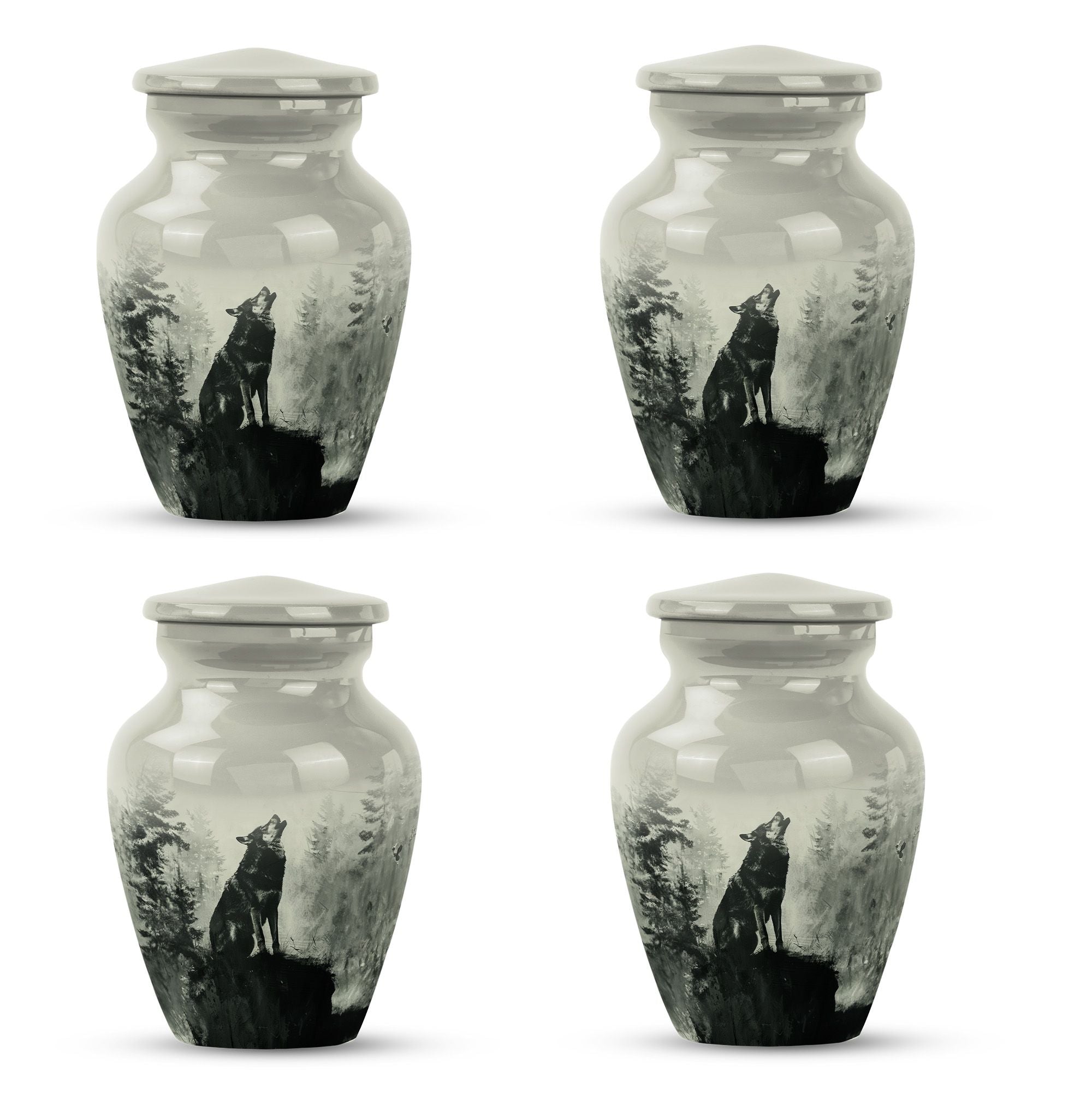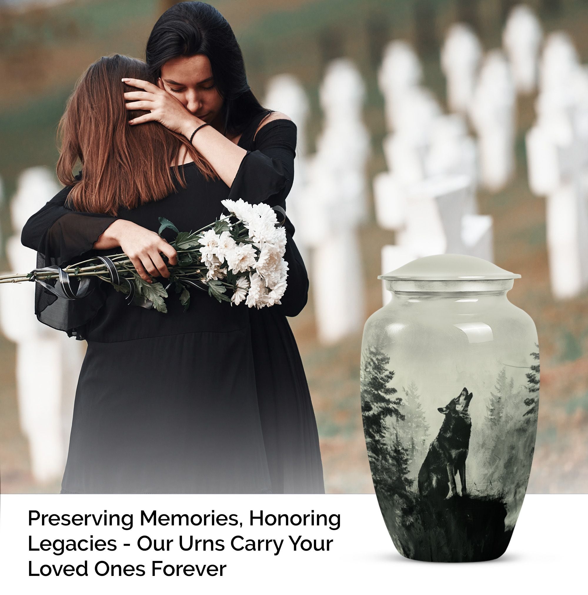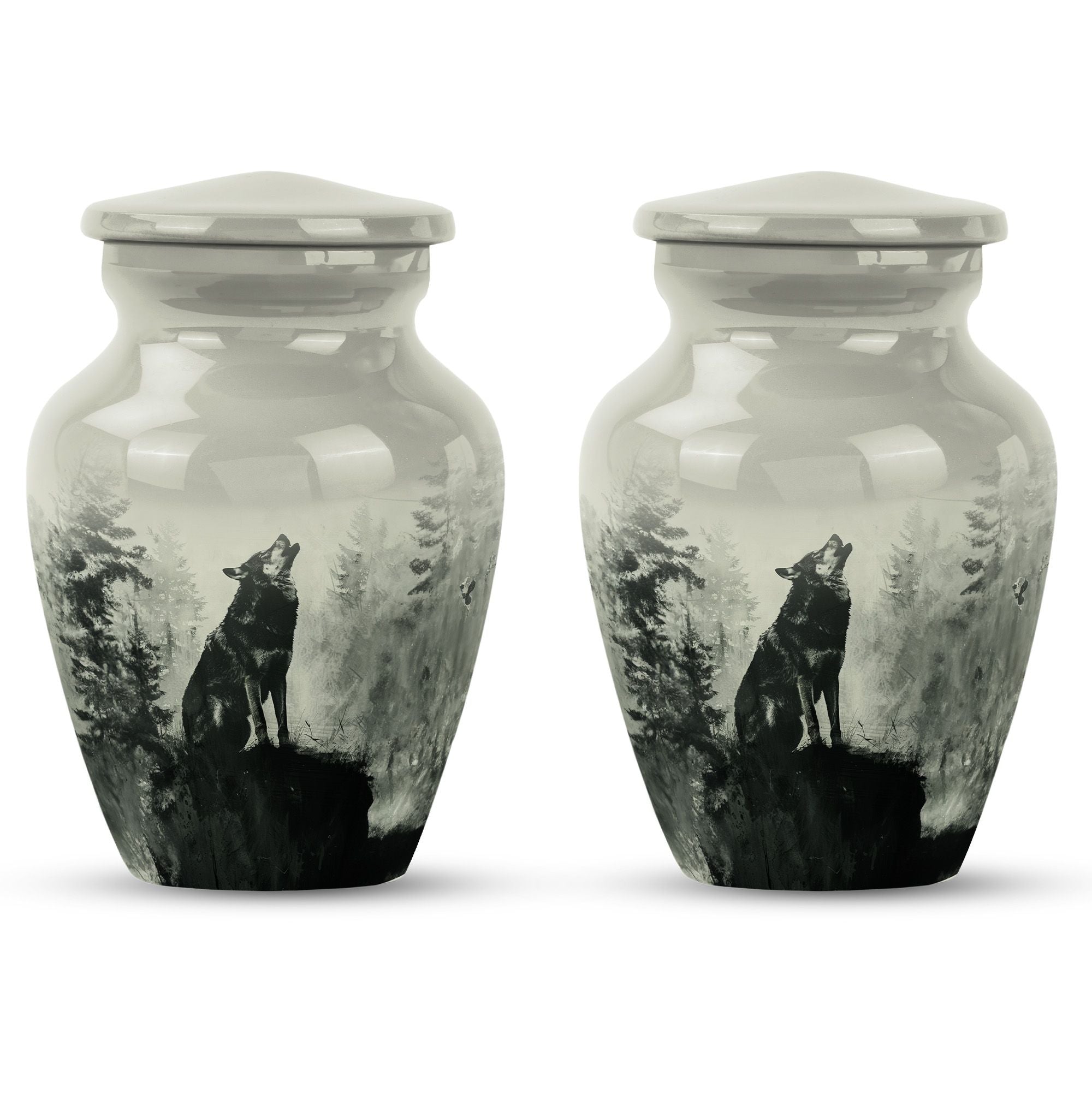Find solace in memory of your loved ones with our 10 Inch Wolf Howling Urn. This large urn stands as a mesmerizing monument; it's not just an aluminium burial funeral cremation urn, but a piece of art that reflects the aura of your departed. Its classic theme invoking a howling wolf penetrates the heart with a sense of peace and spiritual connection. Weighing at just 3.3 pounds, and with dimensions of 10 inches in height, it can hold up to 200 cubic inches of ashes. In addition, its package includes a velvet pouch for the discreet and respectful containment of ashes. The urn can be customized, allowing you to personalize it with engraved names - making it more than a container, but a profound tribute. Please note that the design does not come into play here. Also popular as decorative urns for home, they're not just for adult male ashes but can also gracefully hold the ashes of a woman too. Remember your loved ones in a unique and spiritual way with our wolf howling urns, a cherished focal point in any memorial setting.