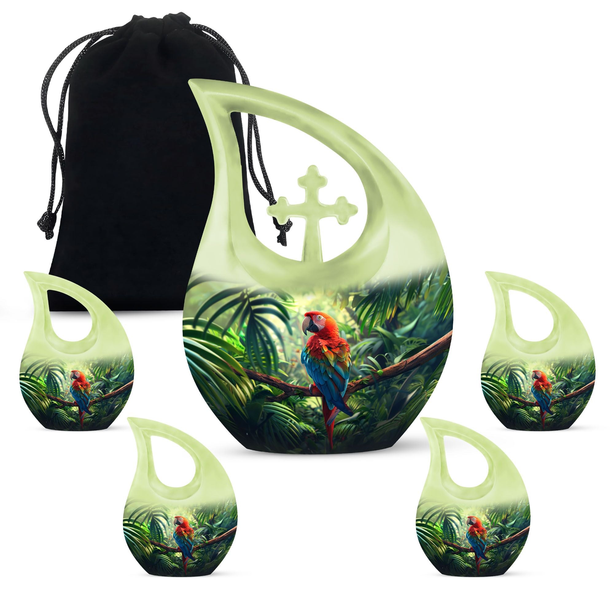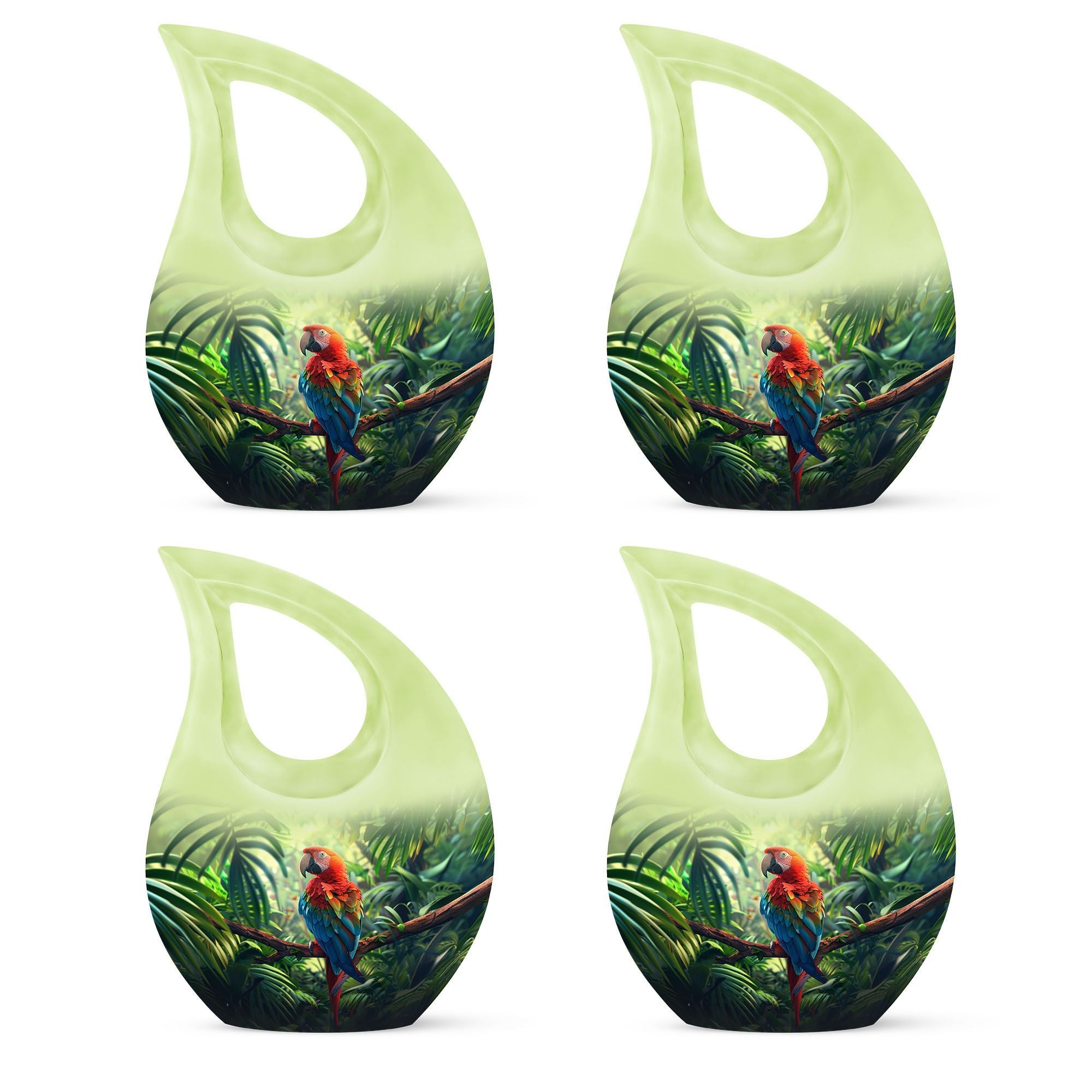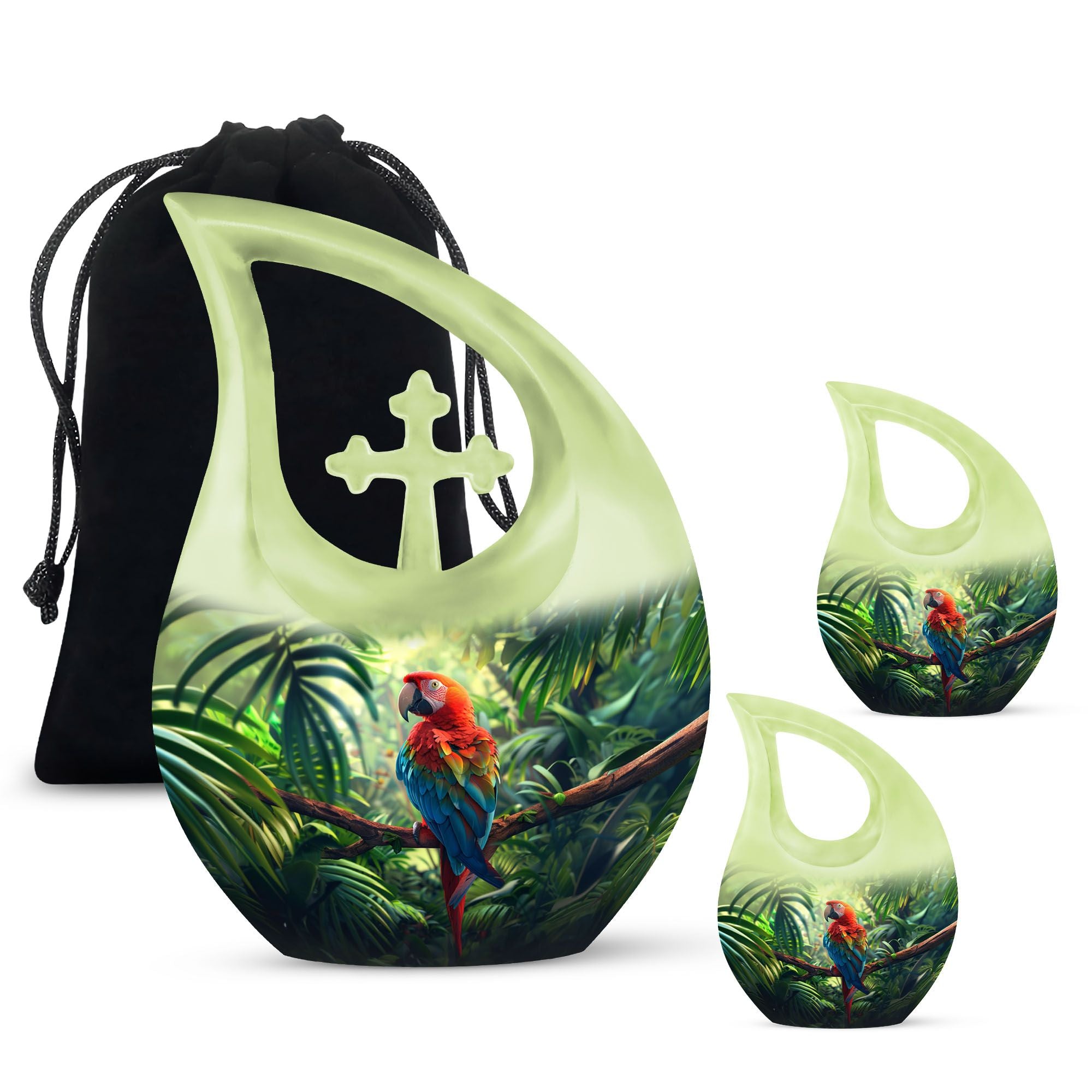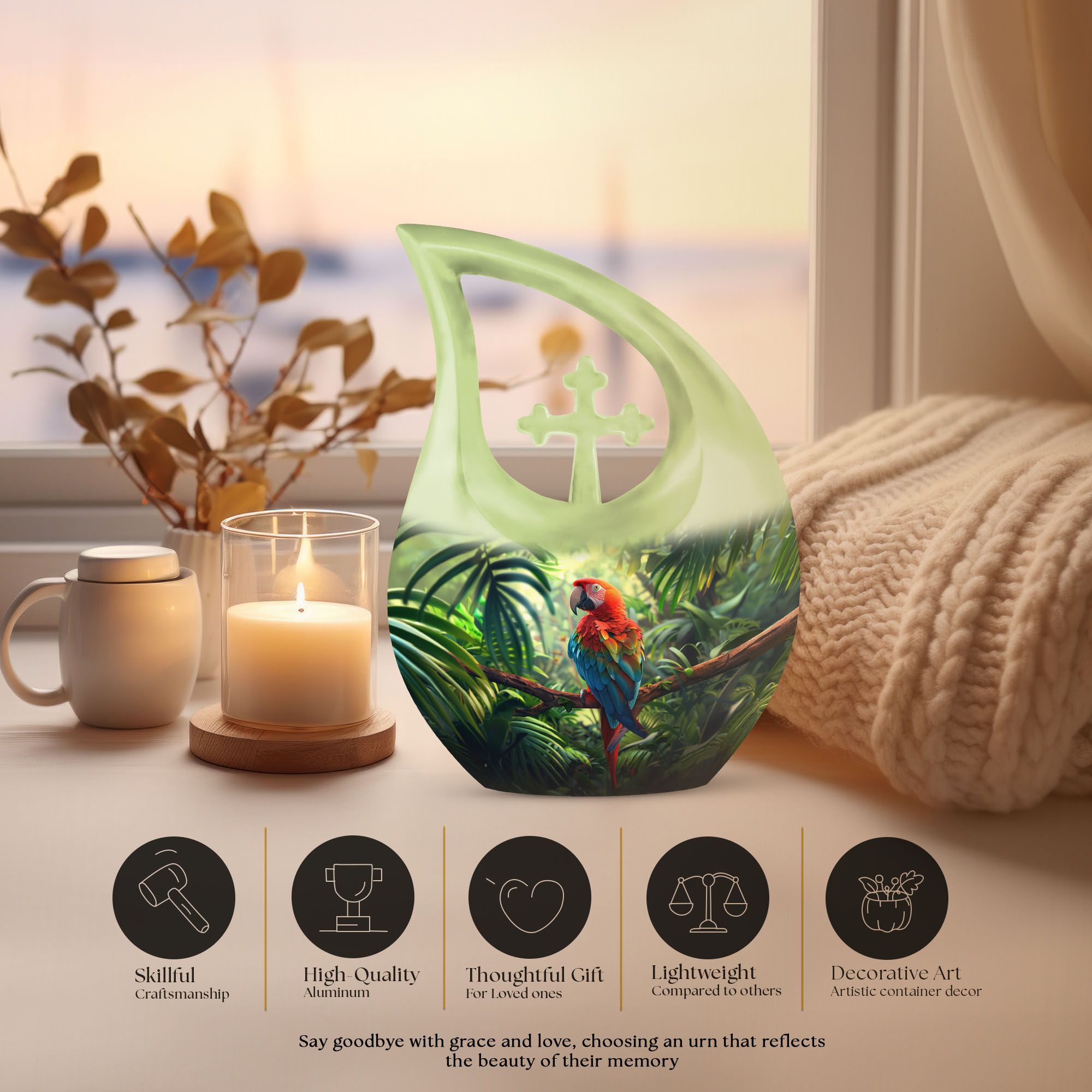 Presenting our uniquely themed Large Macaw Parrot Urn, an ideal choice amongst companion urns for adults. Constructed with high-quality aluminium, this memorial urn is robust yet delicate in design. It stands at a height of 10 inches with a weight of 3.3 pounds, offering a capacity of 200 cubic inches - generously accommodating tokens of shared memories. Personalize this Cross Drop themed urn to remember and tribute your loved ones through specially engraved names. It serves as a striking reminiscence of the soul departed, its inspiration derived from the vibrant Macaw Parrot. Our package ensures safe containment of your precious ashes in a velvet pouch. This urn is not just a cremation container, but a unique and stylish masterpiece. Keywords searchers would likely use: 'Macaw Parrot Urn', 'Companion Urns For Adults', 'Box Urns For Human Ashes', or 'Cremation Containers'. Remember, while beauty fades, our love endures, just like our Macaw Parrot Urn.