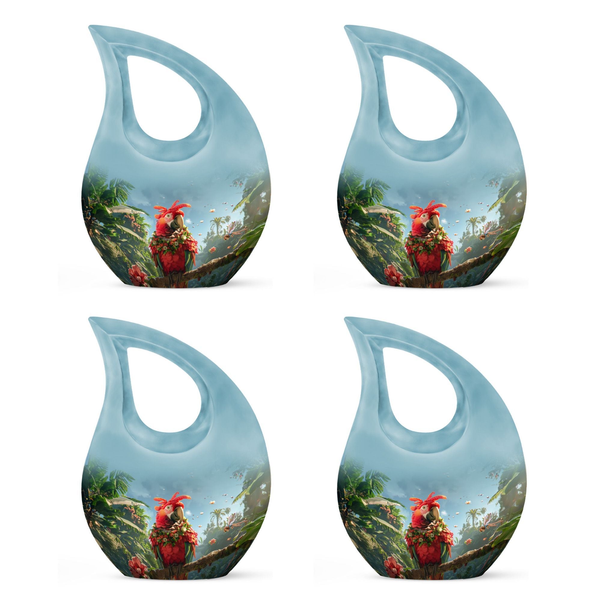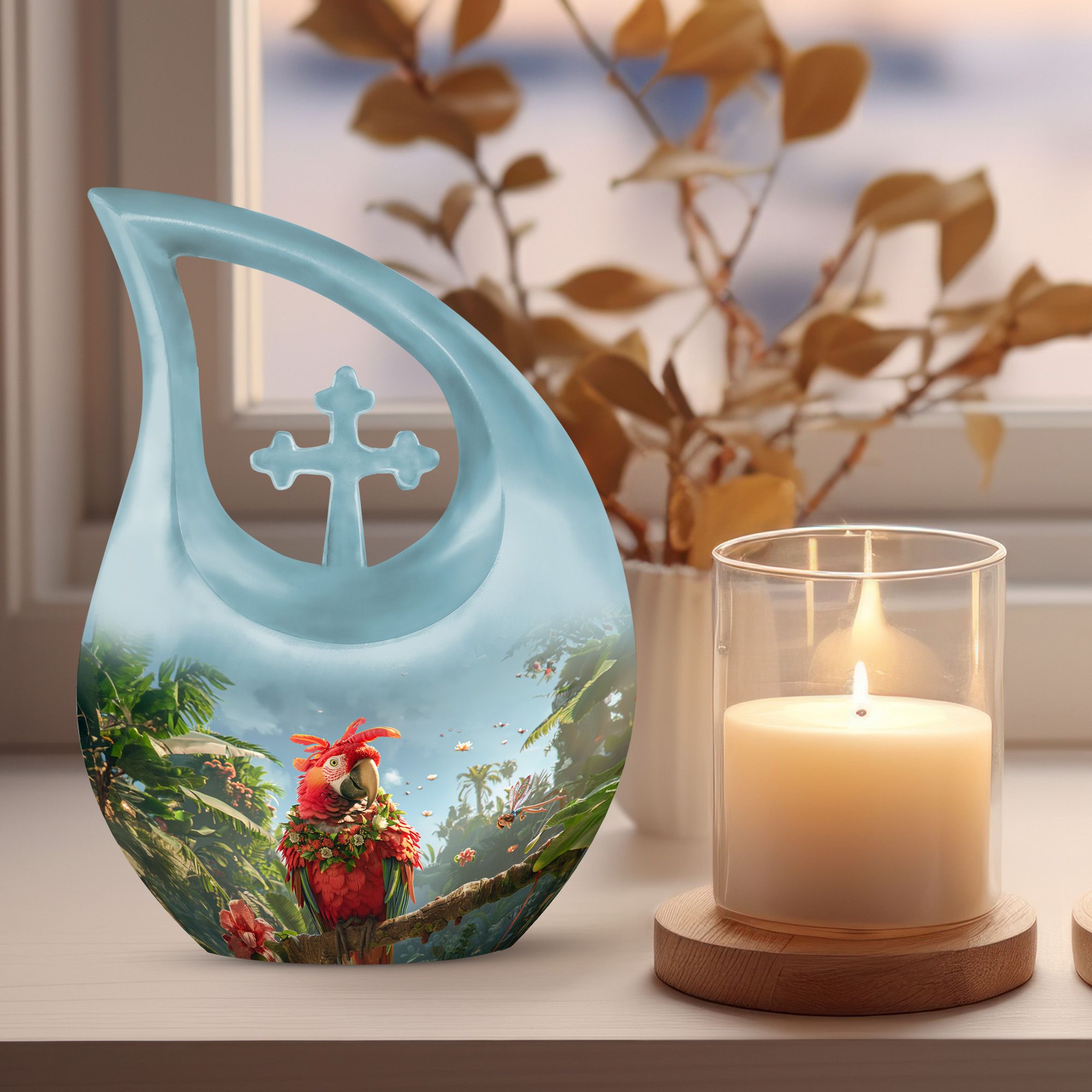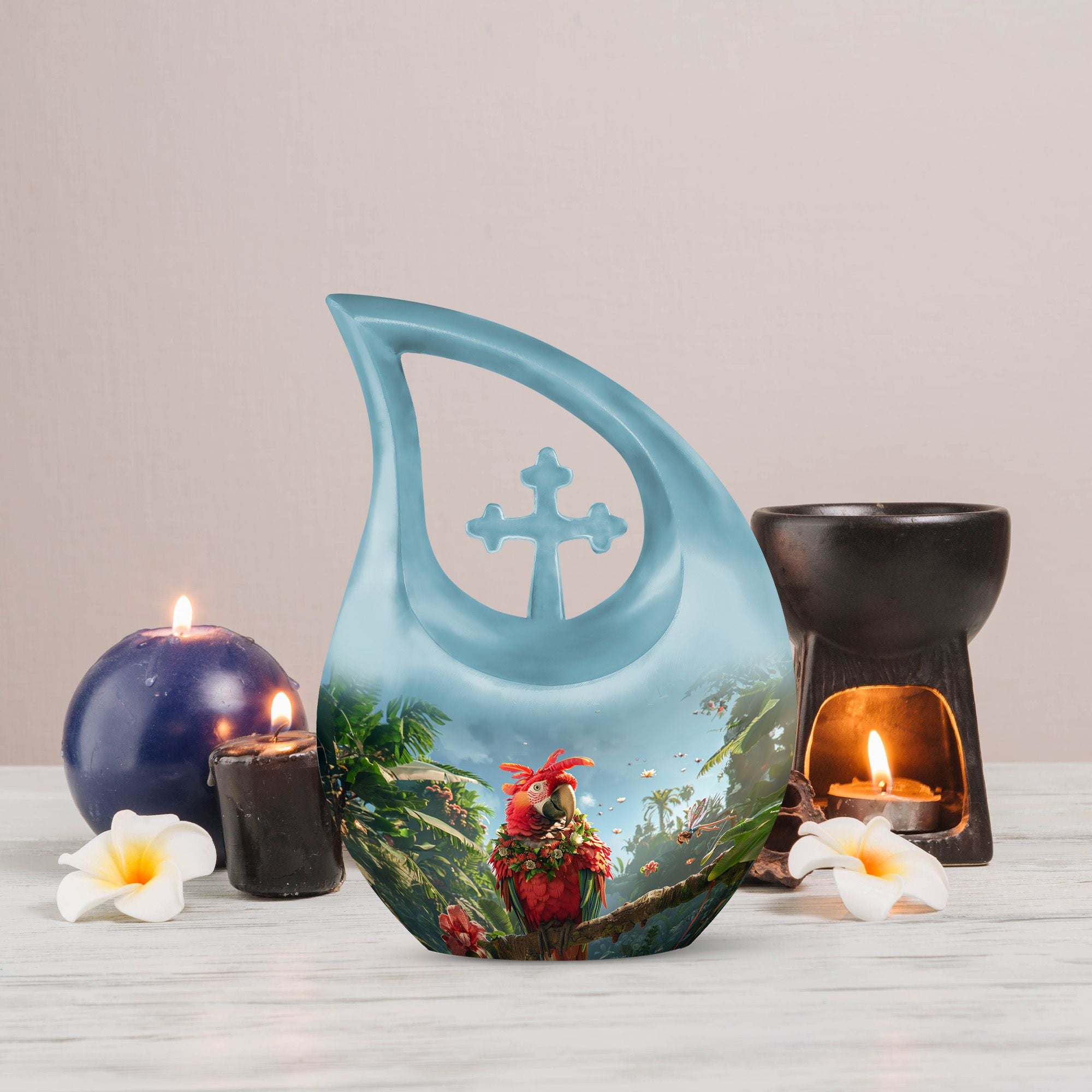 Immerse in a tranquil and soothing atmosphere with our Floral Parrot Haven Urn, an exclusive piece of artistry for your loved one. This uniquely crafted urn for human ashes manifests a Cross Drop design, offering an elegant and symbolic way to commemorate your loved ones. Built to last, this large urn is made using durable aluminium and possesses a weight of 3.3 pounds. The size is perfect for any space, standing at 10 inches. The urn's capacity to hold up to 200 cubic inches stands testament to its spaciousness. Moreover, you can personalize this urn with engraved names, making it a distinctive testament to a life lived. The urn comes with a velvet pouch to safely contain the ashes. Perfect for those in search of 'Urns For Dad', 'Luxury Urns', 'Medium Urns for Mom', or 'Unique Small Urns for ashes'. Experience a comforting presence of your departed loved ones with our Floral Parrot Haven Urn.