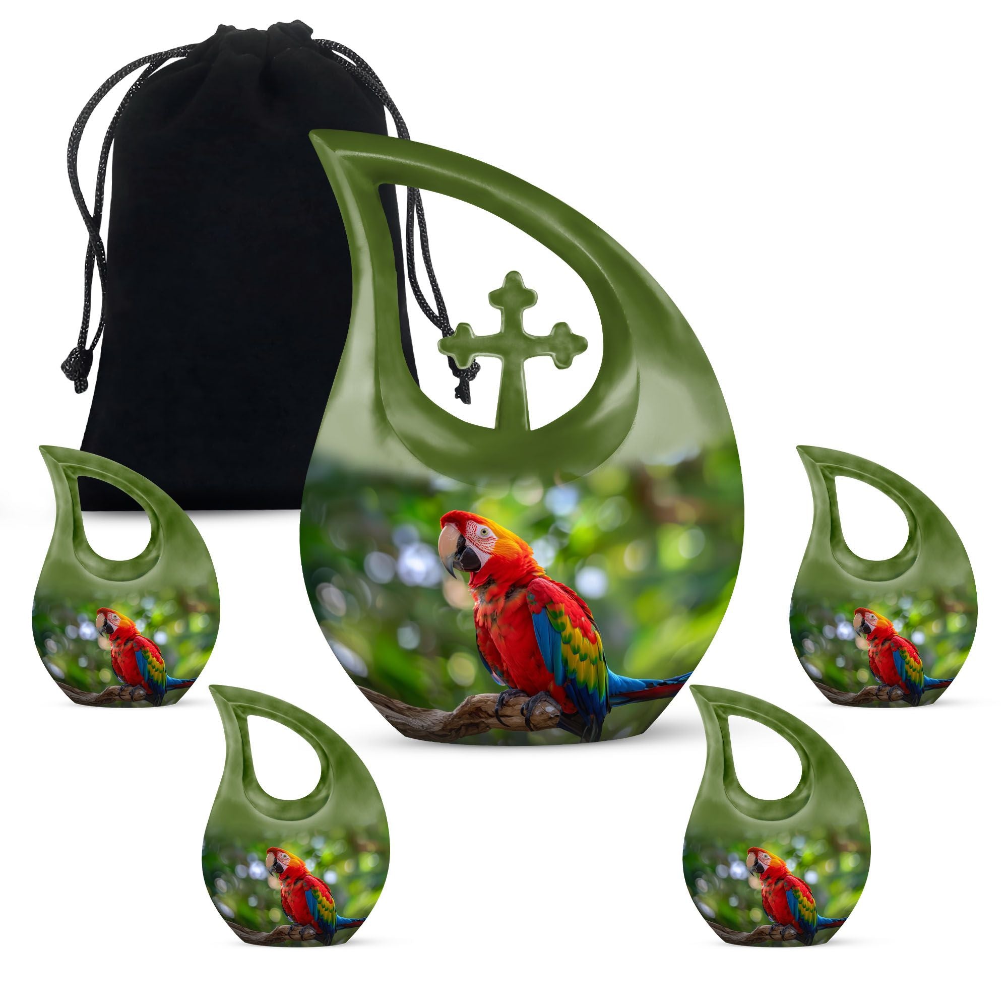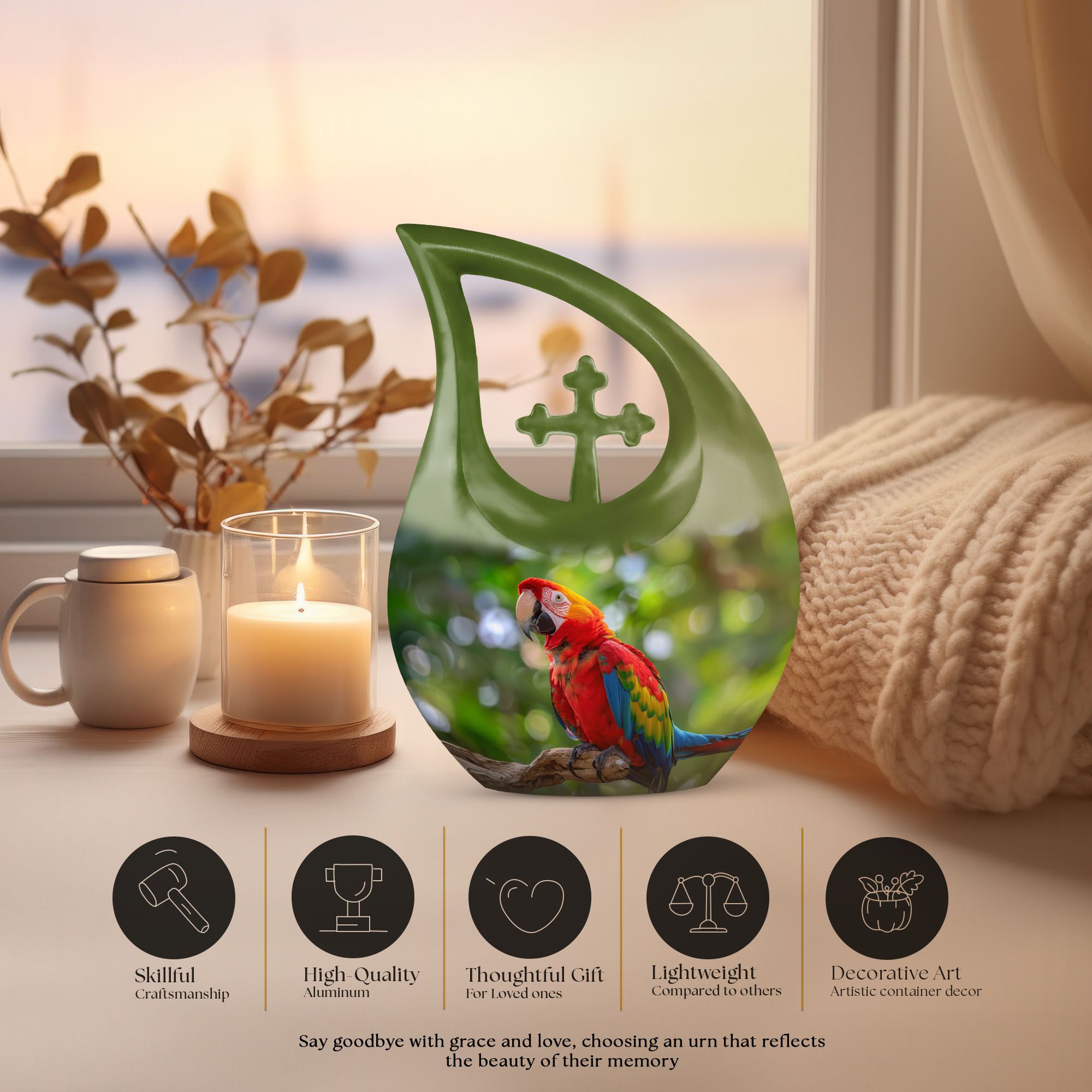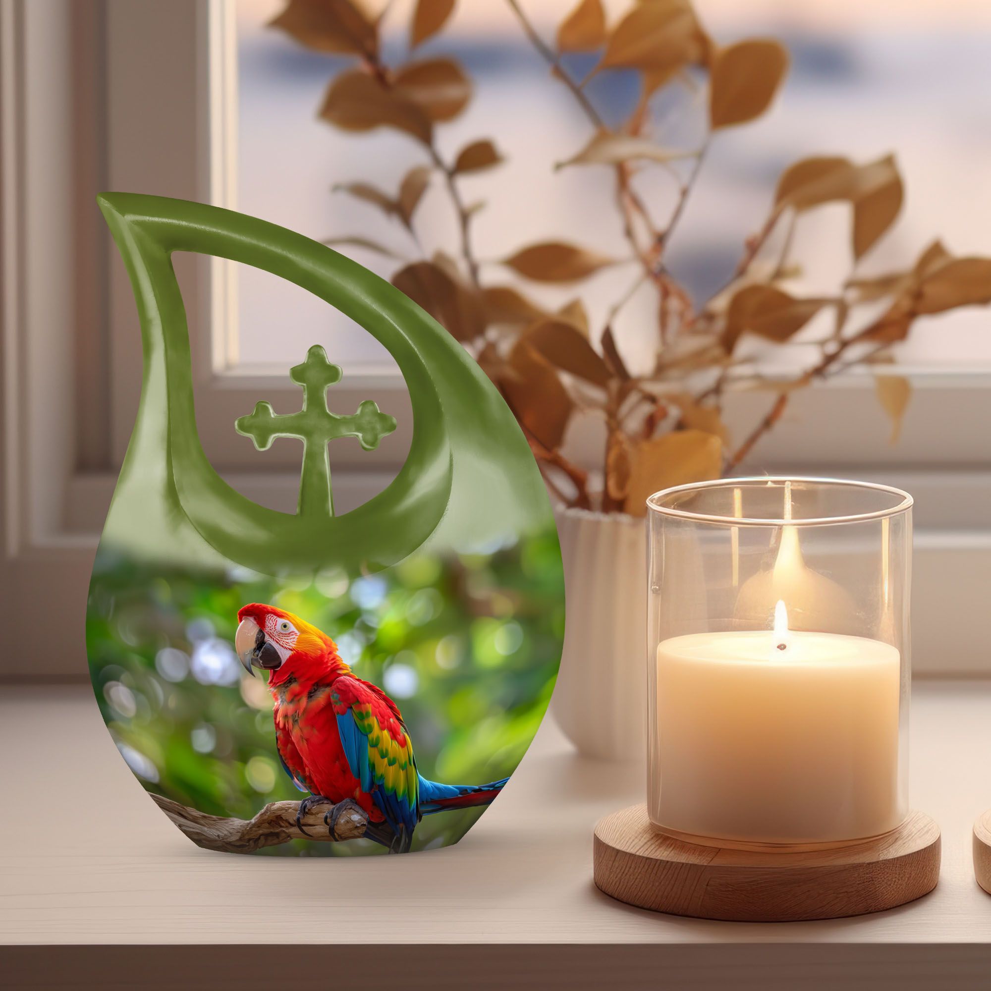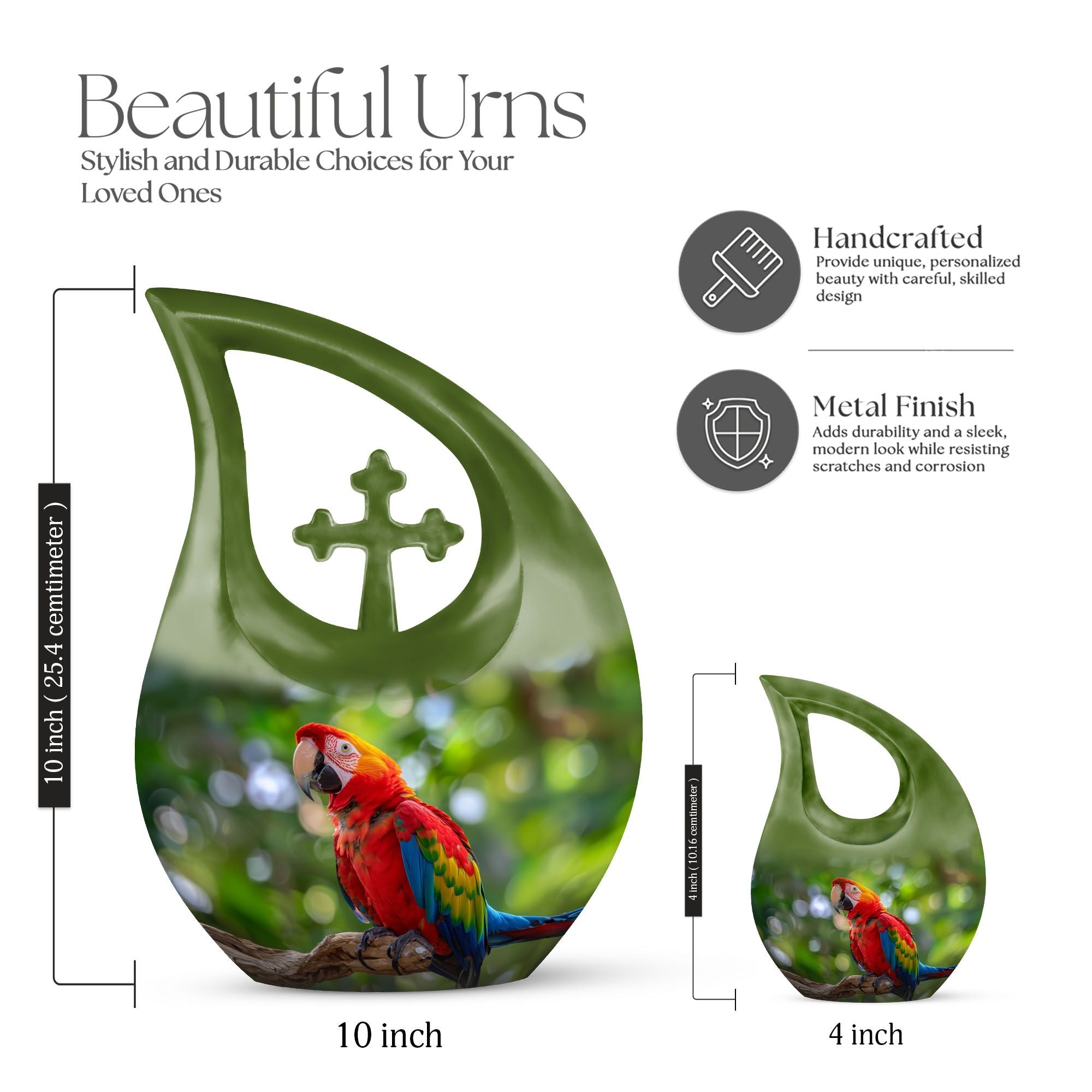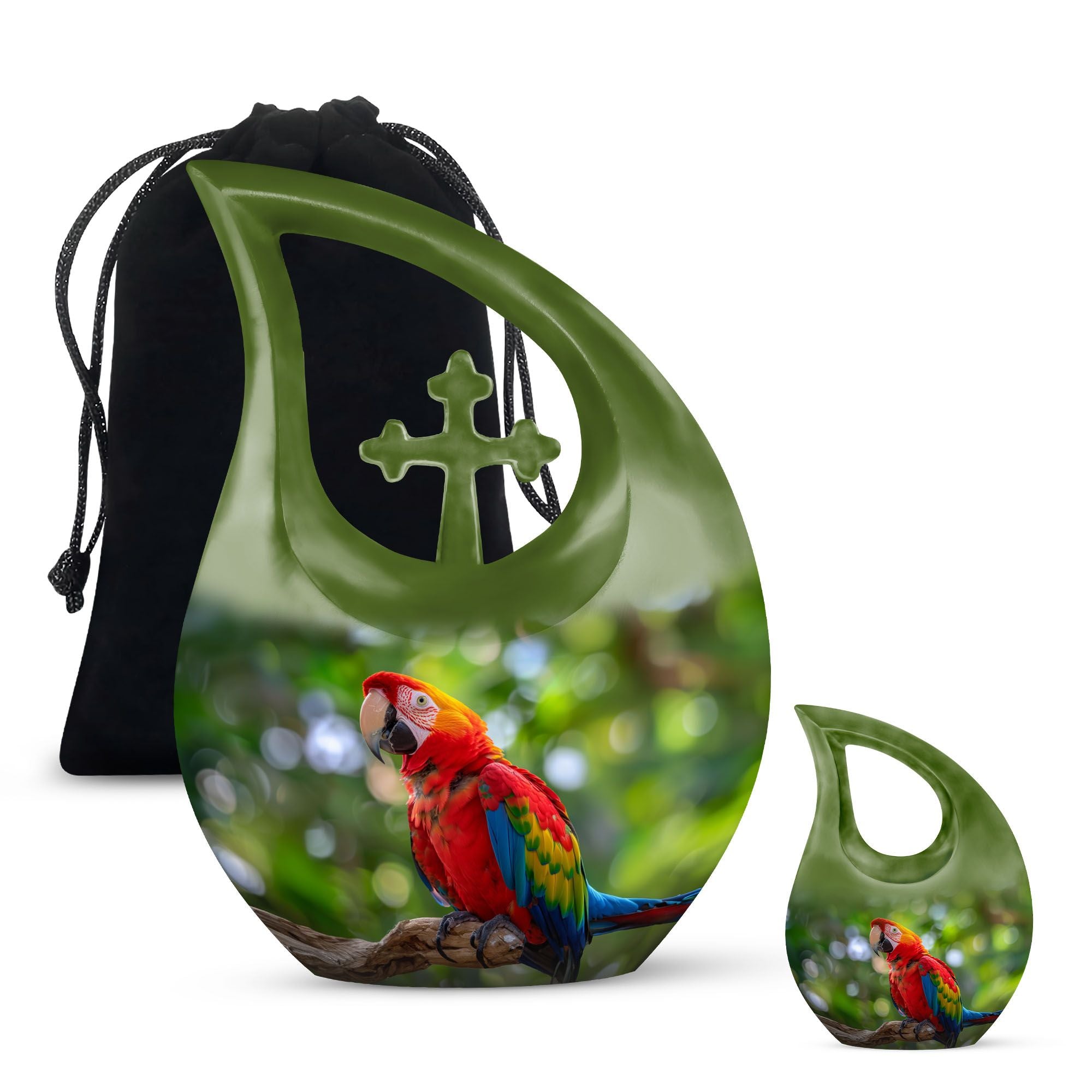 Immerse yourself in a unique remembrance ceremony with our Macaw Parrot Urn - a perfect fusion of faith, fashion, and functionality. Handcrafted with precision from premium aluminium, this enduring piece weighs 3.3 pounds and stands an impressive 10 inches tall. It offers a generous capacity of 200 cubic inches, accommodating the remains of a cherished loved one with dignity. Reflecting the 'Cross Drop' motif, our urn embodies a resonant and timeless symbolism. Included in your order is a plush velvet pouch, ideally purposed for the discrete containment of crematory ashes. For a personal touch, we also offer the option to engrave names onto the urn, turning this resting place into a tangible testament of love and memories. This larger version of our urn is a part of our ceremonial supplies collection, offering a unique way to remember those who enriched our lives. Search terms: Memorial urns, Cool Urns, Keepsake Memory Box, Cremation Boxes For Adults, Metal Urns For Ashes.