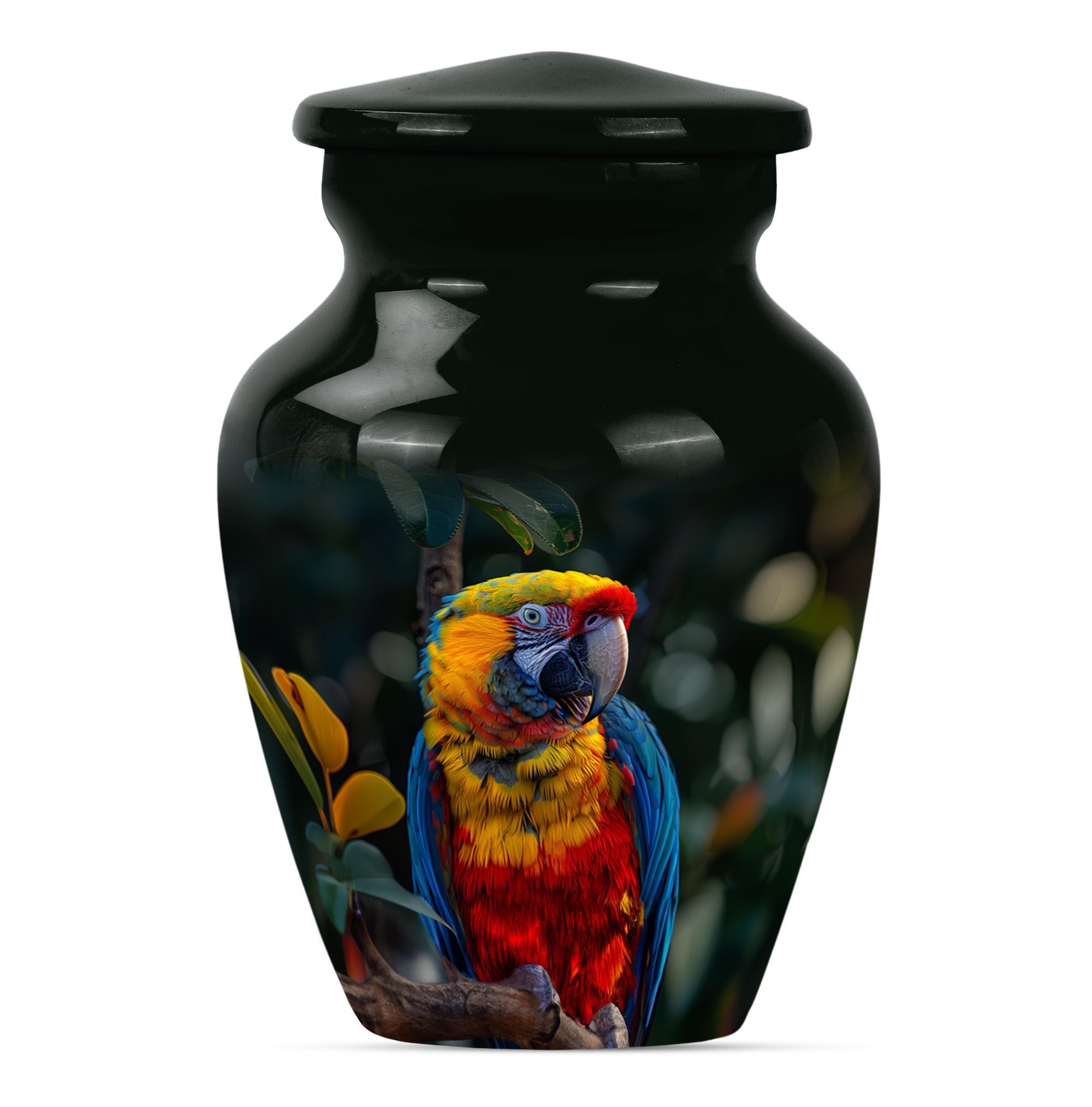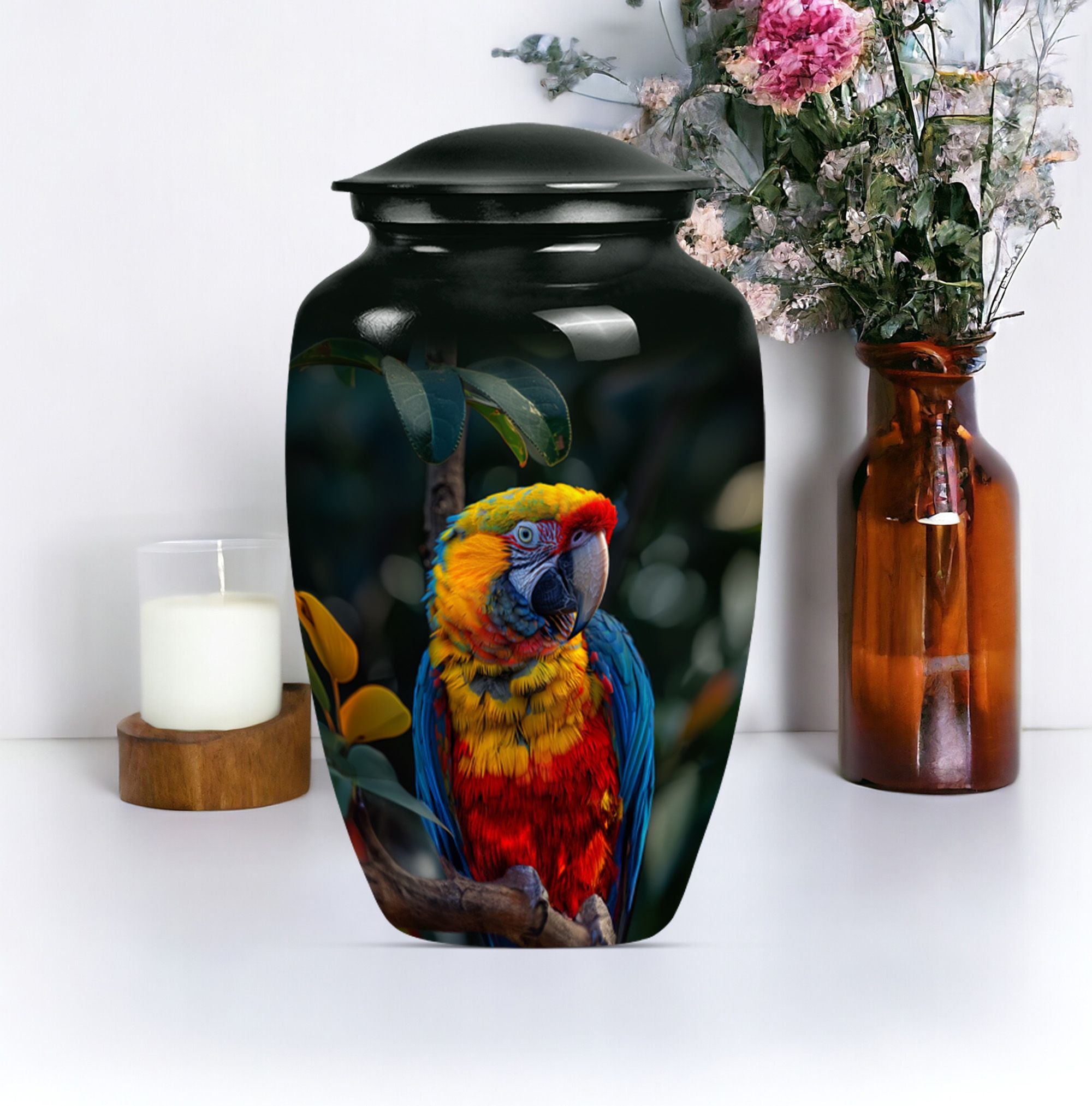 Our Macaw Parrot Urn stands as a tastefully crafted tribute, honoring your loved one's unforgettable legacy. This beautifully built large urn measures 10 inches in height and has a considerable volume of 200 cubic inches. Capable of accommodating ashes of an adult female, its substantial capacity makes it one of our most reliable memorial urns in the category. Expertly crafted using aluminium, this urn is not only aesthetically pleasing but durable, boasting a weight of 3.3 pounds. The unique Wolf Howling theme offers a sense of serenity and solemnity, chosen carefully to reflect the spirit of your dear departed one. To further personalize this irreplaceable memorial touchstone, we offer engraved names customization options. We also understand the delicate nature of this possession, and so this cremation urn is accompanied by a velvet pouch for secure containment of ashes. A symbol of eternal love and respect, this urn is a distinctive blend of sentimentality and style for your commemoration rituals. Uncommonly searched keywords, such as cremation medium urns for human ashes, human ash adult, shape boxes for gifts, and funeral cremation urns, are used to describe this product.