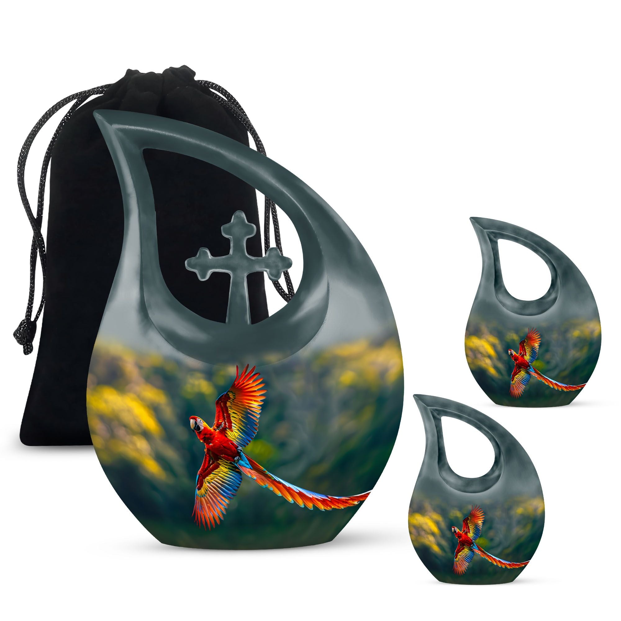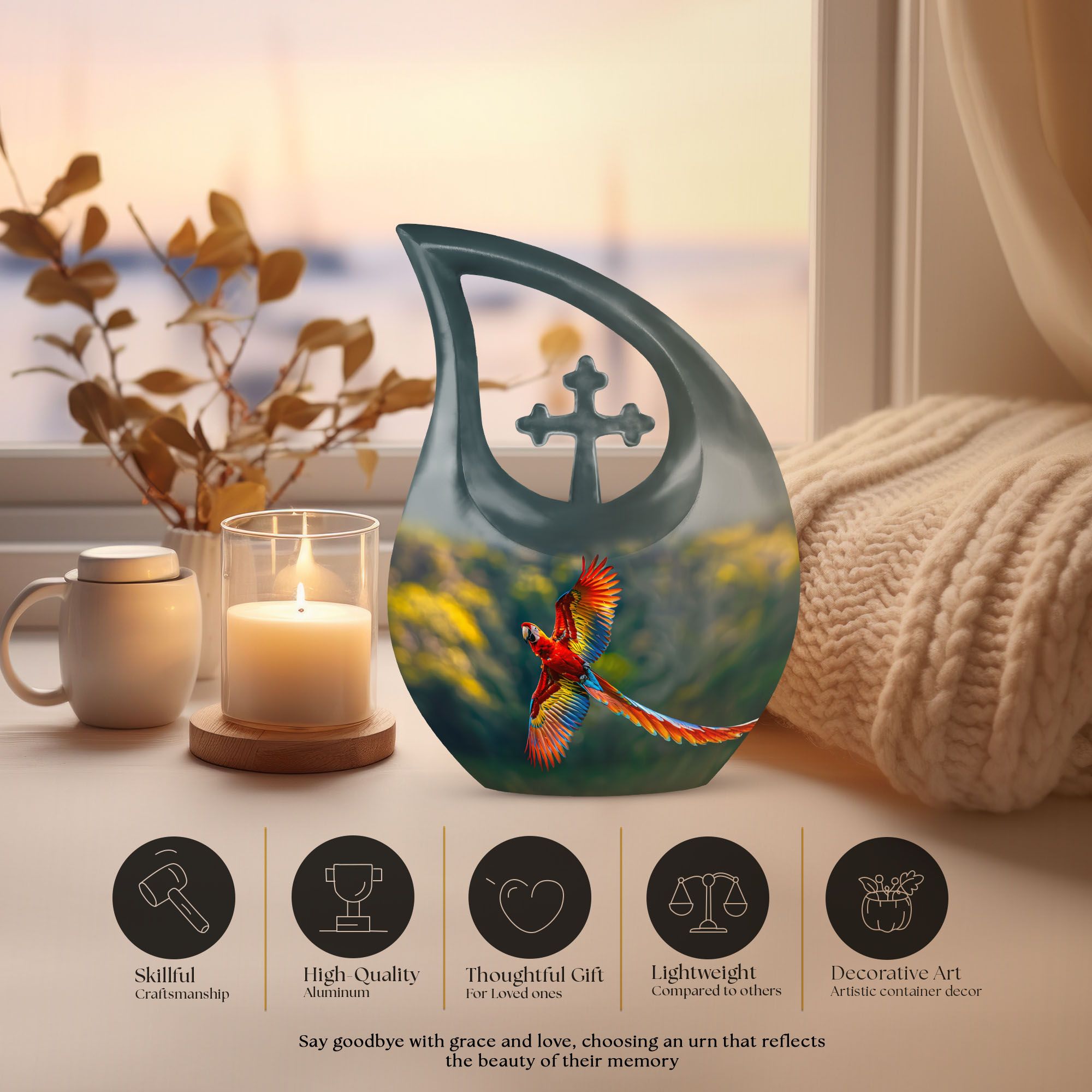 An ode to beloved passed, this Macaw Parrot Urn provides a dignified, respectful final resting place. Sculpted at an impressive height of 10 inches, this extra large cremation urn gives a powerful presence. The vessel is masterfully crafted of robust aluminium, bearing a weight of around 3.3 pounds. Its roomy interior boasts the capacity of holding up to 200 cubic inches of ashes. The urn comes with a gentle velvet pouch, providing containment of your loved one's earthly remains. The notable Cross Drop theme imparts an incredibly comforting touch to this memorial urn. To make it more heartfelt, there's an option to personalize it with engraved names. This unique artifact aptly pays tribute, making it amongst the best urns available online for ashes. Whether you want to buy urn for a single person or are looking for companion urns, this multi-purpose product stands as a perfect choice. Note: This product does not include 'Design'.