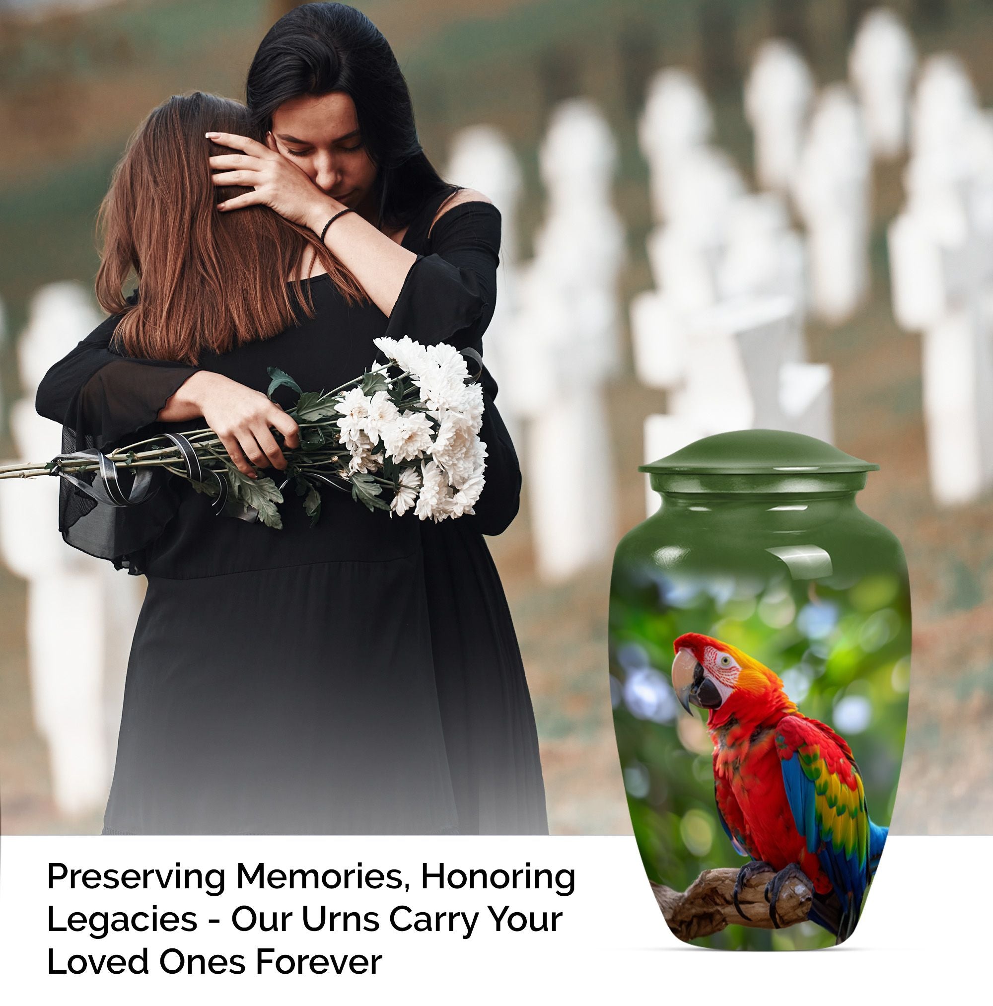 Honor and celebrate the undying memory of your loved ones with this one-of-a-kind Large Macaw Parrot Urn. Handcrafted from durable Aluminium, this urn weighs a sturdy 3.3 pounds and stands at an impressive 10 inches in height. Its generous 200 cubic inch capacity ensures it can comfortably hold adult human ashes. The urn boasts a timeless Wolf Howling theme that softly whispers of the eternal connection between man and nature. Its distinguishing feature is the option to personalize with engraved names, making it an ideal tailored memento. Each urn comes packaged with a lovingly designed velvet pouch, ensuring the ashes' secure containment. Perfect for those seeking memorial urns or funeral burial urns, this urn strikes the right balance between remembrance and respect. Add this essential piece from our Memorial Ceremony Supplies category to your collection today. Uncommon terms like 'Burial large urn', 'human ash human ash', and 'cremation urn human ashes' can be used to find this product.