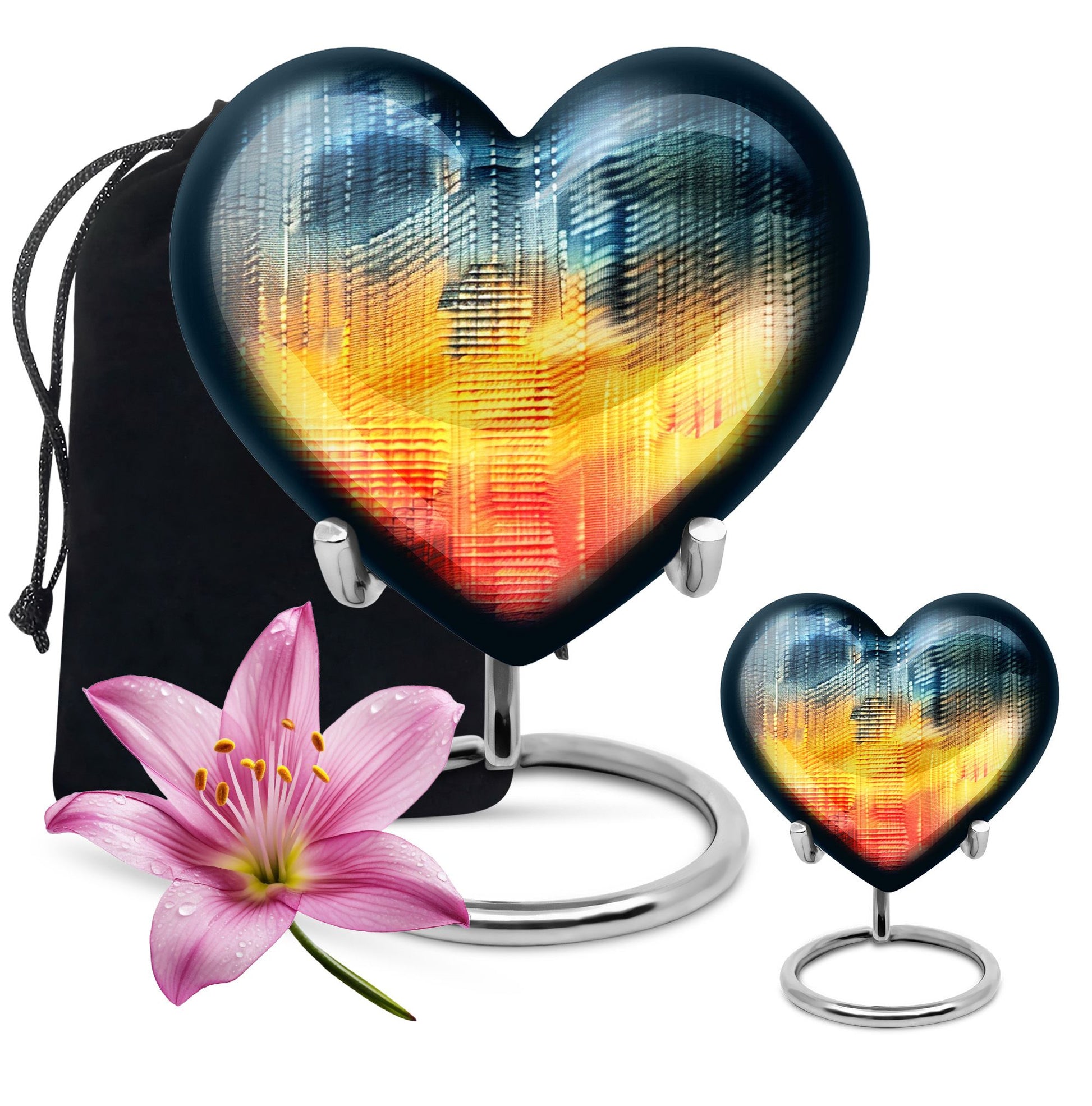 Honor the memory of your loved ones with our uniquely built 10-inch Pattern Urn, a masterpiece in the memorial medium urns for ashes category. Crafted from high-quality Aluminium, this large urn features an abstract theme that evokes a sense of tranquility and eternal peace. This heart urn, weighted at 3.3 pounds, stands 10 inches tall, accommodating up to 200 cubic inches of ashes, perfectly suiting as human ash urn adult ash woman, or cremation urn for dad. The urn is accompanied by a velvet pouch, ensuring secure containment of your precious person's ashes. Add a personal touch to this ceremoic relic by engraving names of your loved ones. This product accessible in English (en) locale is ideal for those seeking not just burial urns for human ashes adult but also as gentle reminders of the life lived. Incorporate this elegantly designed urn into your memorial ceremonies, magnifying the ambiance with its imminent presence.