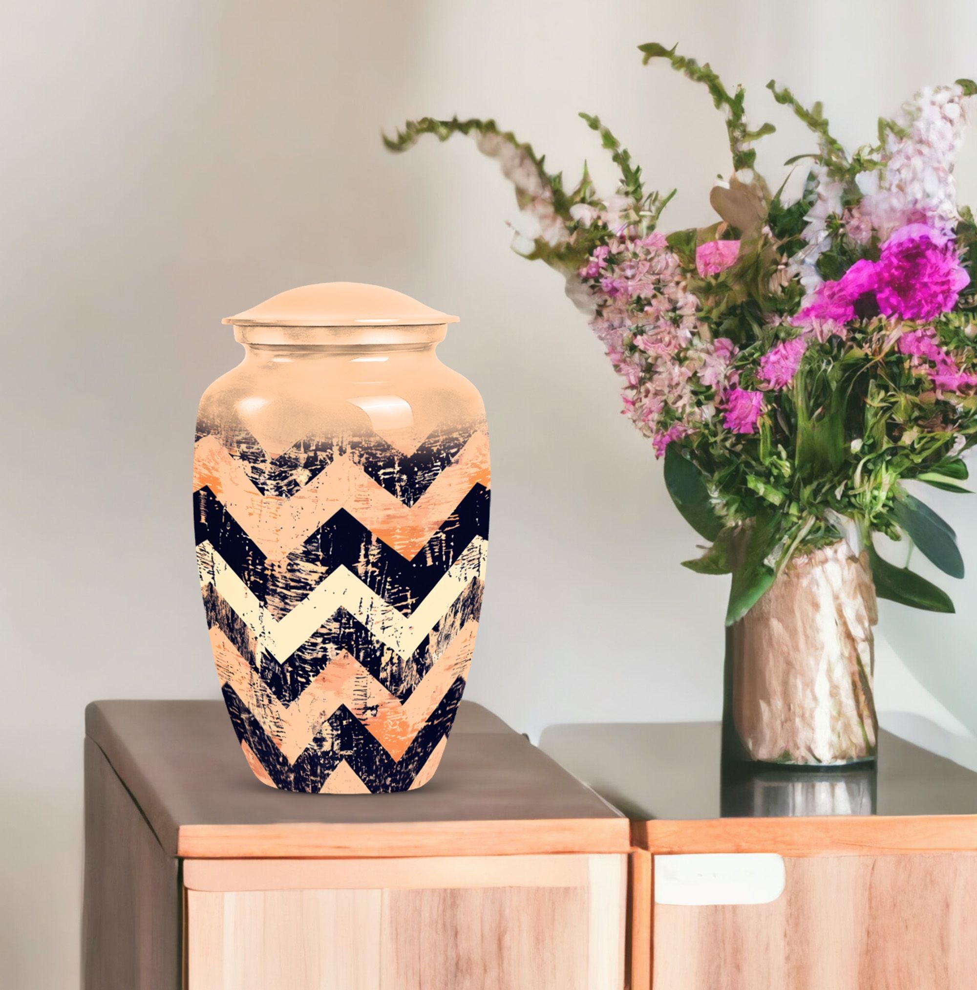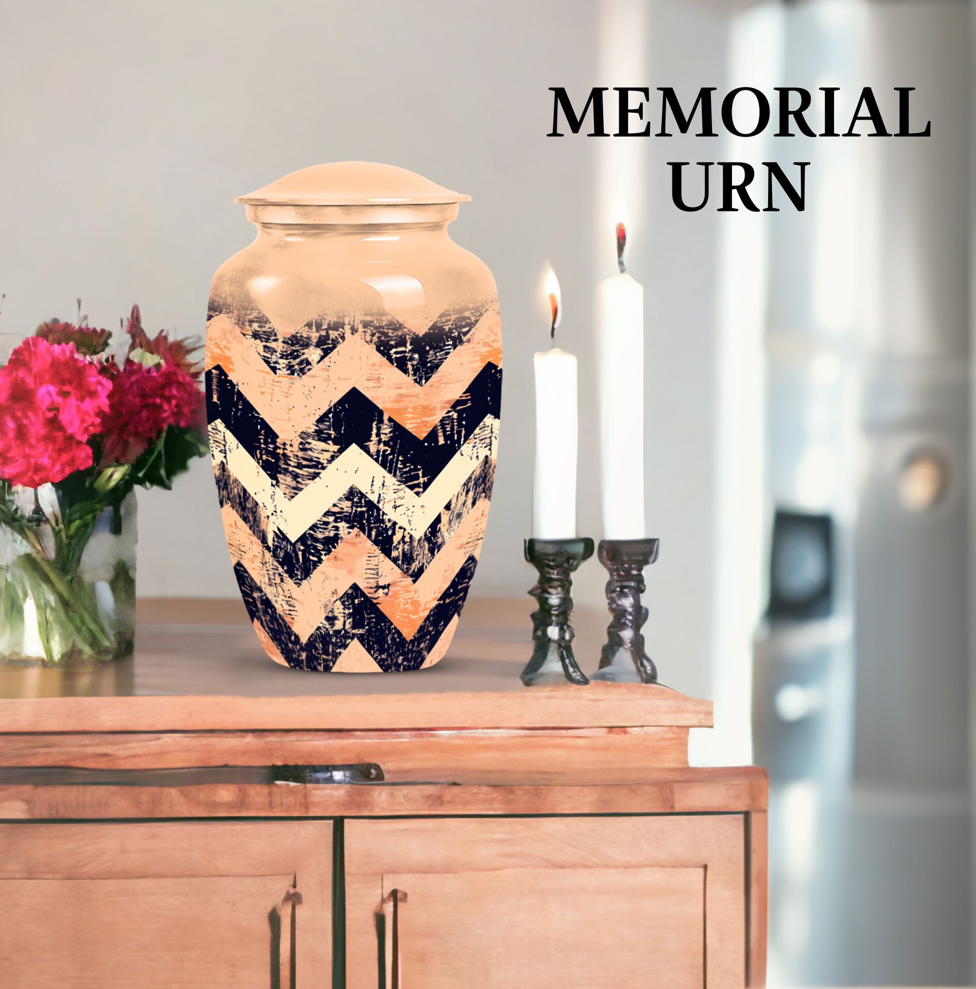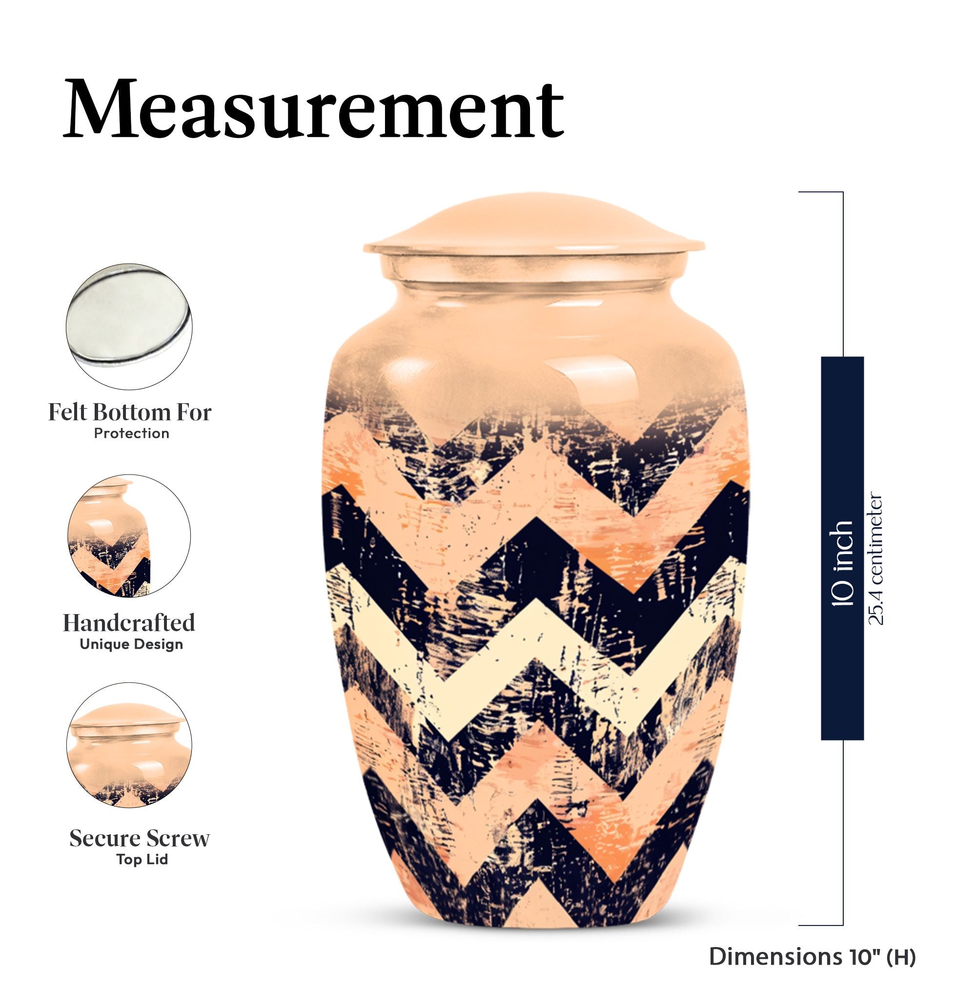 Honor your loved ones eternally with our Abstract Pattern Urn, a unique large urn for human ashes. Our specialty urn, meticulously crafted from robust Aluminium, guarantees lasting quality as it resides with you. An impressive height of 10 inches and a capacity of 200 cubic inches make this urn suitable for housing substantial amounts of ashes with ease. Despite its size, the urn maintains a manageable weight of a mere 3.3 pounds. We believe in making this already meaningful piece even more personal by offering customized engravings of names on it. Our abstract-themed urn comes with an elegant velvet pouch for safe containment and transfer of ashes. You can place this urn in your home as a poignant memorial tribute or use it for cremation or burial ceremonies. This urn distinguished by its classic design, bridges the gap between tradition and contemporary style. It redefines memorial urns, setting a new standard in the ceremony supplies sector. Note: The secondary keywords for this product are memorial medium urns for ashes, cremation urn burial, funeral, and funeral cremation urn.